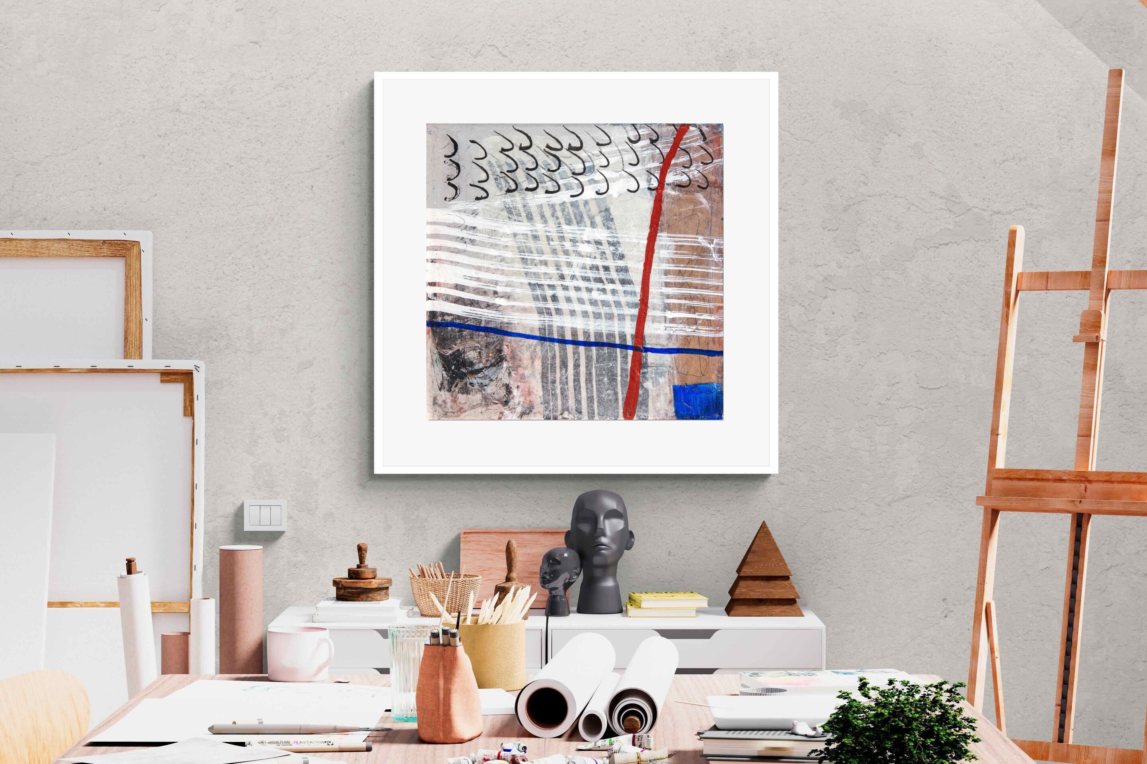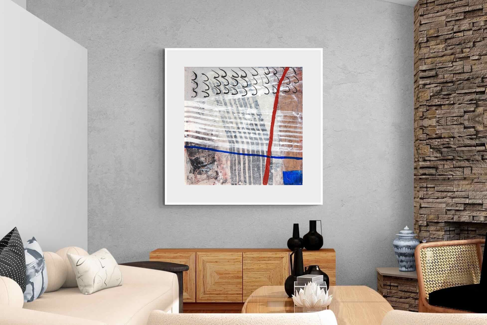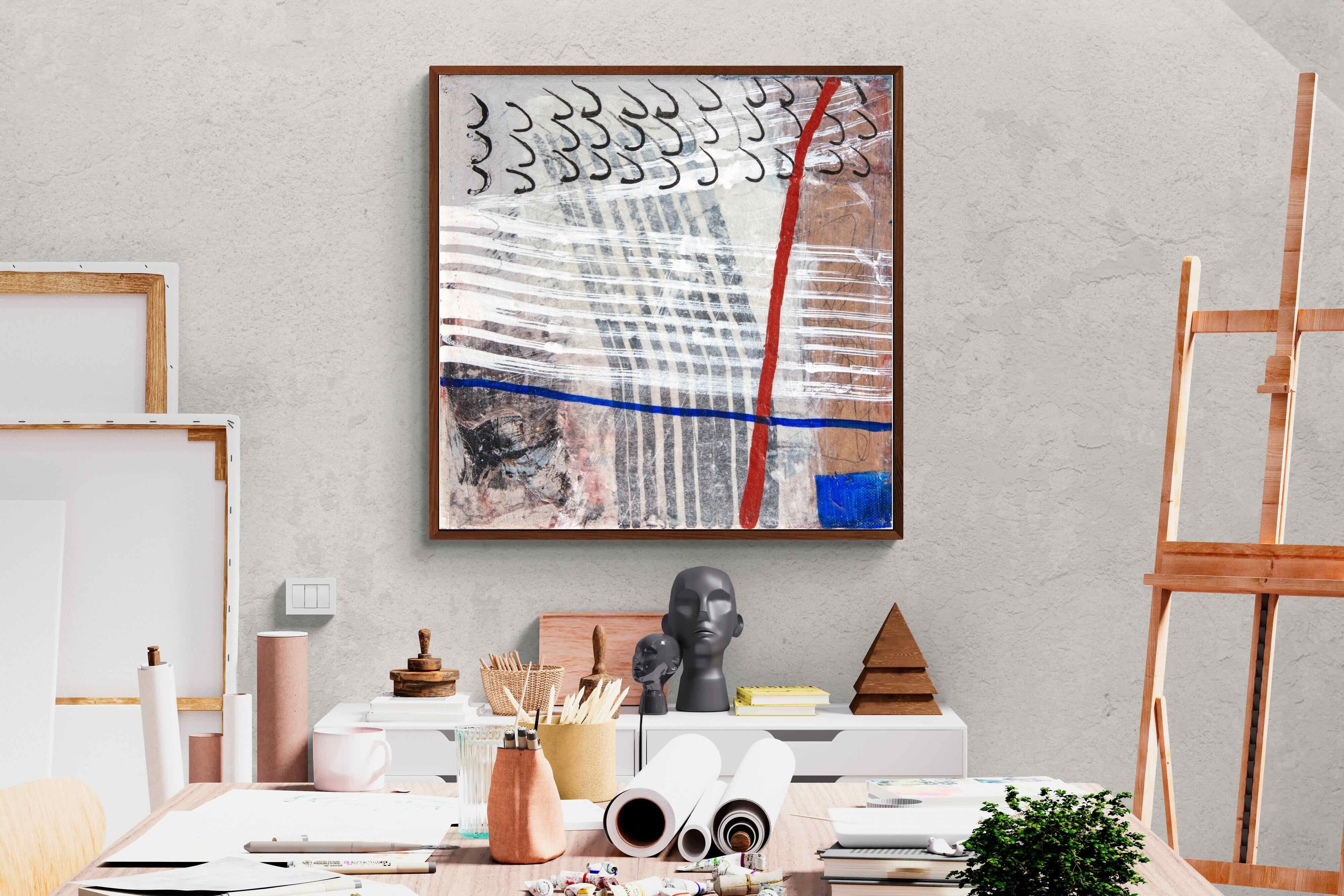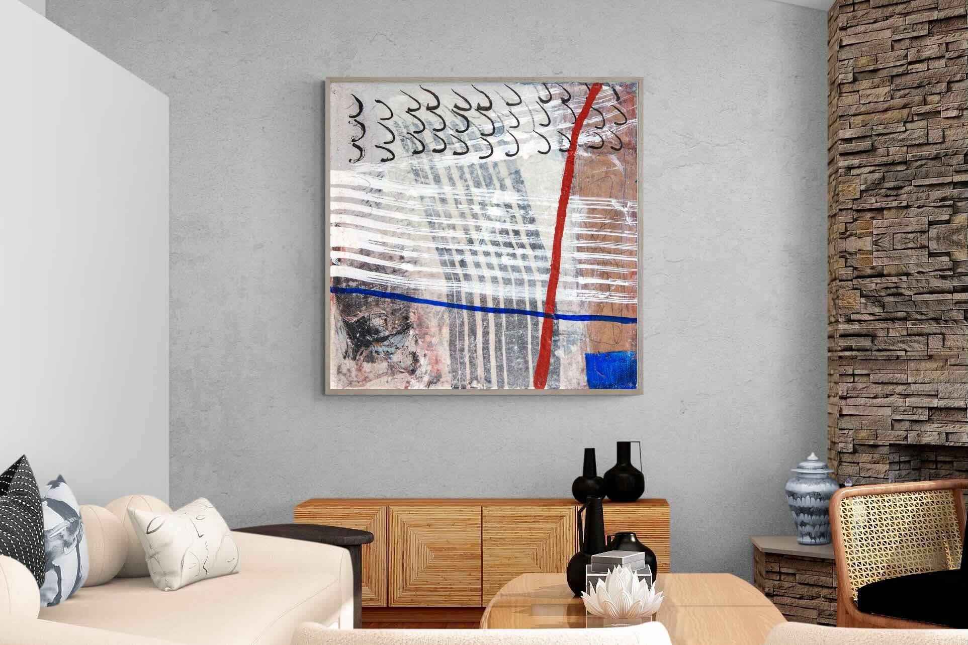"Castaway" features a striking blend of ocean-inspired blues, soft earth tones, and intricate lines that evoke the feeling of an adventure at sea. This abstract composition balances both calm and intensity, making it perfect for coastal-themed or minimalistic homes. Its dynamic yet soothing presence enhances any space, adding a sophisticated, modern touch to living rooms or offices.