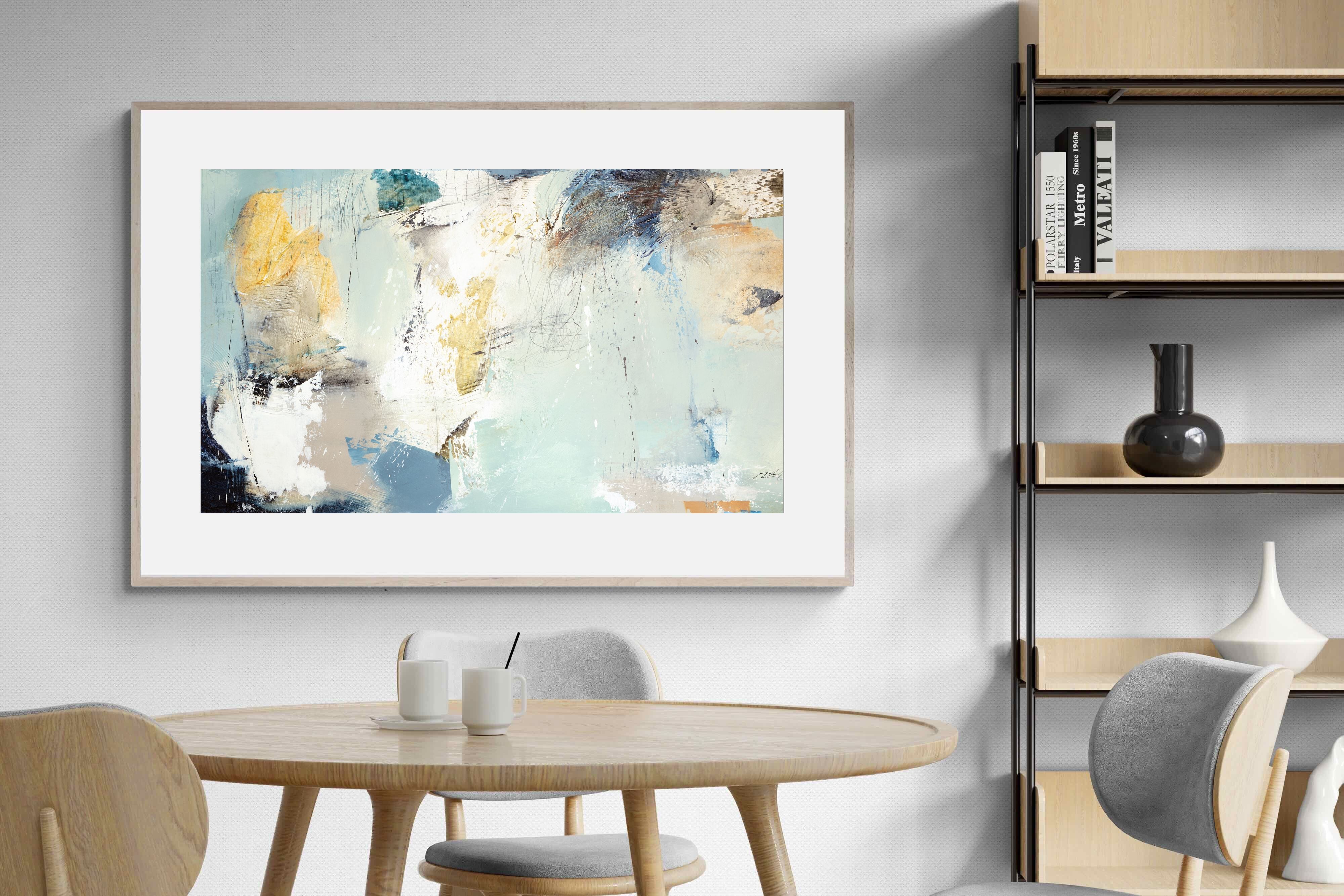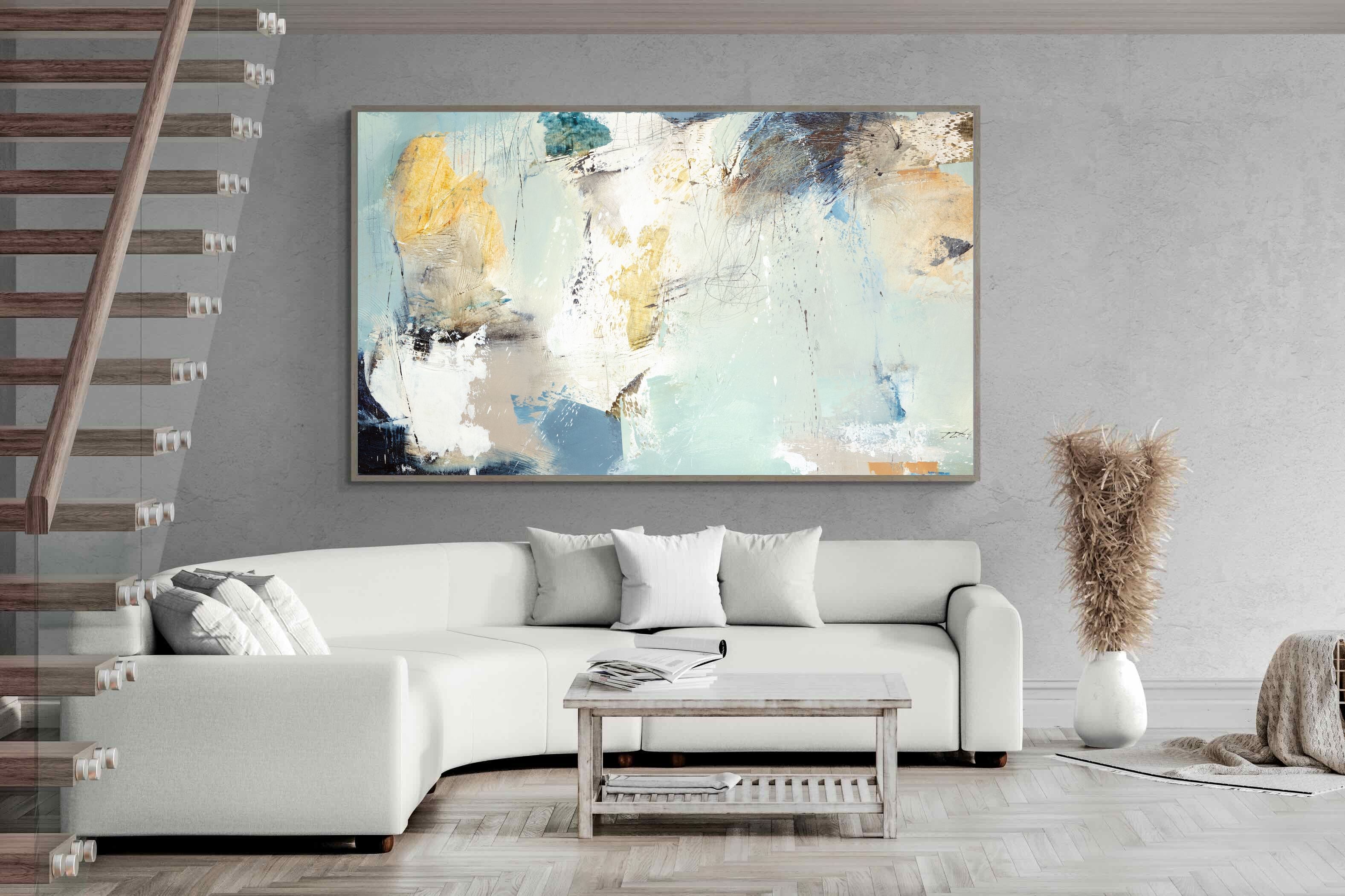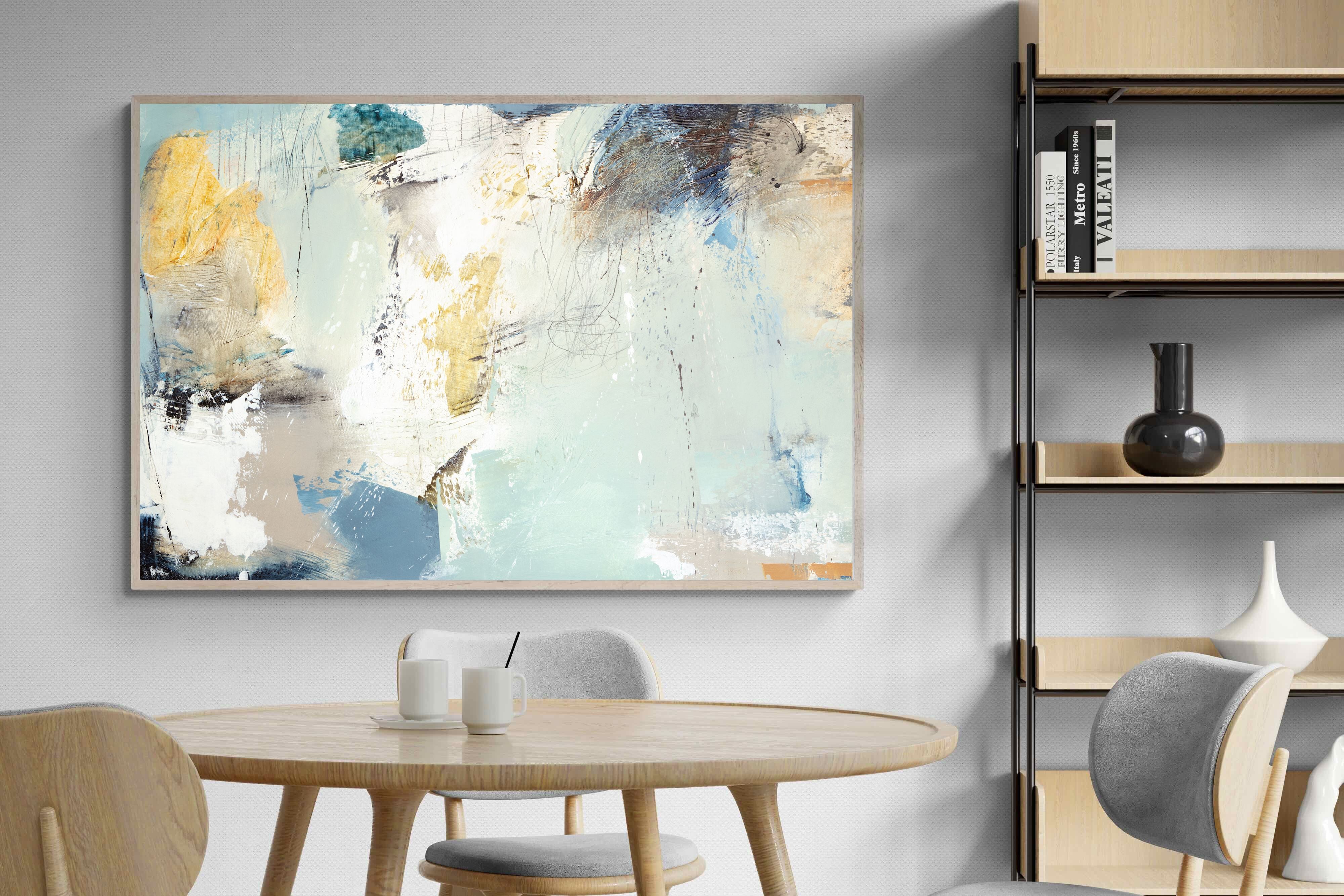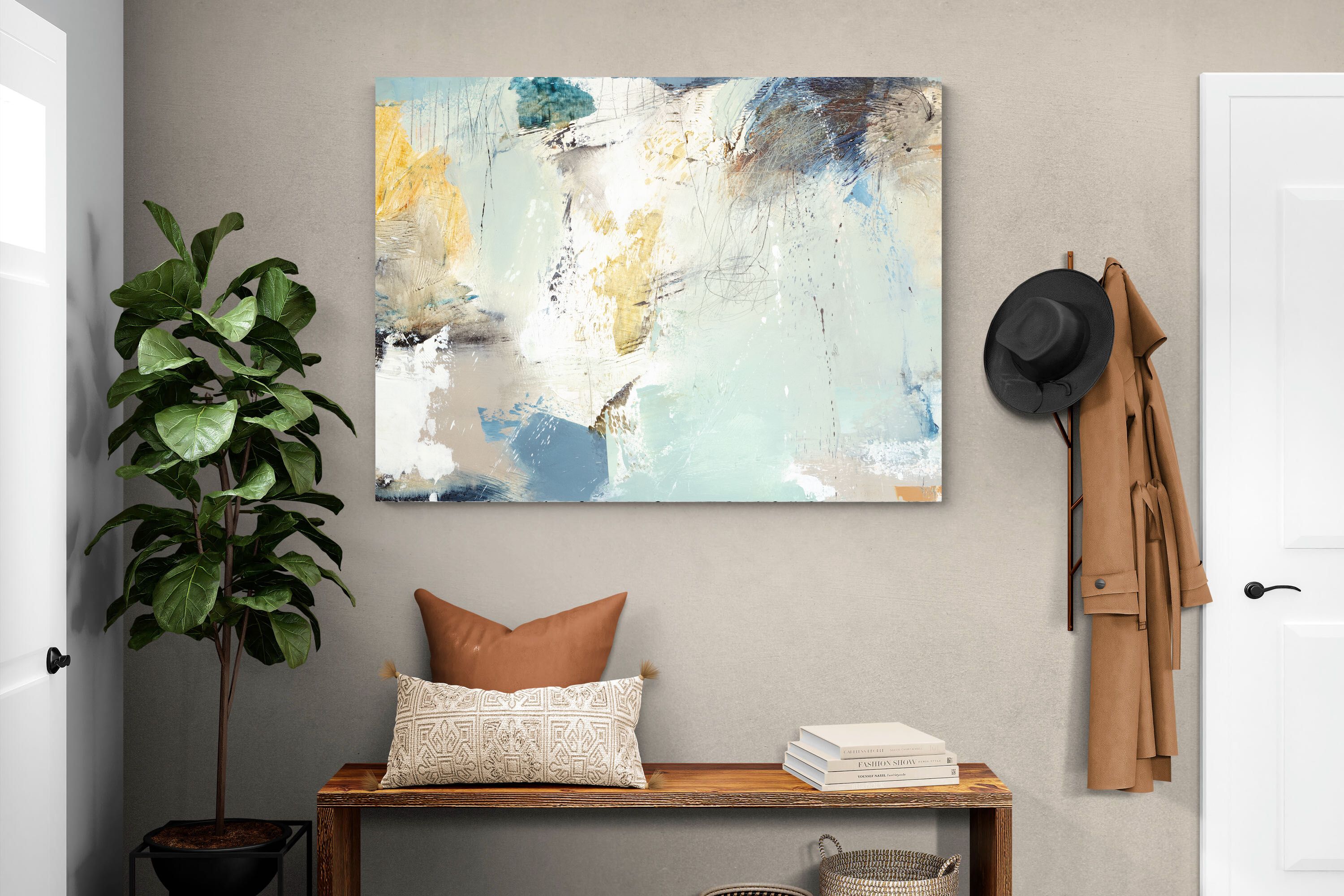 Whispering Horizon by Natasha Barnes evokes the serenity of sea and sky through fluid brushstrokes and a calming blend of blues, creams, and golds. The textured abstraction suggests movement and light, creating a tranquil, dreamlike mood. Perfect for modern living rooms, coastal-inspired interiors, or minimalist bedrooms, this elegant artwork adds a refined touch of sophistication and balance to spaces seeking calm, openness, and understated beauty.