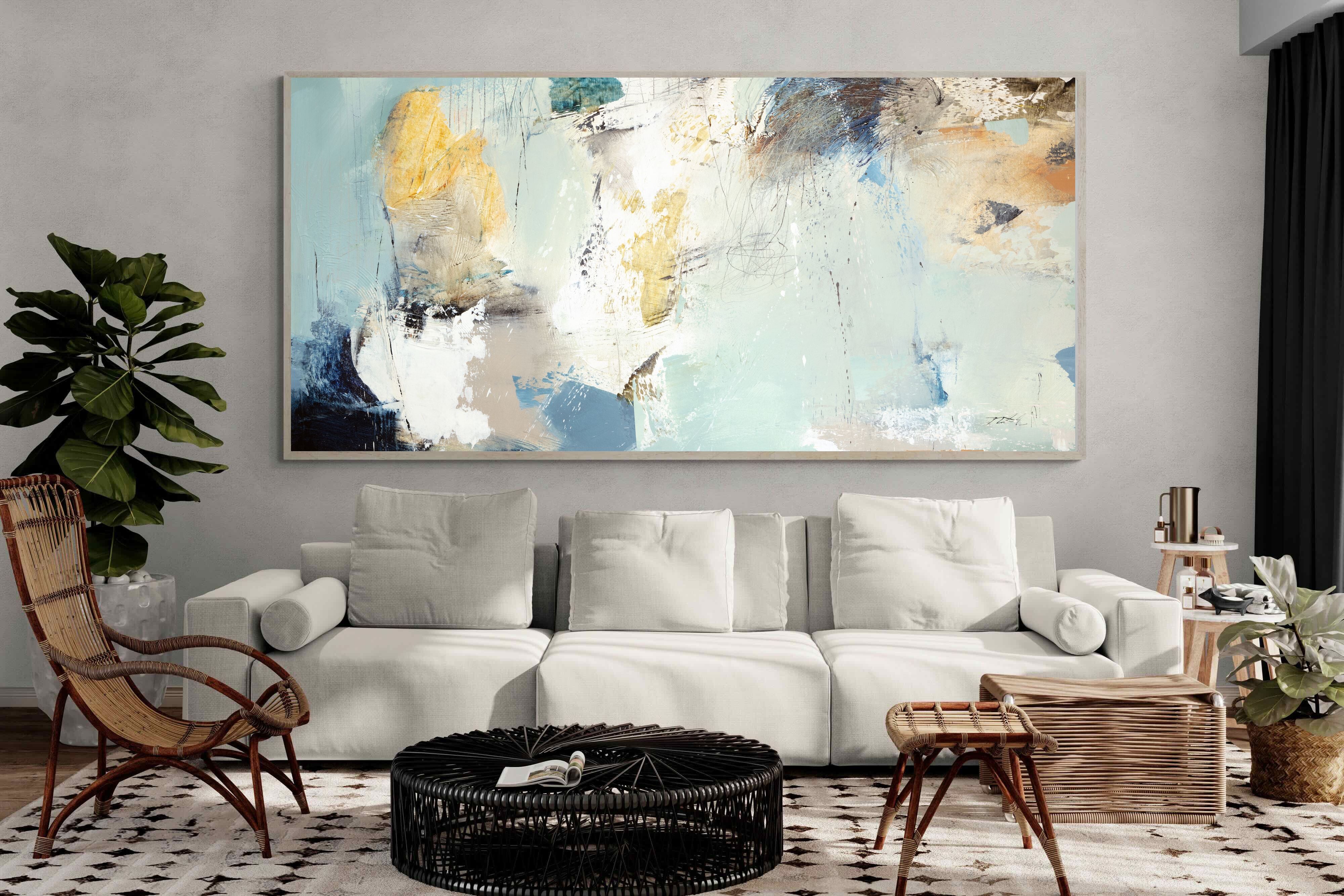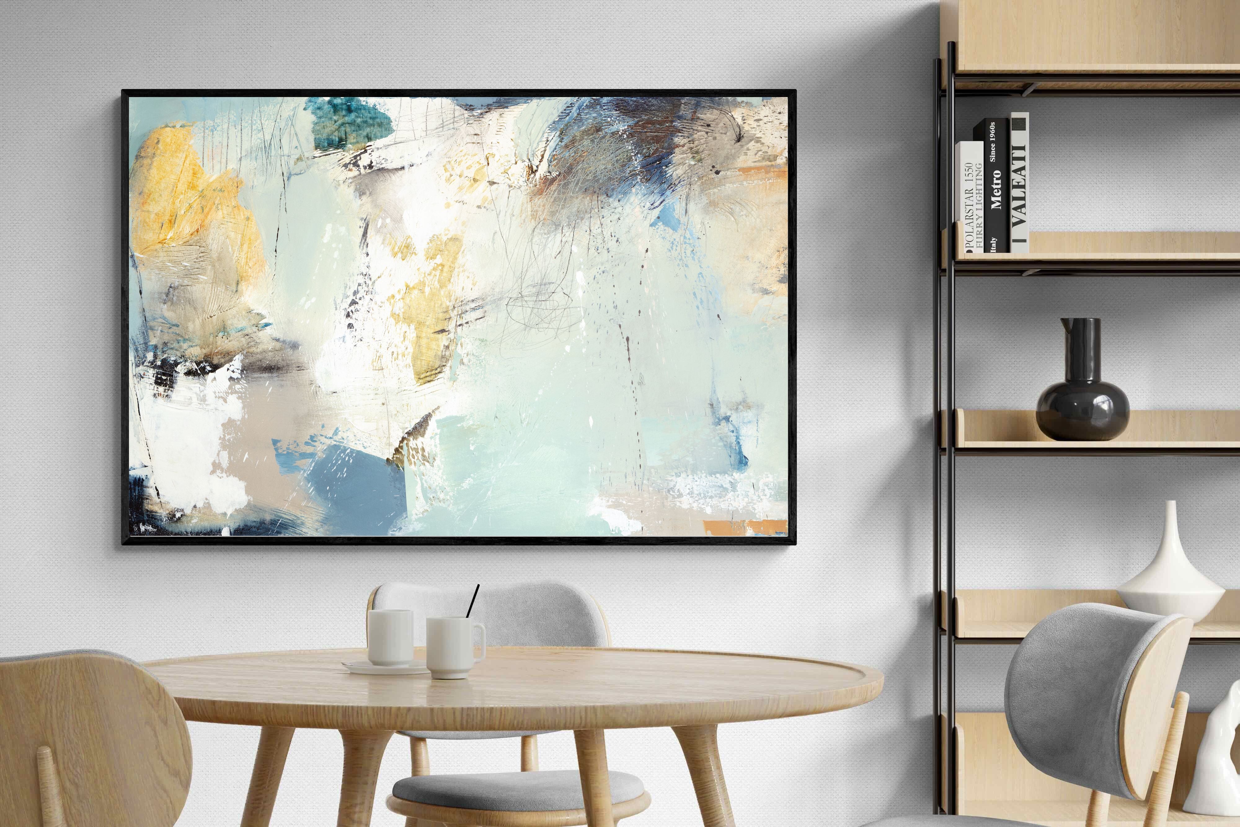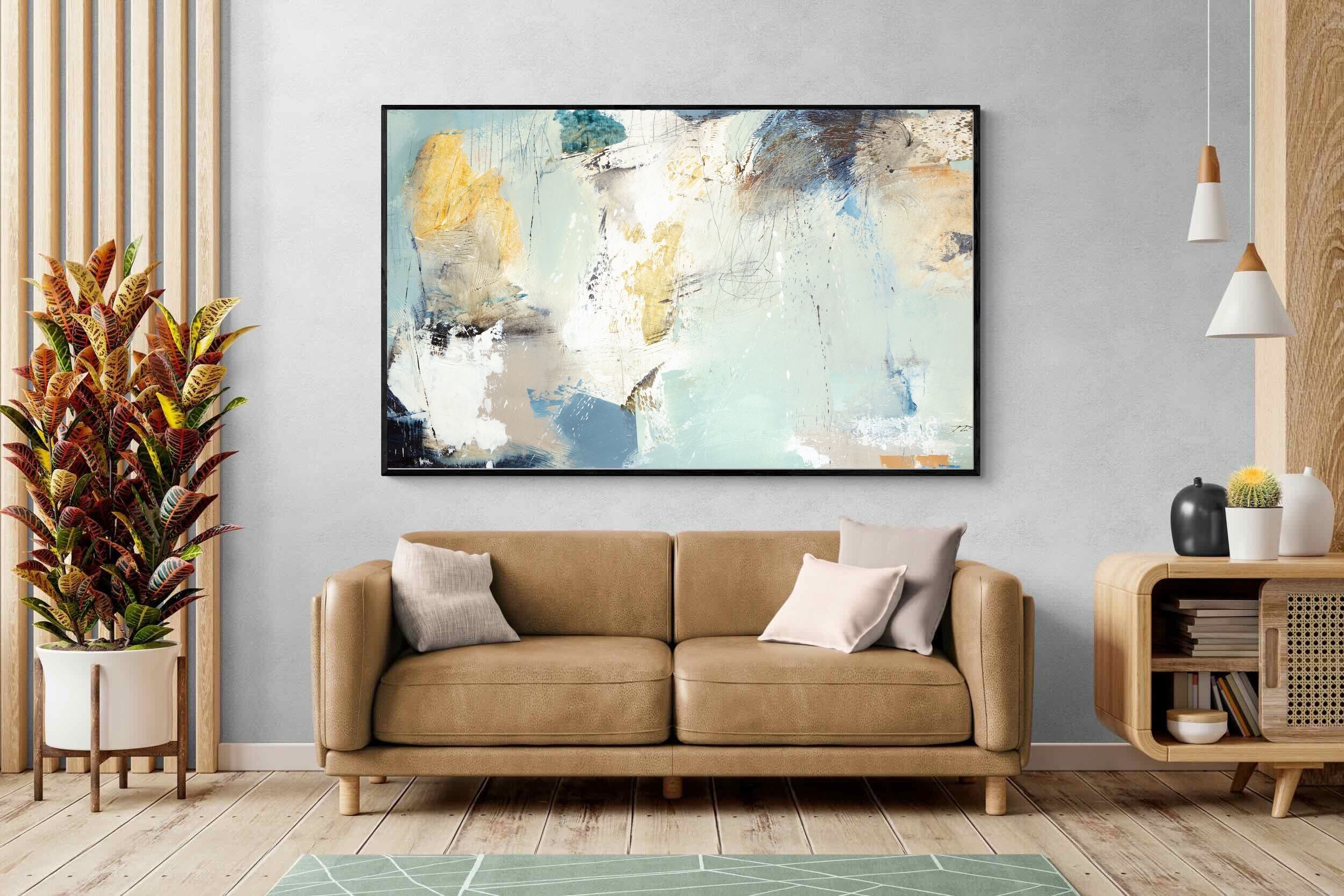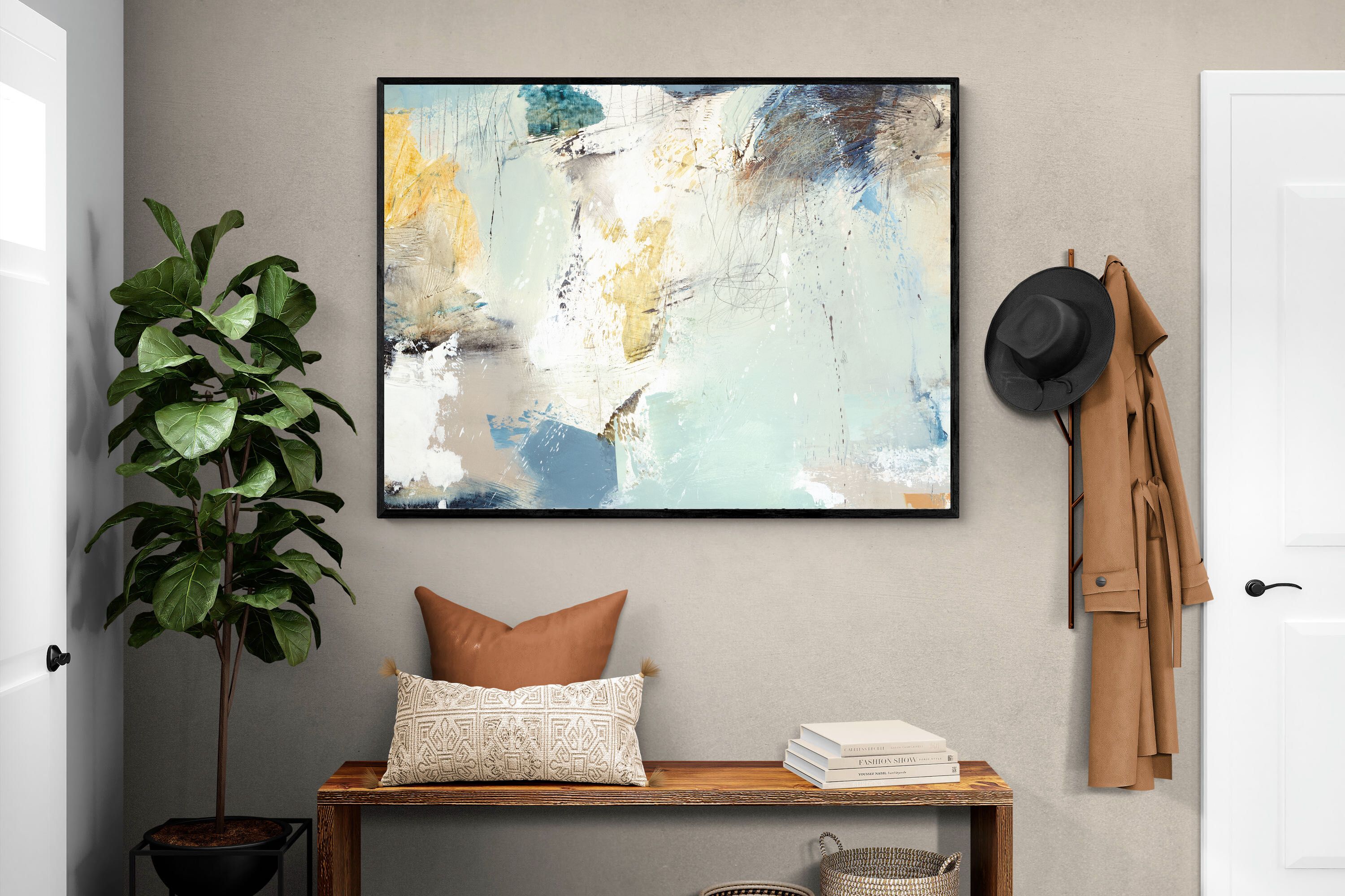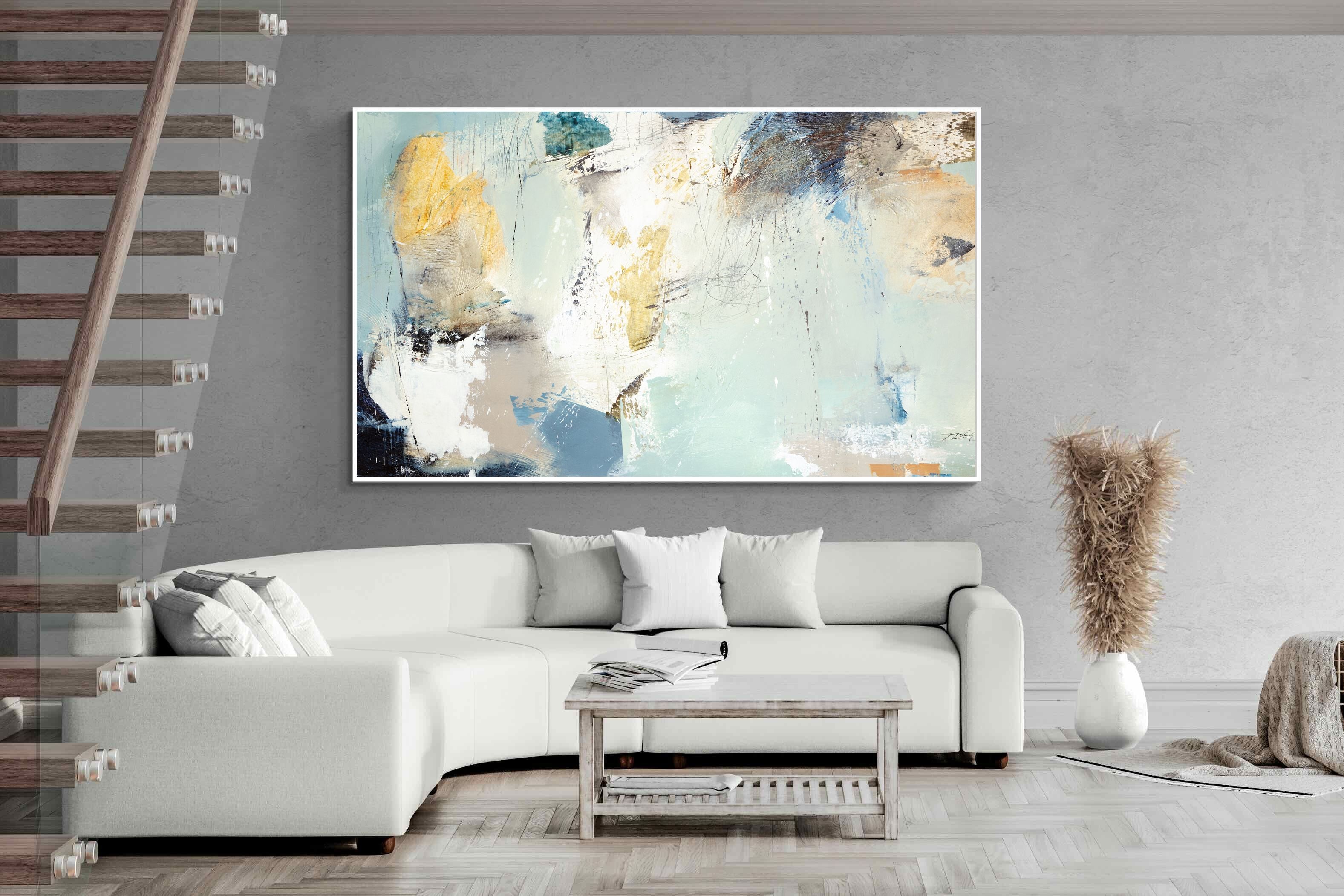 Whispering Horizon by Natasha Barnes evokes the serenity of sea and sky through fluid brushstrokes and a calming blend of blues, creams, and golds. The textured abstraction suggests movement and light, creating a tranquil, dreamlike mood. Perfect for modern living rooms, coastal-inspired interiors, or minimalist bedrooms, this elegant artwork adds a refined touch of sophistication and balance to spaces seeking calm, openness, and understated beauty.