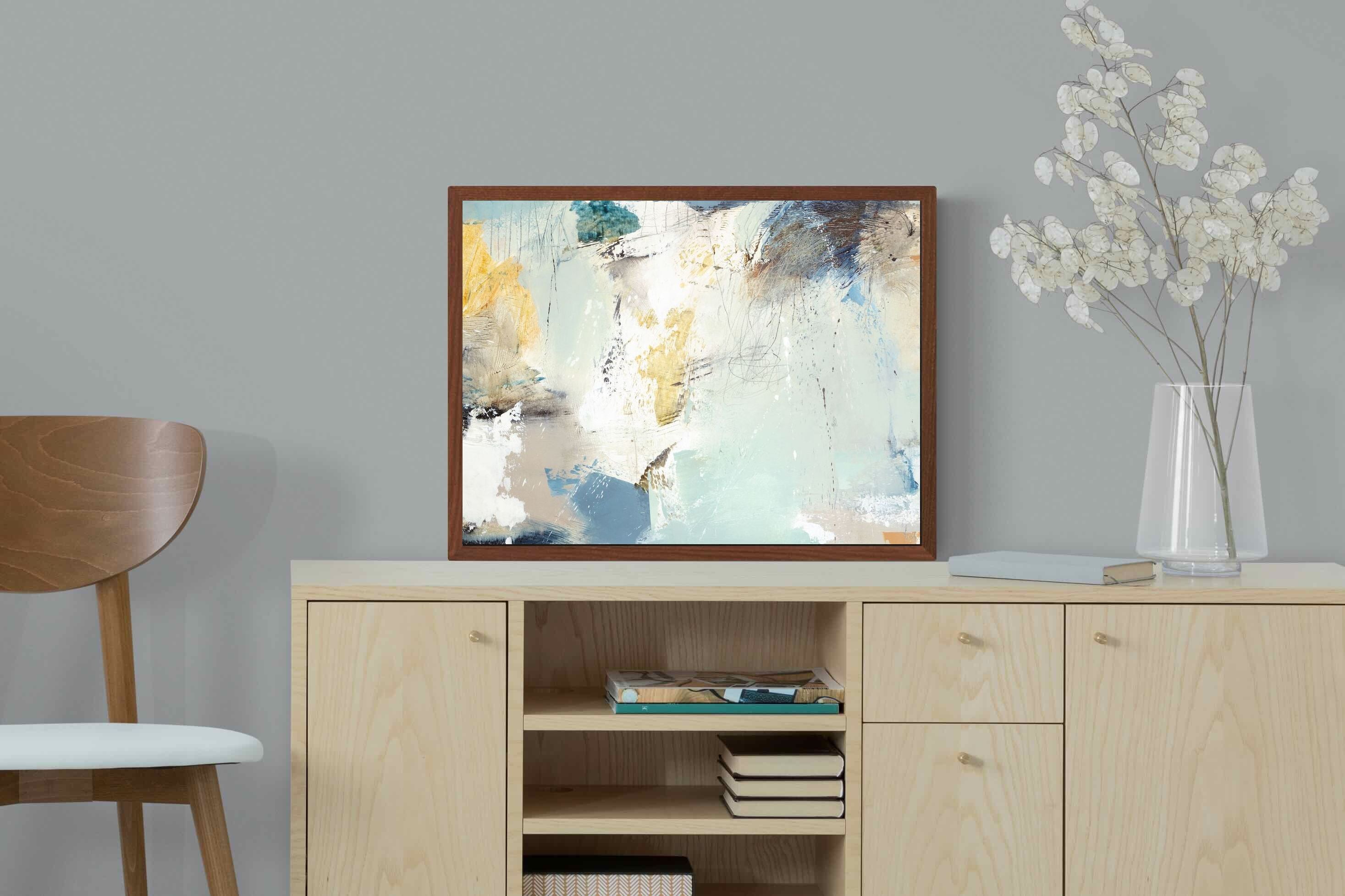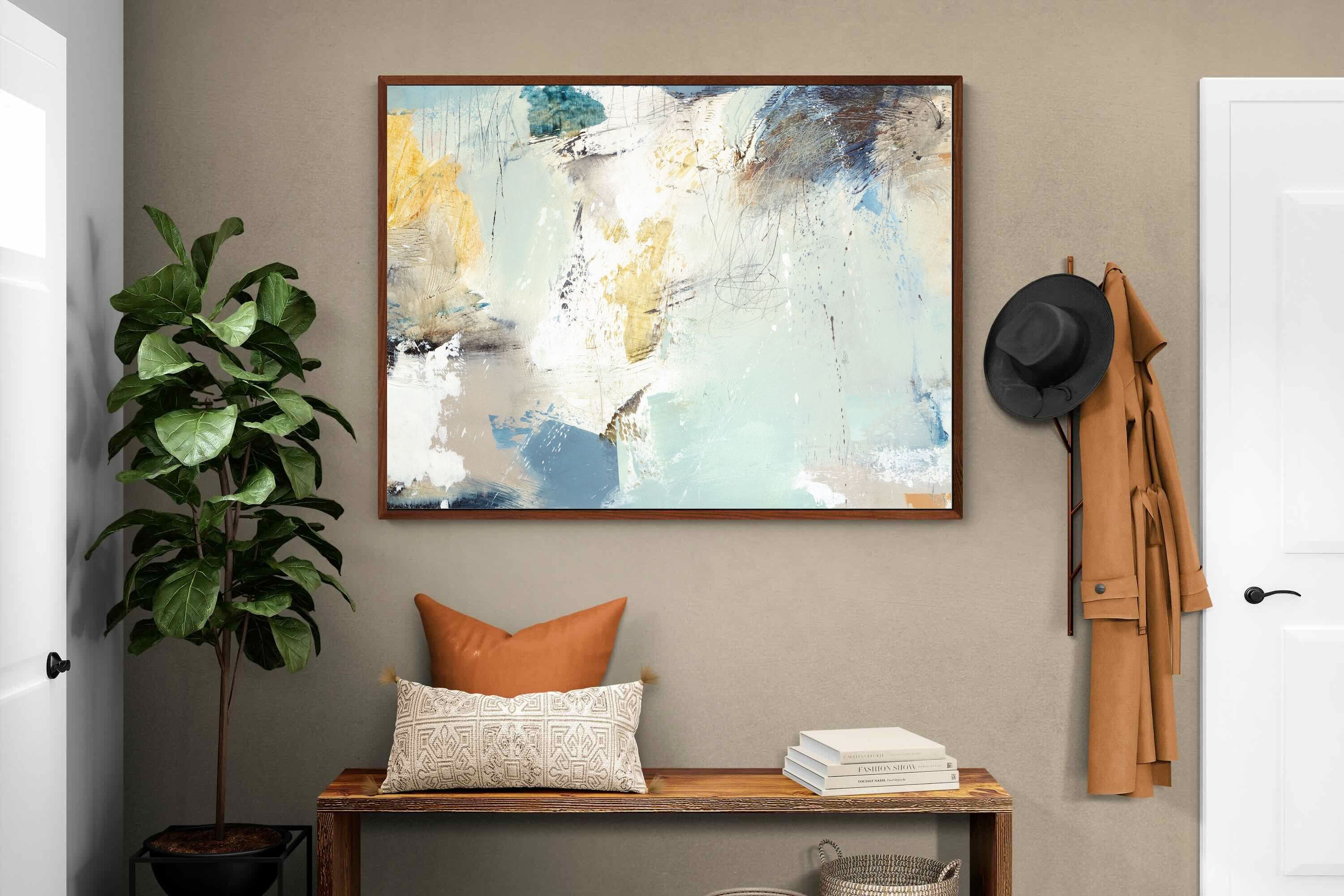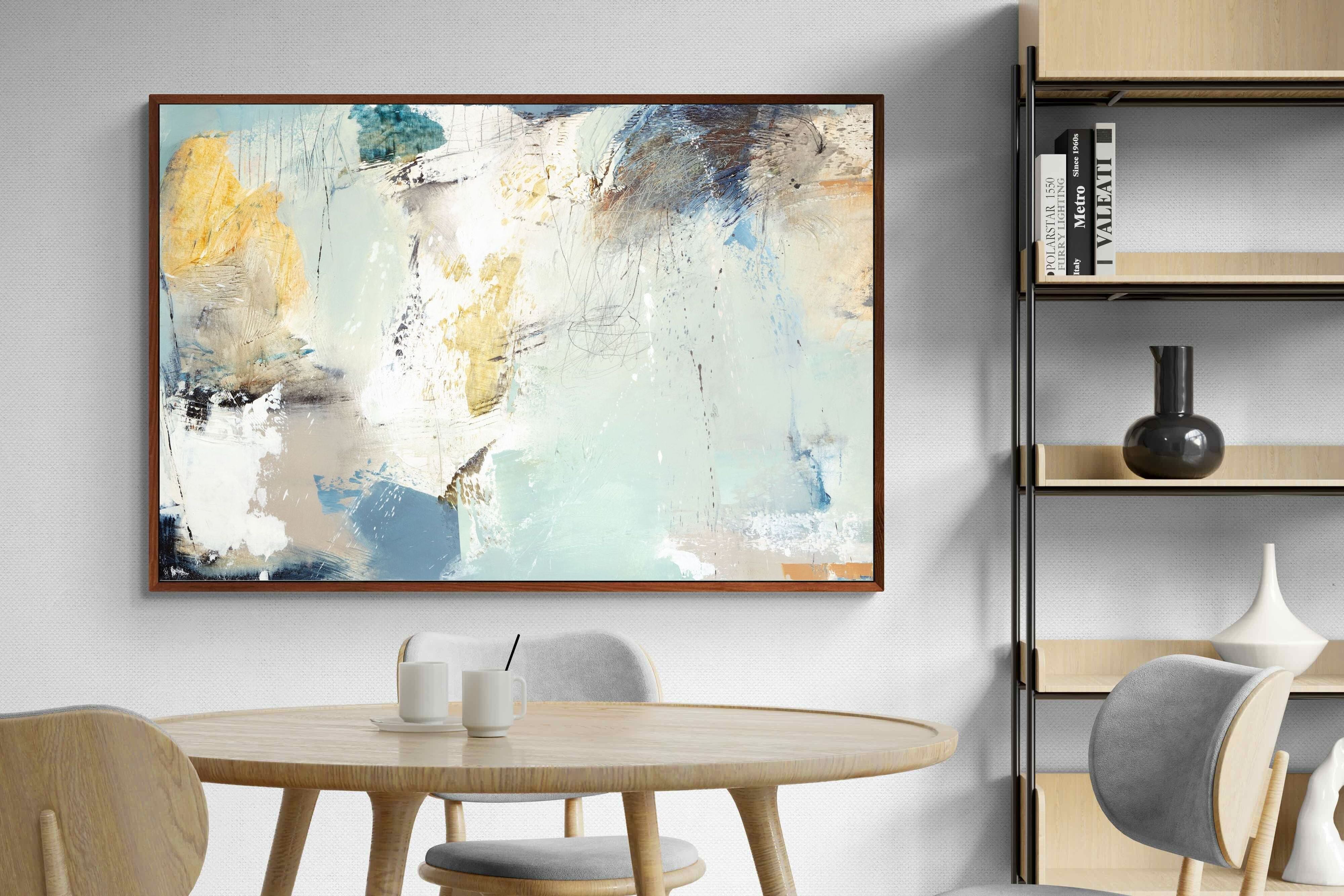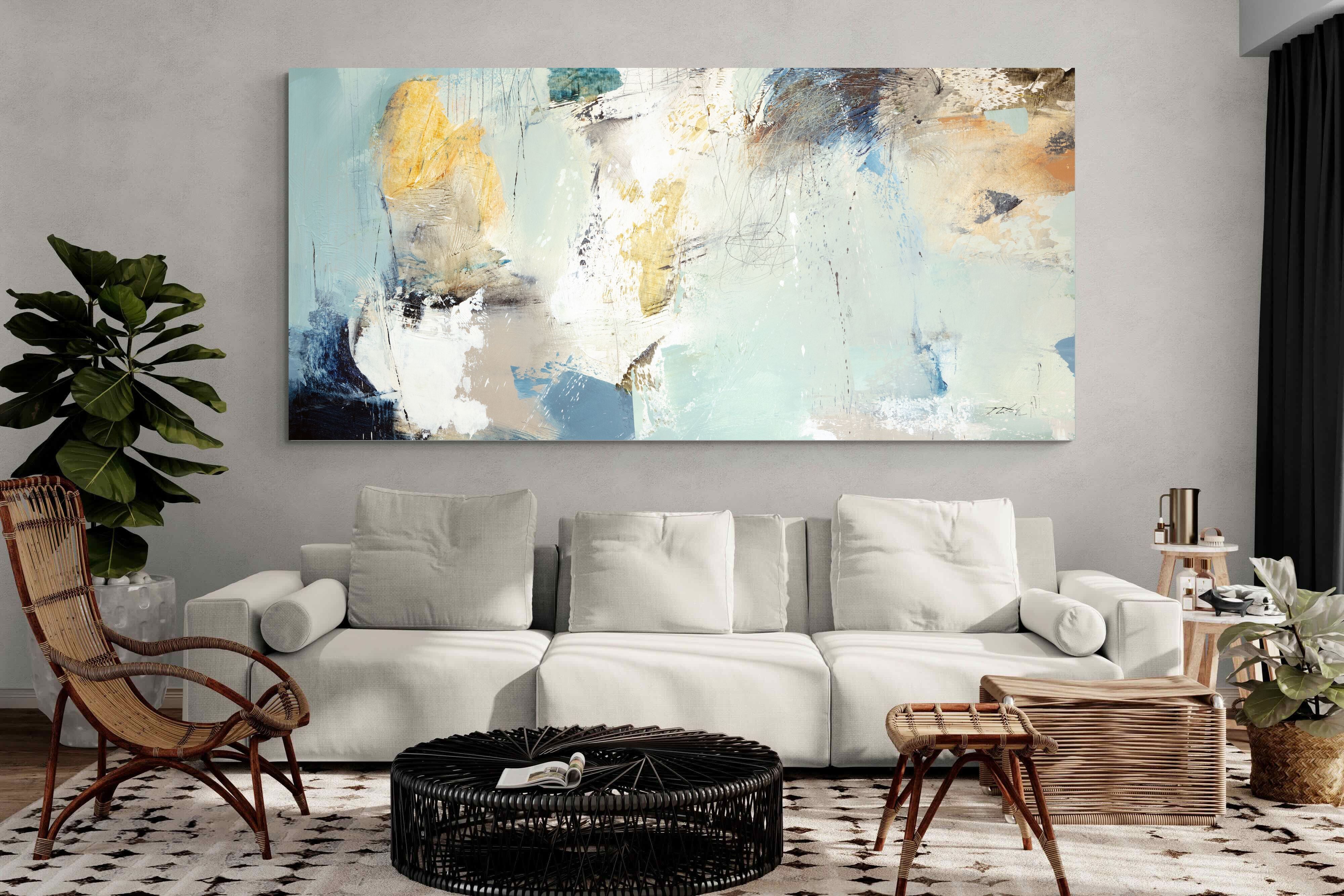 Whispering Horizon by Natasha Barnes evokes the serenity of sea and sky through fluid brushstrokes and a calming blend of blues, creams, and golds. The textured abstraction suggests movement and light, creating a tranquil, dreamlike mood. Perfect for modern living rooms, coastal-inspired interiors, or minimalist bedrooms, this elegant artwork adds a refined touch of sophistication and balance to spaces seeking calm, openness, and understated beauty.