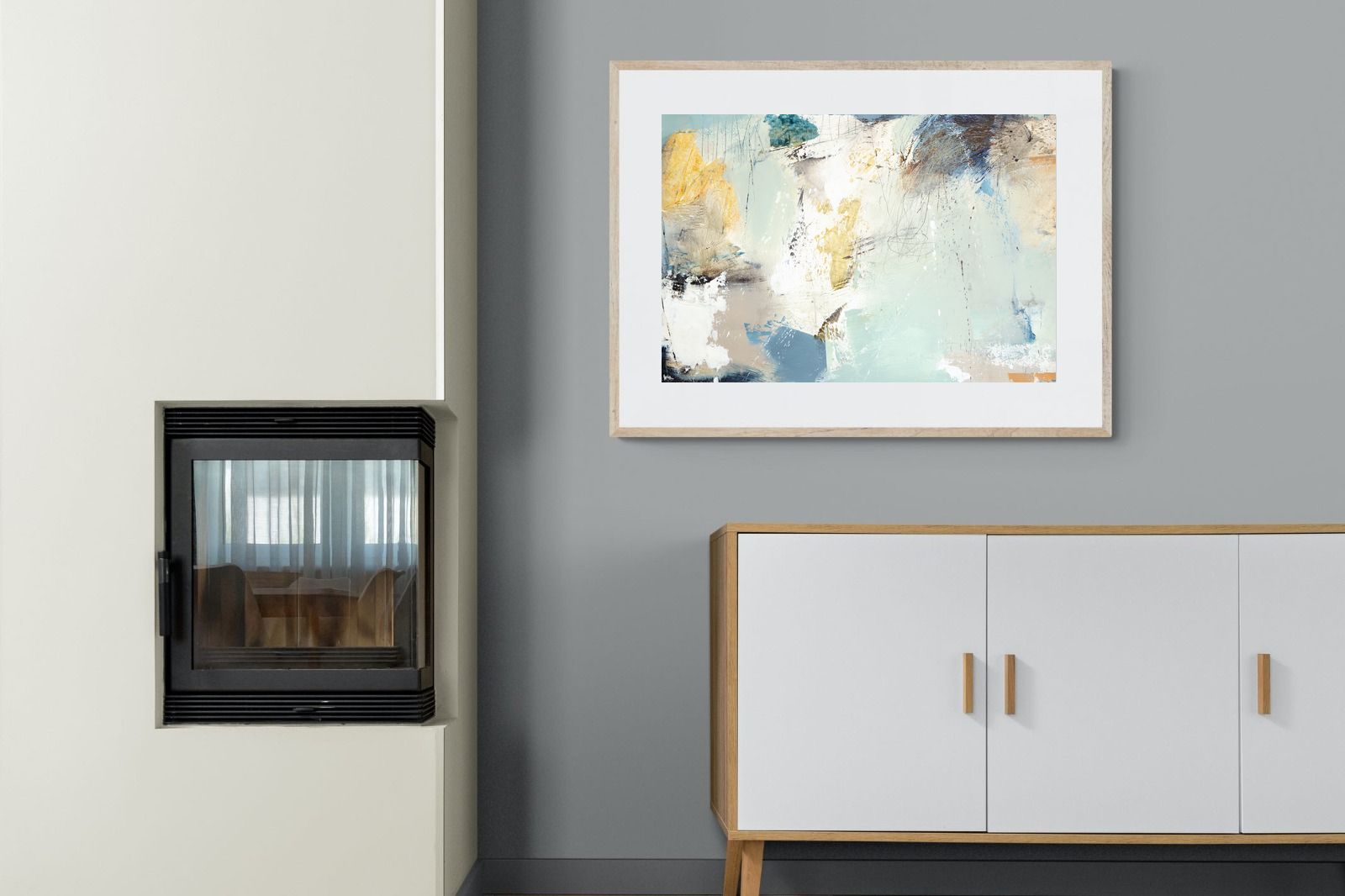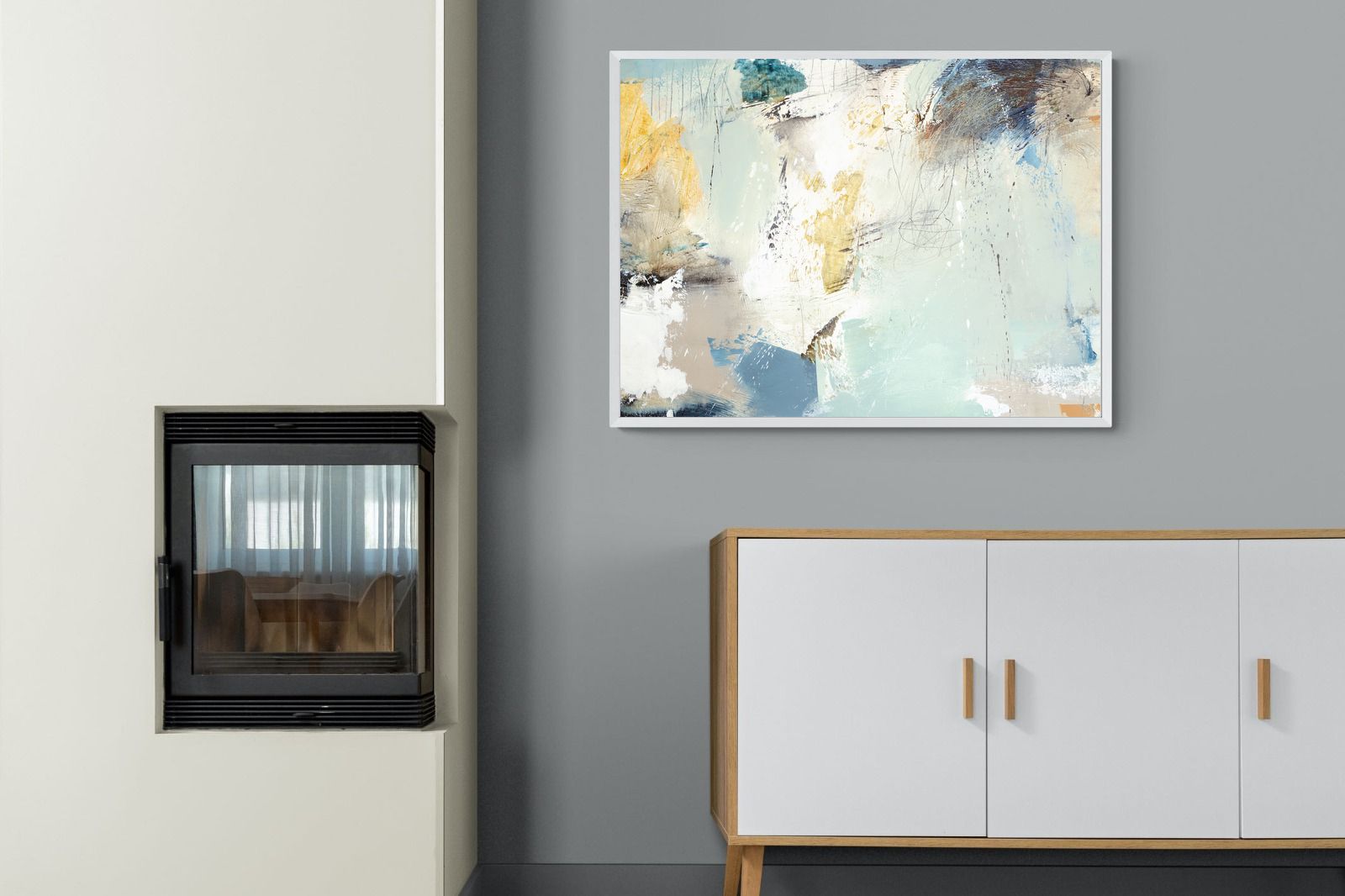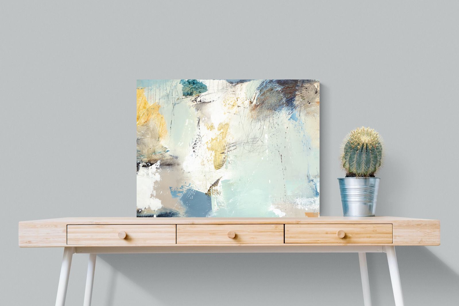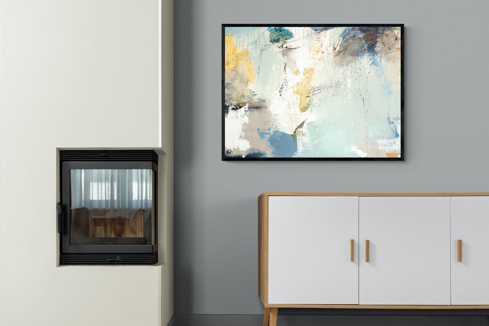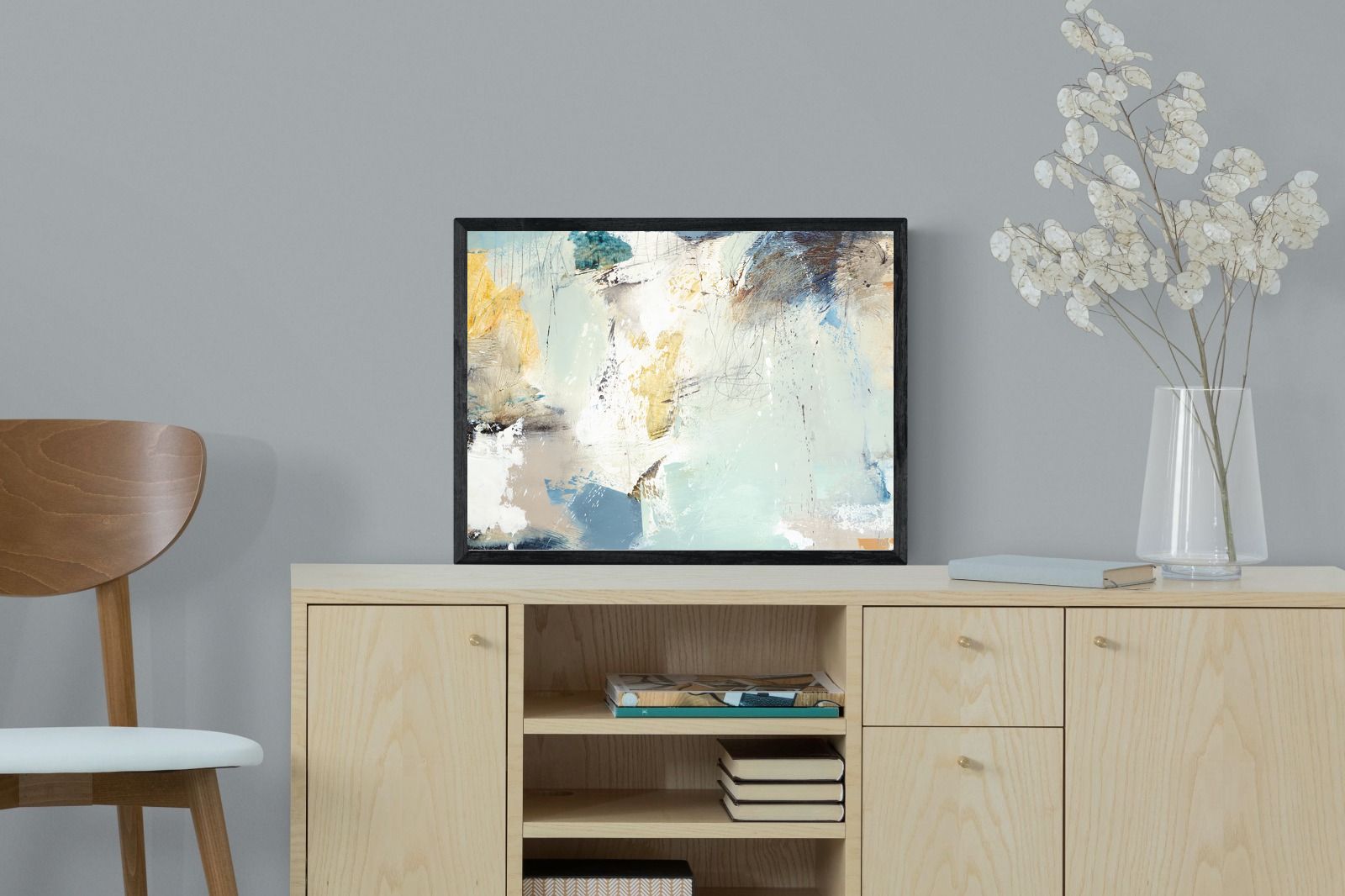 Whispering Horizon by Natasha Barnes evokes the serenity of sea and sky through fluid brushstrokes and a calming blend of blues, creams, and golds. The textured abstraction suggests movement and light, creating a tranquil, dreamlike mood. Perfect for modern living rooms, coastal-inspired interiors, or minimalist bedrooms, this elegant artwork adds a refined touch of sophistication and balance to spaces seeking calm, openness, and understated beauty.