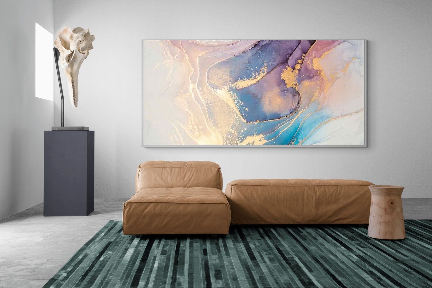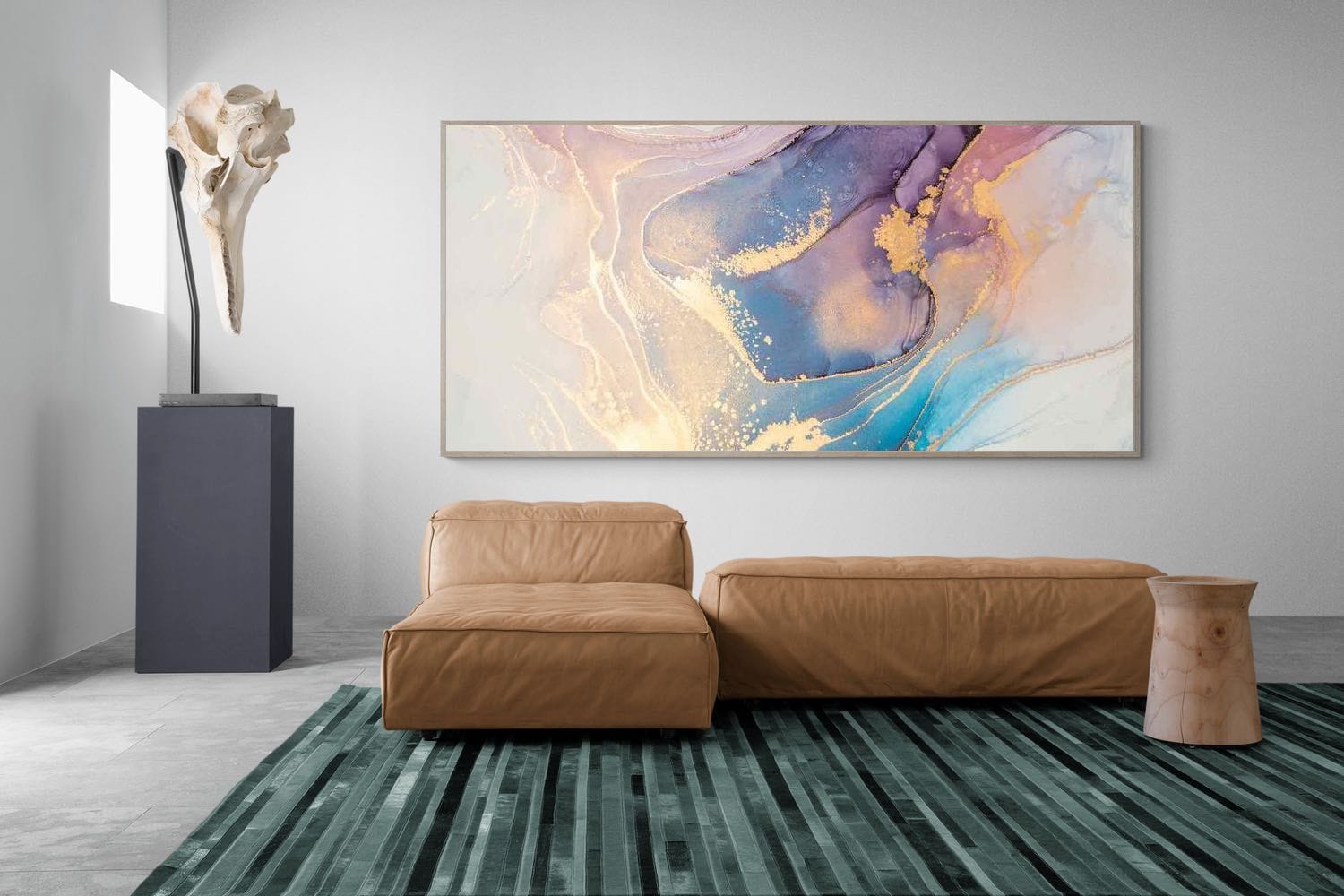 Soft blush, muted violet and flowing blue tones merge in a fluid composition highlighted with delicate gold detailing. The organic shapes create a gentle sense of movement, while the light background keeps the piece feeling open and refined. It offers a subtle yet sophisticated focal point, perfect for modern bedrooms, dressing areas or serene living spaces. This artwork balances warmth and cool tones effortlessly, delivering a contemporary aesthetic that feels both elegant and calming without losing visual interest.