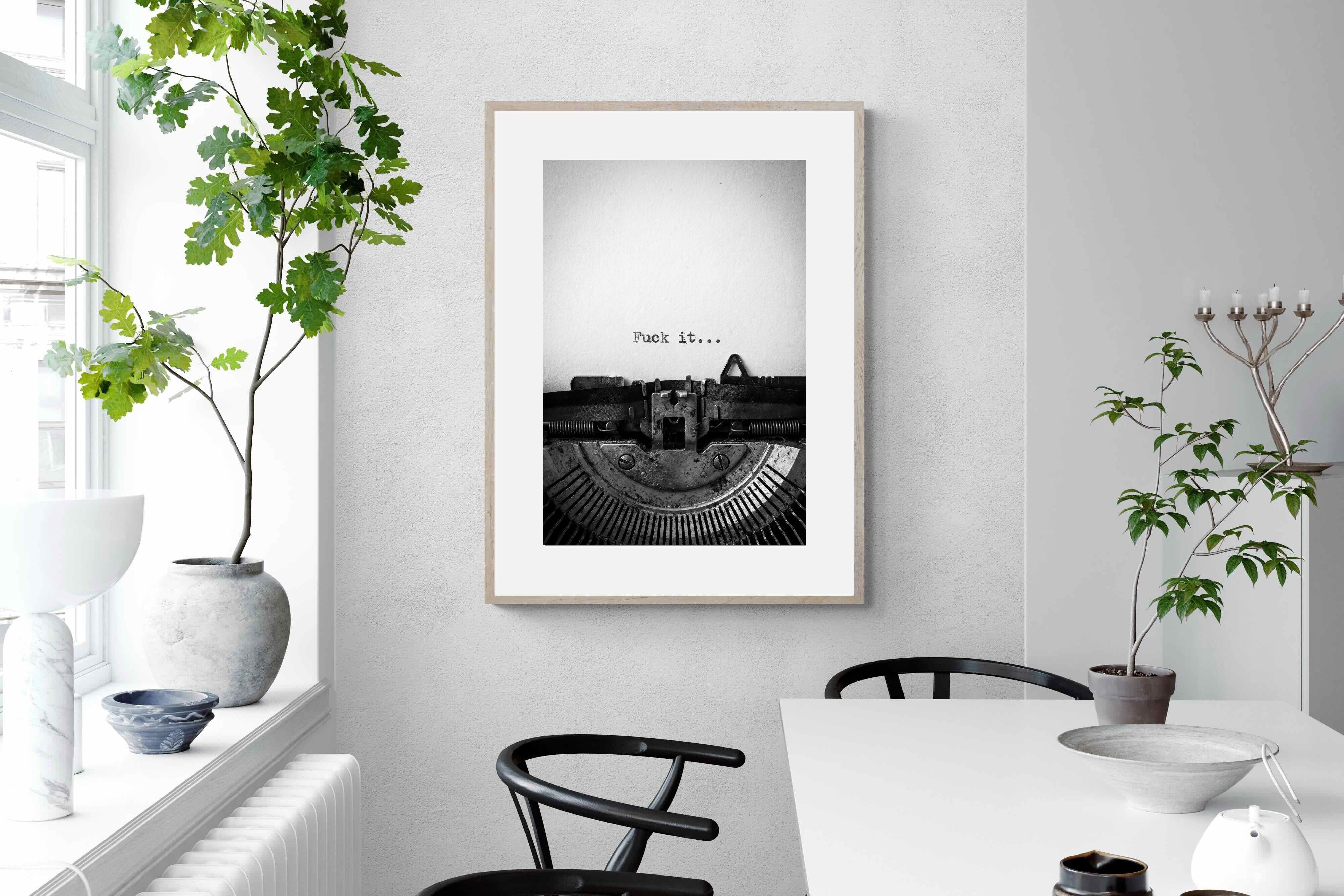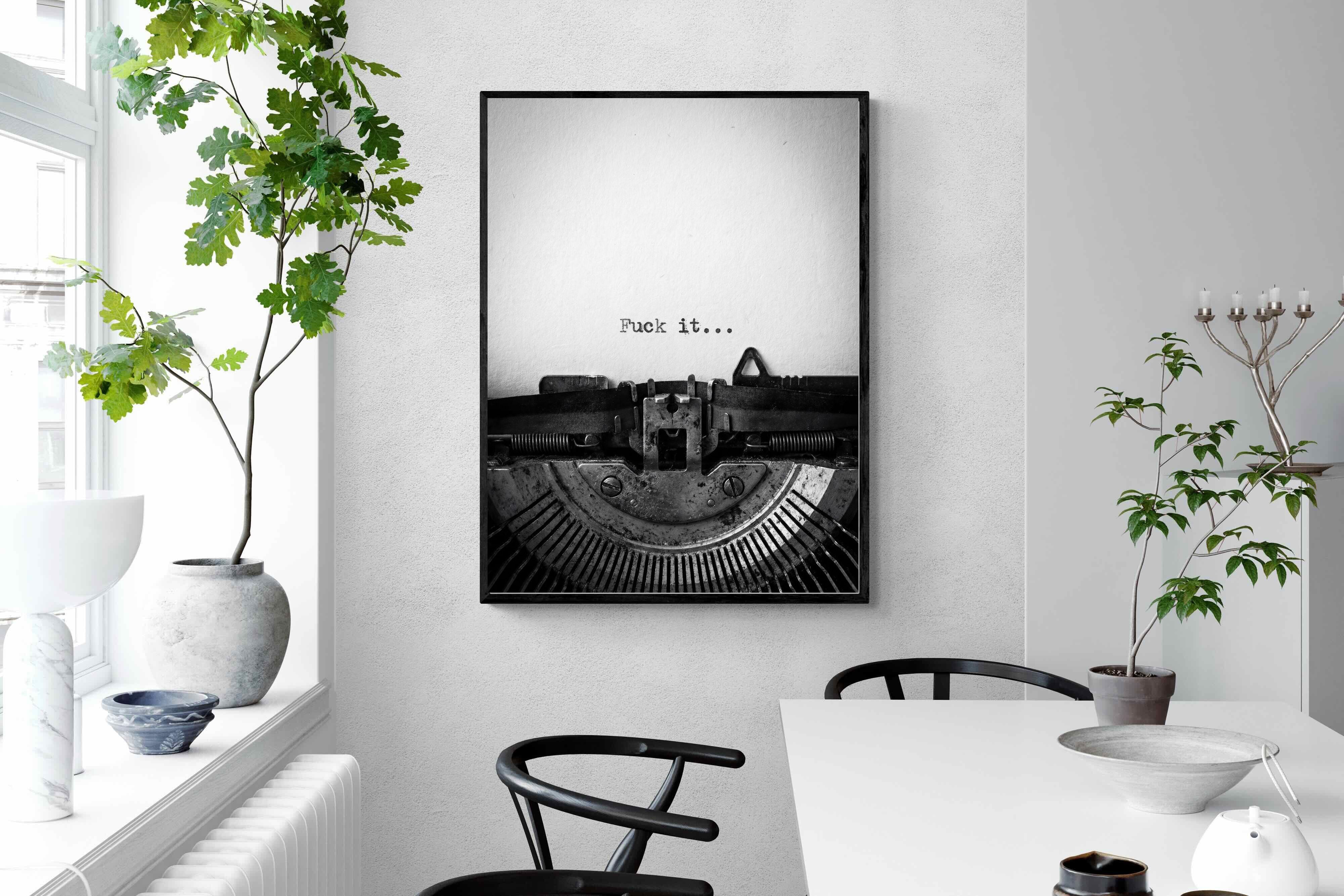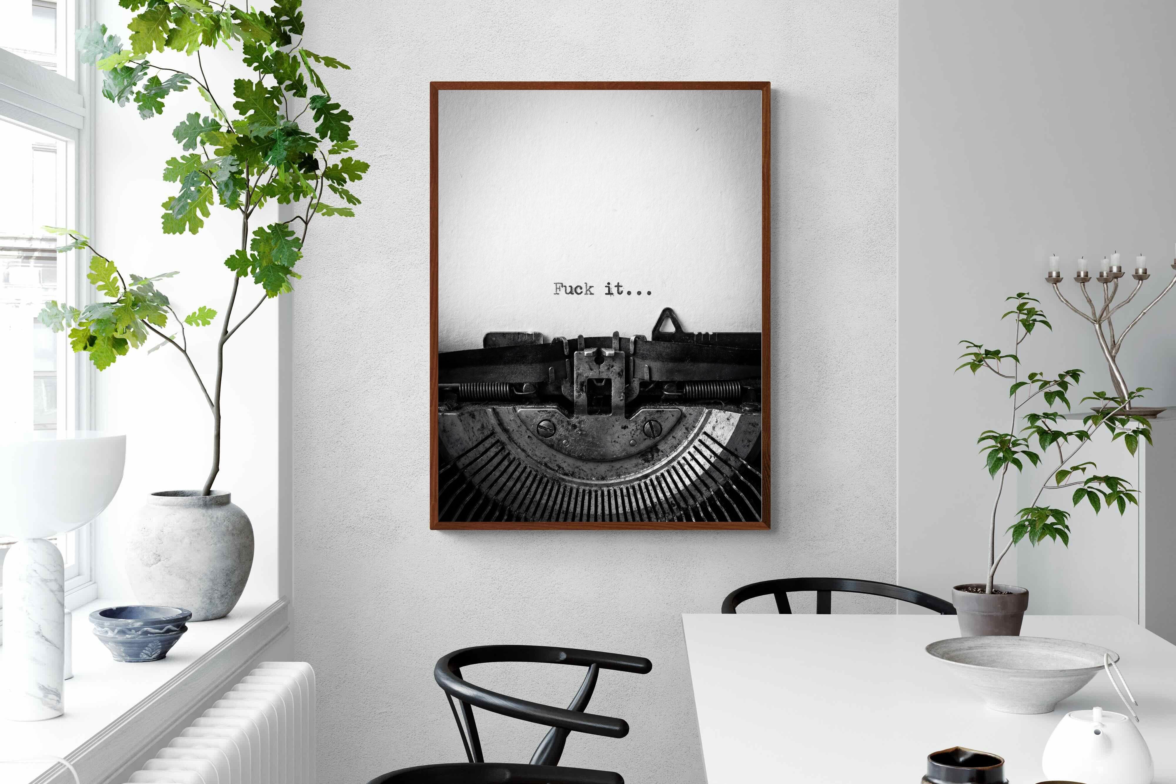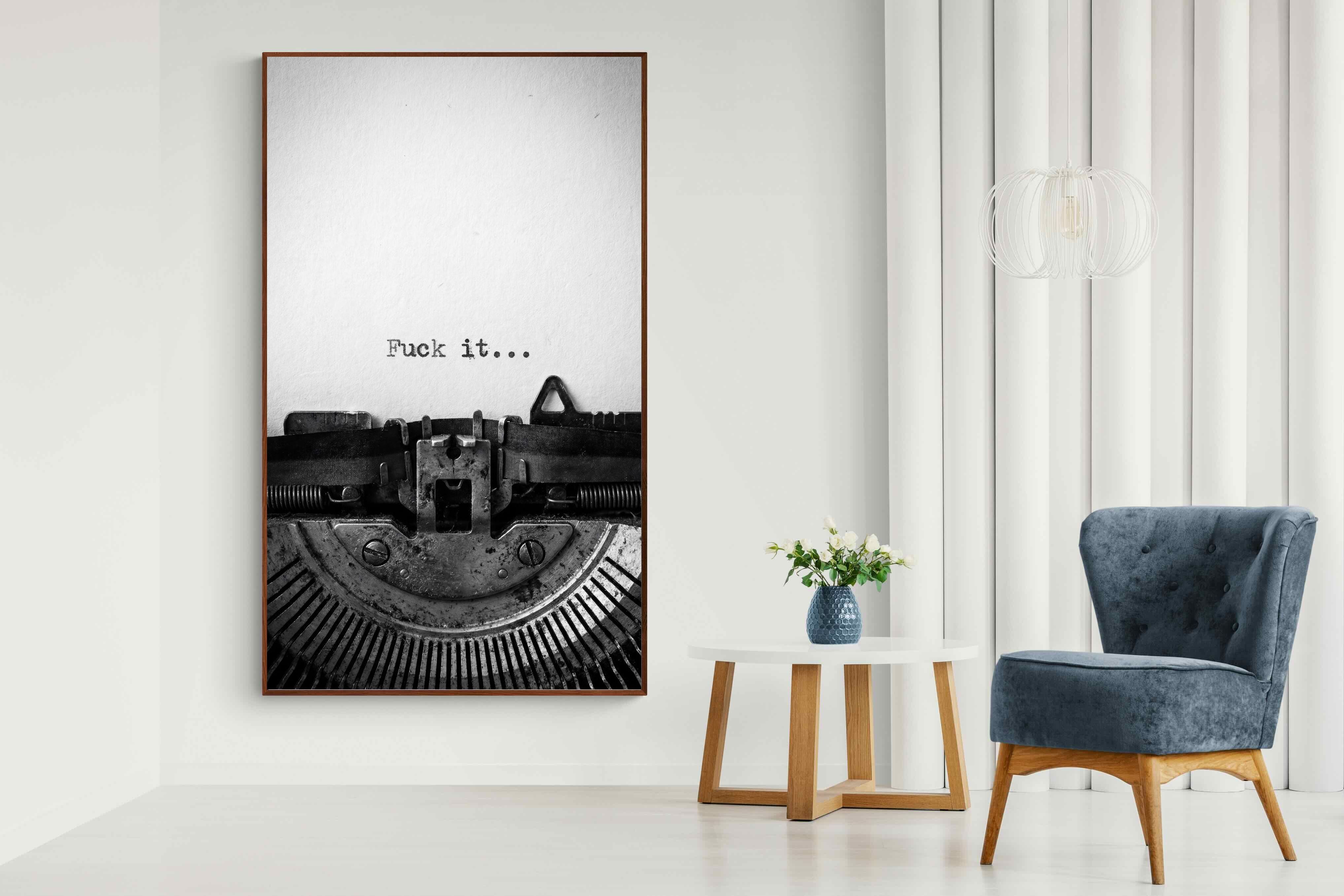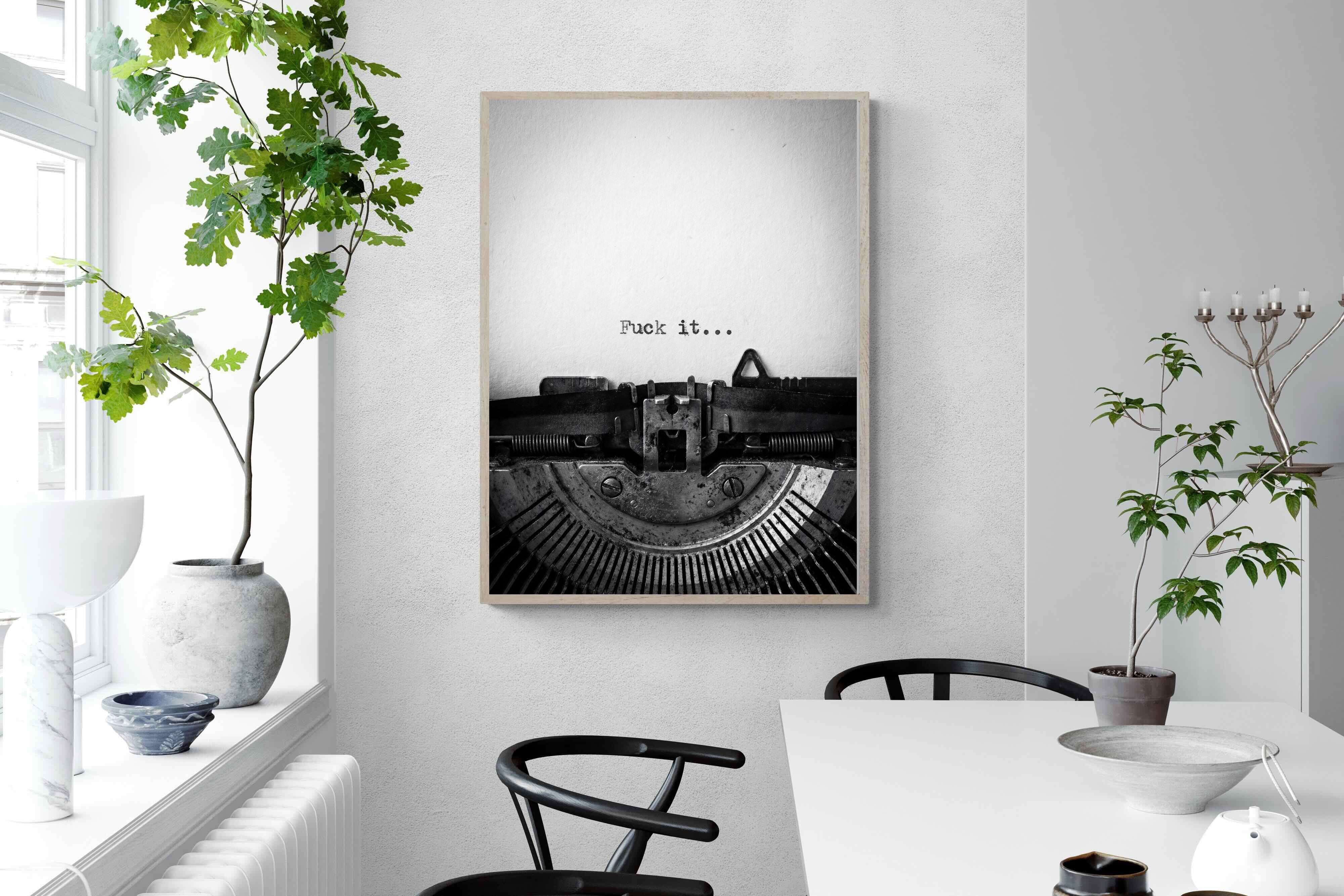 A striking monochrome photograph of a vintage typewriter capturing the blunt phrase “Fuck it…” typed onto the page. The mechanical textures, worn metal and stark typography create a raw, rebellious aesthetic that feels both nostalgic and unapologetically modern. This piece works particularly well in creative studios, home offices, bachelor pads or edgy contemporary interiors where humour and attitude are part of the décor. Printed large, the minimal composition delivers maximum impact.
