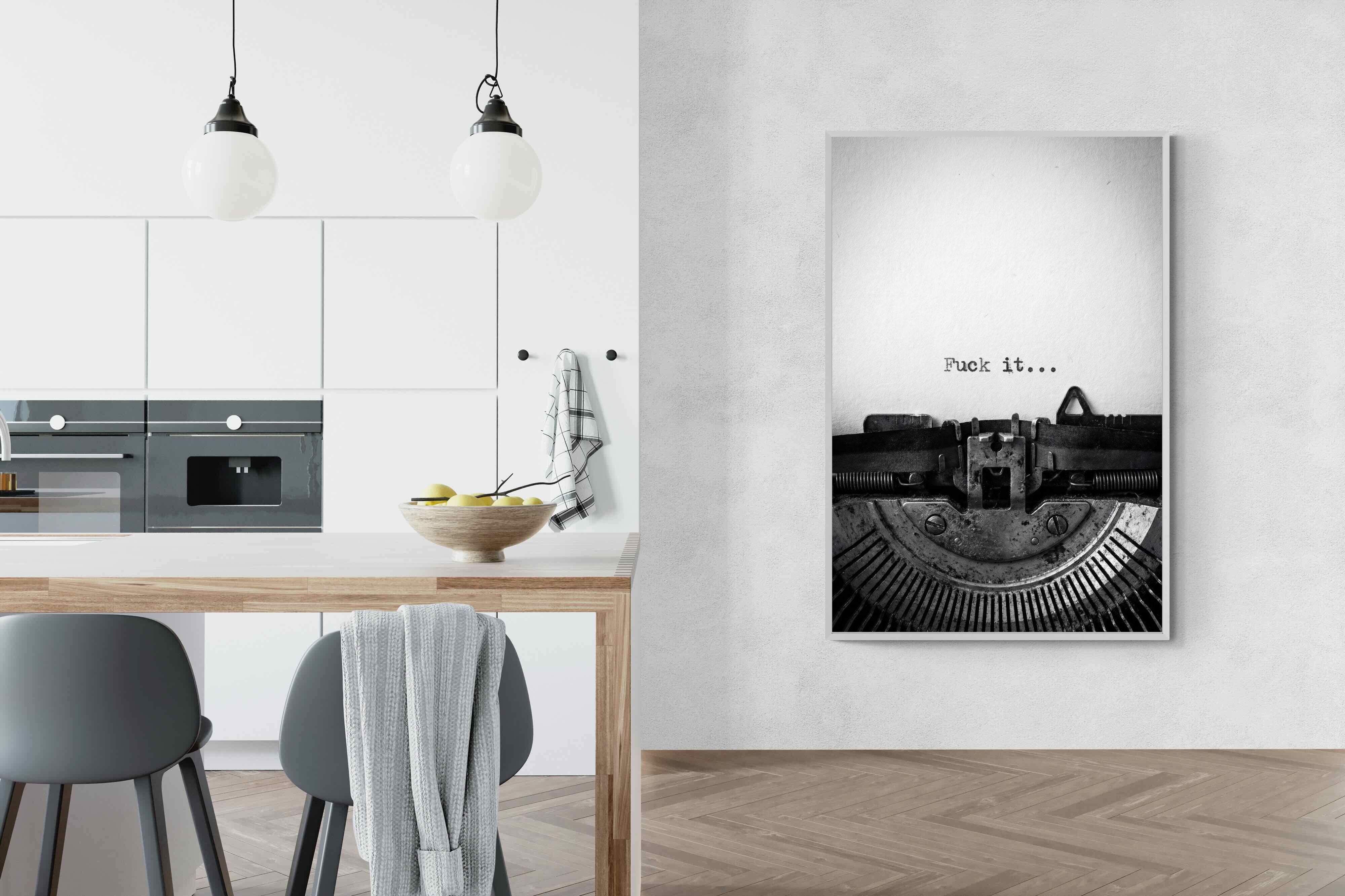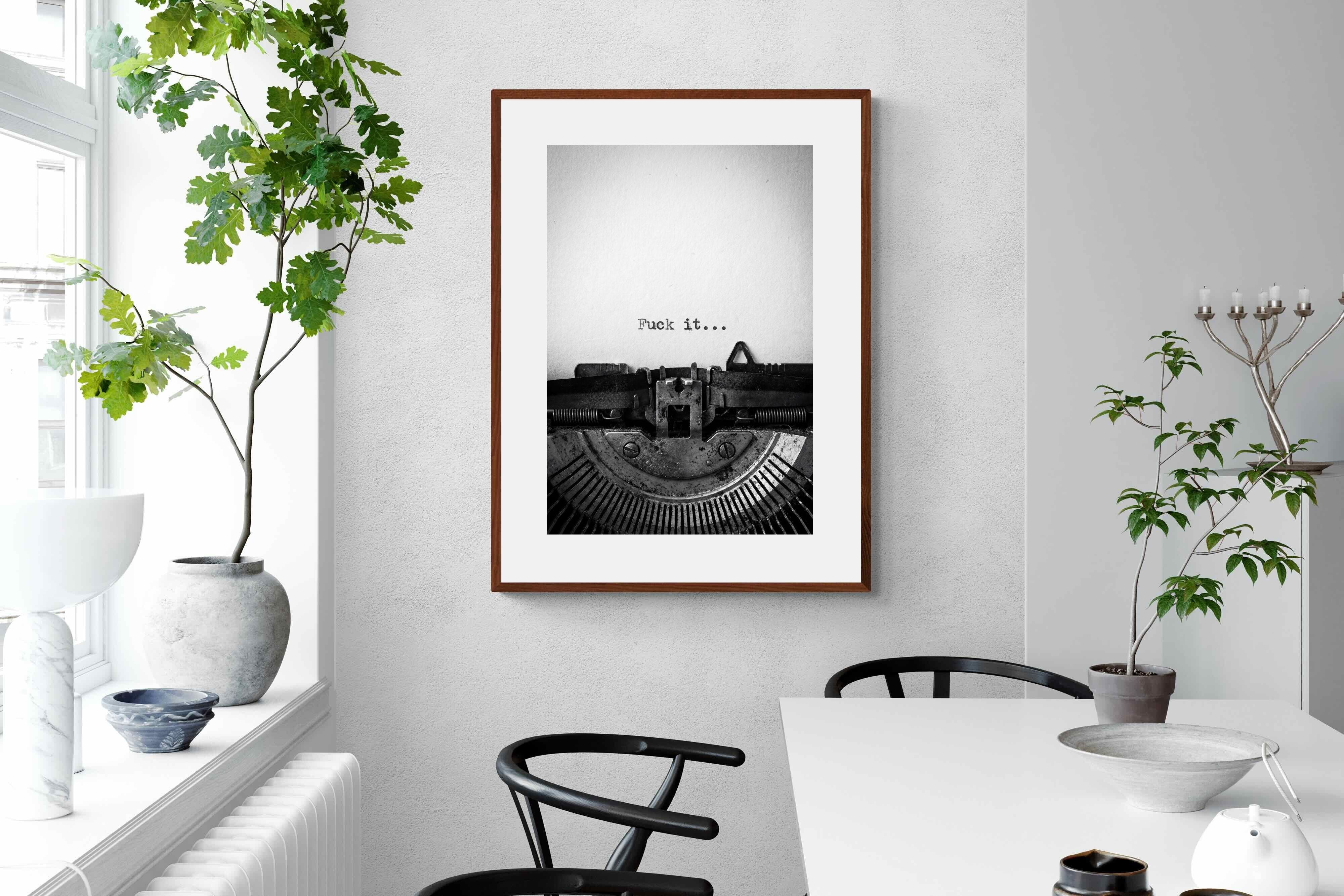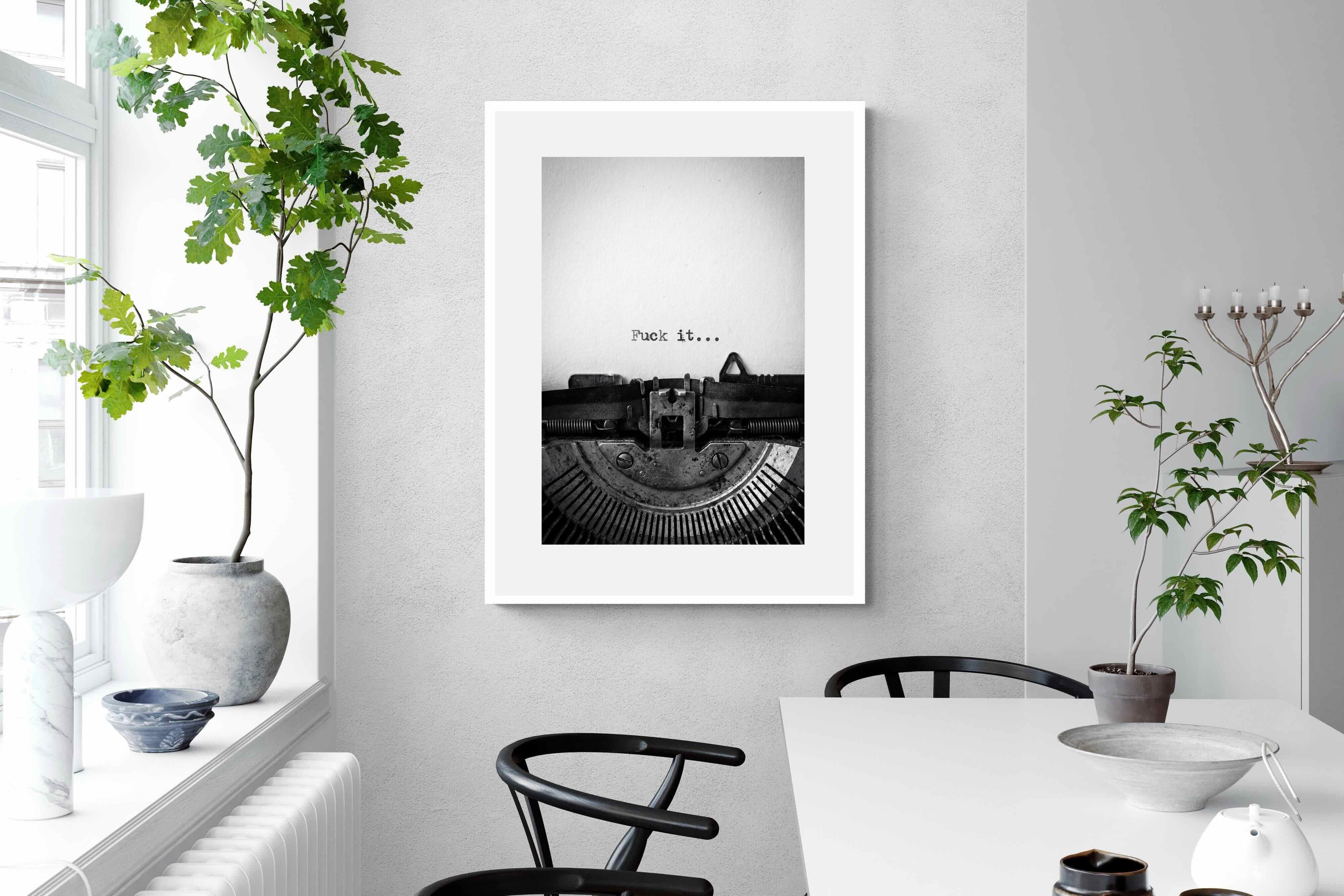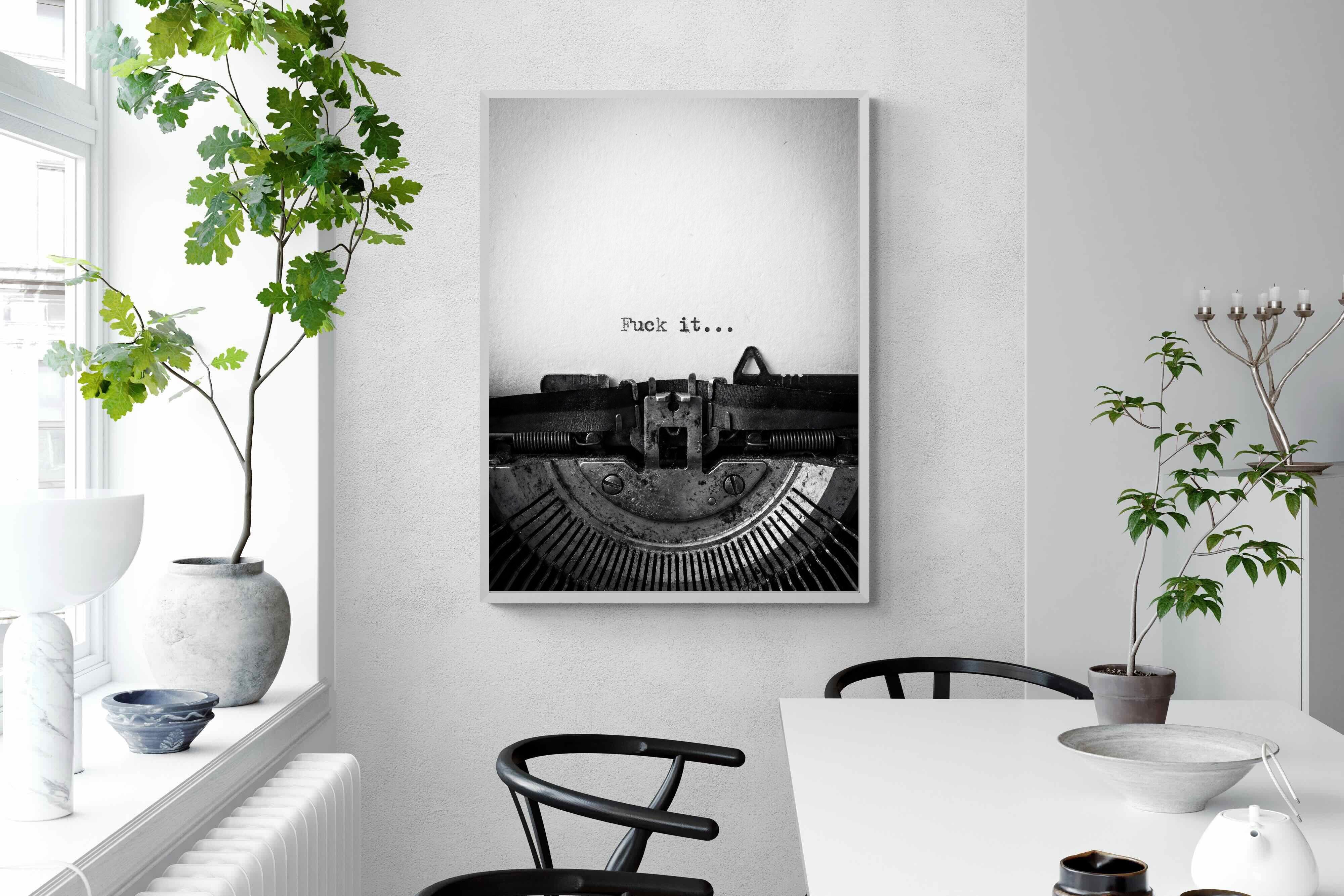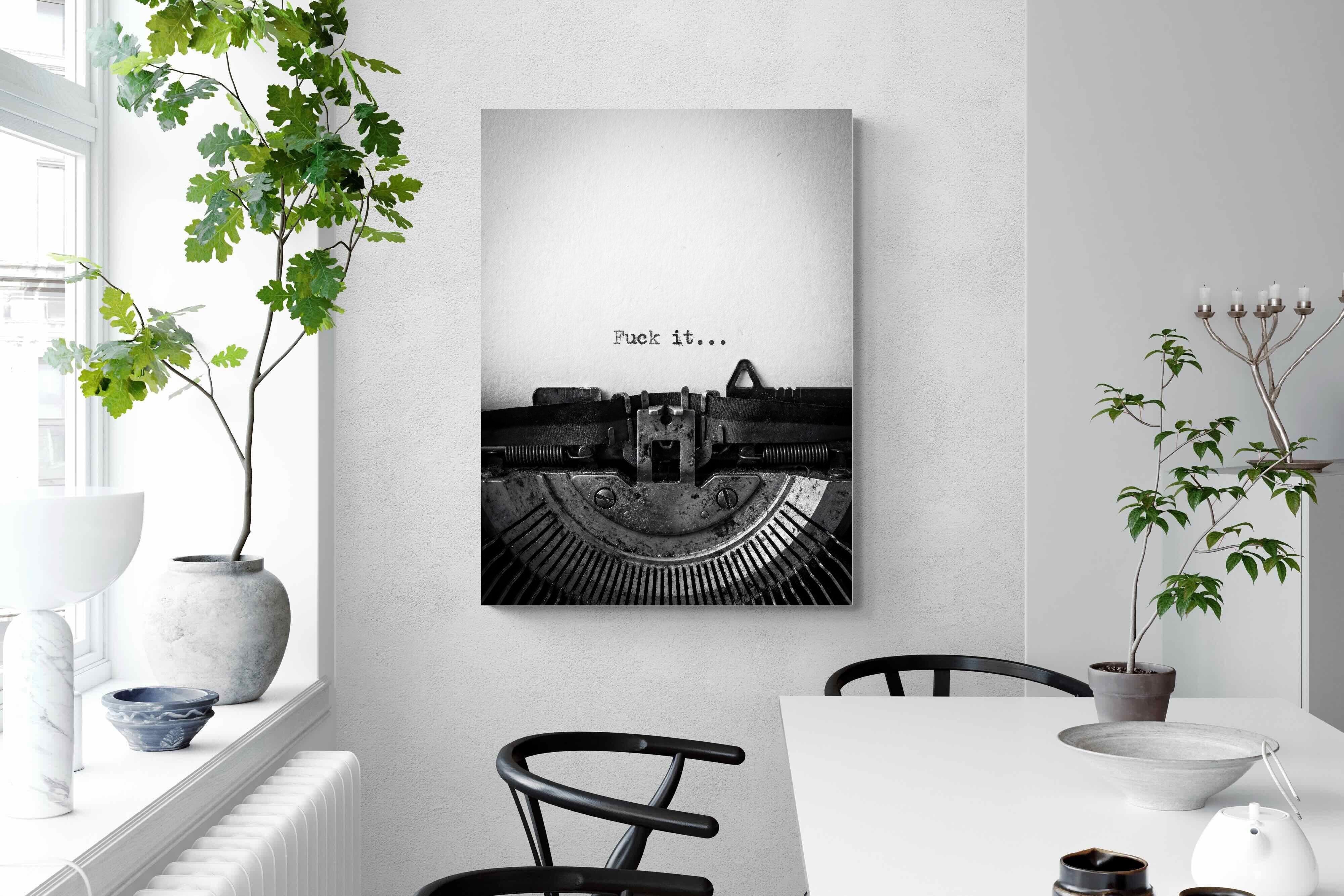 A striking monochrome photograph of a vintage typewriter capturing the blunt phrase “Fuck it…” typed onto the page. The mechanical textures, worn metal and stark typography create a raw, rebellious aesthetic that feels both nostalgic and unapologetically modern. This piece works particularly well in creative studios, home offices, bachelor pads or edgy contemporary interiors where humour and attitude are part of the décor. Printed large, the minimal composition delivers maximum impact.