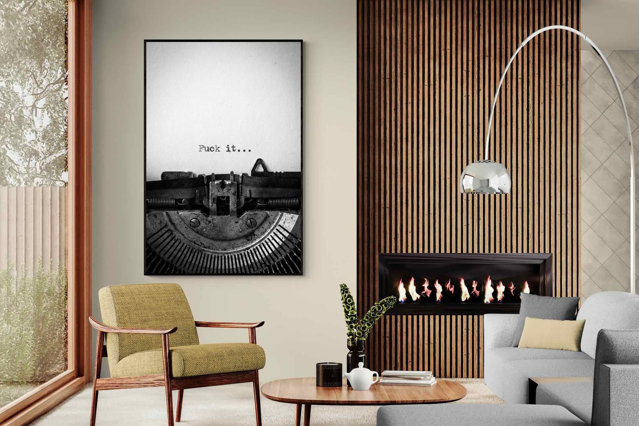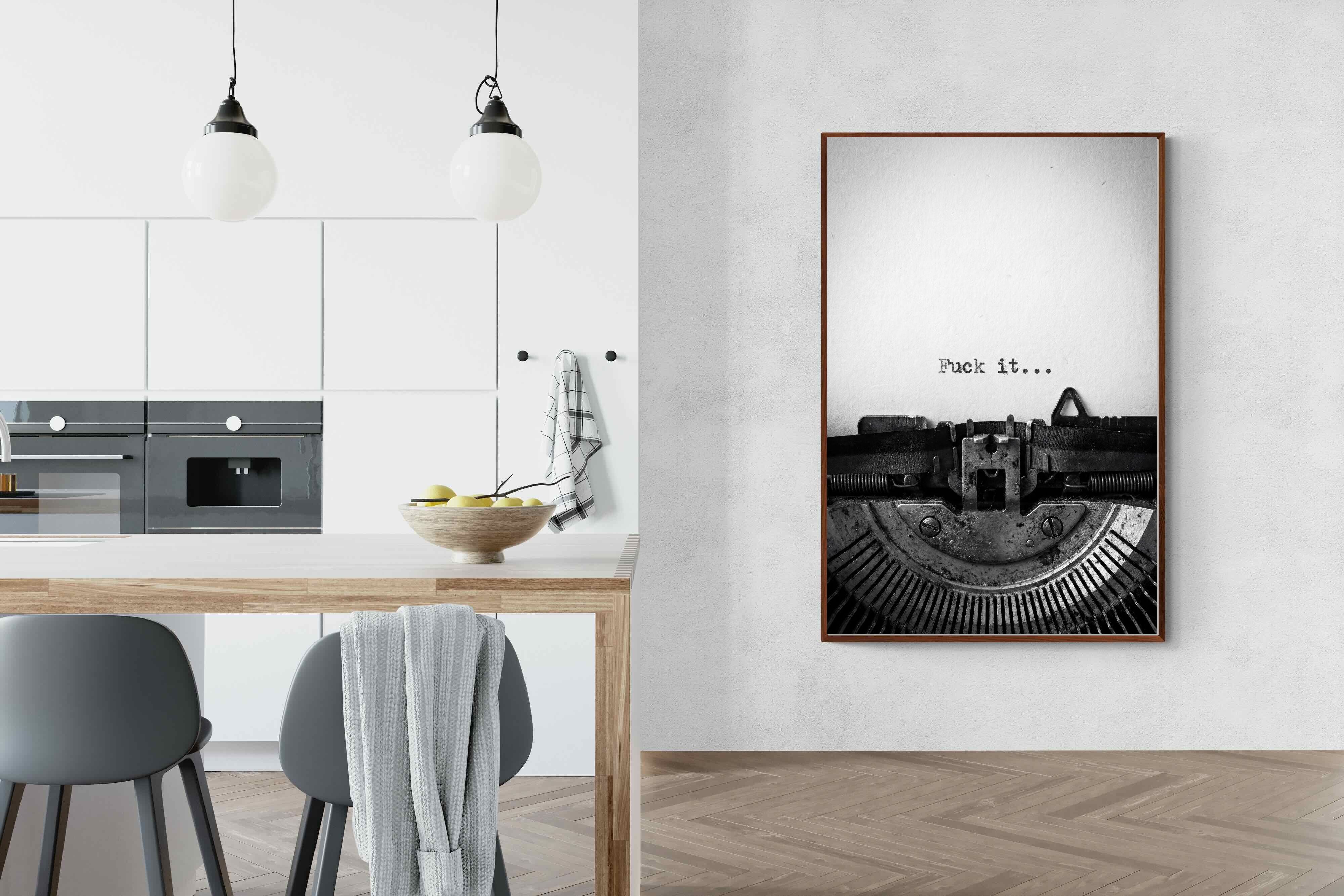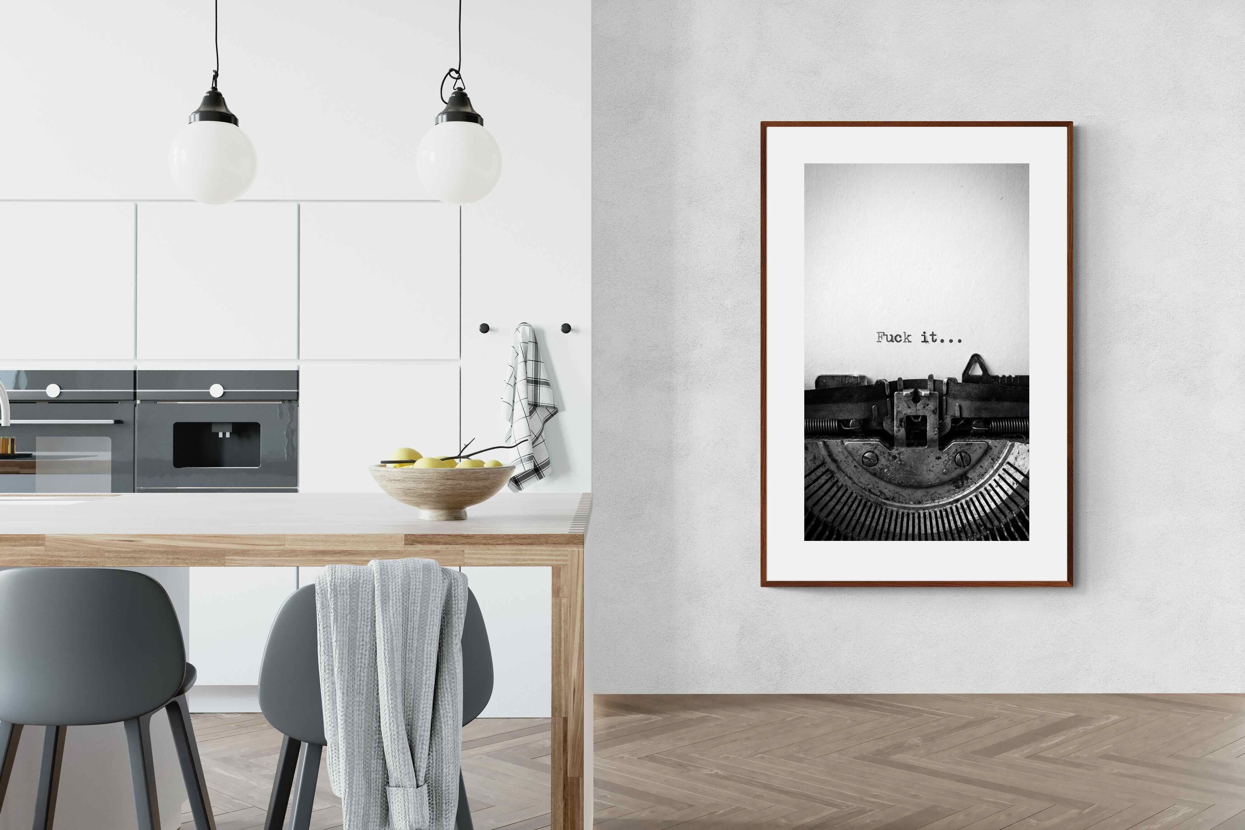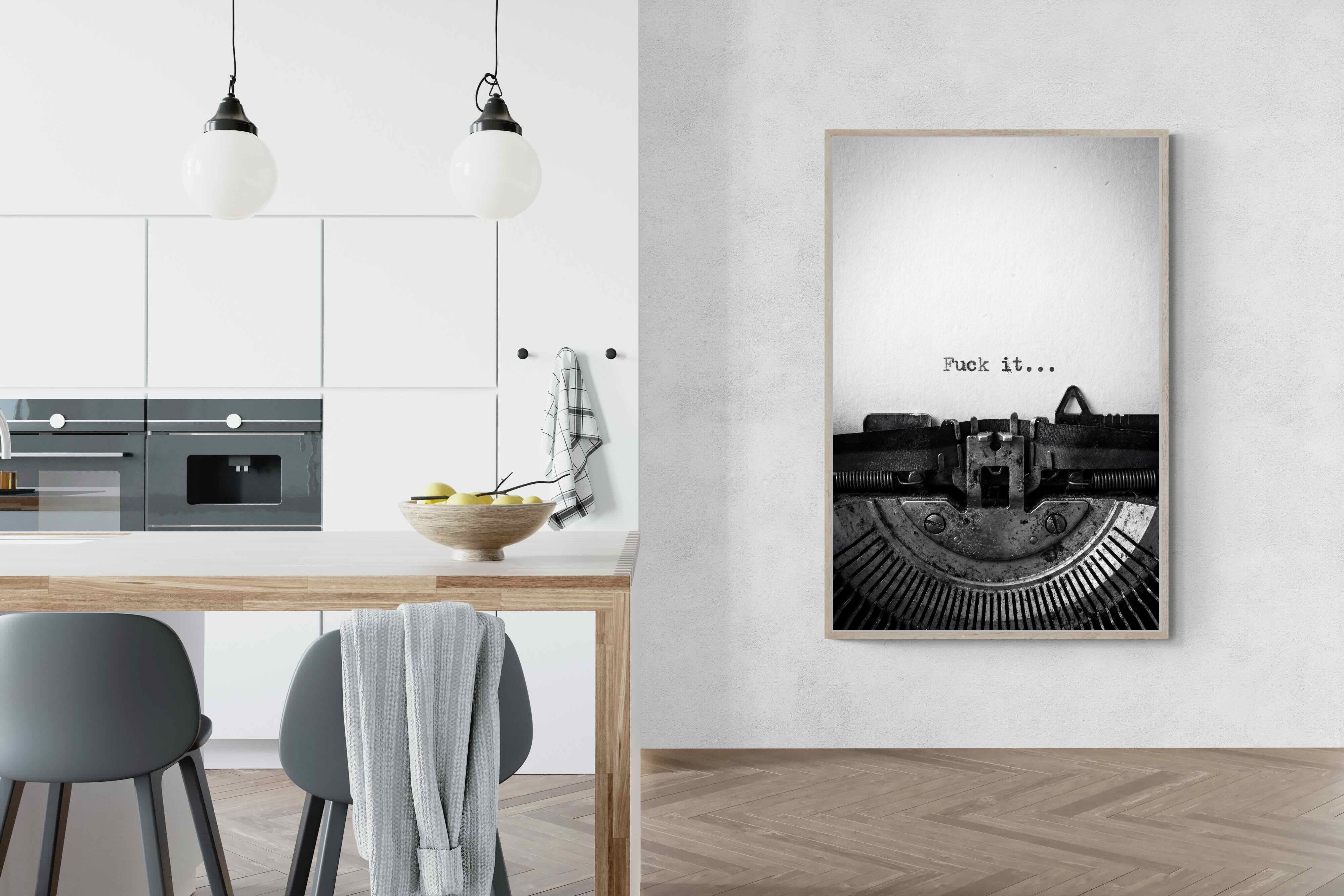 A striking monochrome photograph of a vintage typewriter capturing the blunt phrase “Fuck it…” typed onto the page. The mechanical textures, worn metal and stark typography create a raw, rebellious aesthetic that feels both nostalgic and unapologetically modern. This piece works particularly well in creative studios, home offices, bachelor pads or edgy contemporary interiors where humour and attitude are part of the décor. Printed large, the minimal composition delivers maximum impact.