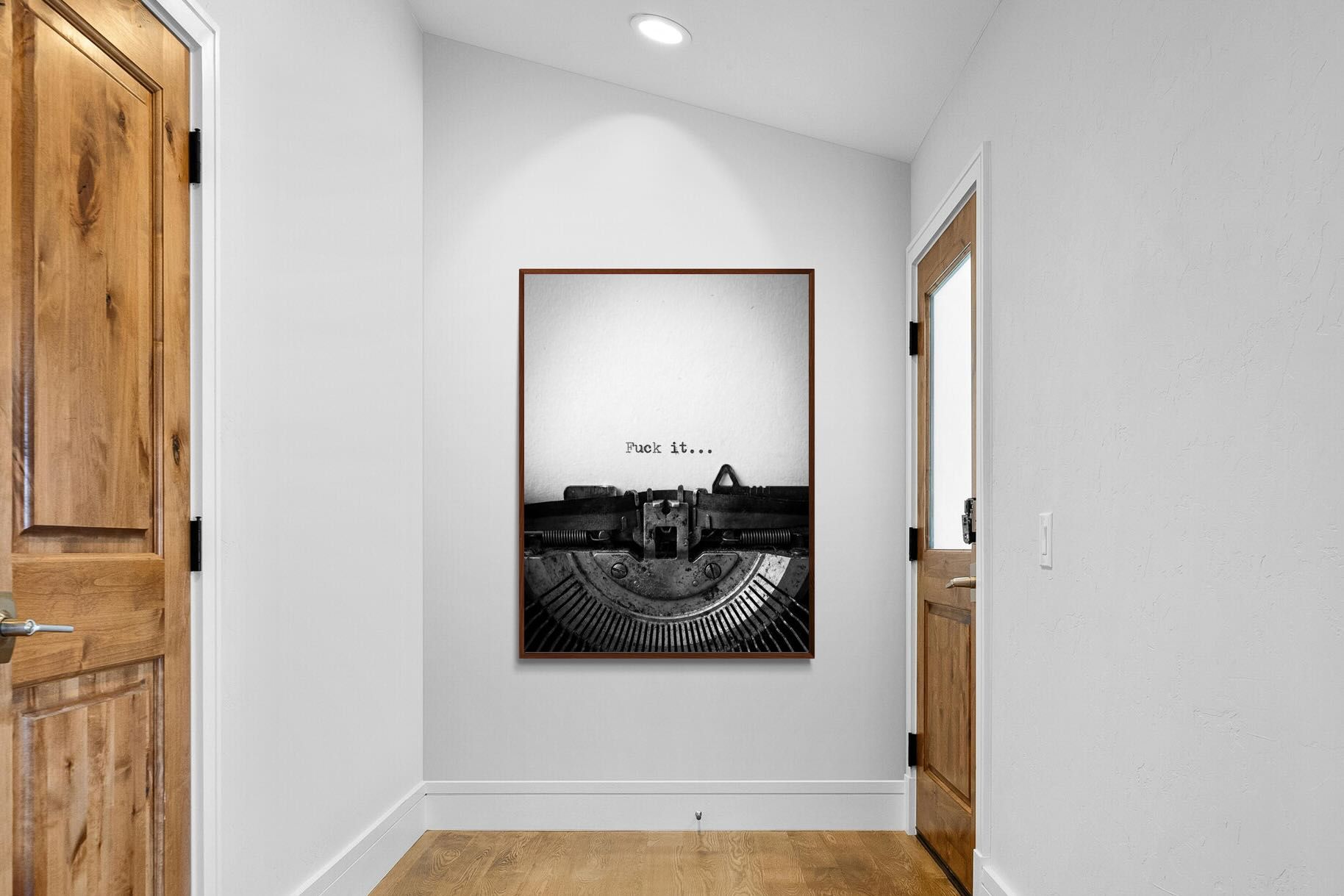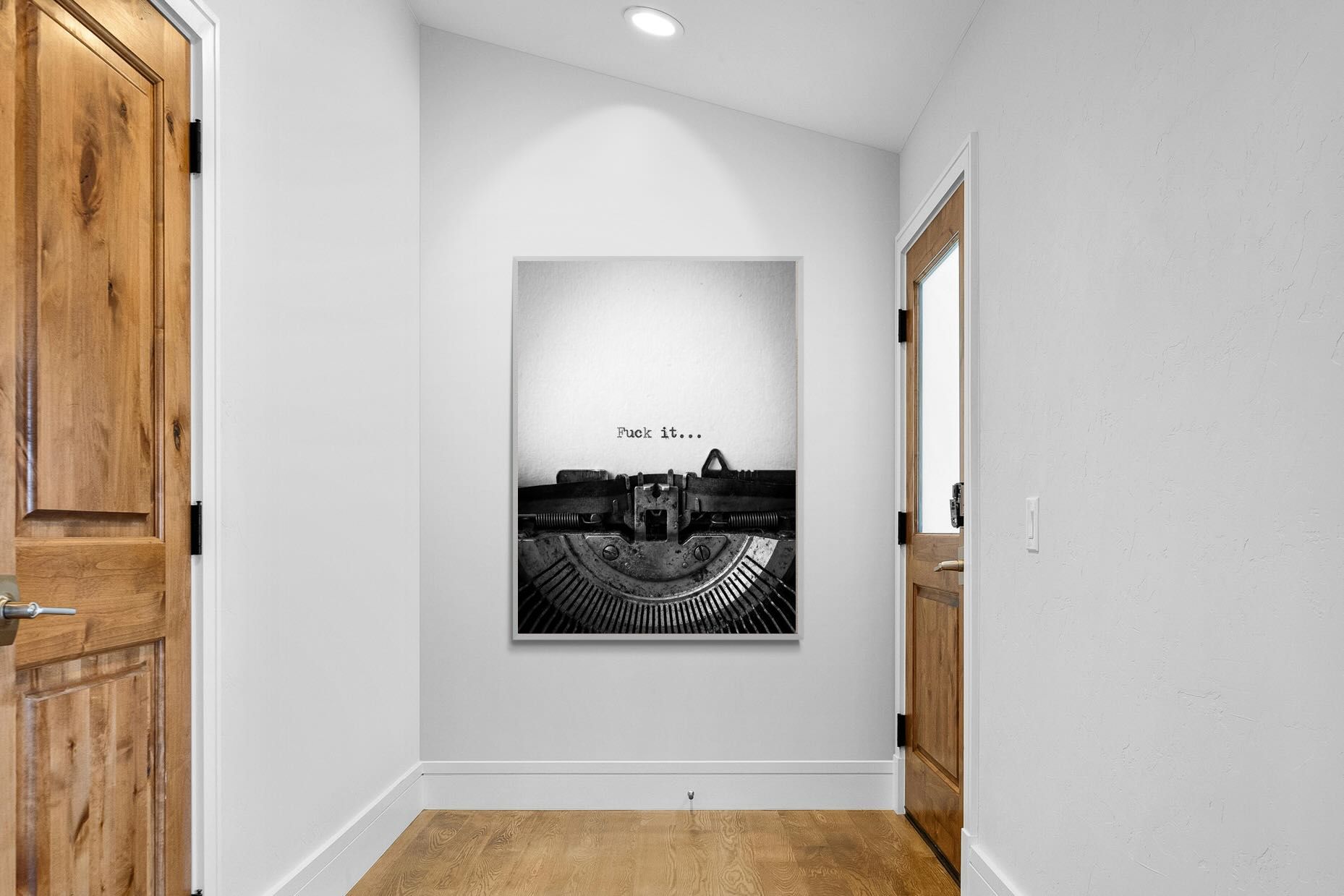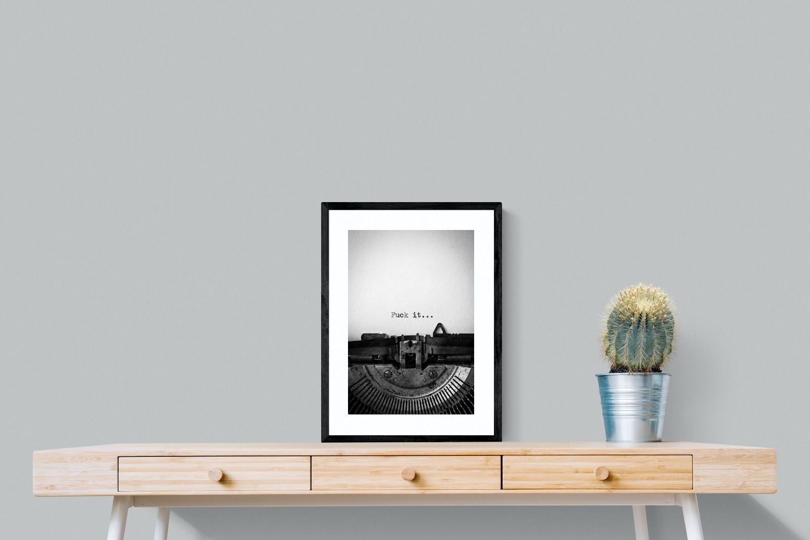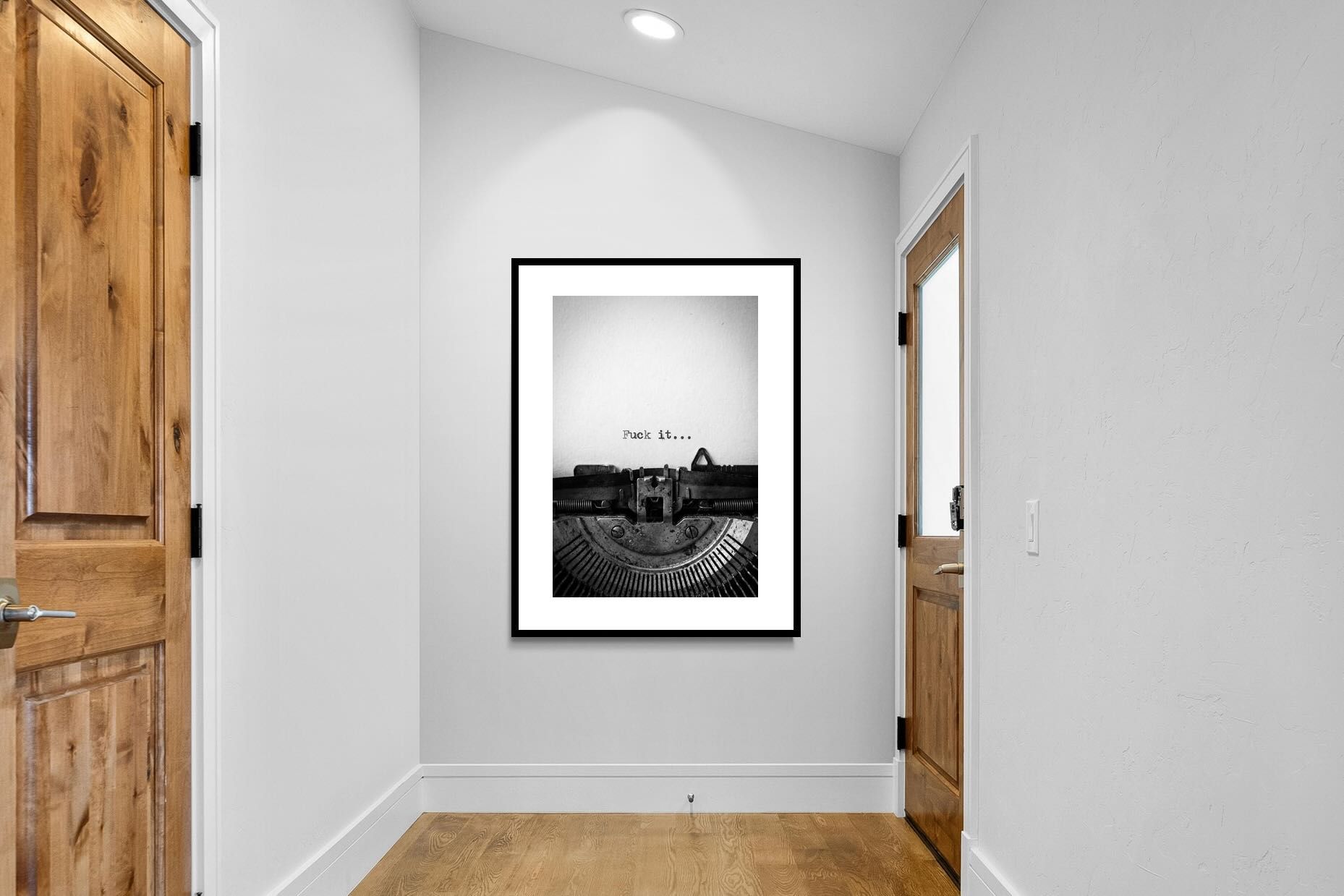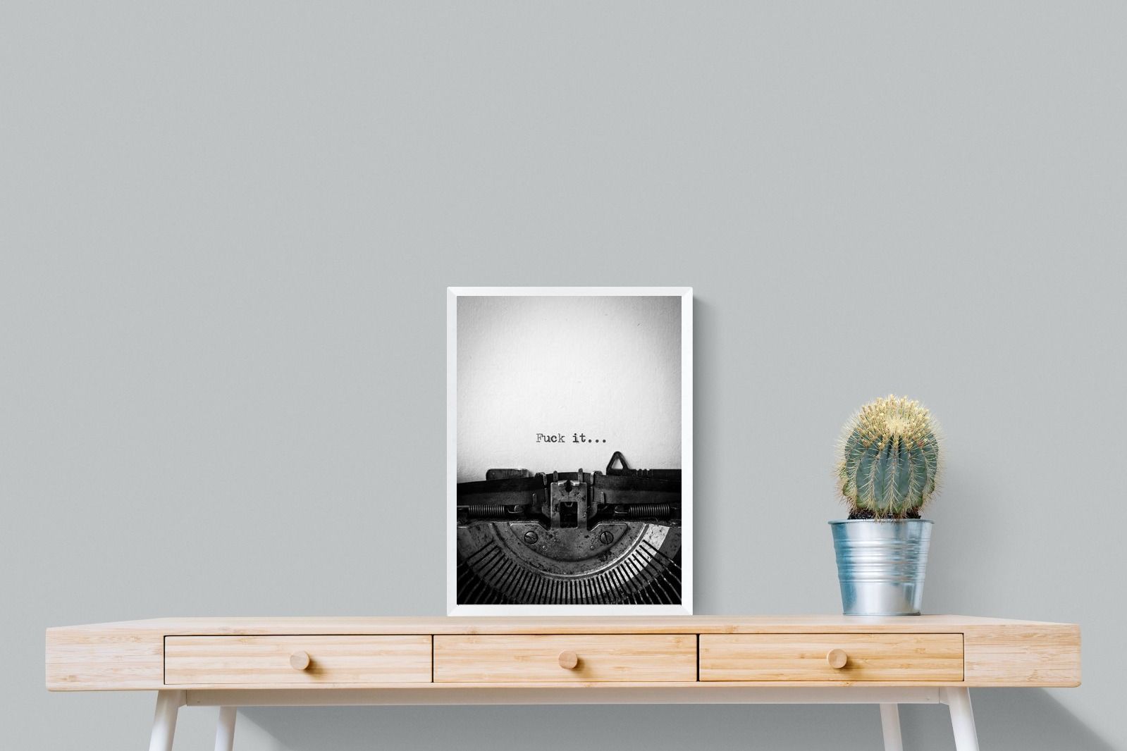 A striking monochrome photograph of a vintage typewriter capturing the blunt phrase “Fuck it…” typed onto the page. The mechanical textures, worn metal and stark typography create a raw, rebellious aesthetic that feels both nostalgic and unapologetically modern. This piece works particularly well in creative studios, home offices, bachelor pads or edgy contemporary interiors where humour and attitude are part of the décor. Printed large, the minimal composition delivers maximum impact.