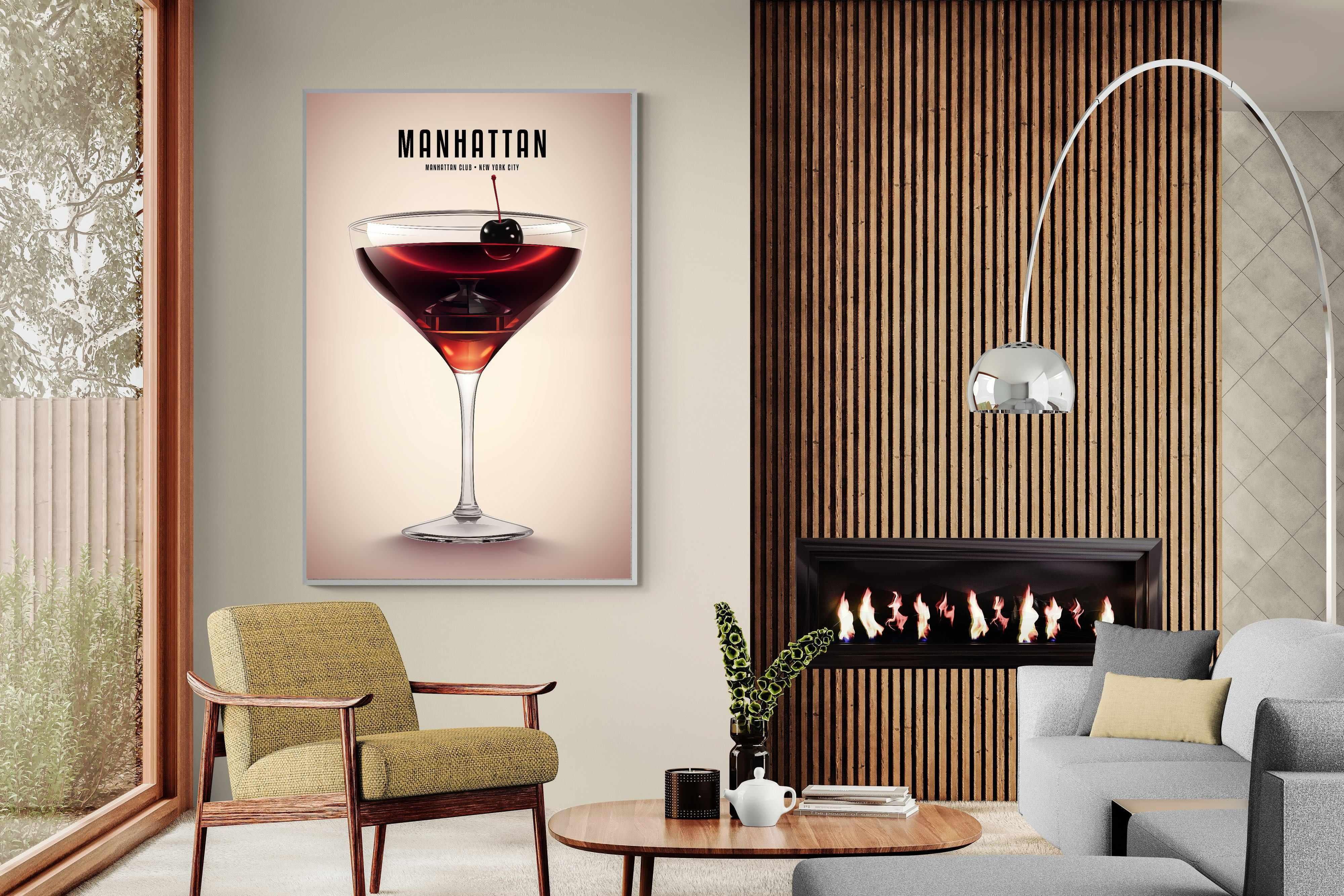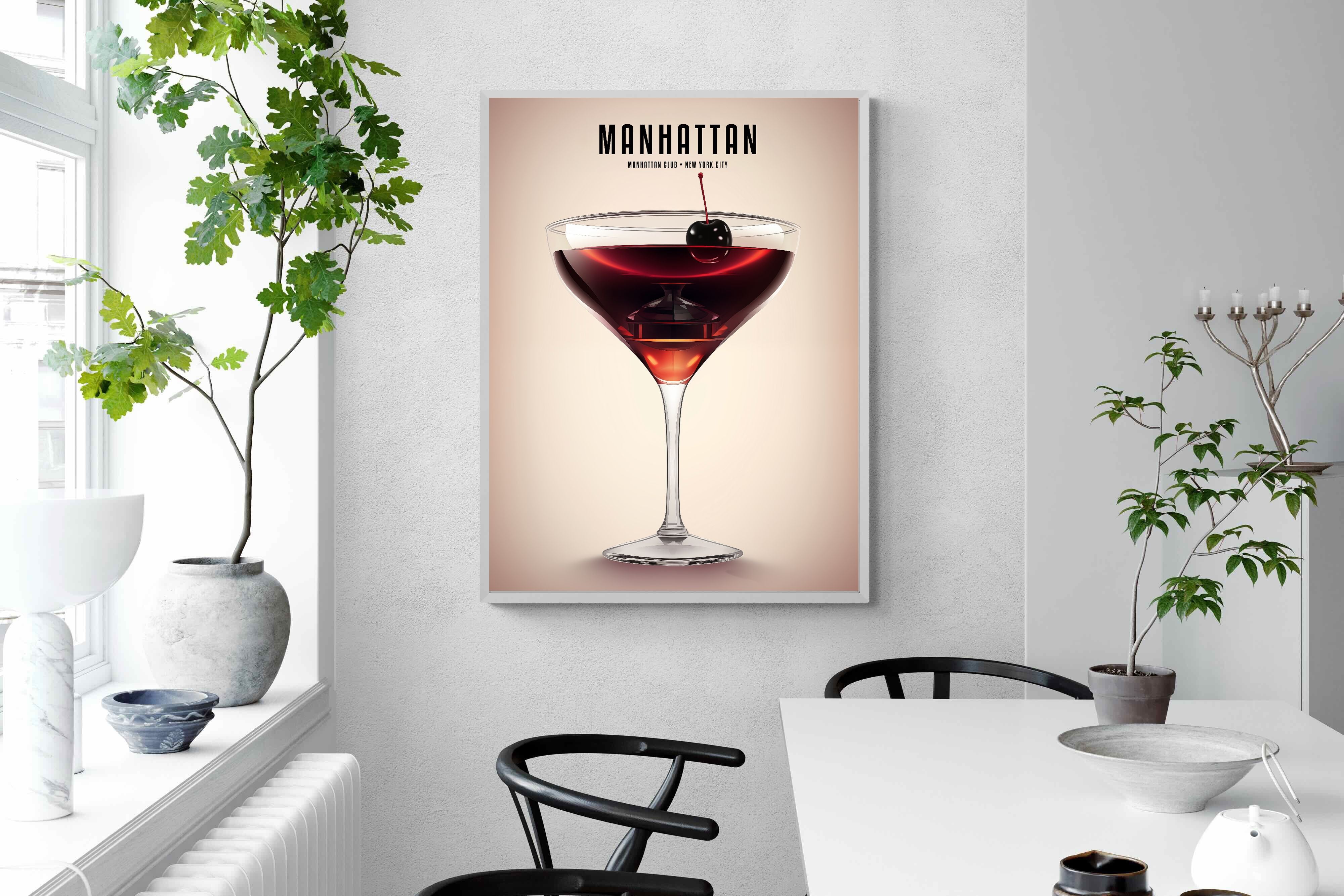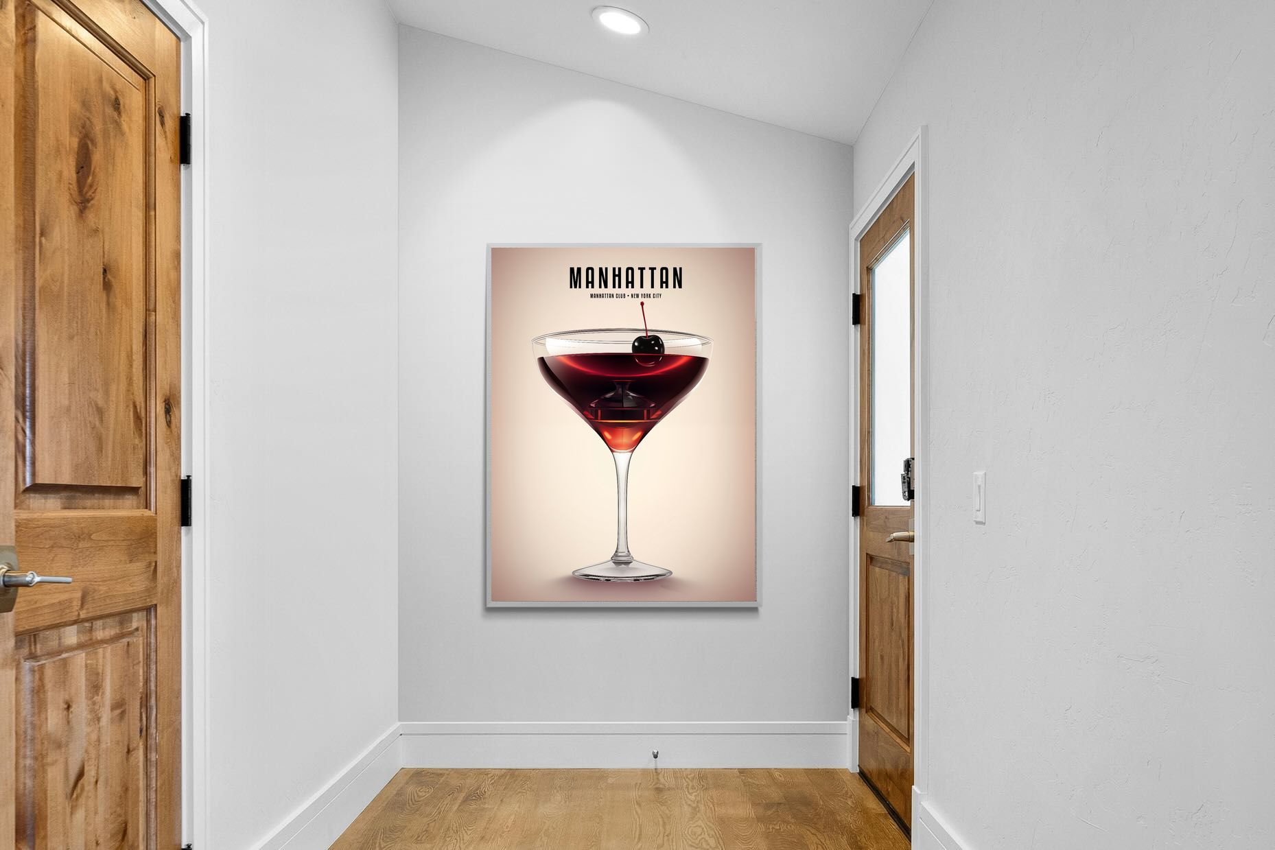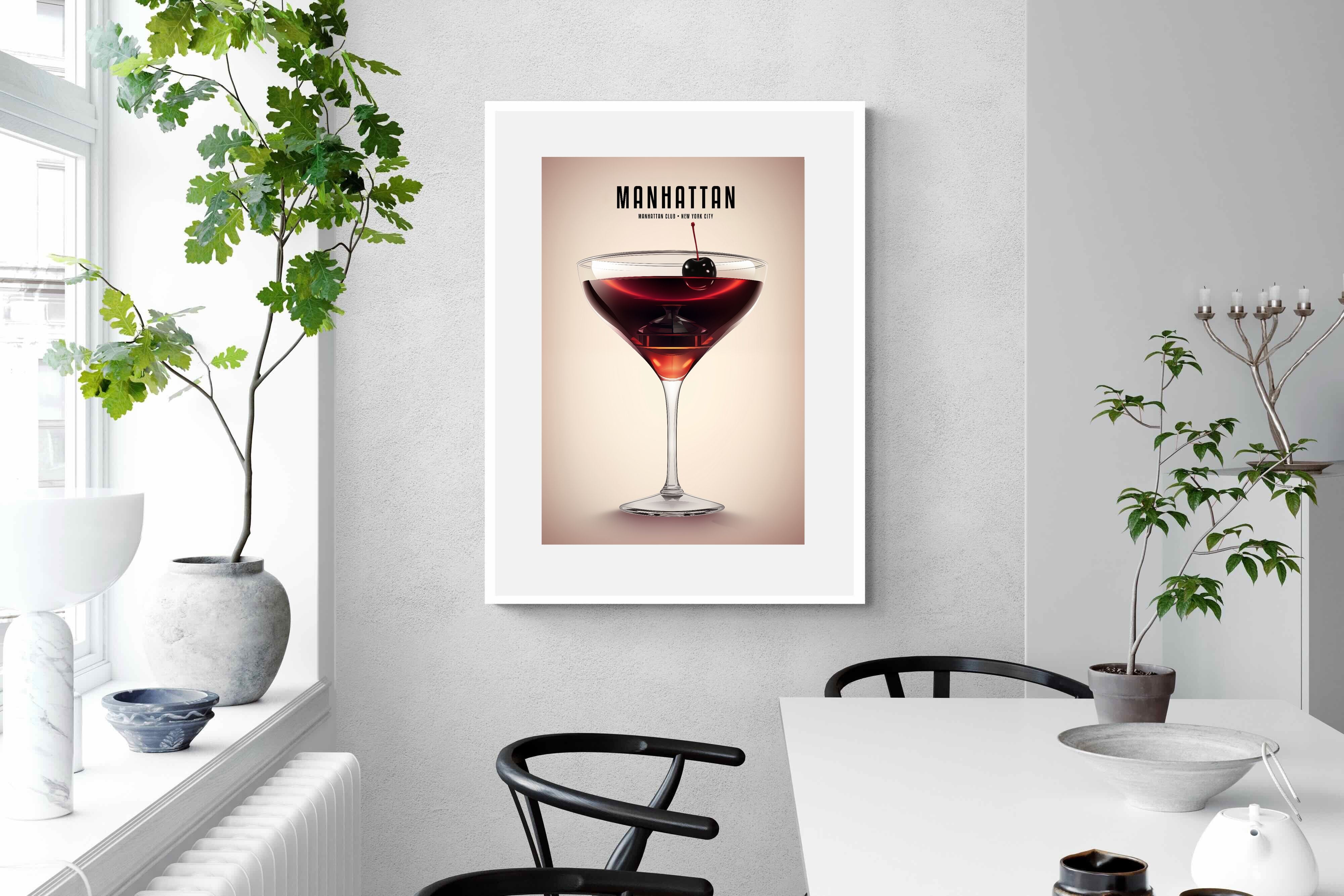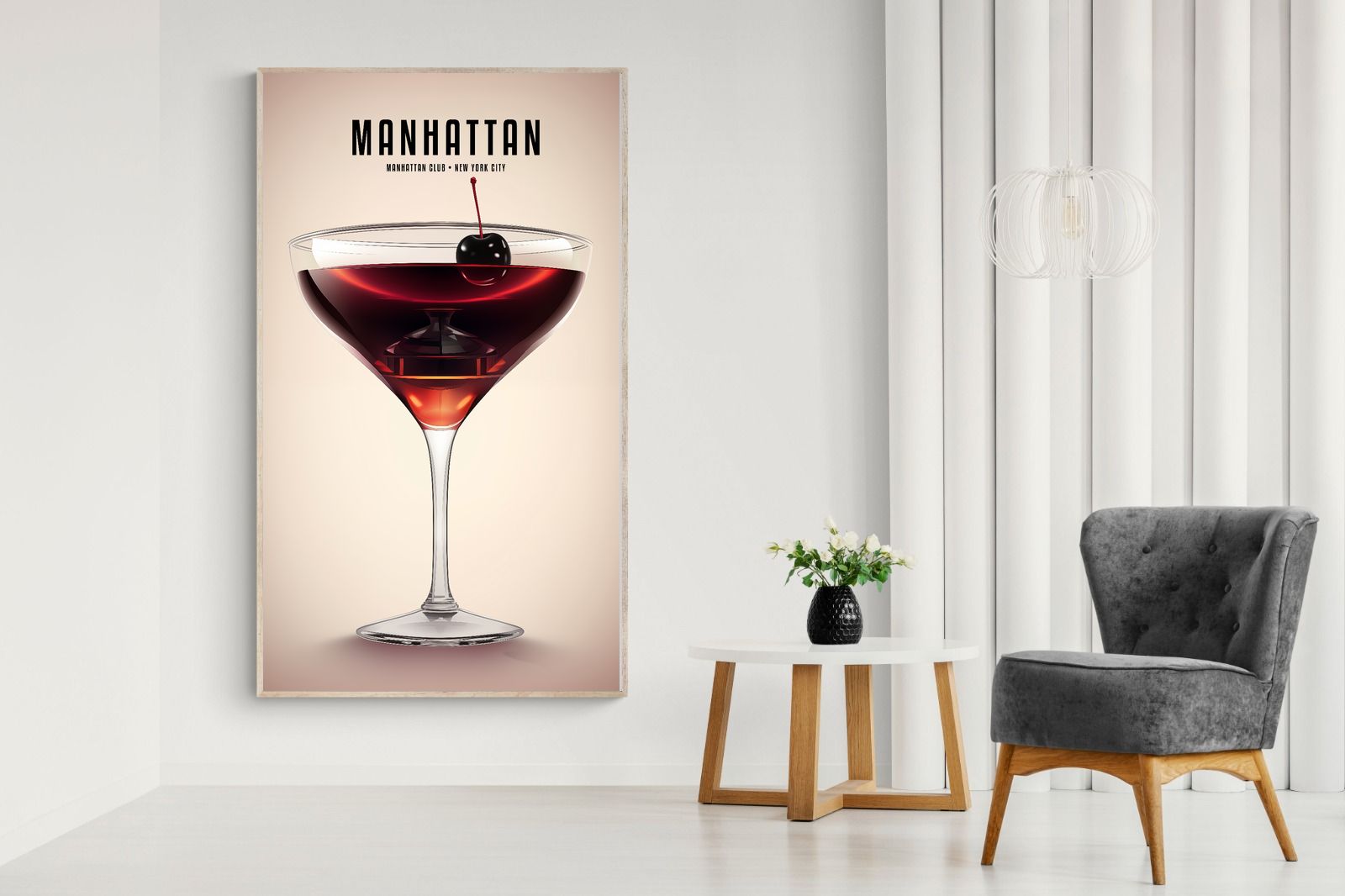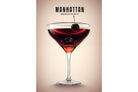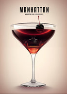 Exuding elegance, this artwork of a Manhattan cocktail combines sleek design with luxurious tones. The rich reds of the drink contrast beautifully with the cherry garnish and minimalist typography. Its clean, polished composition makes it an excellent addition to home bars, kitchens, or living spaces. This piece celebrates the timeless glamour of the Manhattan, making it a stylish focal point for those who appreciate classic cocktails and contemporary art.