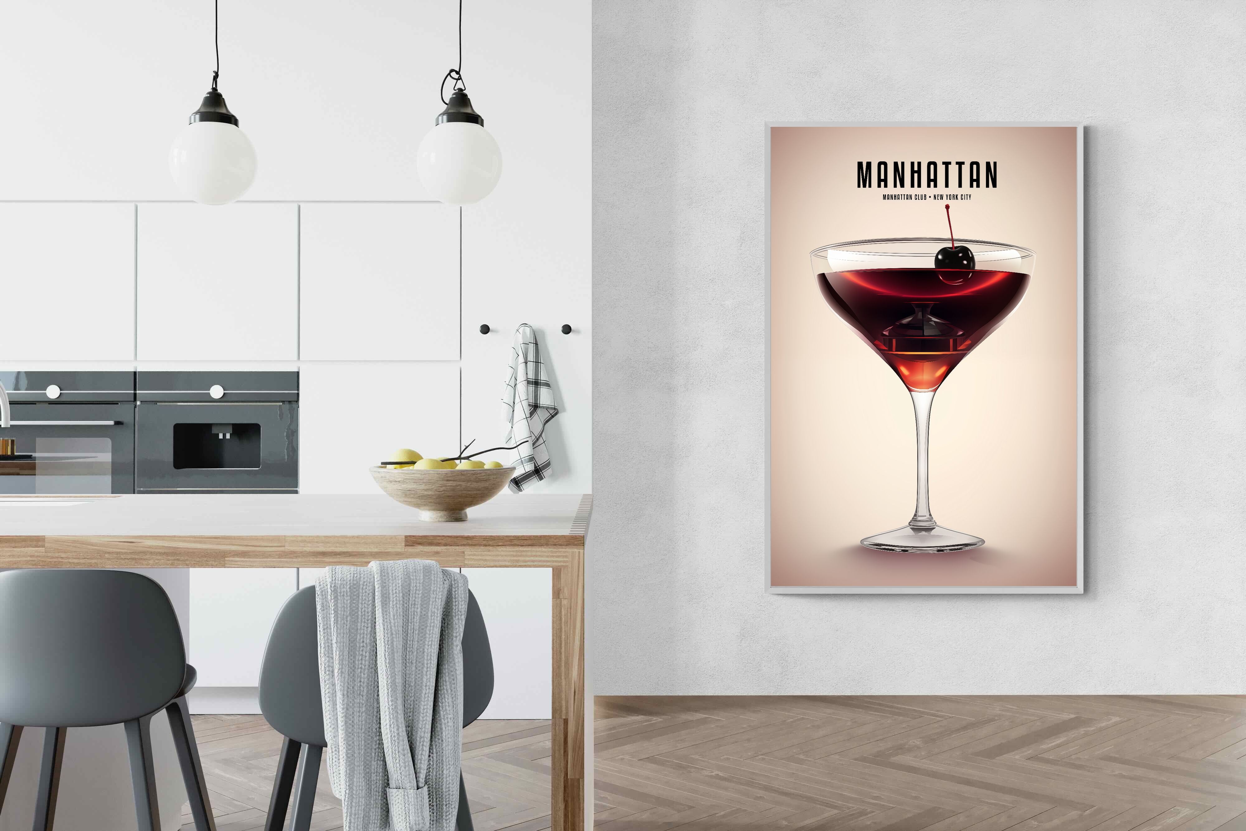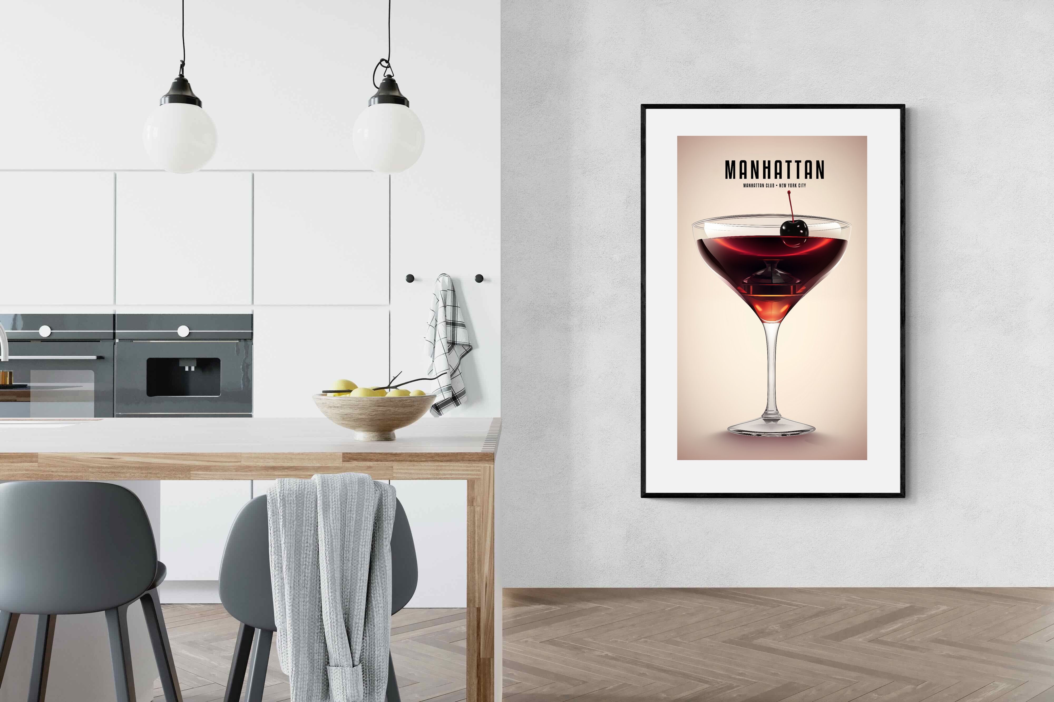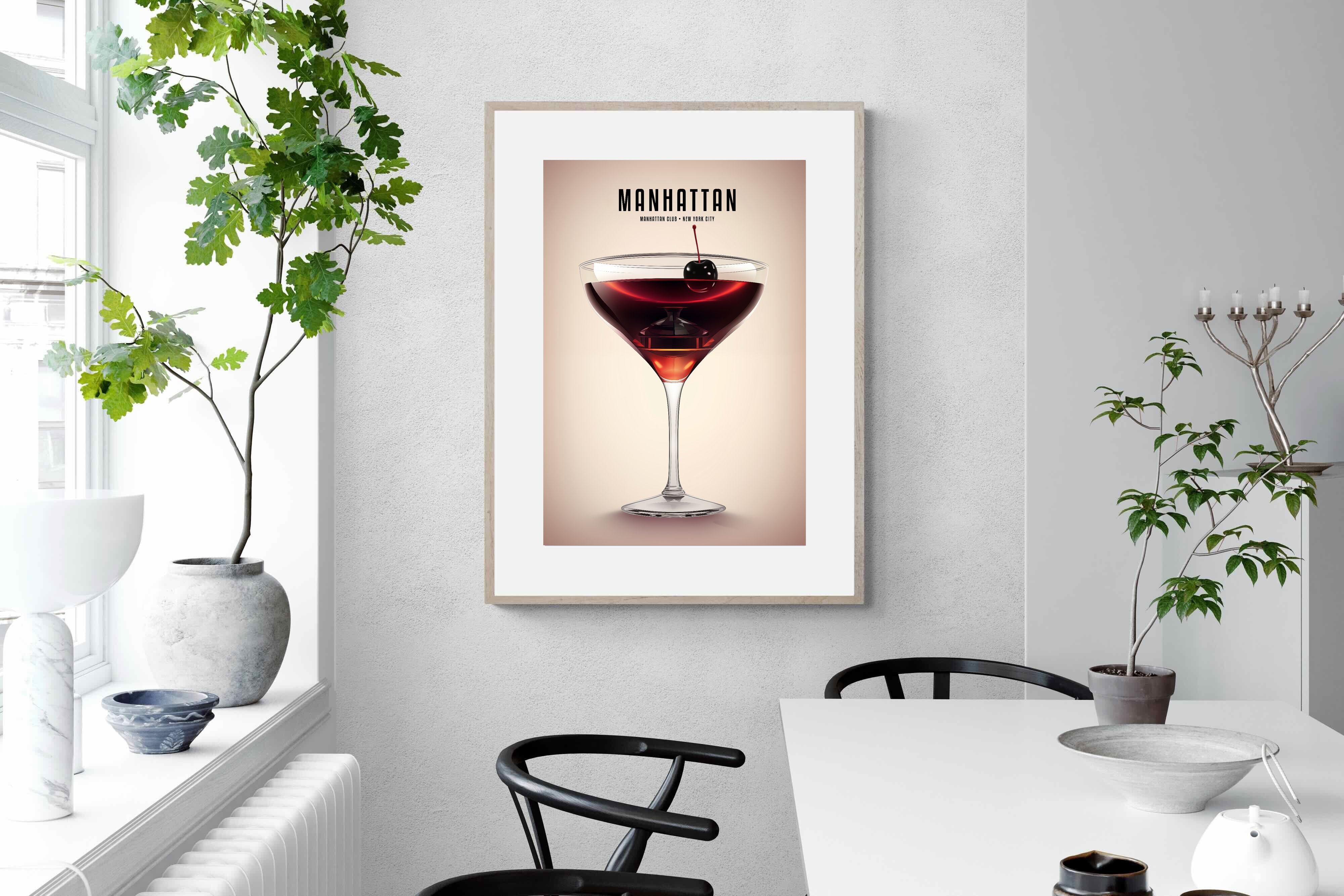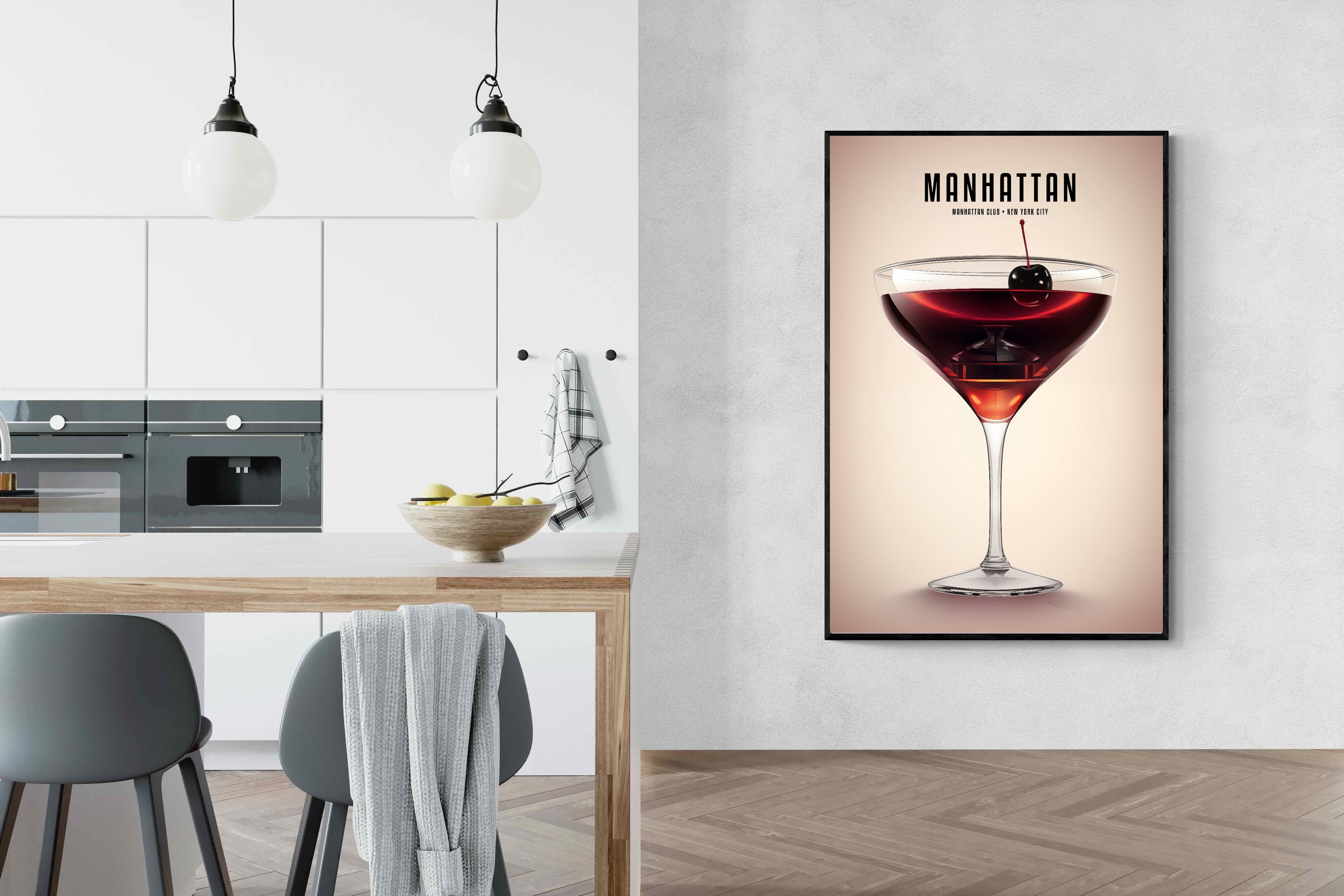 Exuding elegance, this artwork of a Manhattan cocktail combines sleek design with luxurious tones. The rich reds of the drink contrast beautifully with the cherry garnish and minimalist typography. Its clean, polished composition makes it an excellent addition to home bars, kitchens, or living spaces. This piece celebrates the timeless glamour of the Manhattan, making it a stylish focal point for those who appreciate classic cocktails and contemporary art.