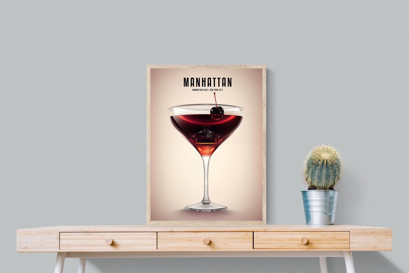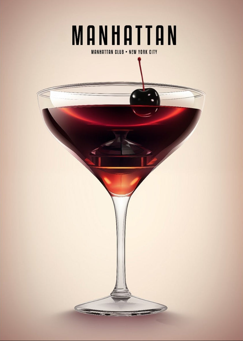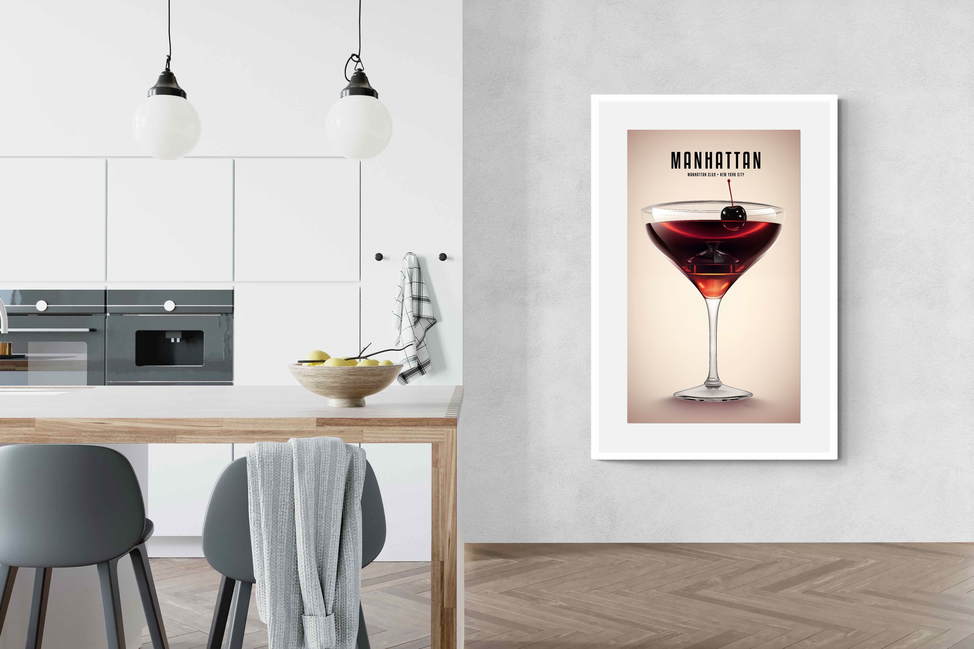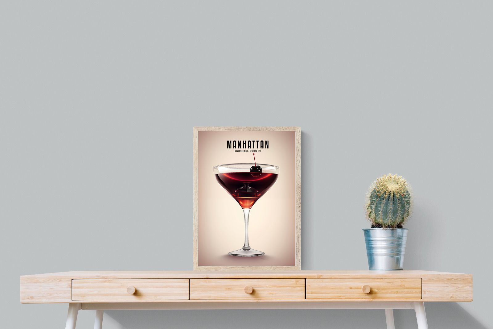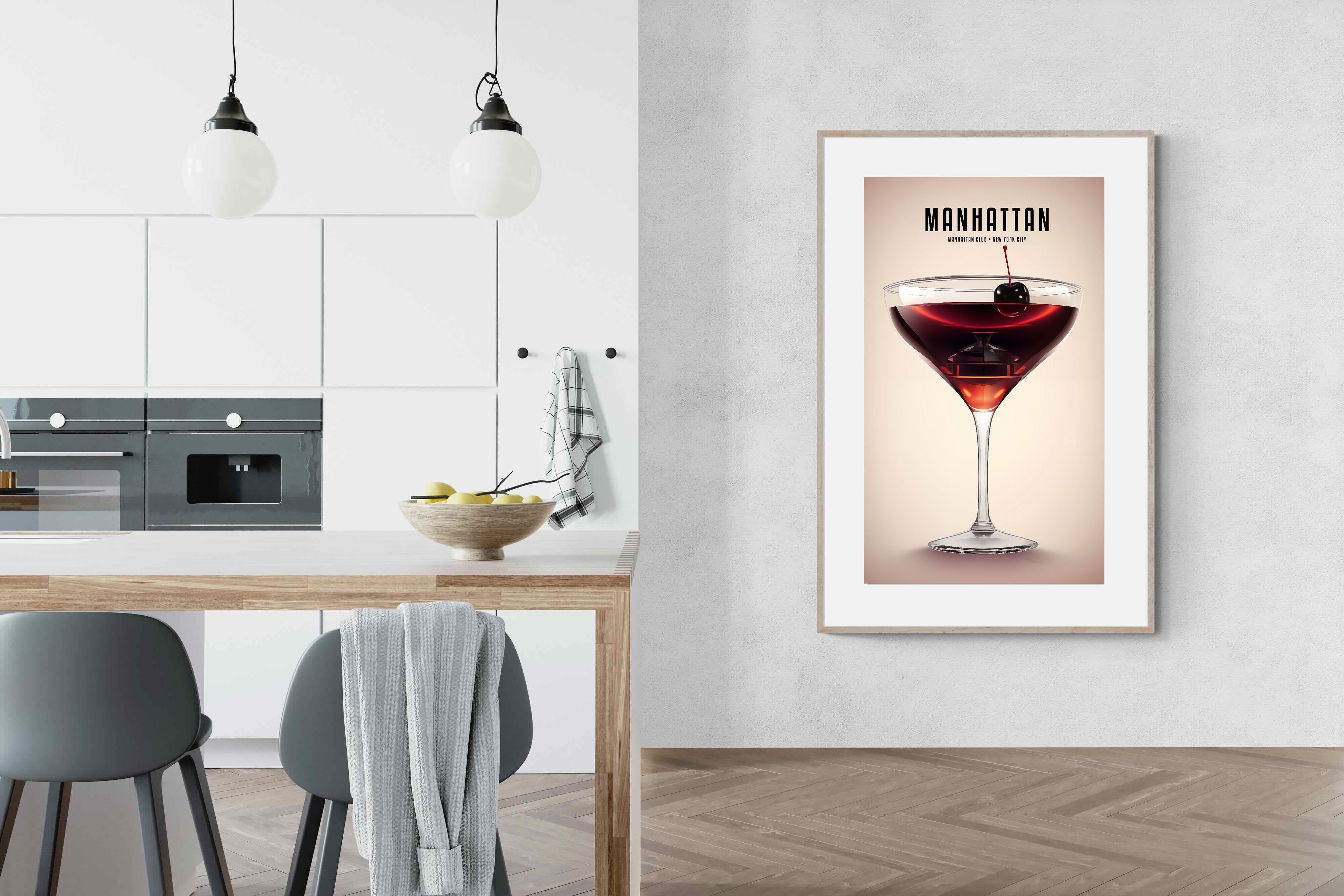 Exuding elegance, this artwork of a Manhattan cocktail combines sleek design with luxurious tones. The rich reds of the drink contrast beautifully with the cherry garnish and minimalist typography. Its clean, polished composition makes it an excellent addition to home bars, kitchens, or living spaces. This piece celebrates the timeless glamour of the Manhattan, making it a stylish focal point for those who appreciate classic cocktails and contemporary art.