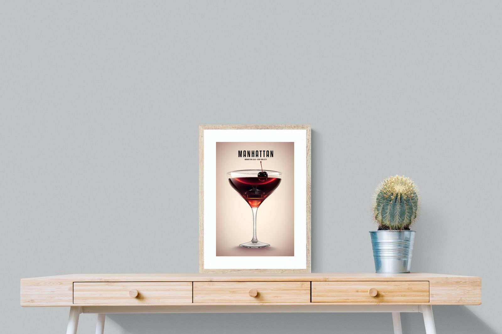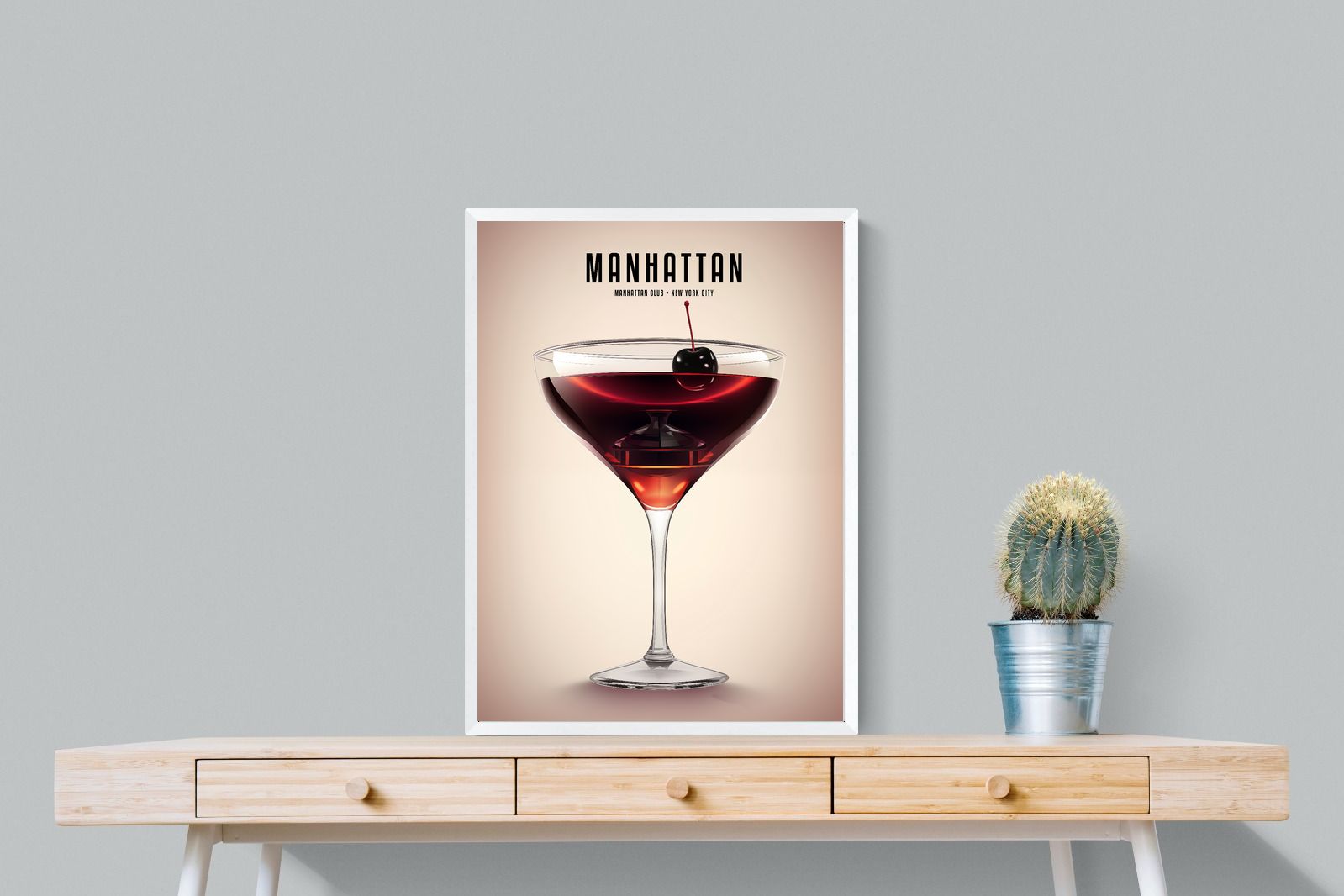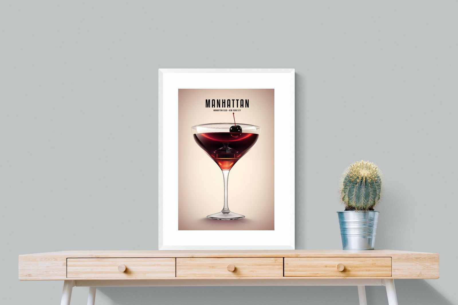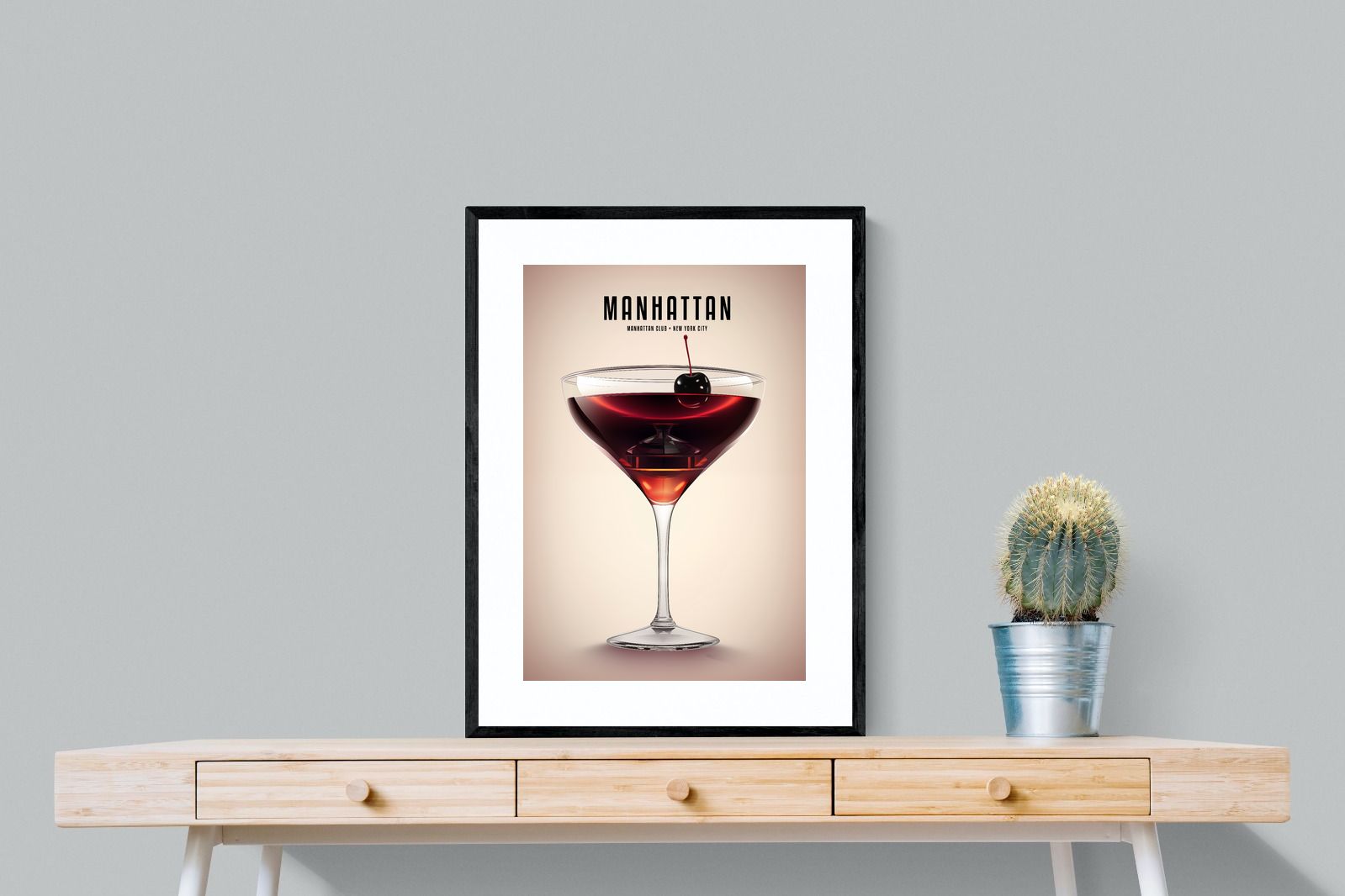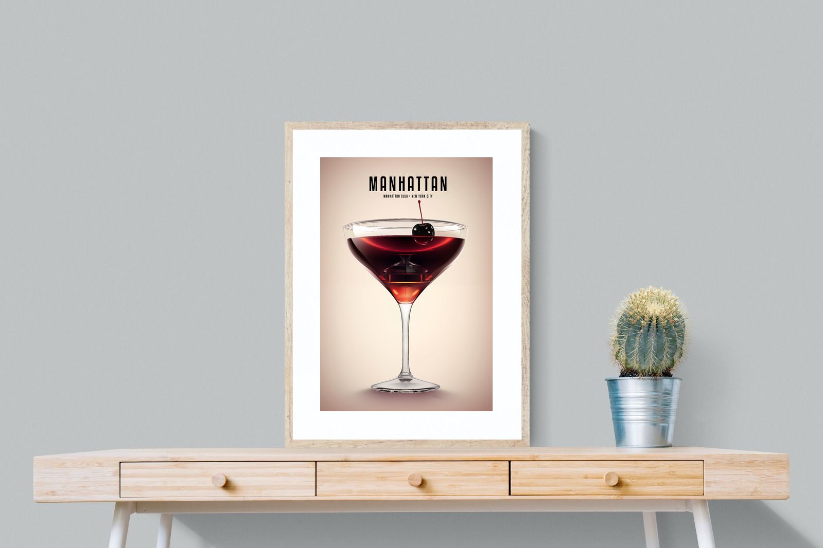 Exuding elegance, this artwork of a Manhattan cocktail combines sleek design with luxurious tones. The rich reds of the drink contrast beautifully with the cherry garnish and minimalist typography. Its clean, polished composition makes it an excellent addition to home bars, kitchens, or living spaces. This piece celebrates the timeless glamour of the Manhattan, making it a stylish focal point for those who appreciate classic cocktails and contemporary art.