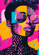 Vibrant pop art portrait using bold colors like pink, yellow, and blue. The image features a stylized figure with sunglasses, emphasizing modern fashion and abstract design. The artwork blends contemporary techniques with a retro pop art feel.