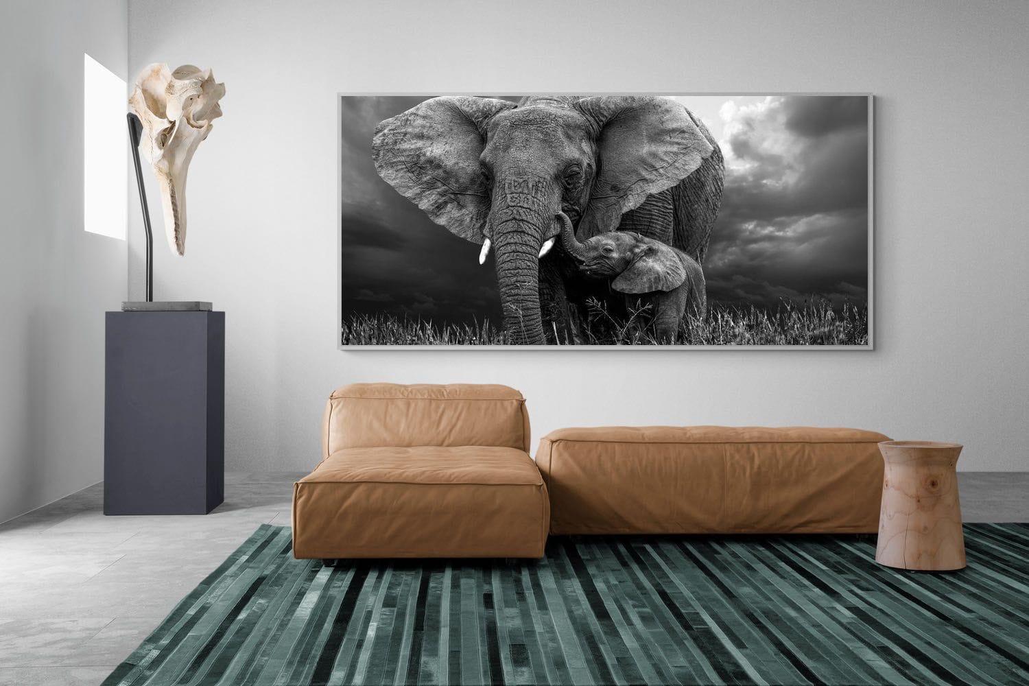 An elephant mother and her calf await the impending storm as the dark clouds approach over the plains of the Masai Mara.