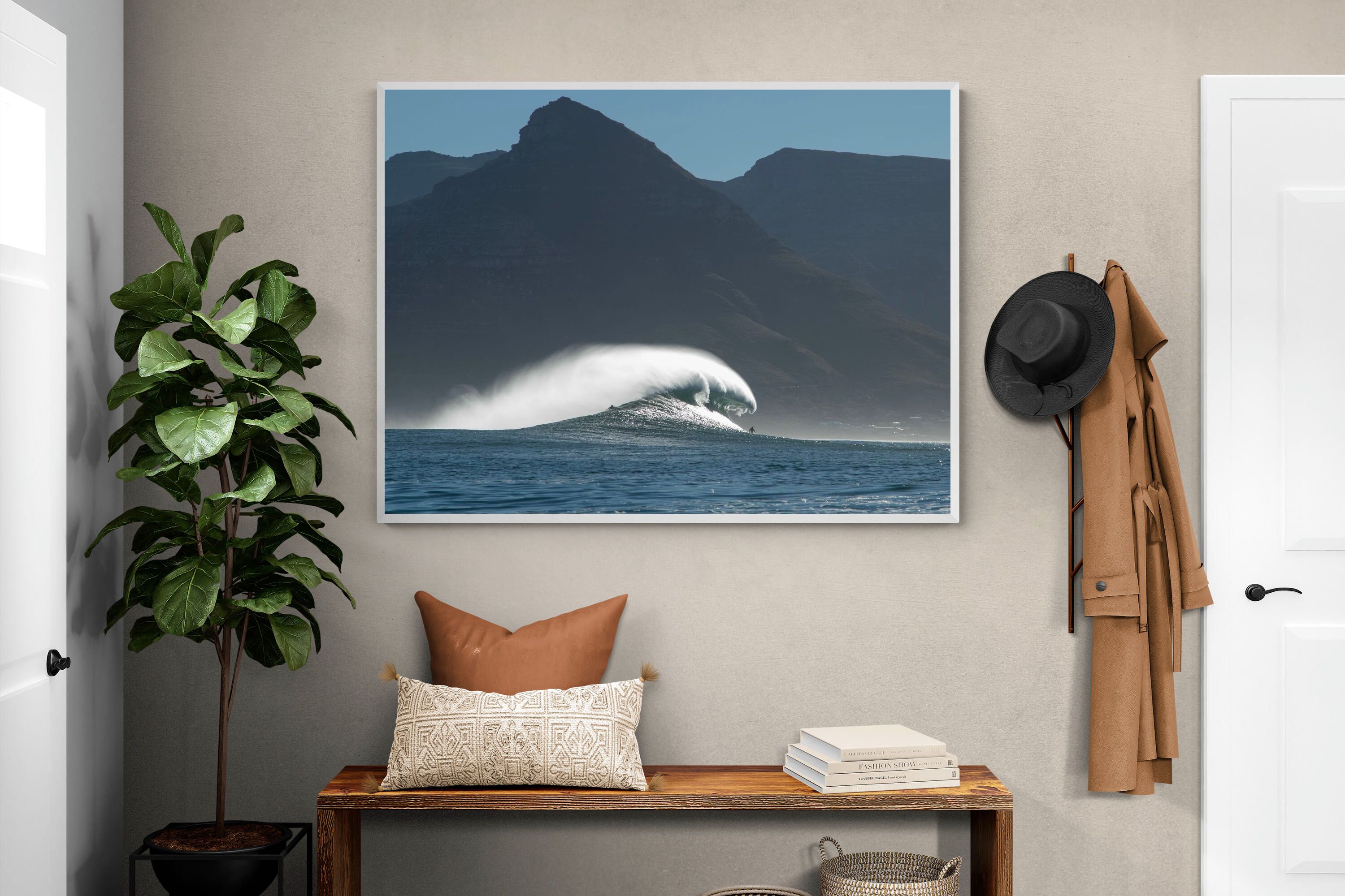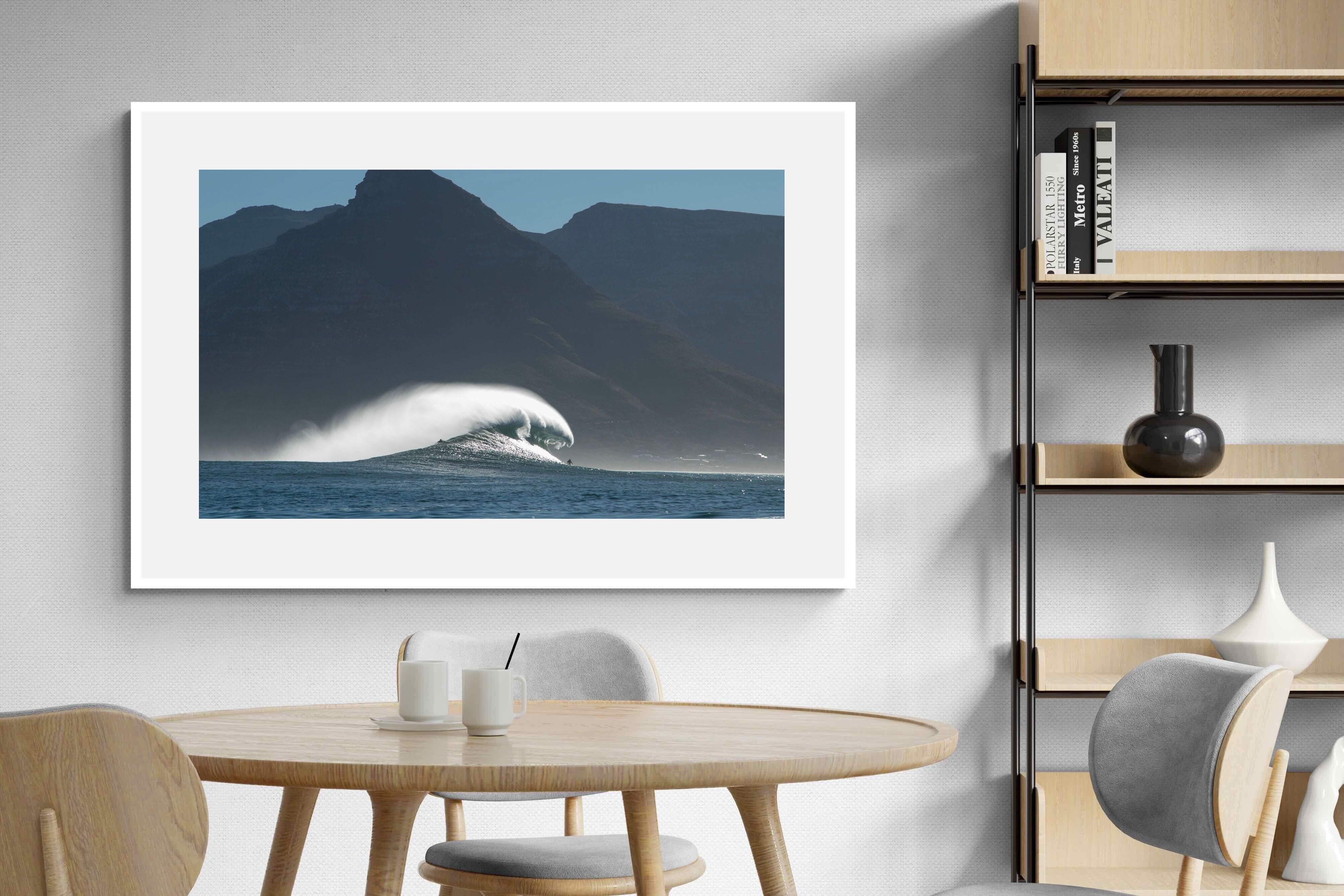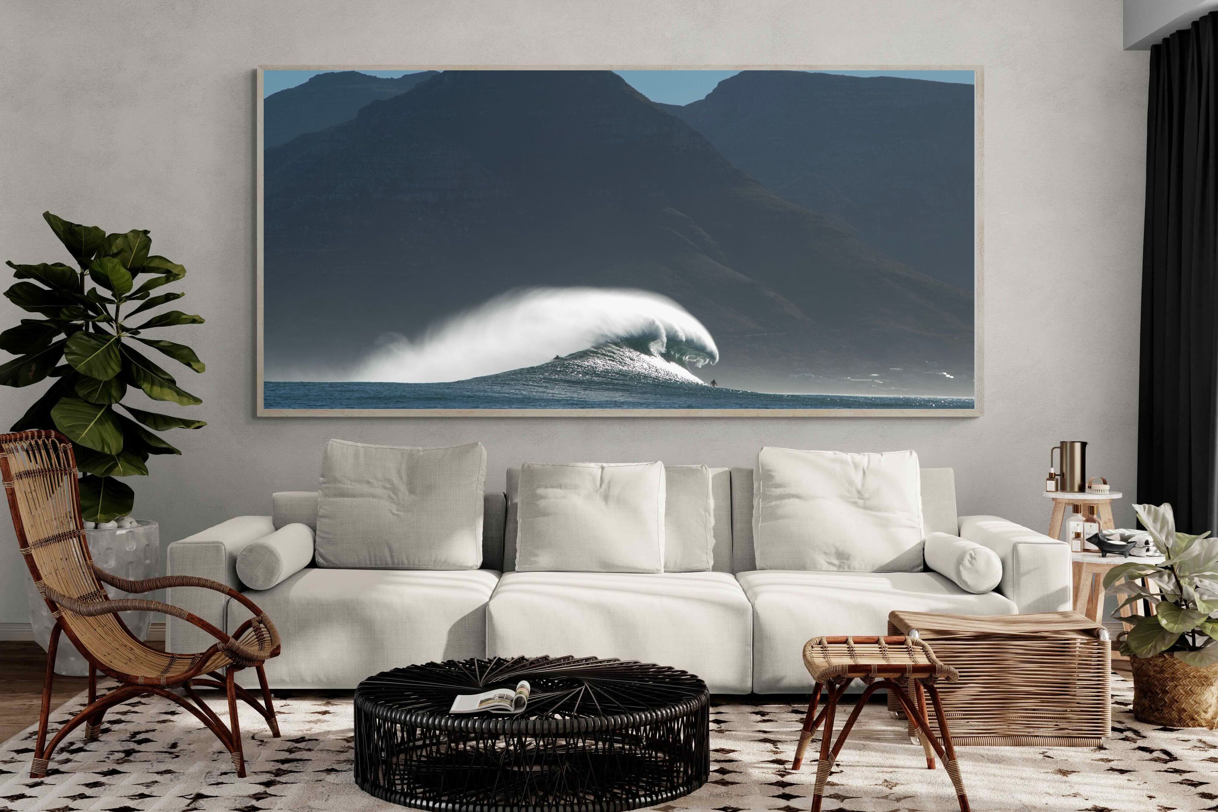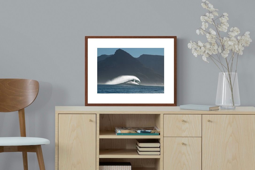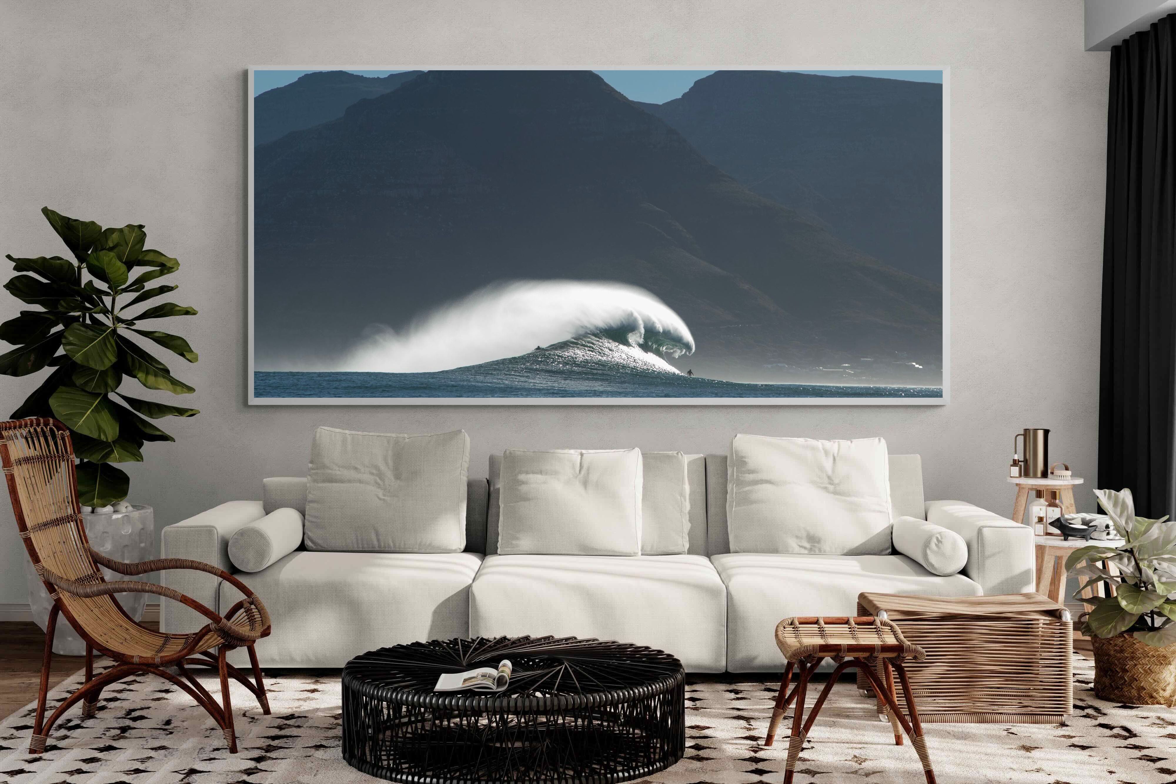 This photograph captures a powerful Atlantic swell detonating beneath the shadowed mountains of Cape Town. Shot along the city’s rugged coastline, the image balances raw ocean energy with the dramatic silhouette of the Cape Peninsula. Wind-blown spray arcs from the crest, creating movement and scale against the dark mountain backdrop. Ideal for contemporary interiors, coastal homes or statement living spaces seeking bold South African seascape photography with presence and depth.