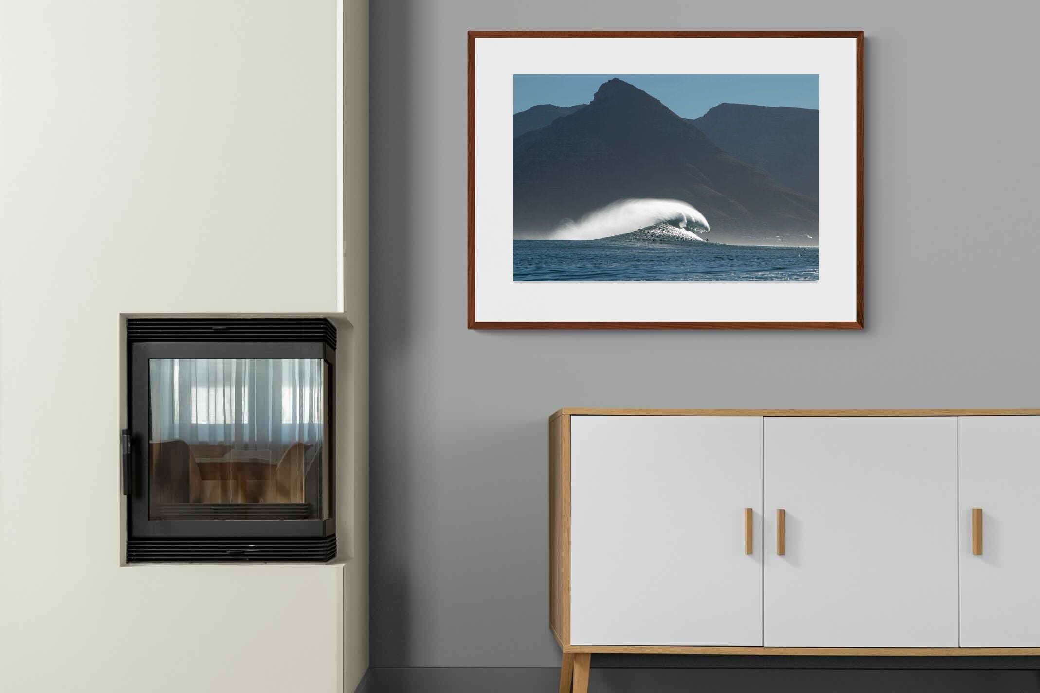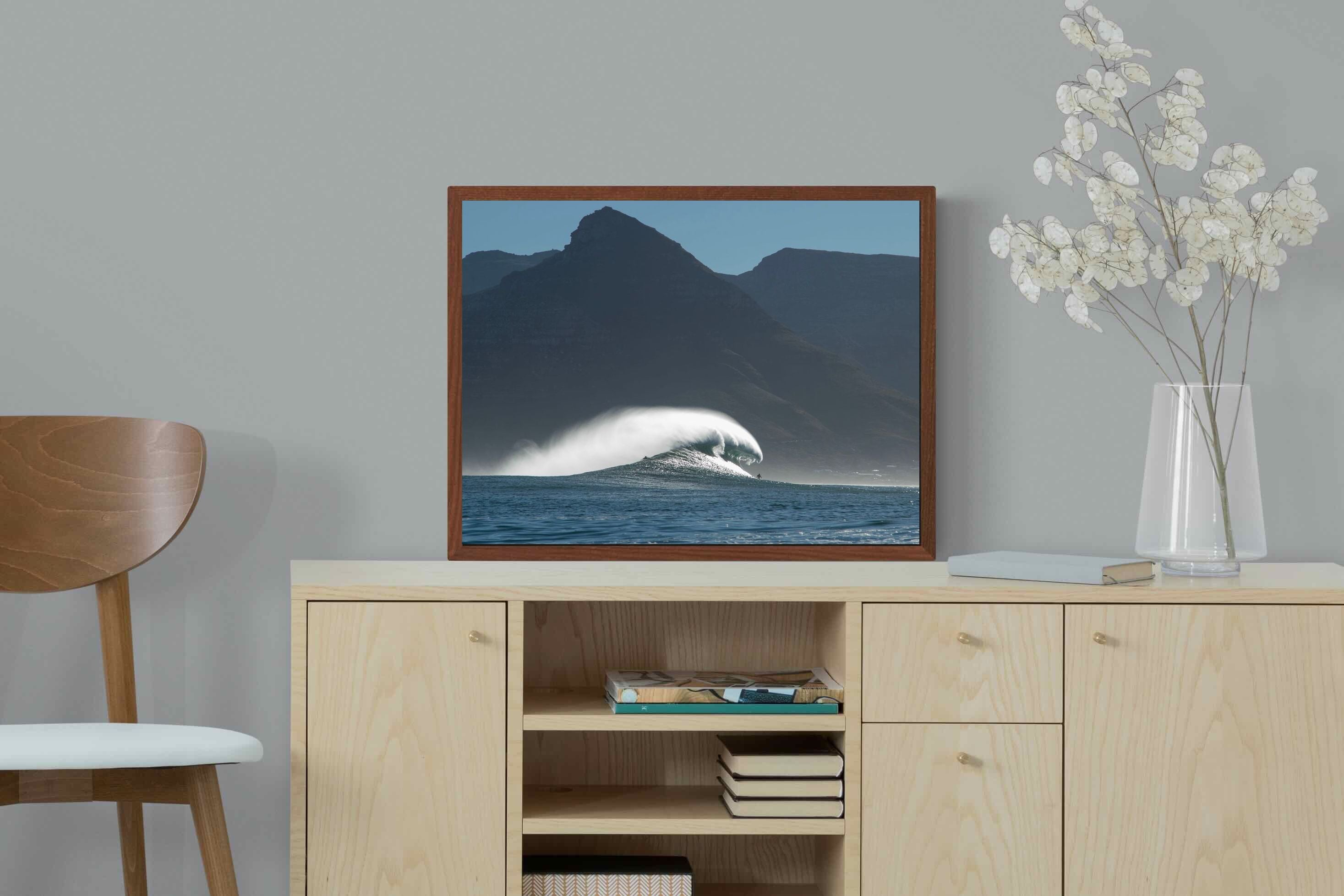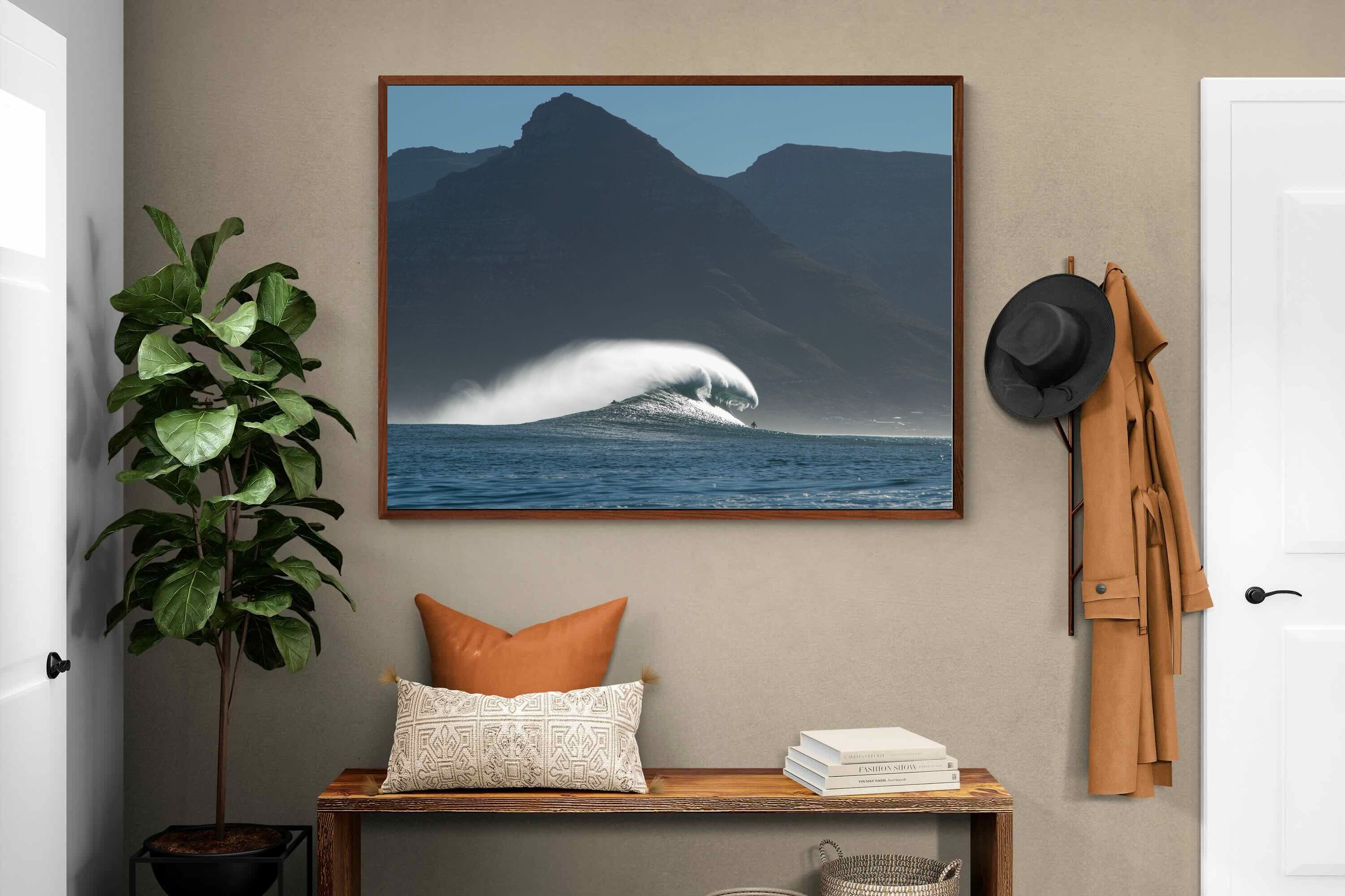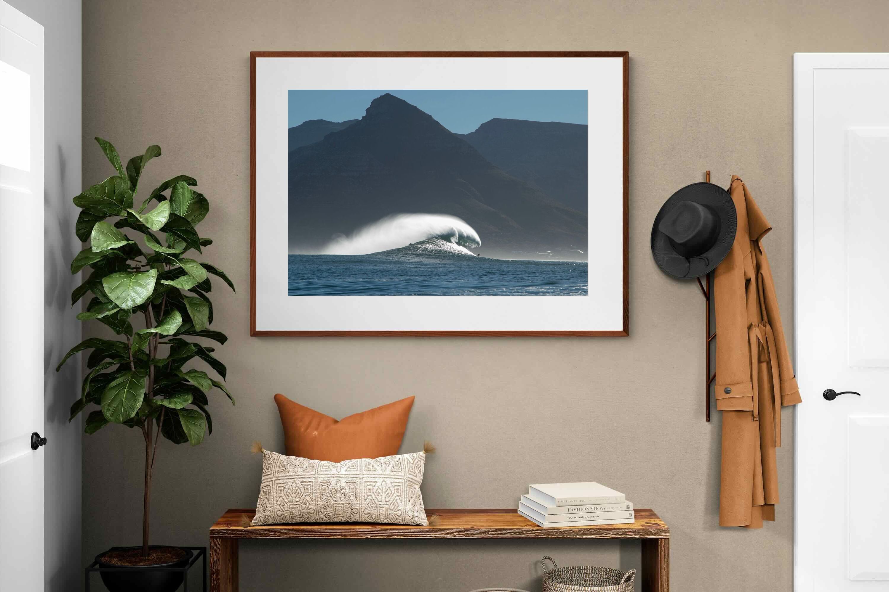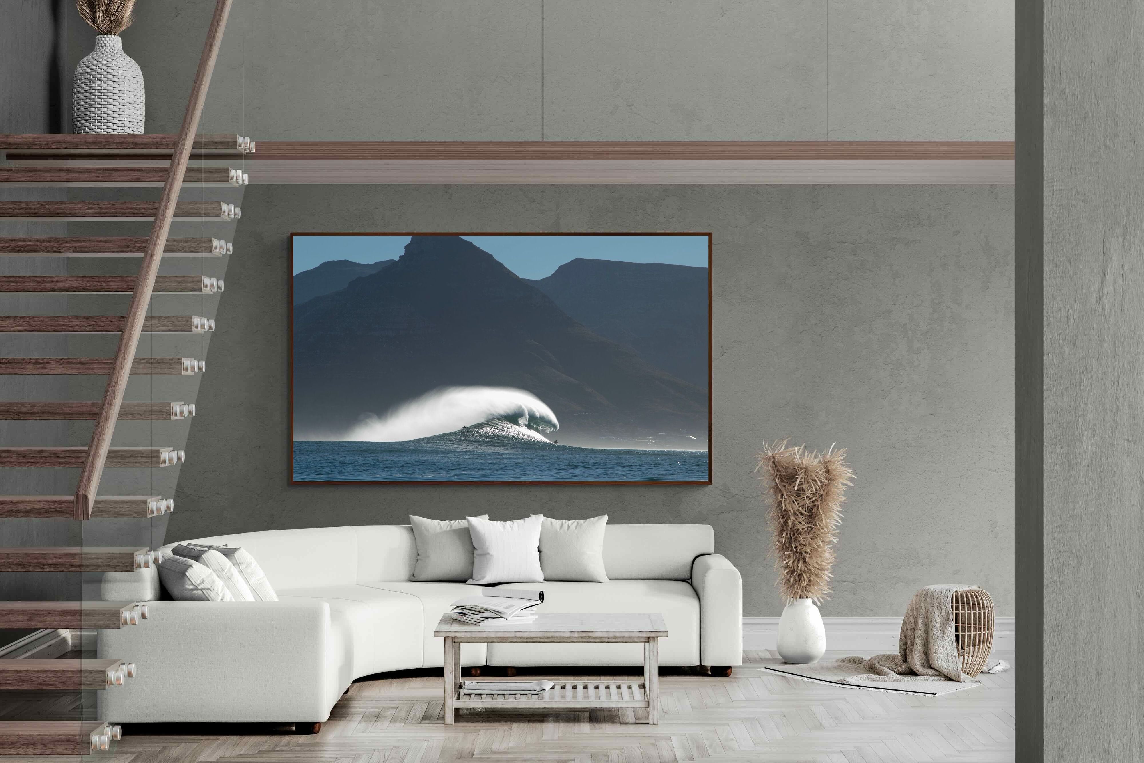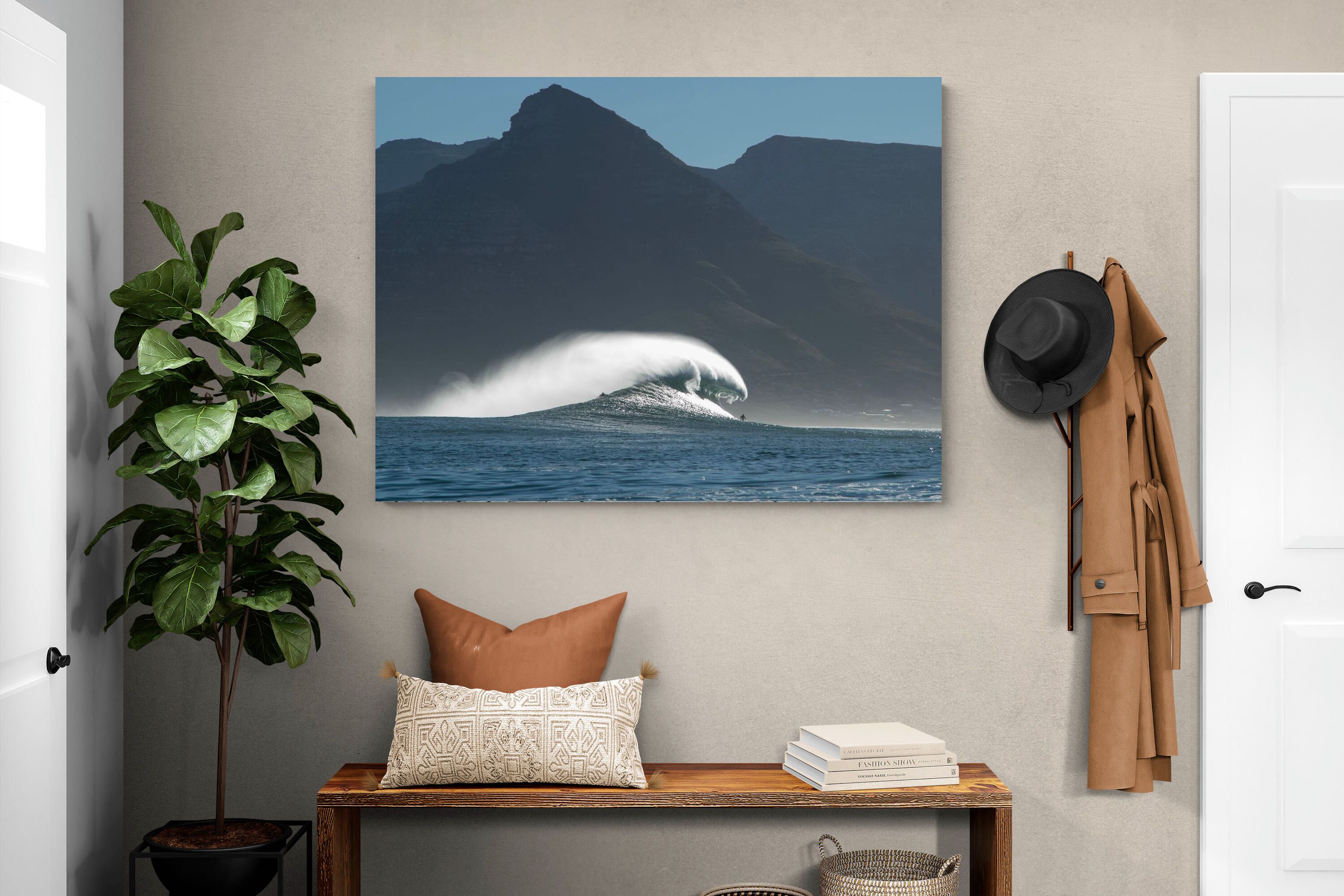 This photograph captures a powerful Atlantic swell detonating beneath the shadowed mountains of Cape Town. Shot along the city’s rugged coastline, the image balances raw ocean energy with the dramatic silhouette of the Cape Peninsula. Wind-blown spray arcs from the crest, creating movement and scale against the dark mountain backdrop. Ideal for contemporary interiors, coastal homes or statement living spaces seeking bold South African seascape photography with presence and depth.