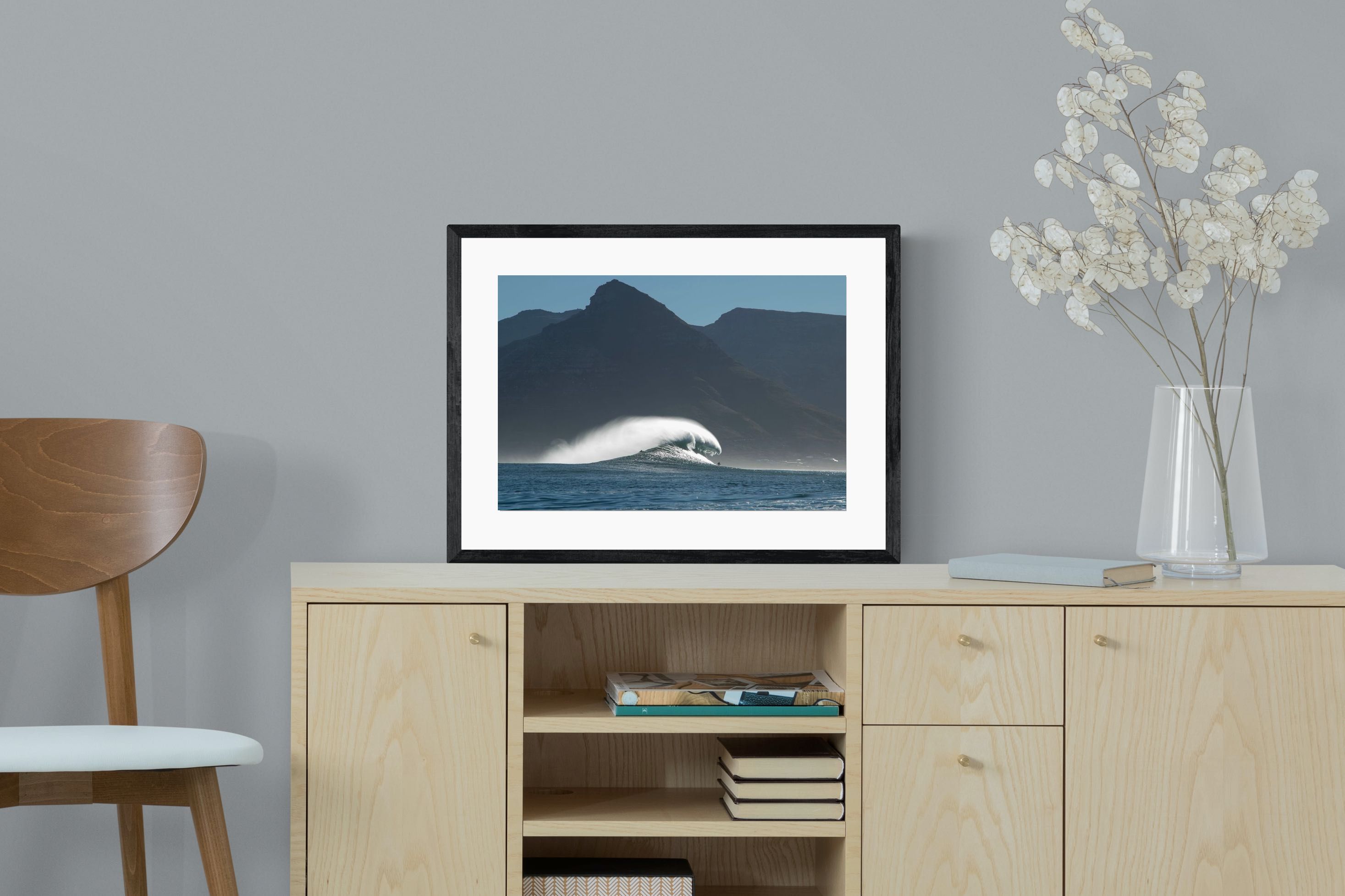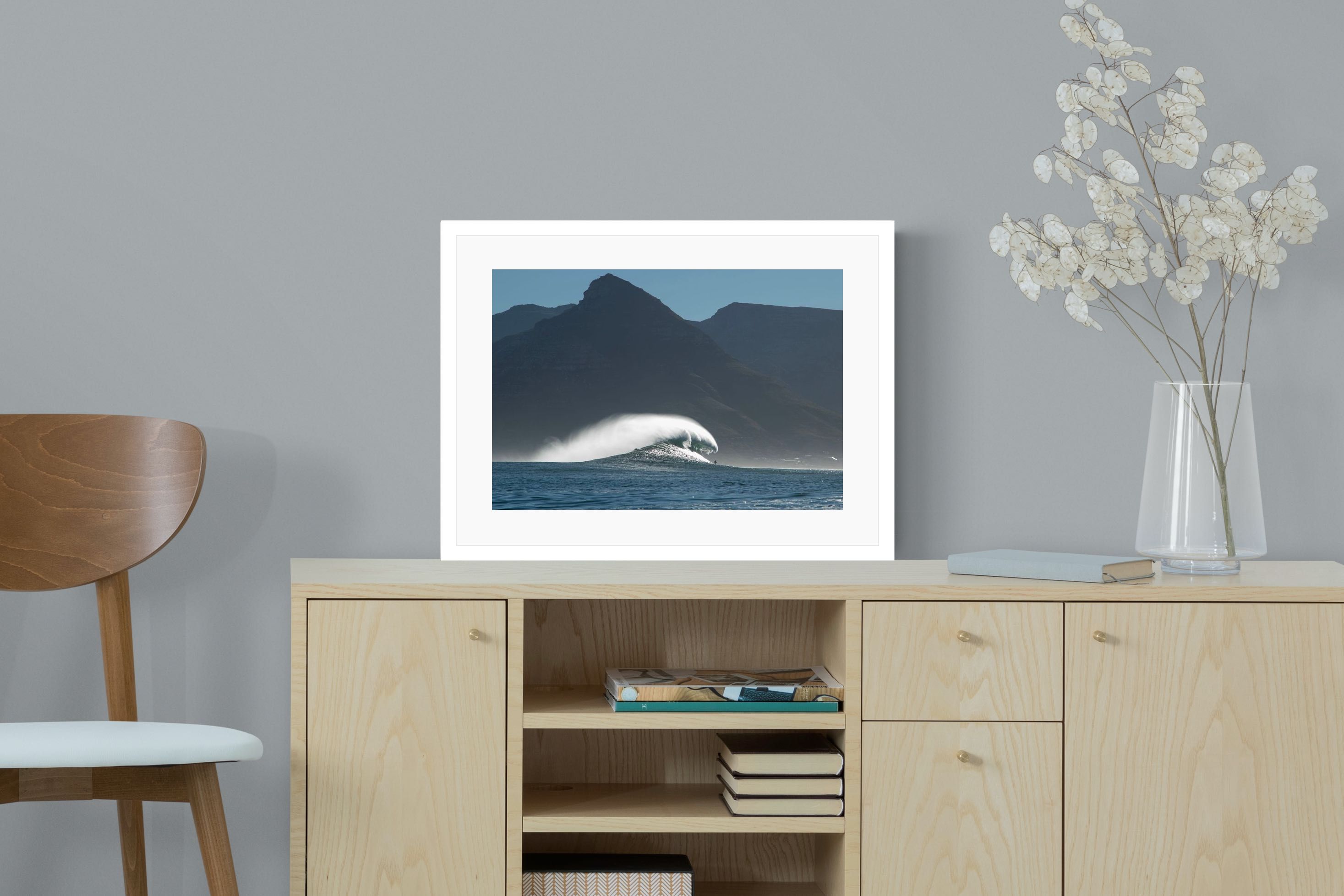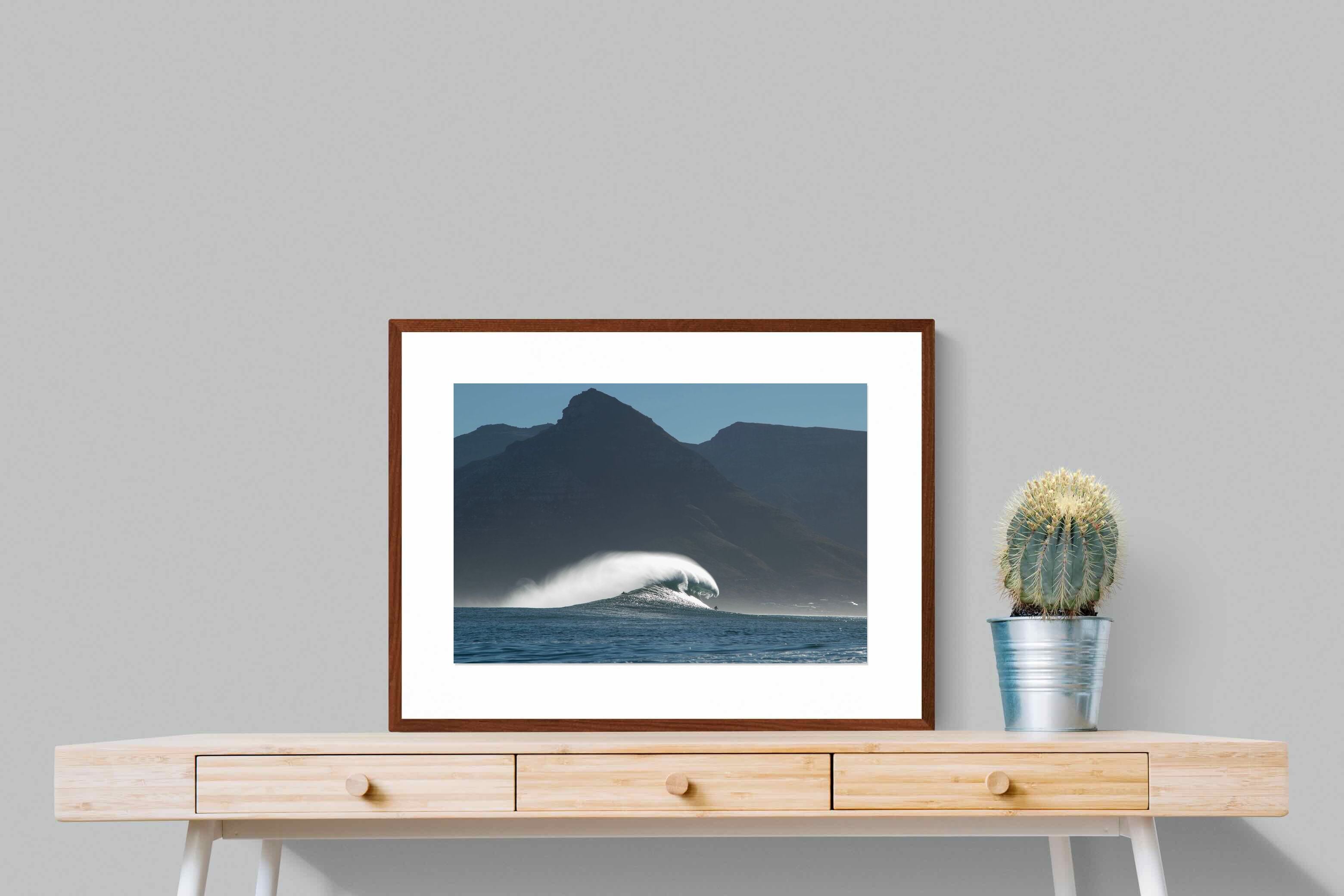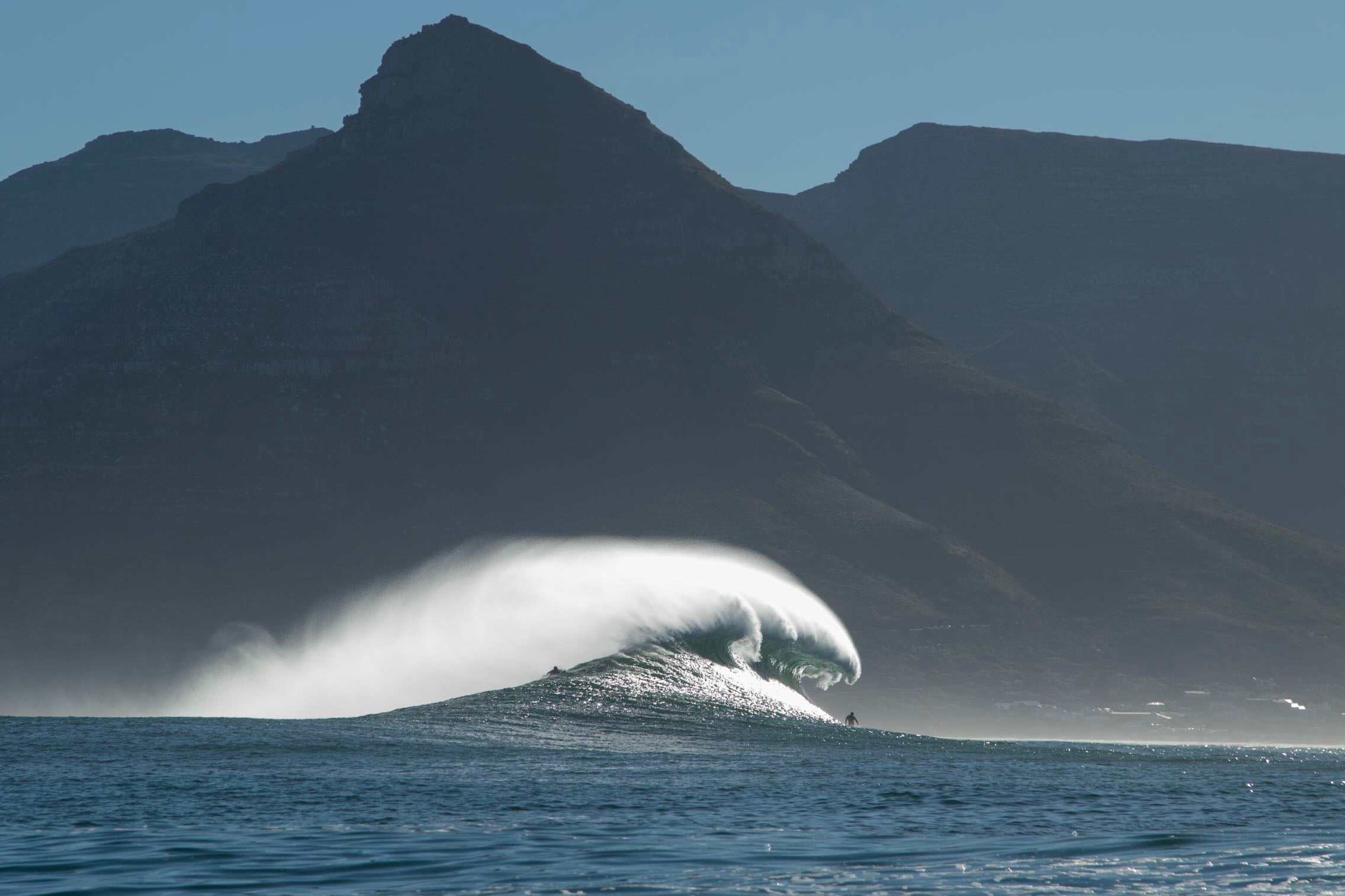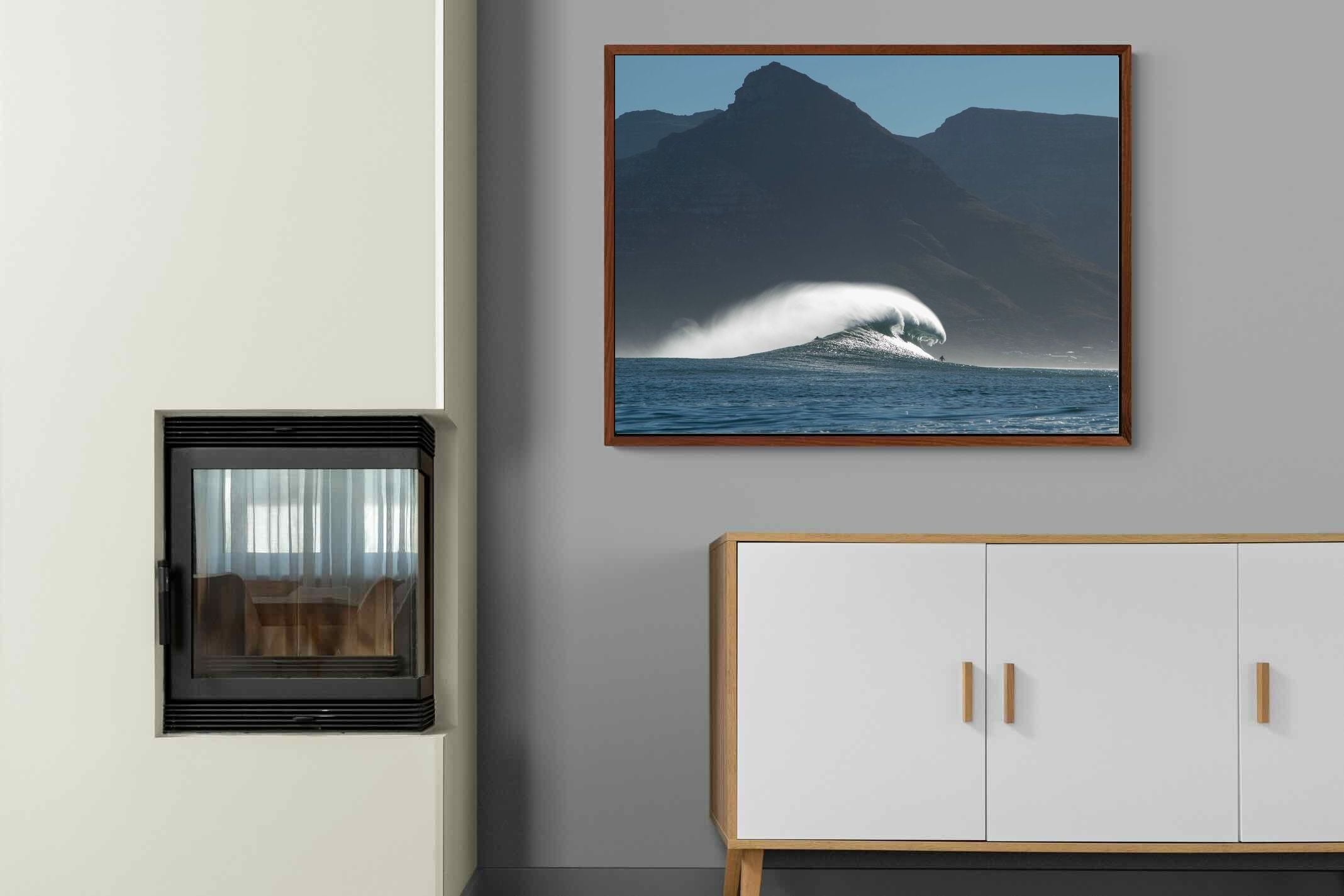 This photograph captures a powerful Atlantic swell detonating beneath the shadowed mountains of Cape Town. Shot along the city’s rugged coastline, the image balances raw ocean energy with the dramatic silhouette of the Cape Peninsula. Wind-blown spray arcs from the crest, creating movement and scale against the dark mountain backdrop. Ideal for contemporary interiors, coastal homes or statement living spaces seeking bold South African seascape photography with presence and depth.