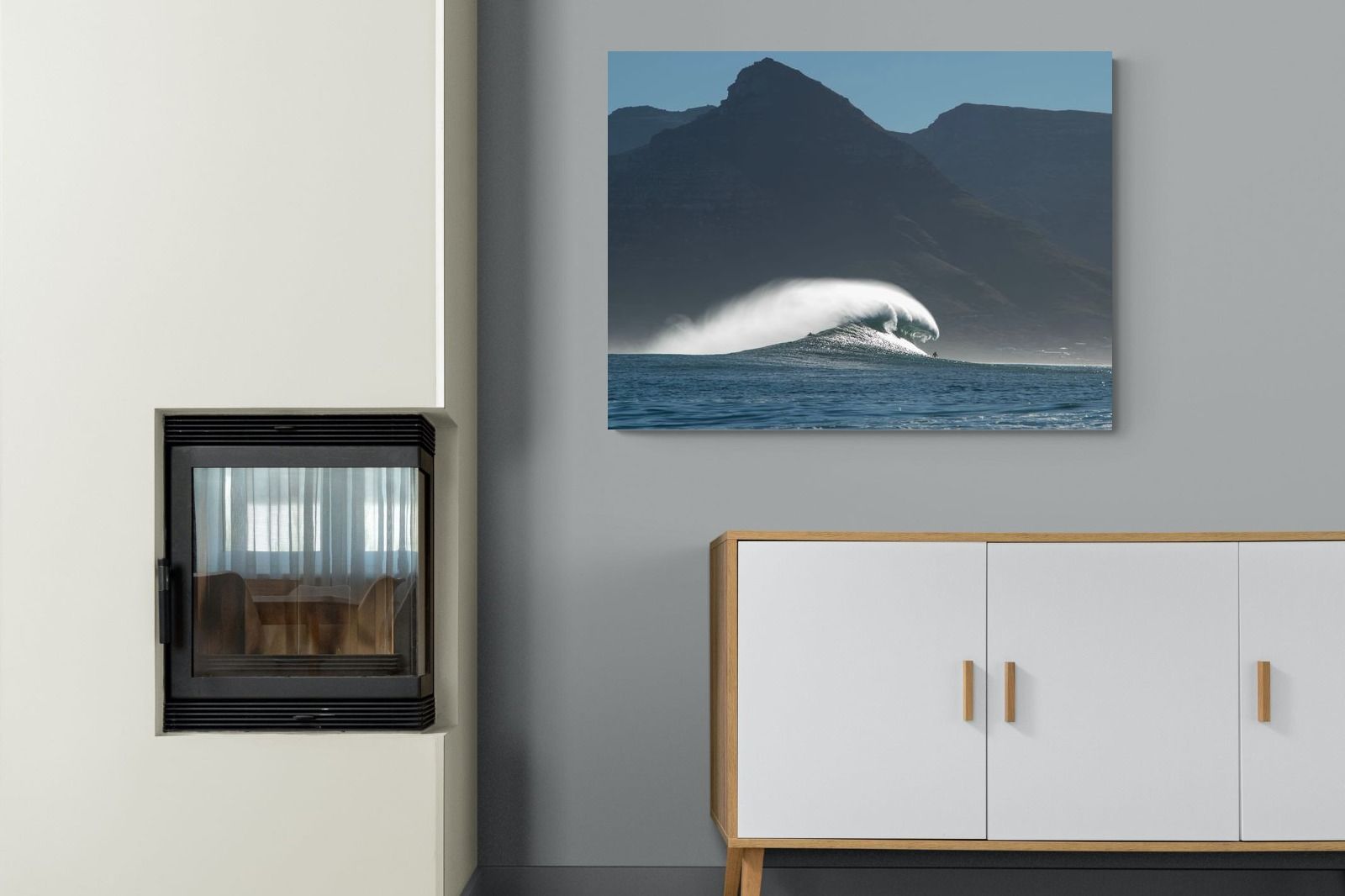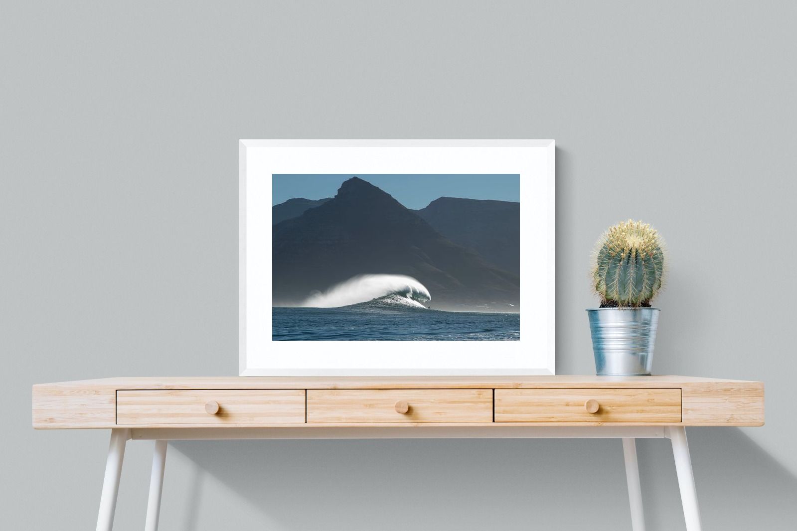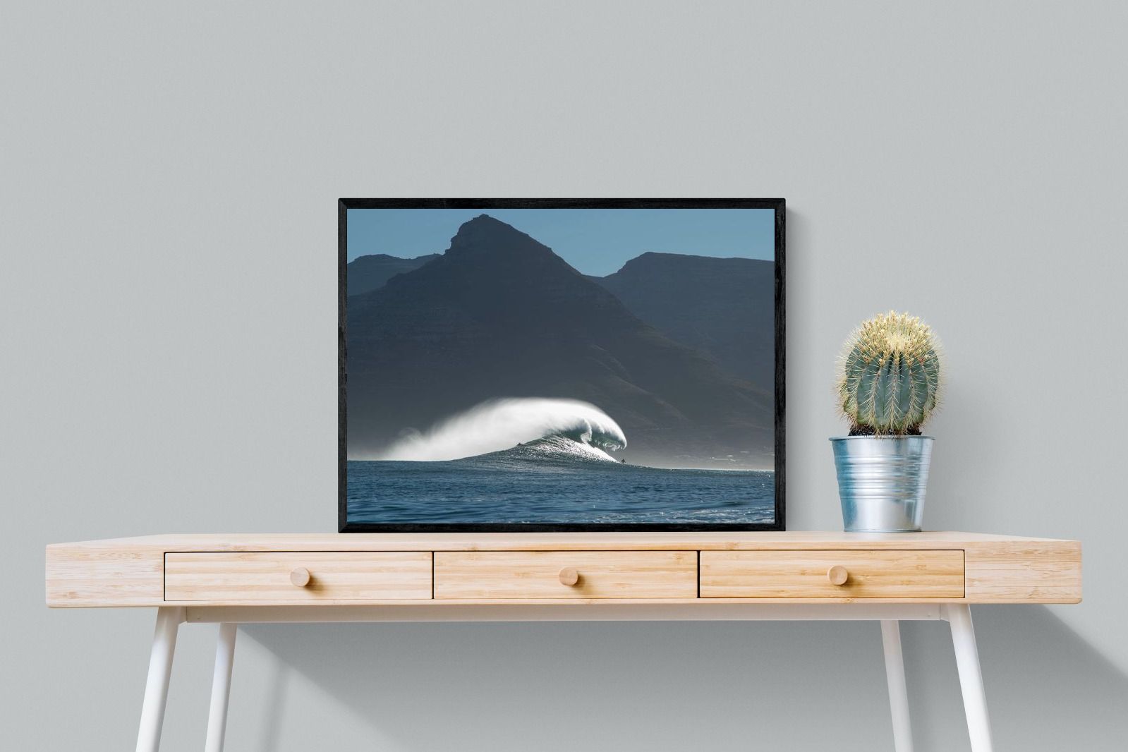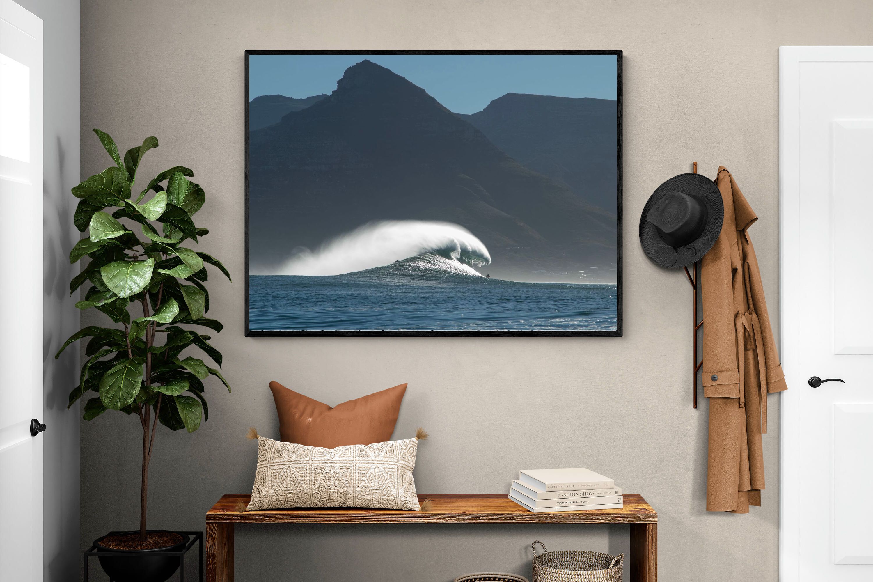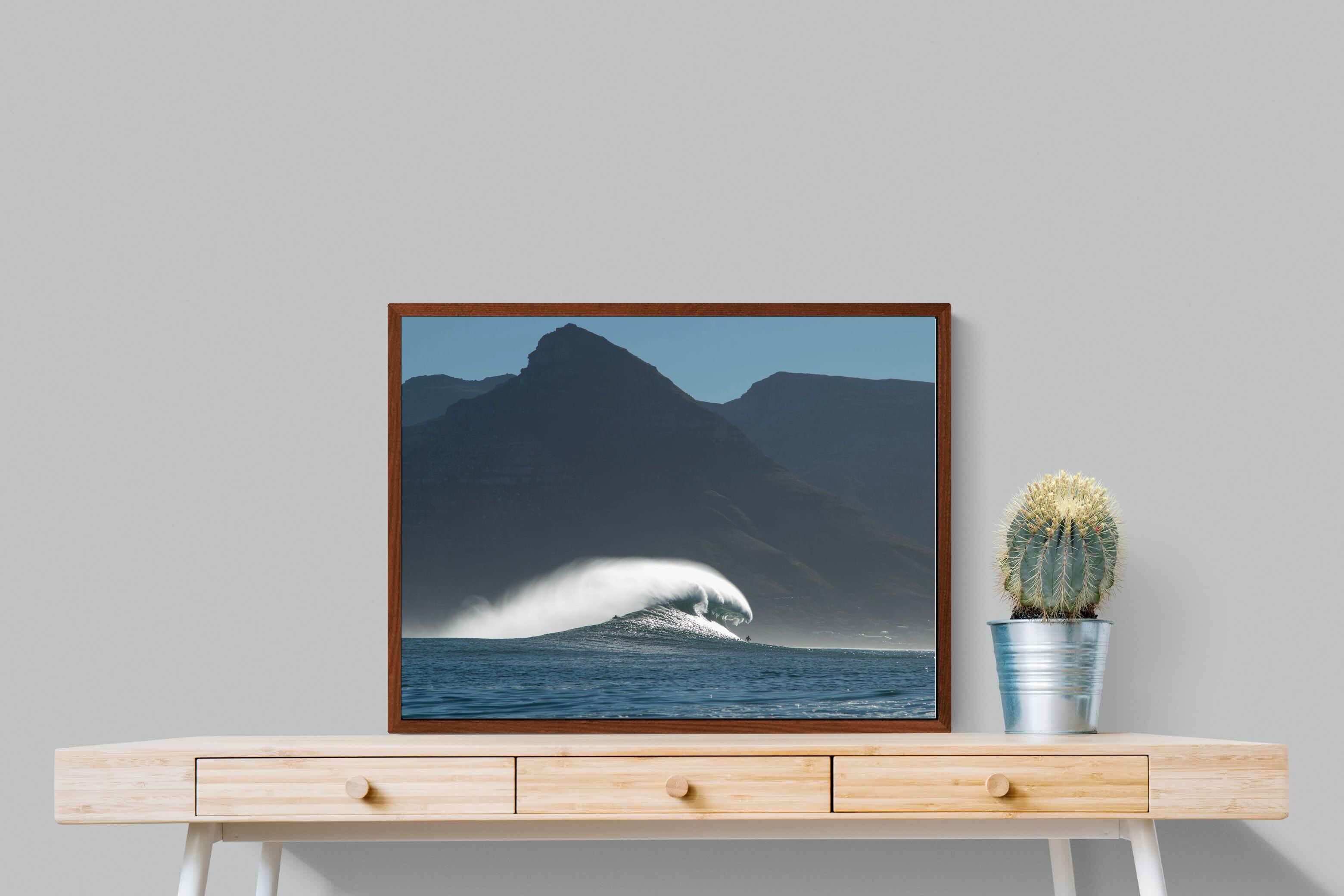 This photograph captures a powerful Atlantic swell detonating beneath the shadowed mountains of Cape Town. Shot along the city’s rugged coastline, the image balances raw ocean energy with the dramatic silhouette of the Cape Peninsula. Wind-blown spray arcs from the crest, creating movement and scale against the dark mountain backdrop. Ideal for contemporary interiors, coastal homes or statement living spaces seeking bold South African seascape photography with presence and depth.