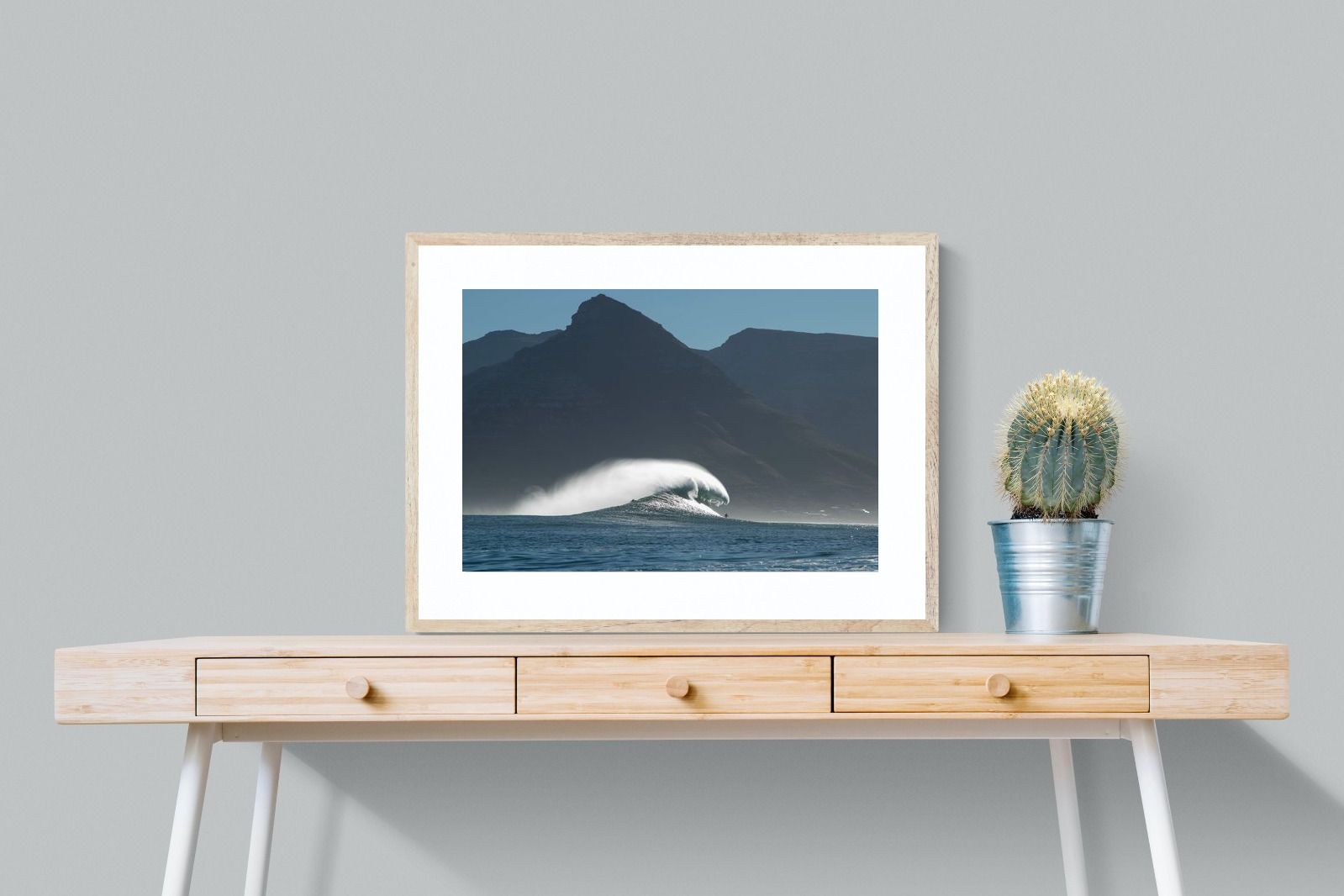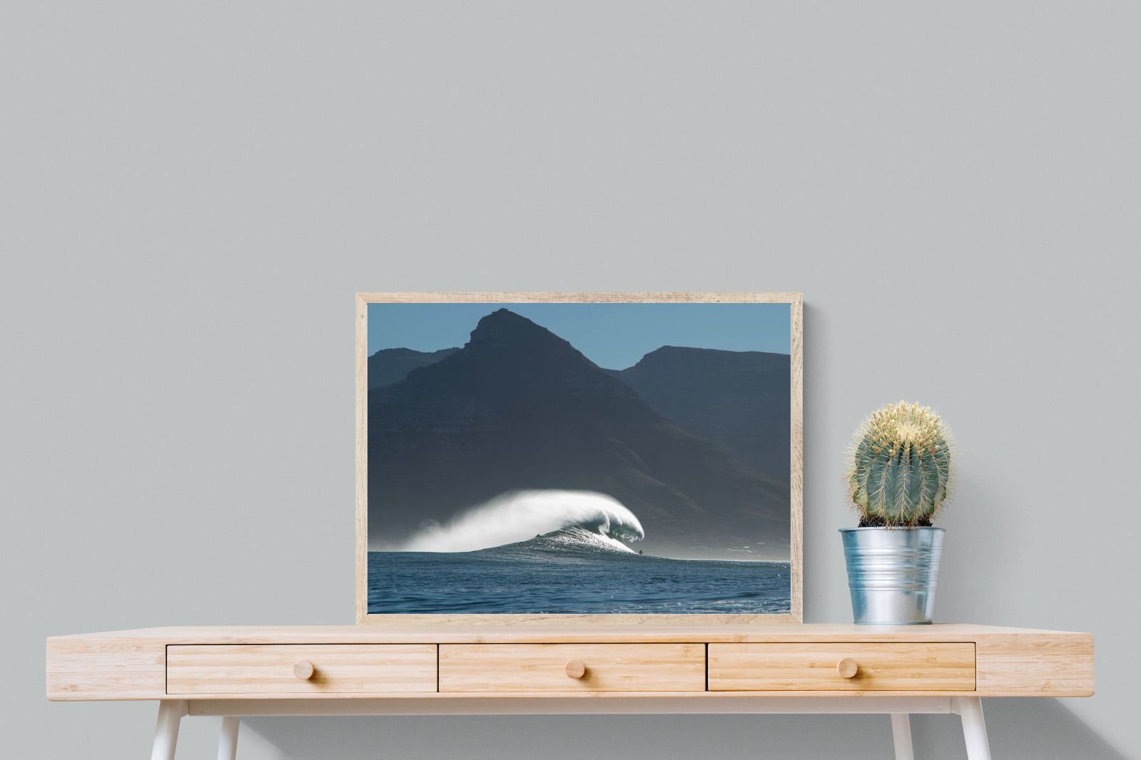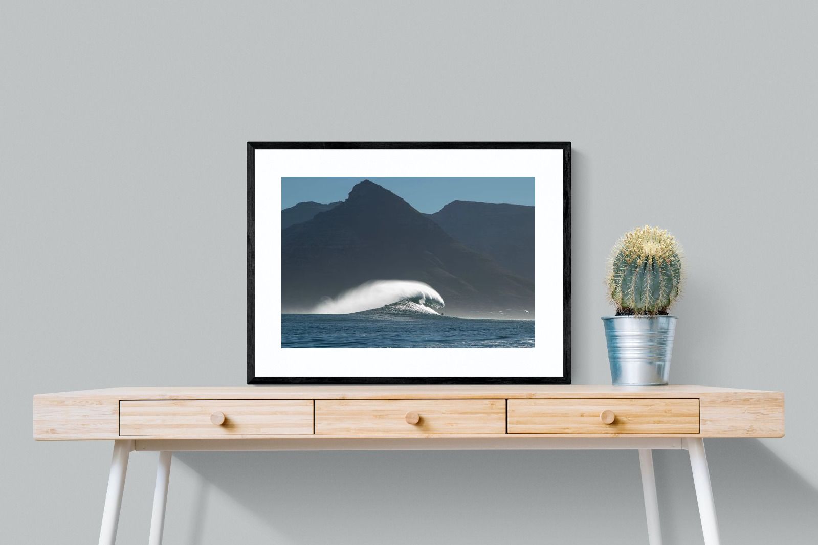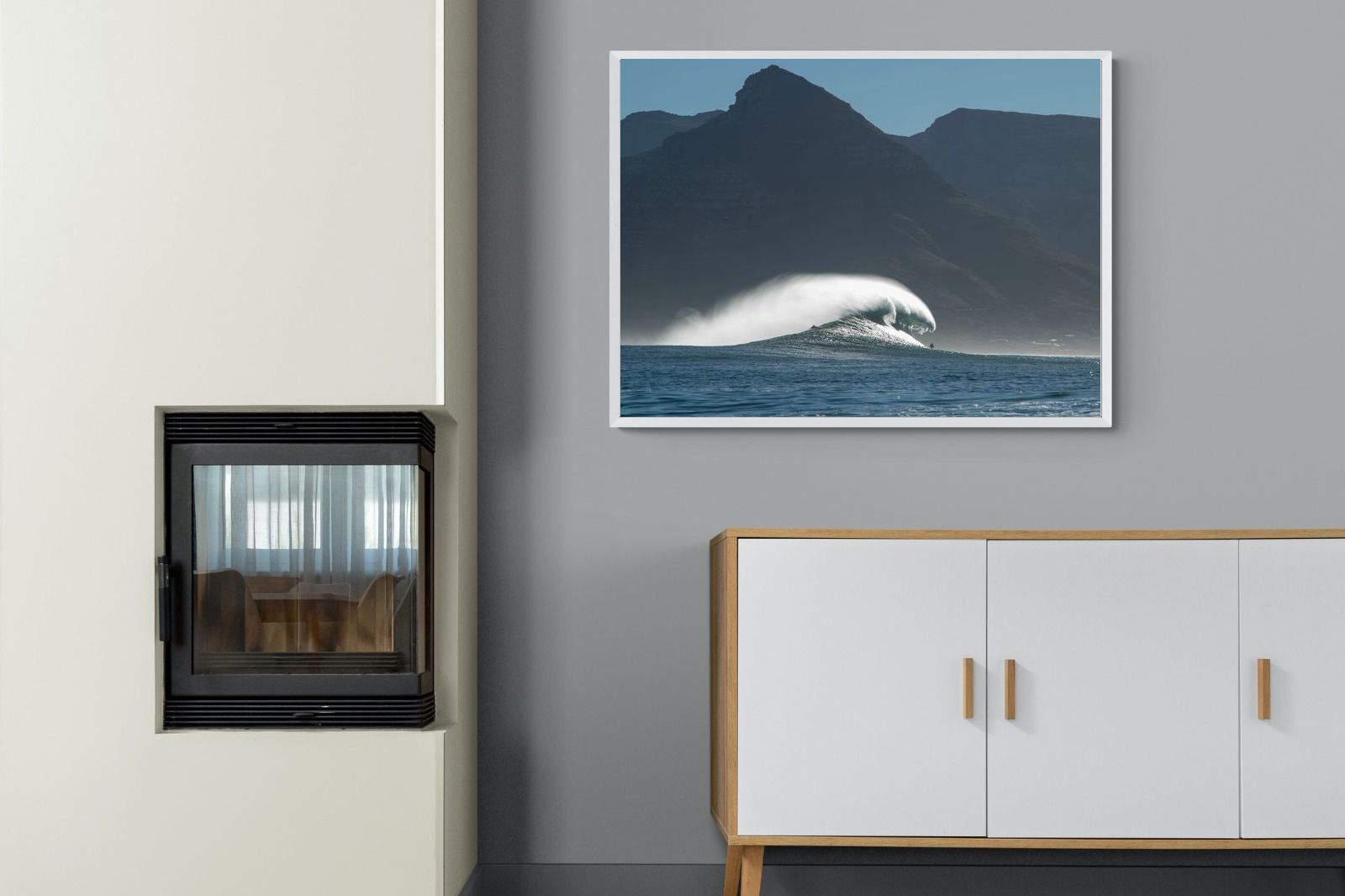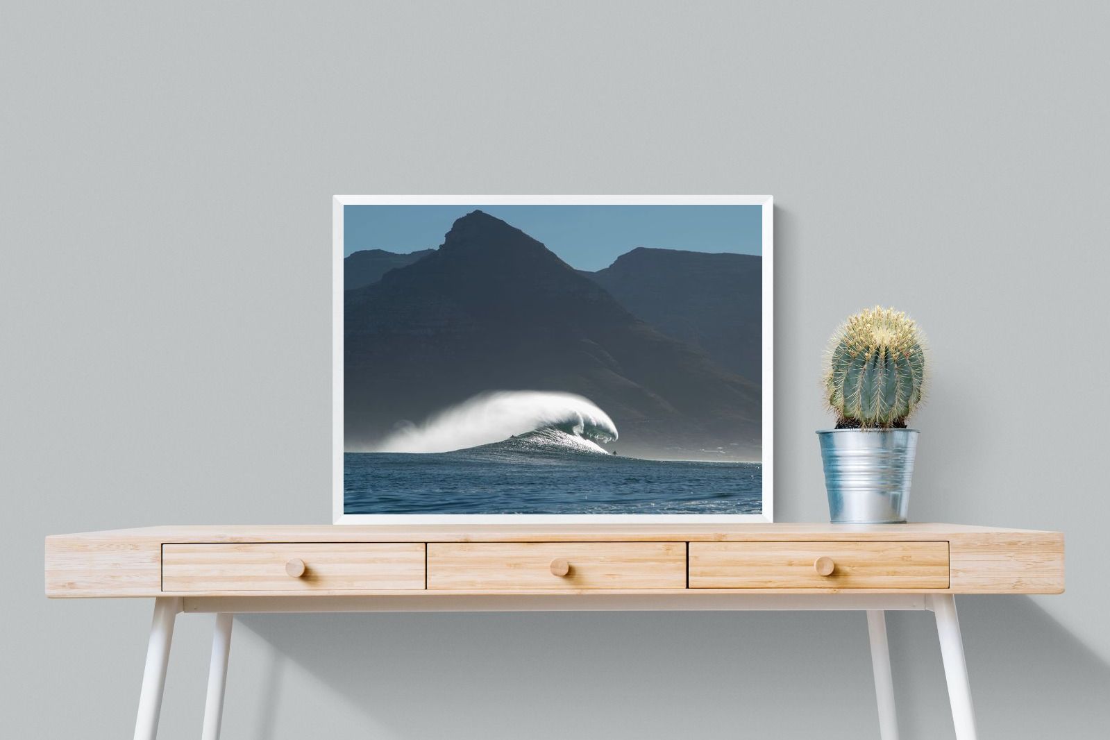 This photograph captures a powerful Atlantic swell detonating beneath the shadowed mountains of Cape Town. Shot along the city’s rugged coastline, the image balances raw ocean energy with the dramatic silhouette of the Cape Peninsula. Wind-blown spray arcs from the crest, creating movement and scale against the dark mountain backdrop. Ideal for contemporary interiors, coastal homes or statement living spaces seeking bold South African seascape photography with presence and depth.
