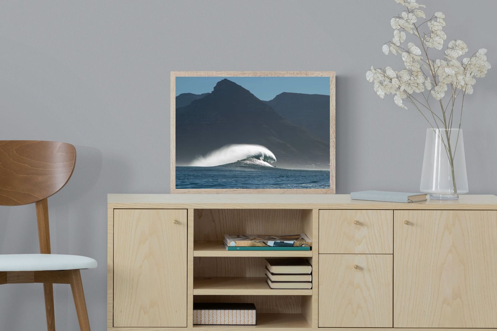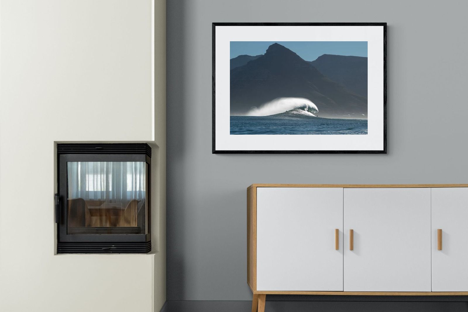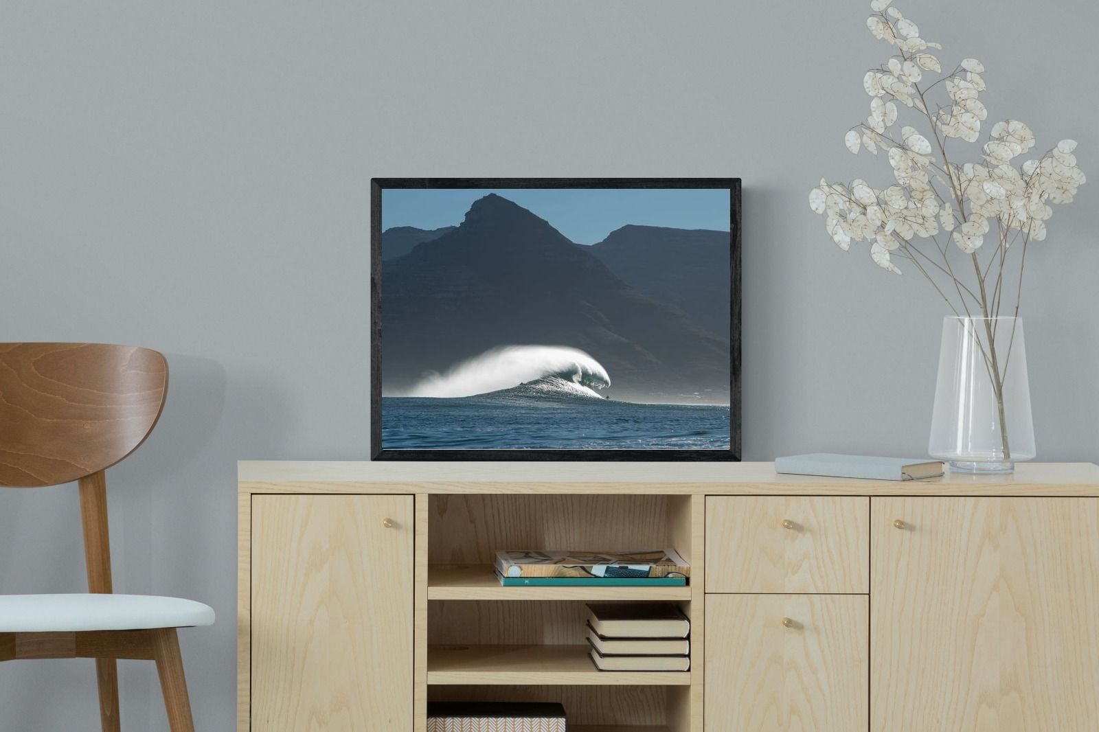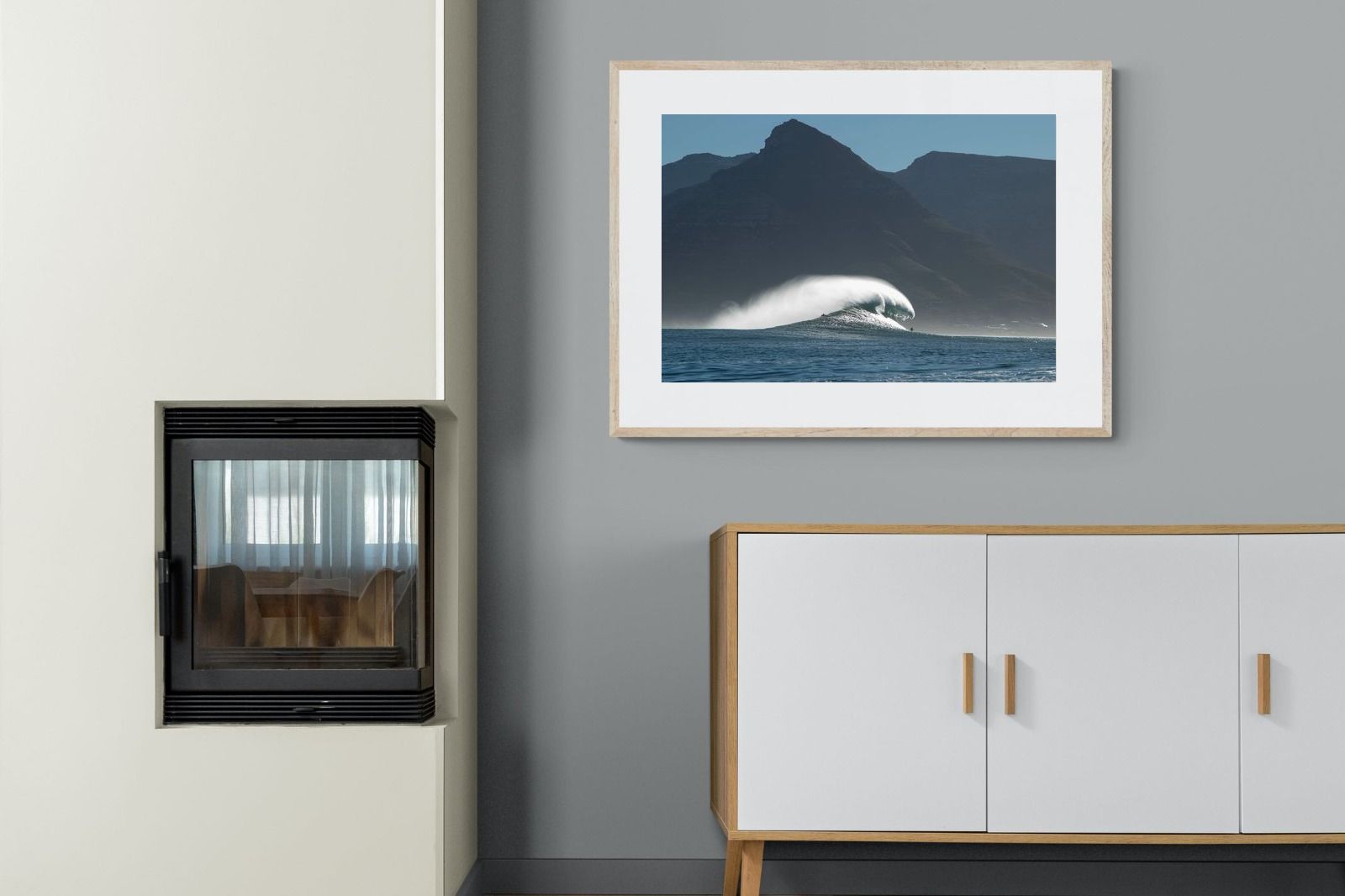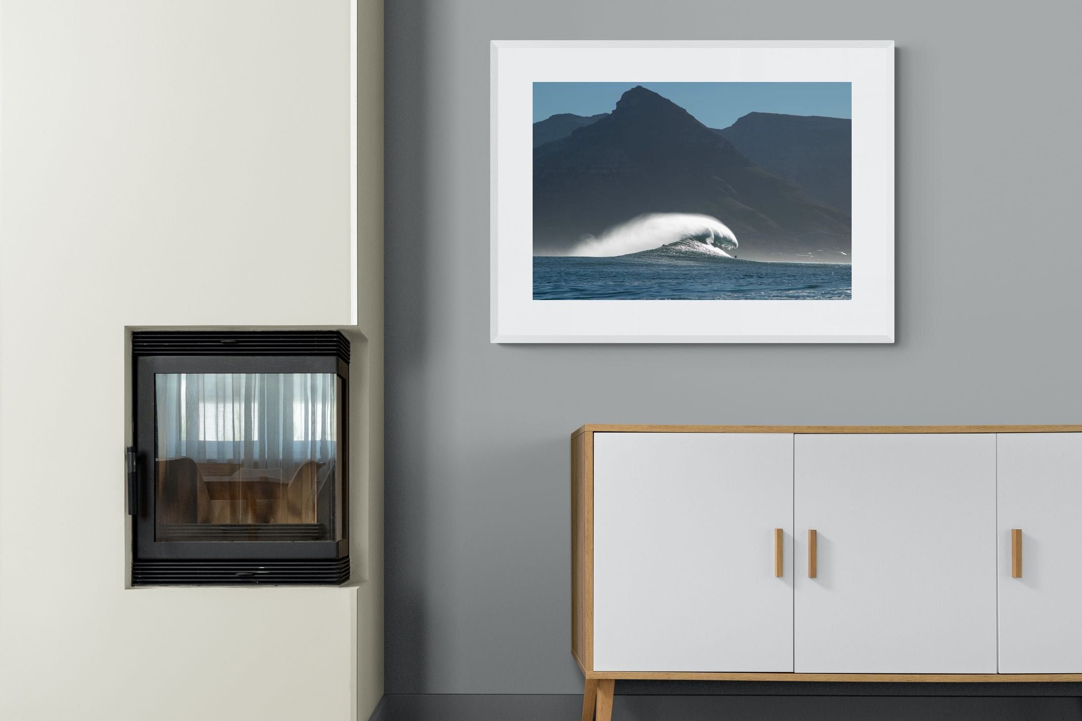 This photograph captures a powerful Atlantic swell detonating beneath the shadowed mountains of Cape Town. Shot along the city’s rugged coastline, the image balances raw ocean energy with the dramatic silhouette of the Cape Peninsula. Wind-blown spray arcs from the crest, creating movement and scale against the dark mountain backdrop. Ideal for contemporary interiors, coastal homes or statement living spaces seeking bold South African seascape photography with presence and depth.