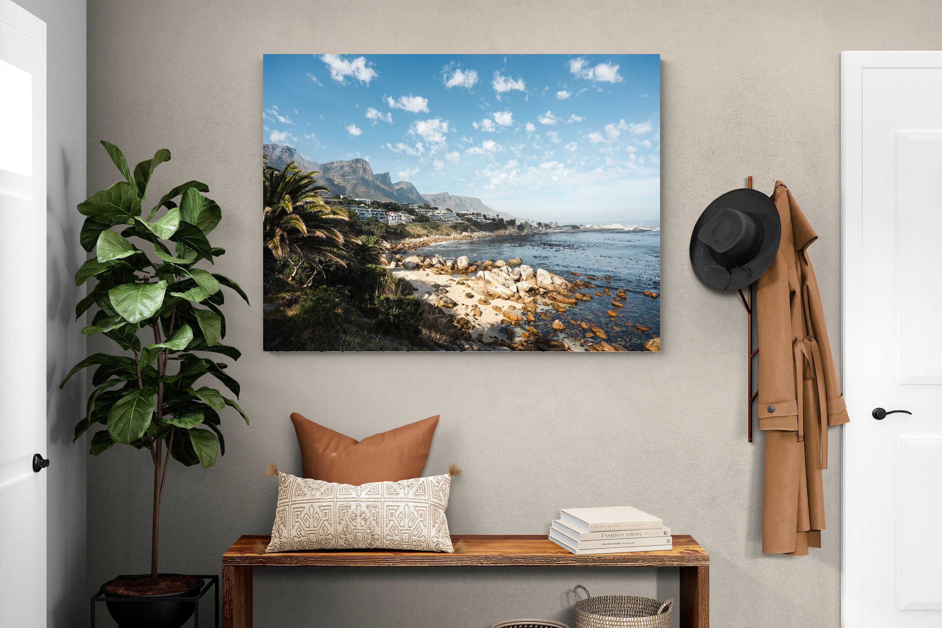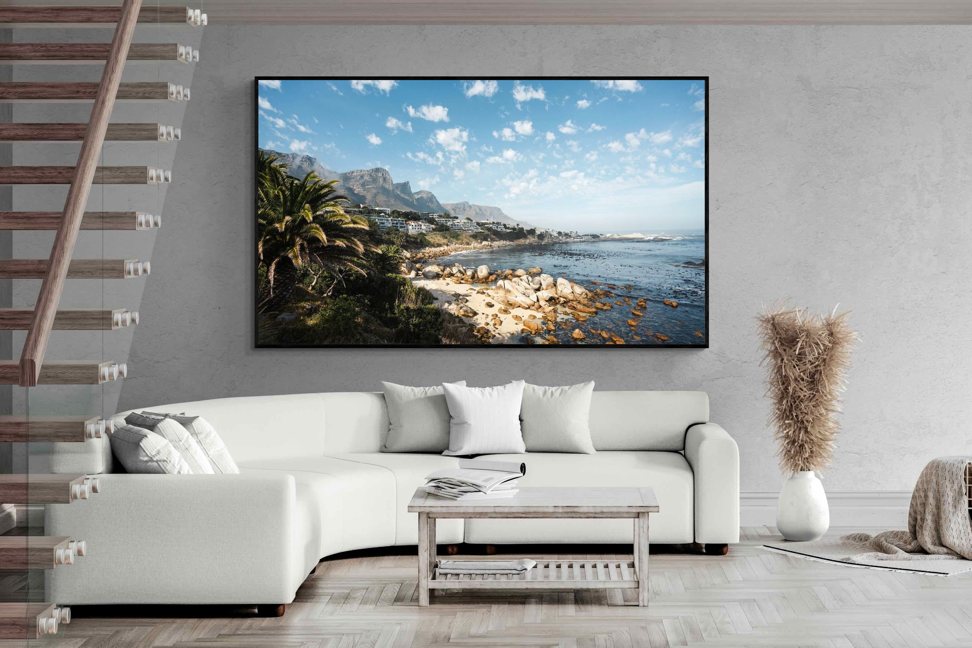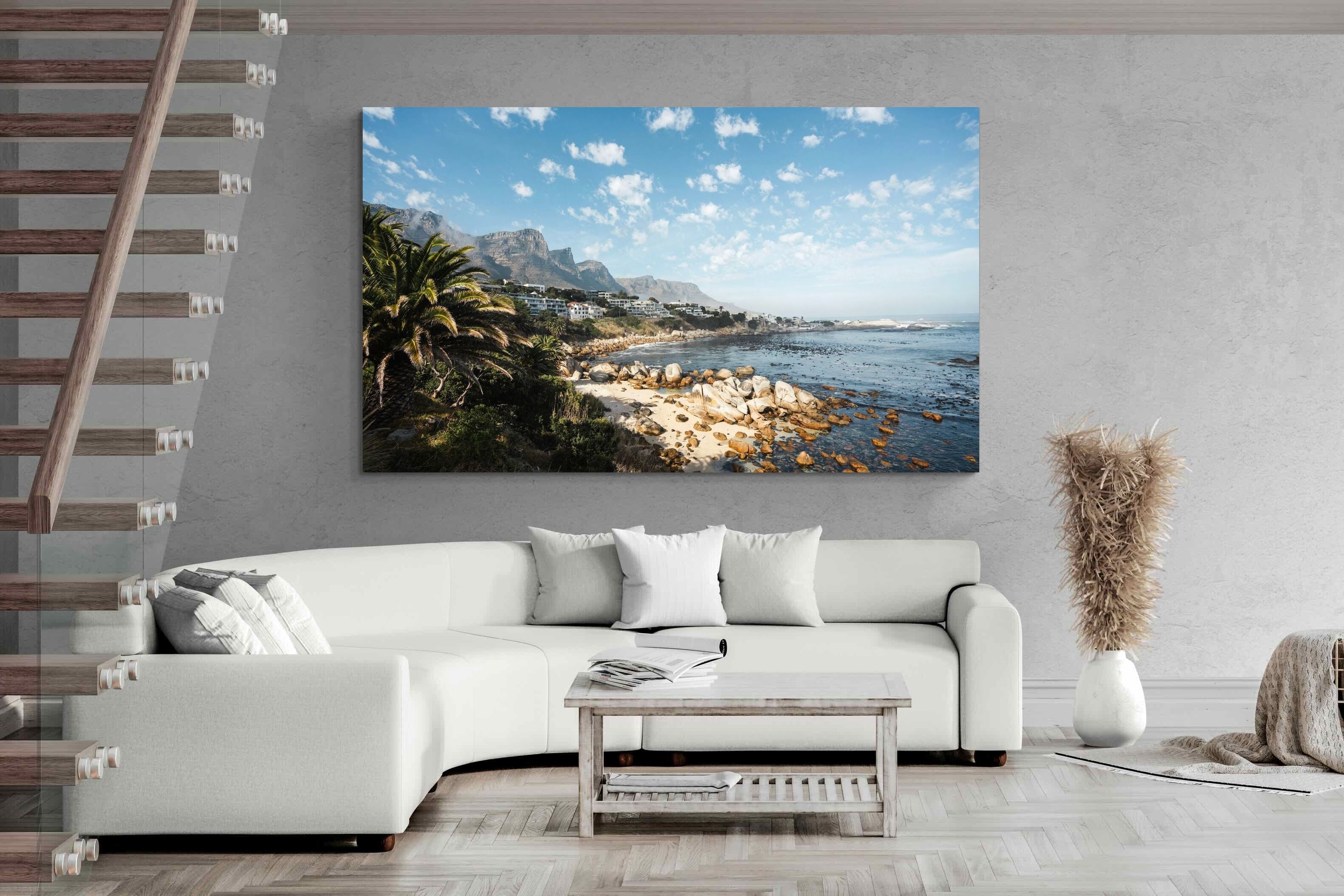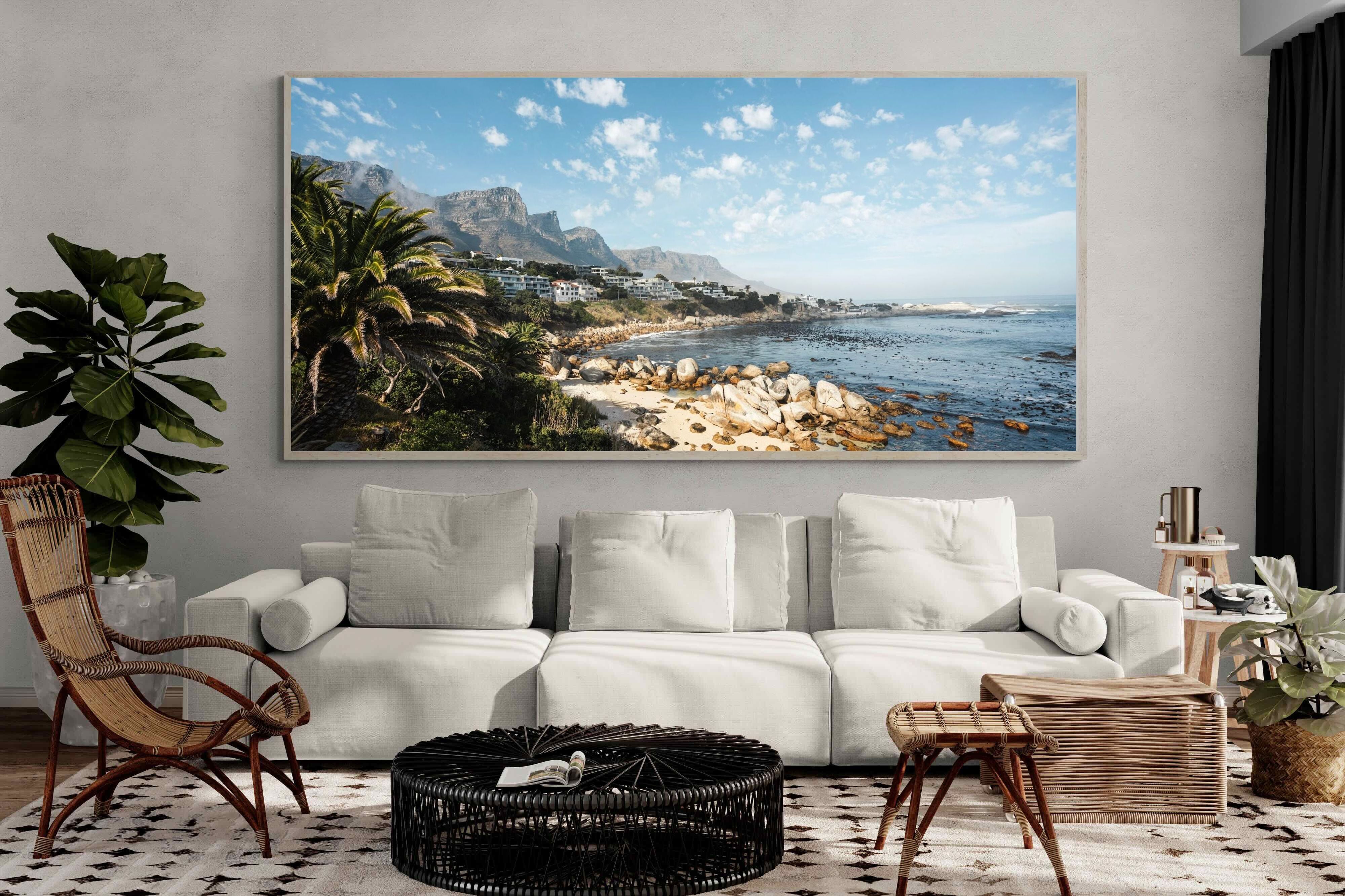 Barley Bay showcases one of Cape Town’s most scenic stretches of coastline, where rugged boulders meet clear blue water beneath dramatic mountain slopes. Palm trees and hillside homes frame the shoreline, creating a layered composition rich in texture and depth. The fresh light and natural palette make this artwork perfect for coastal, modern or relaxed interiors. A vibrant celebration of Cape Town’s Atlantic seaboard beauty.