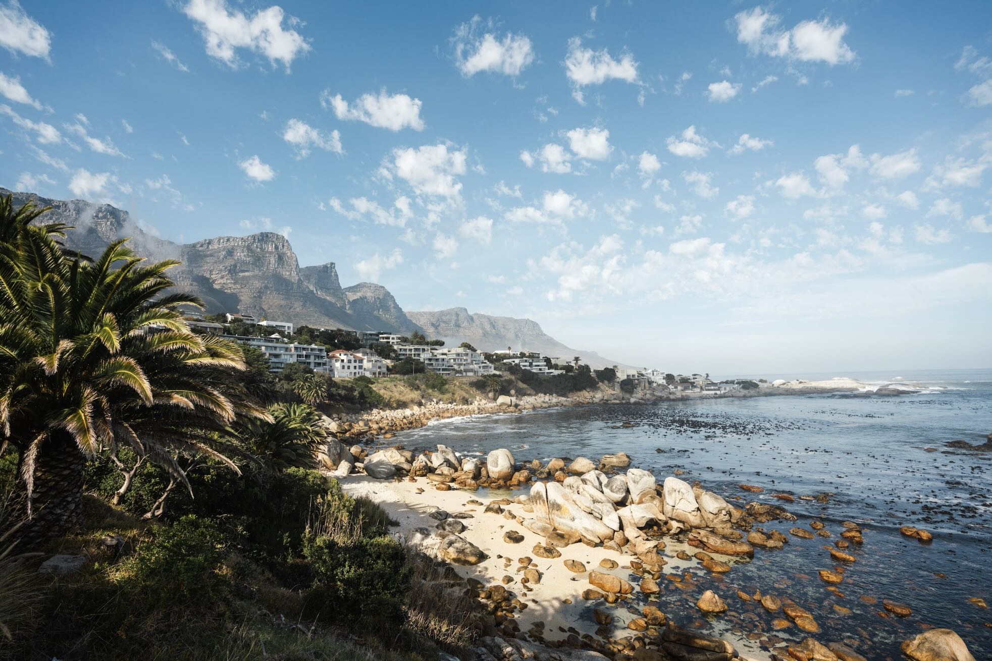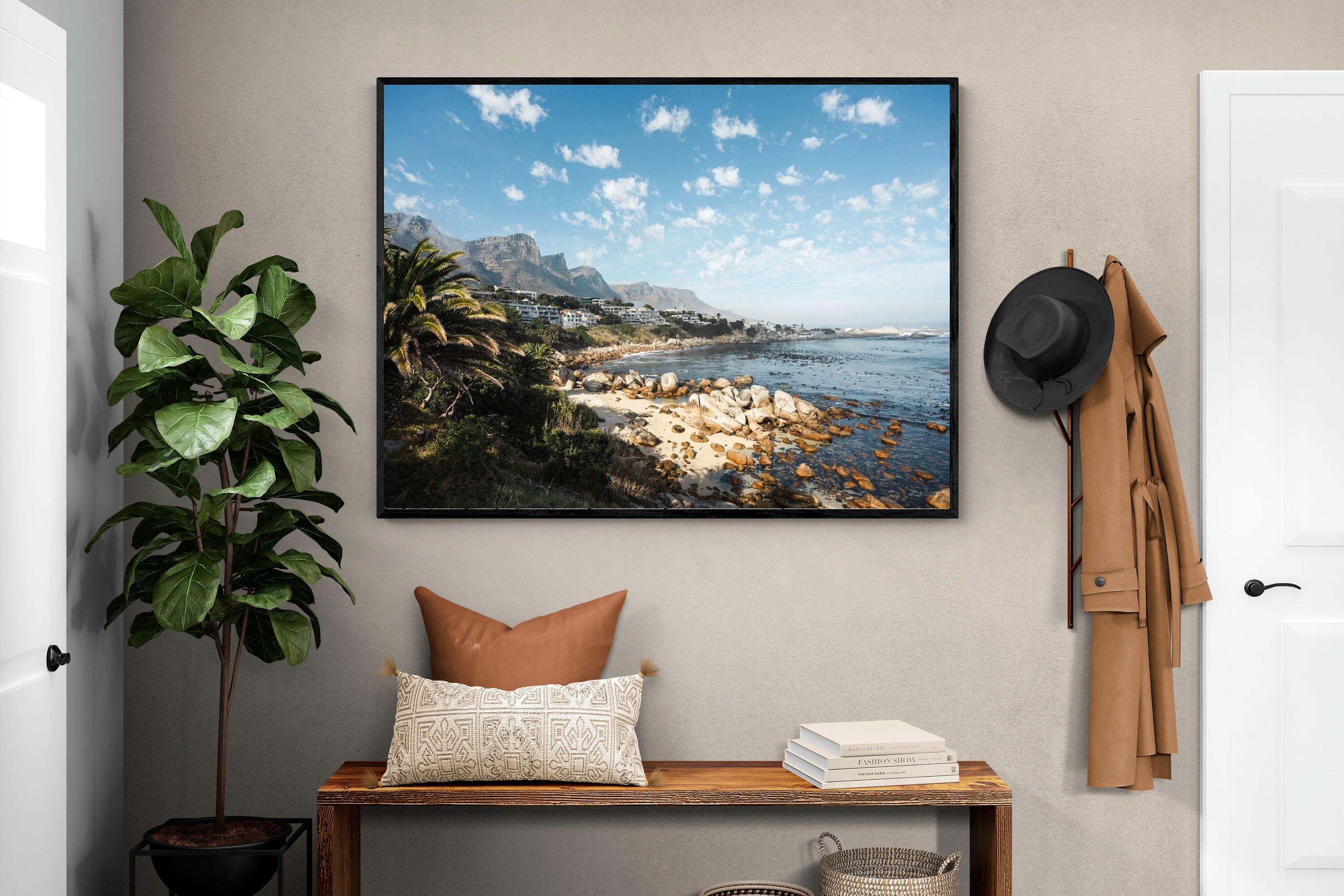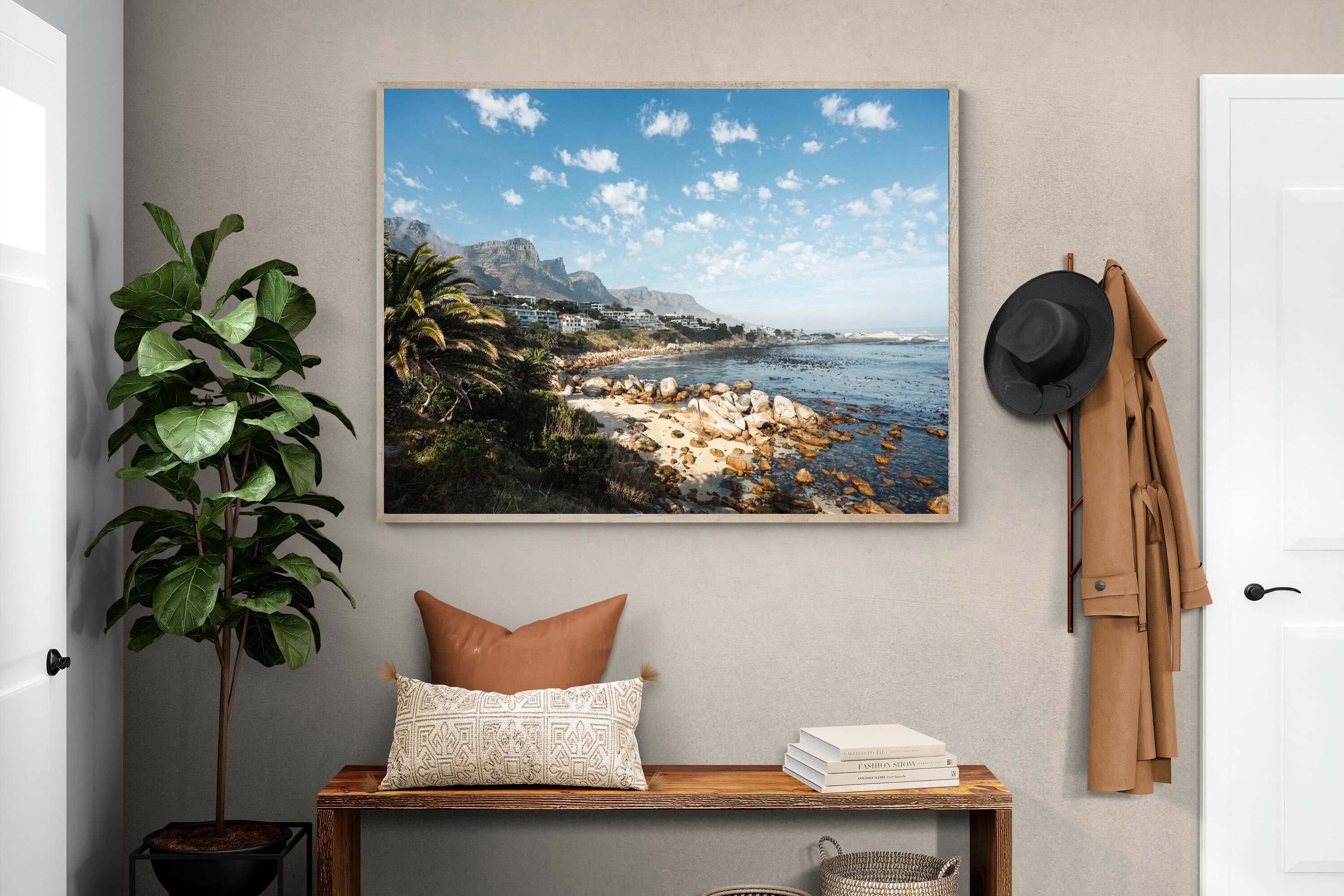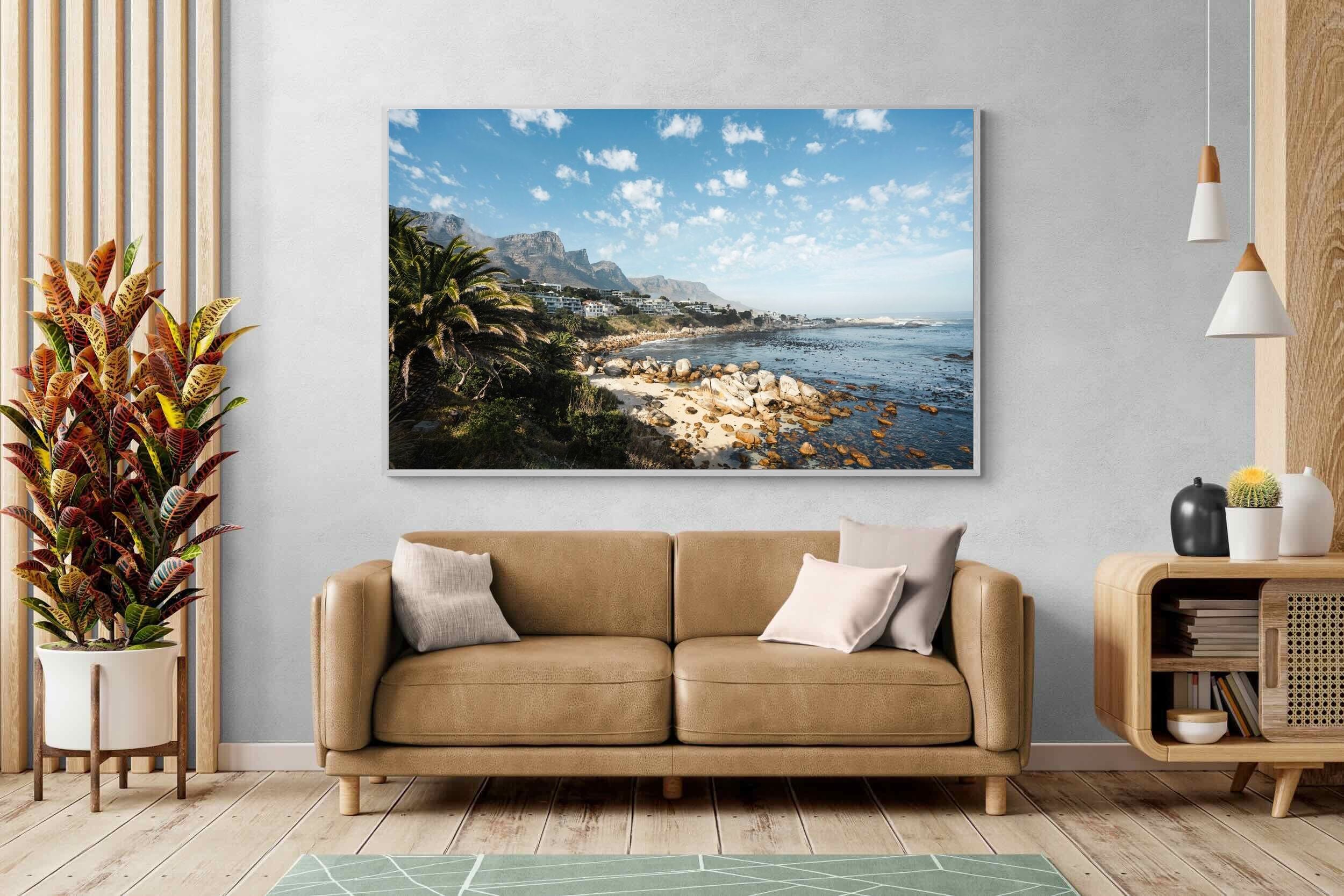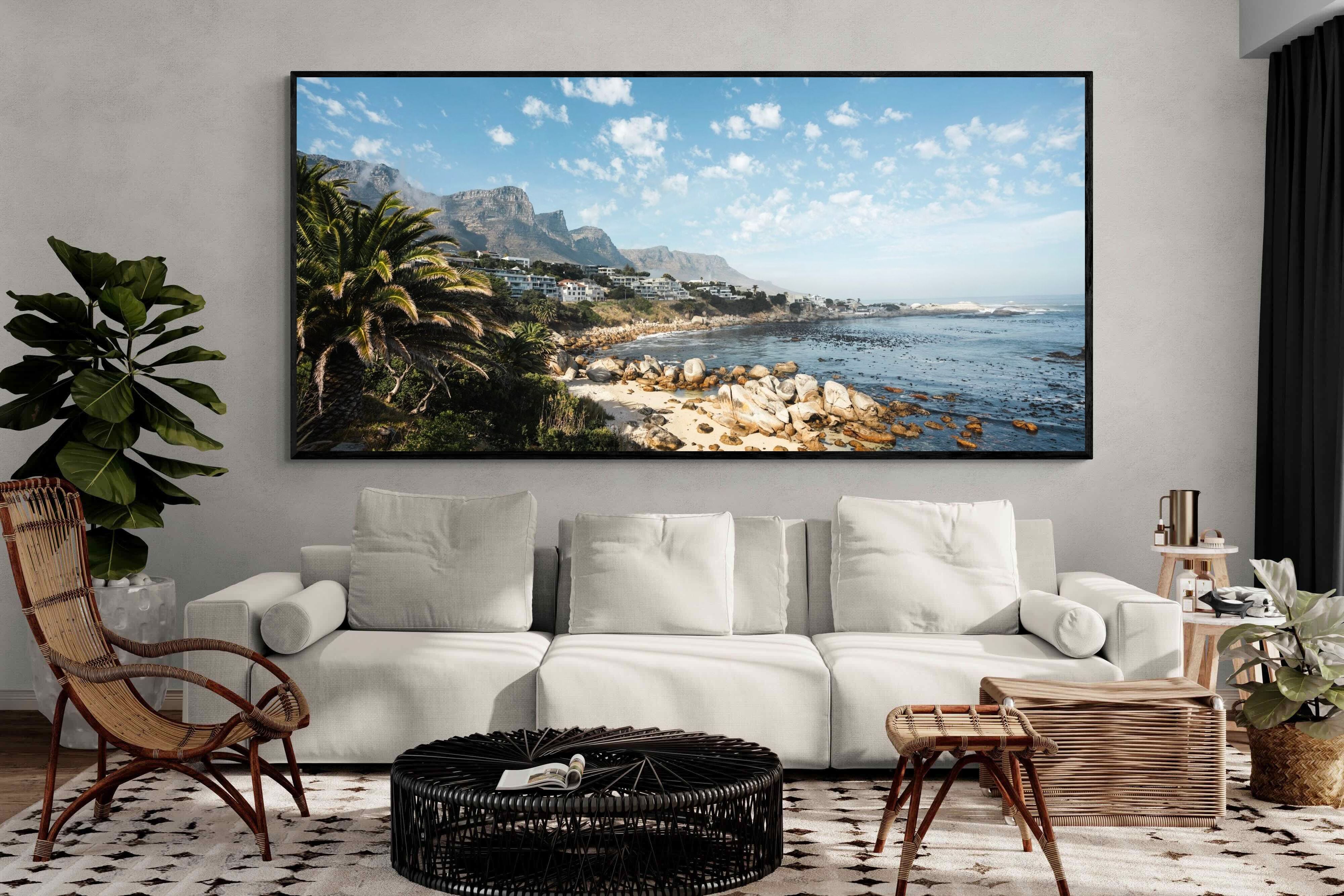 Barley Bay showcases one of Cape Town’s most scenic stretches of coastline, where rugged boulders meet clear blue water beneath dramatic mountain slopes. Palm trees and hillside homes frame the shoreline, creating a layered composition rich in texture and depth. The fresh light and natural palette make this artwork perfect for coastal, modern or relaxed interiors. A vibrant celebration of Cape Town’s Atlantic seaboard beauty.