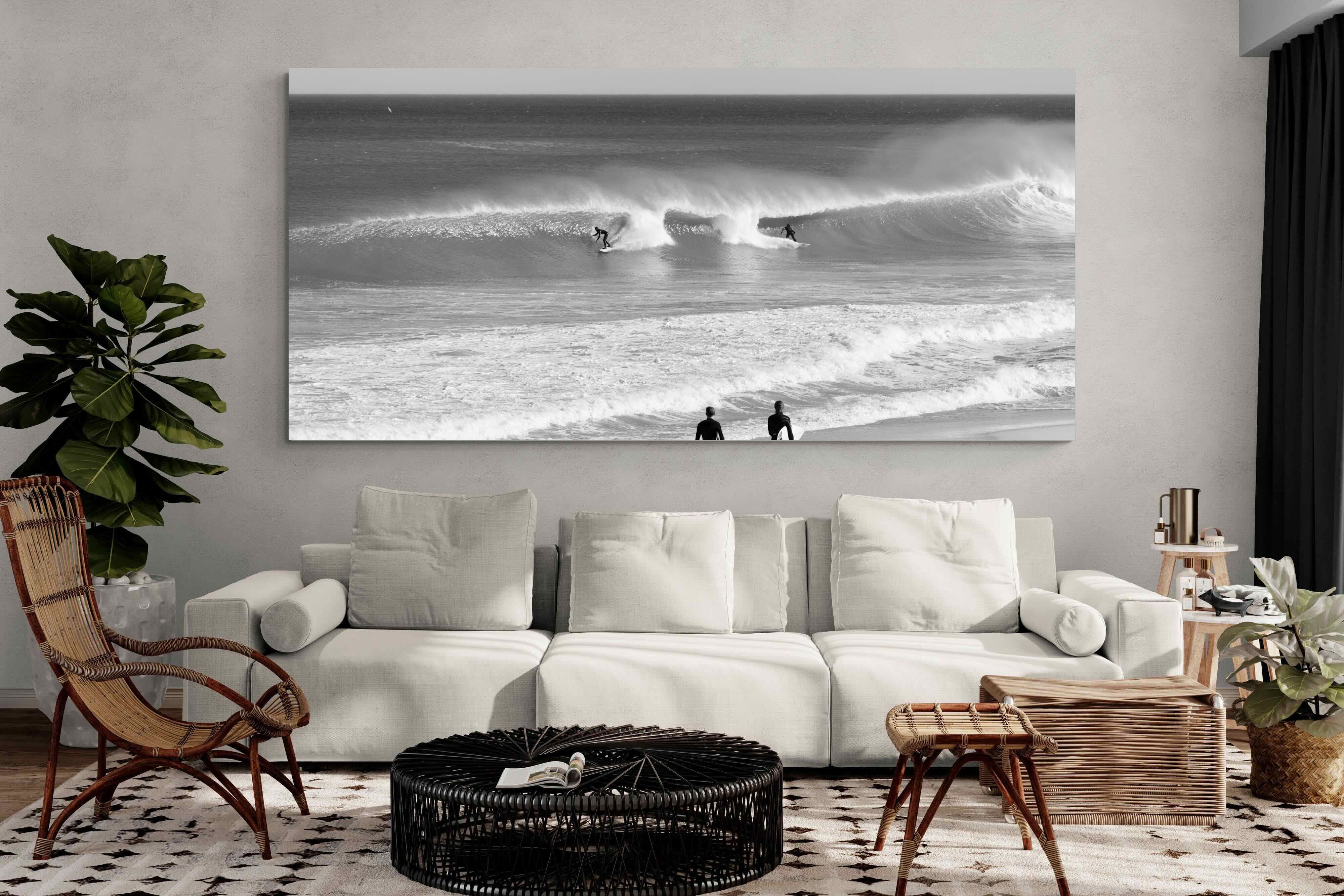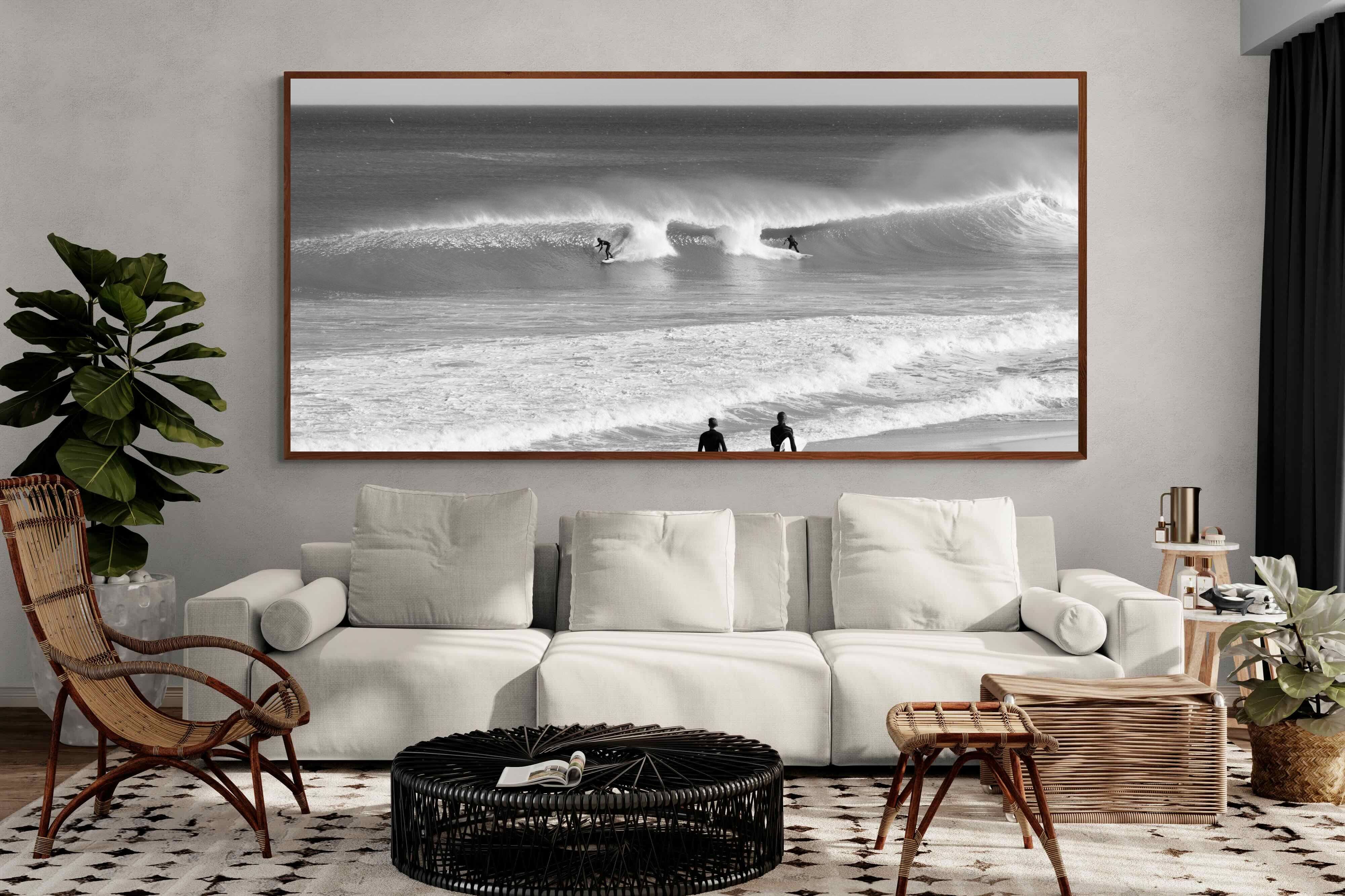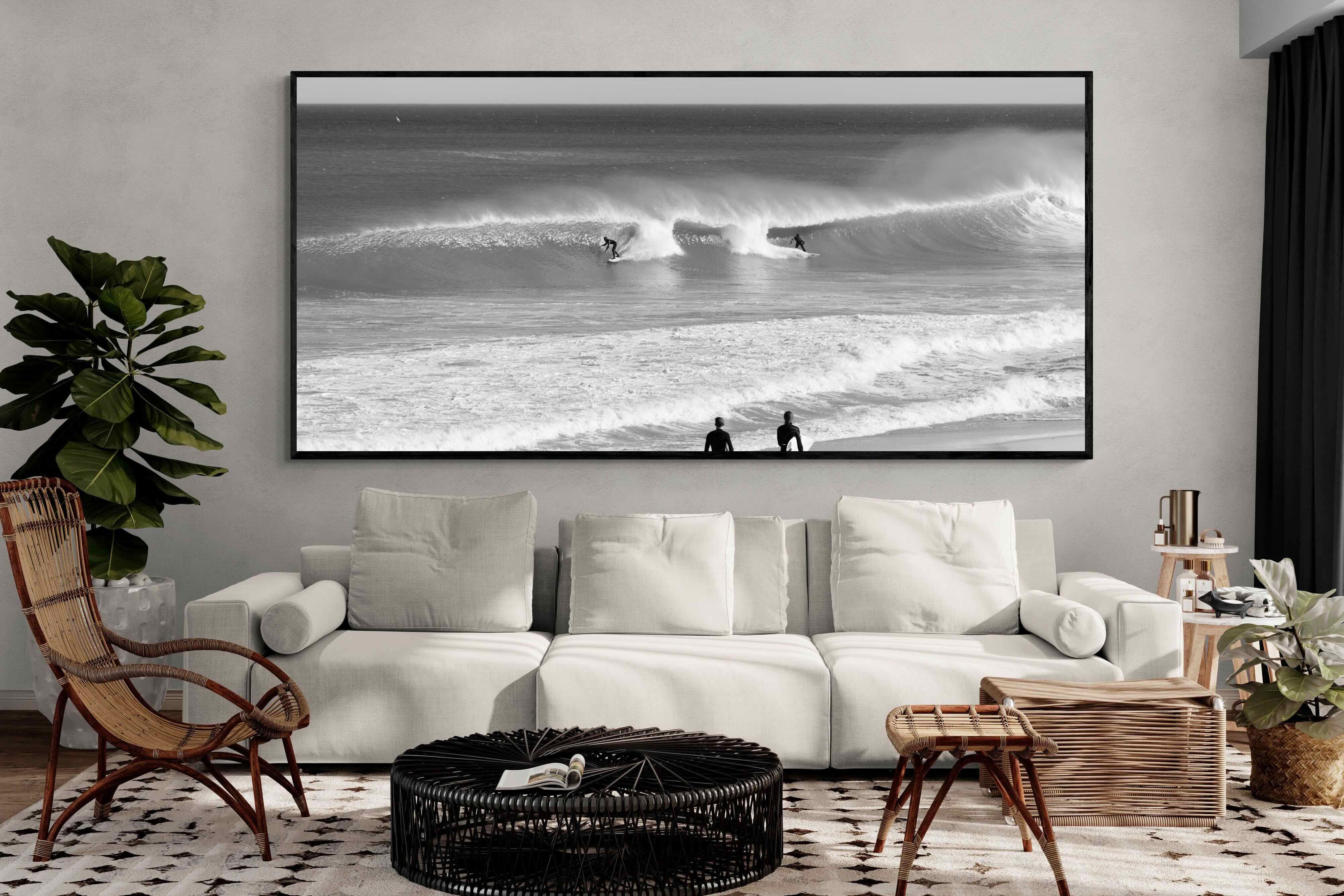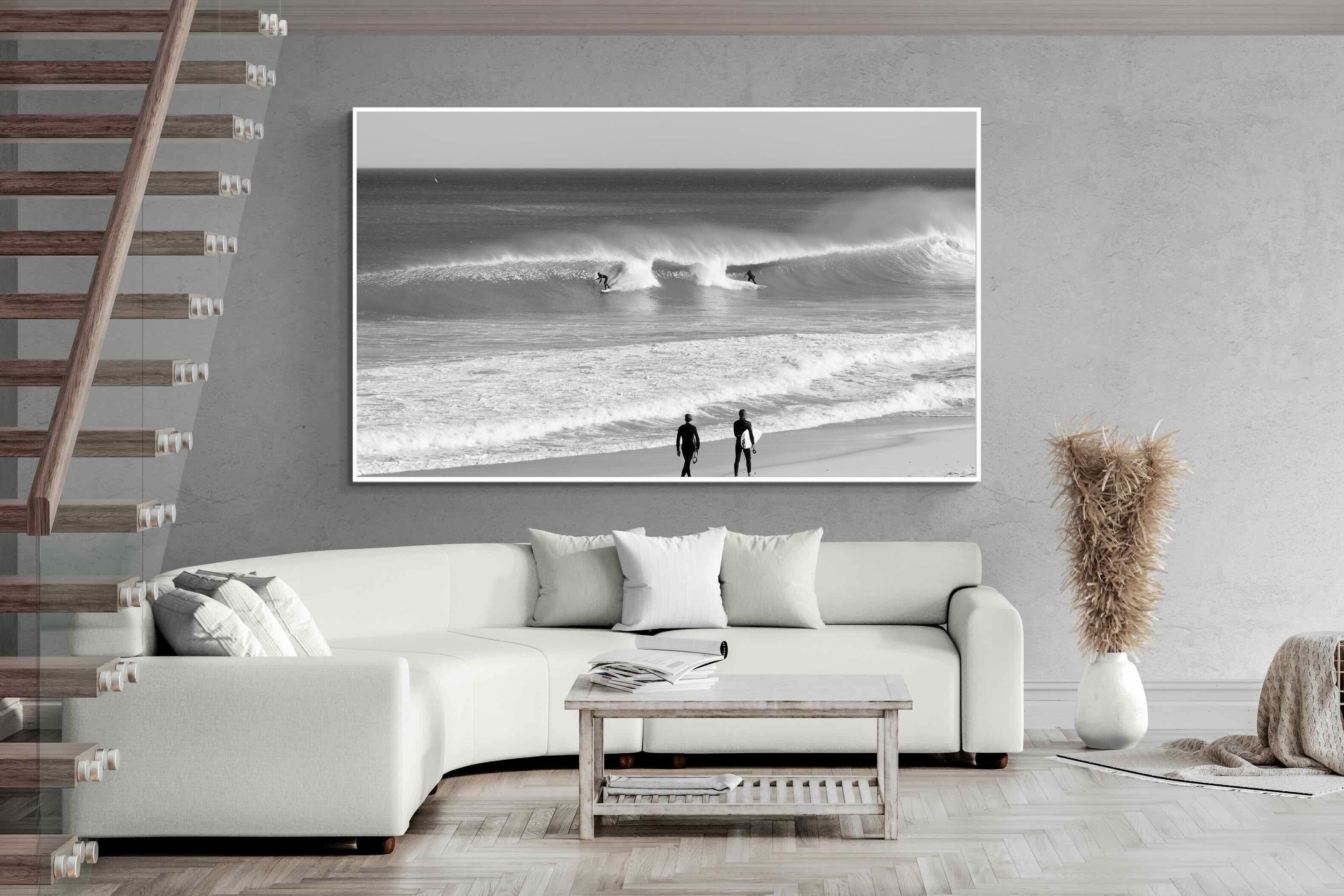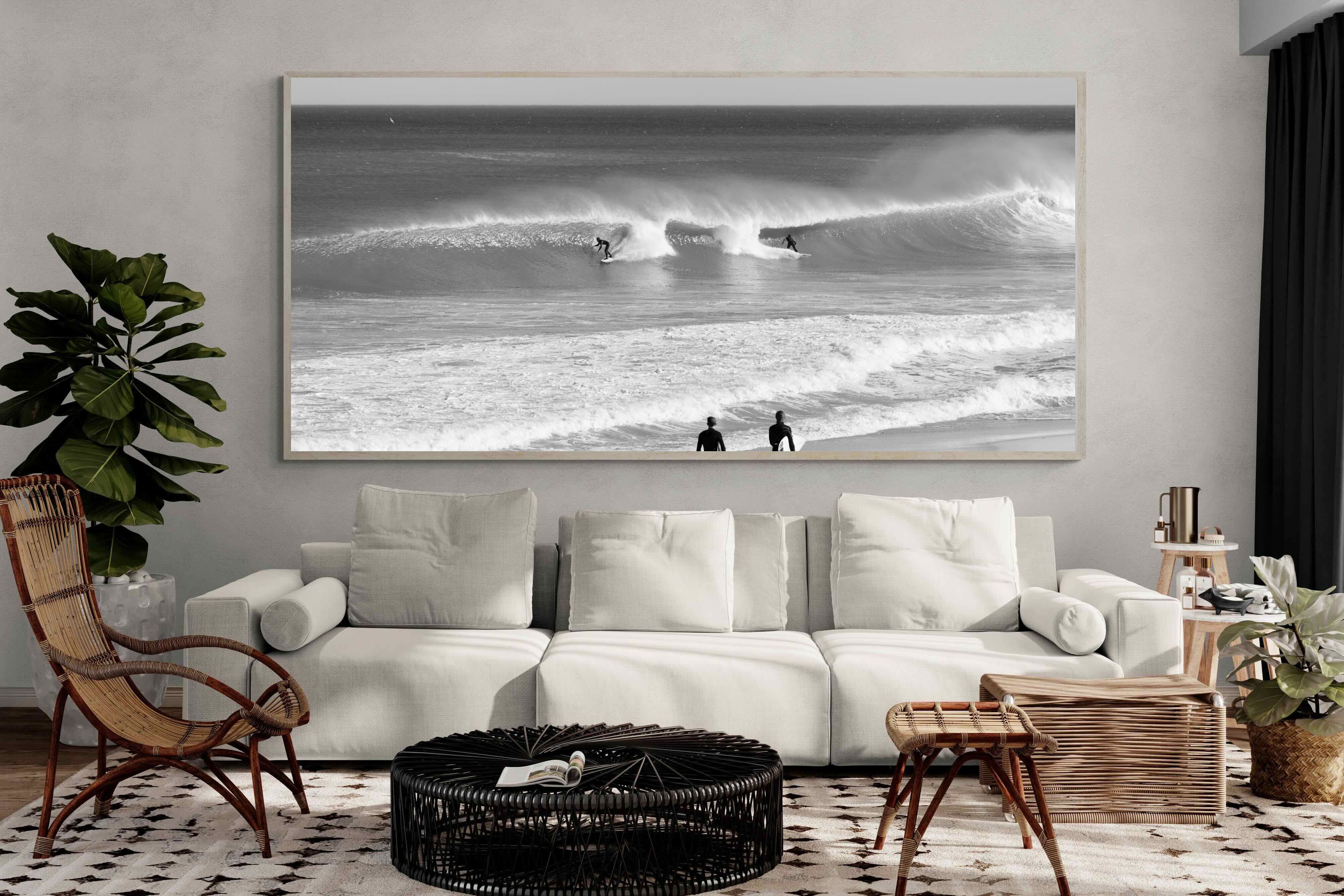 Photographed on the West Coast of Cape Town, this black and white surf scene captures powerful, clean lines as riders carve through rolling Atlantic waves. The contrast between spray, shadow and open horizon creates a bold, graphic composition. Figures on the shoreline add scale and atmosphere, grounding the moment in authentic coastal culture. A dramatic piece suited to modern interiors, surf-inspired spaces and anyone drawn to the rhythm of the ocean.