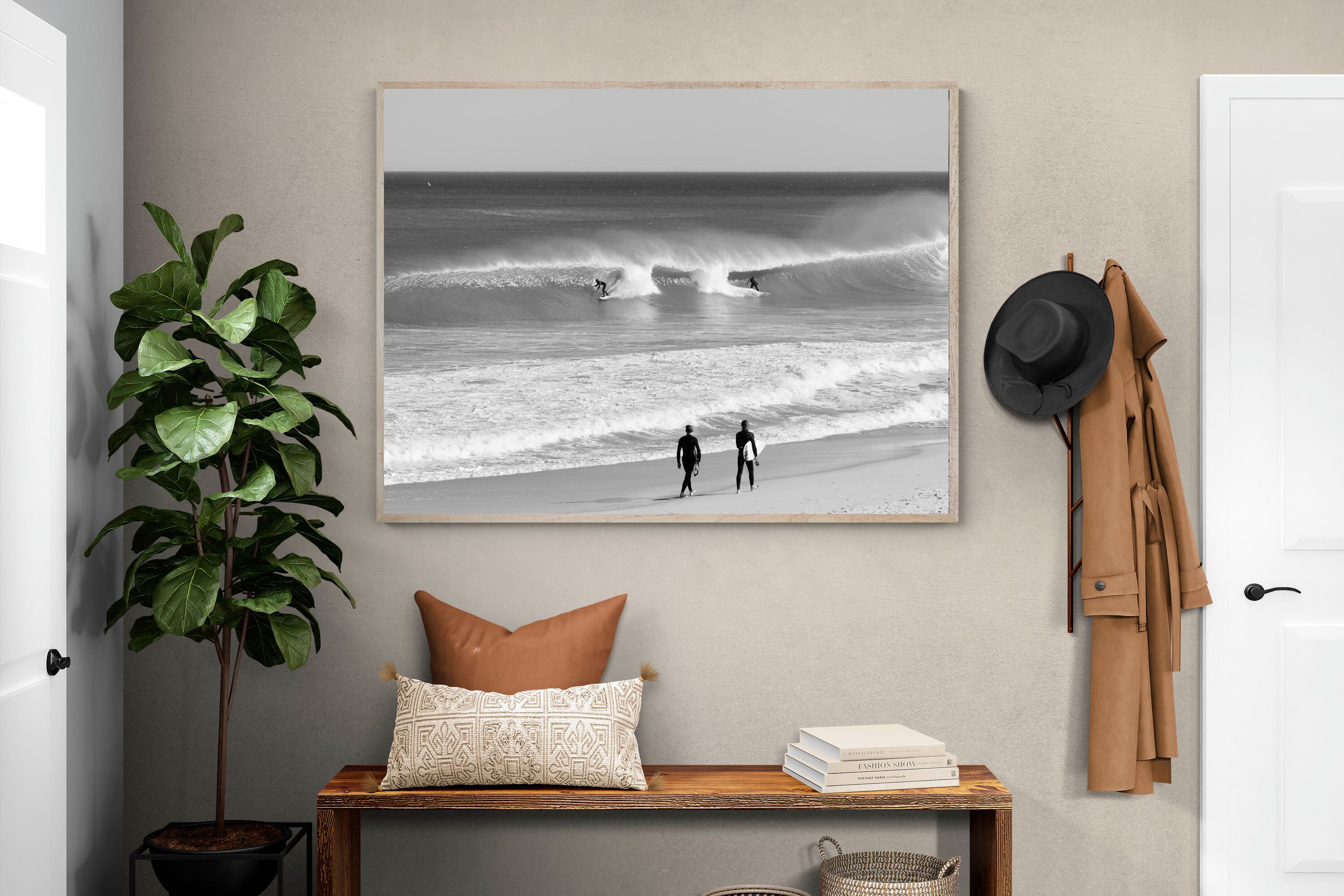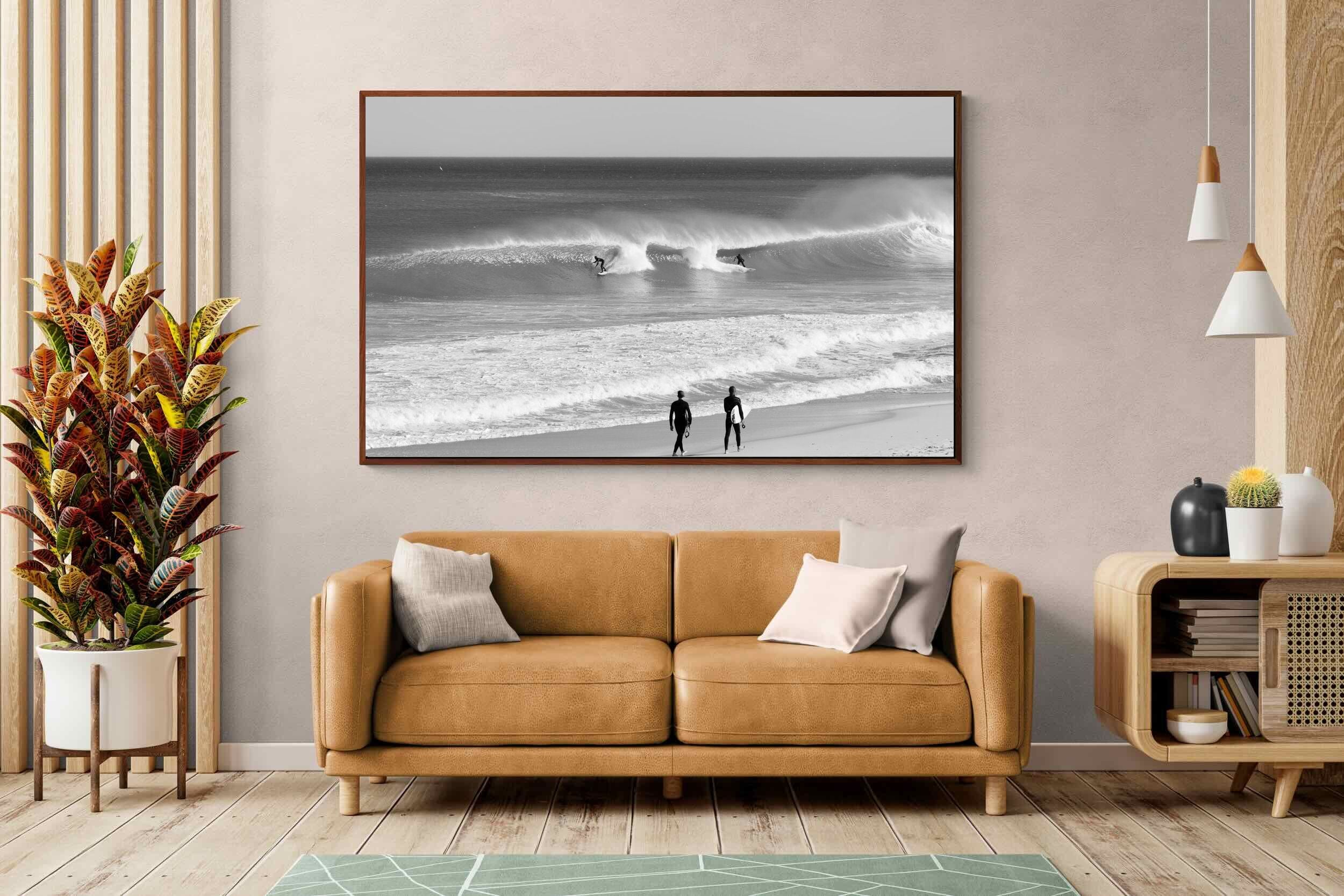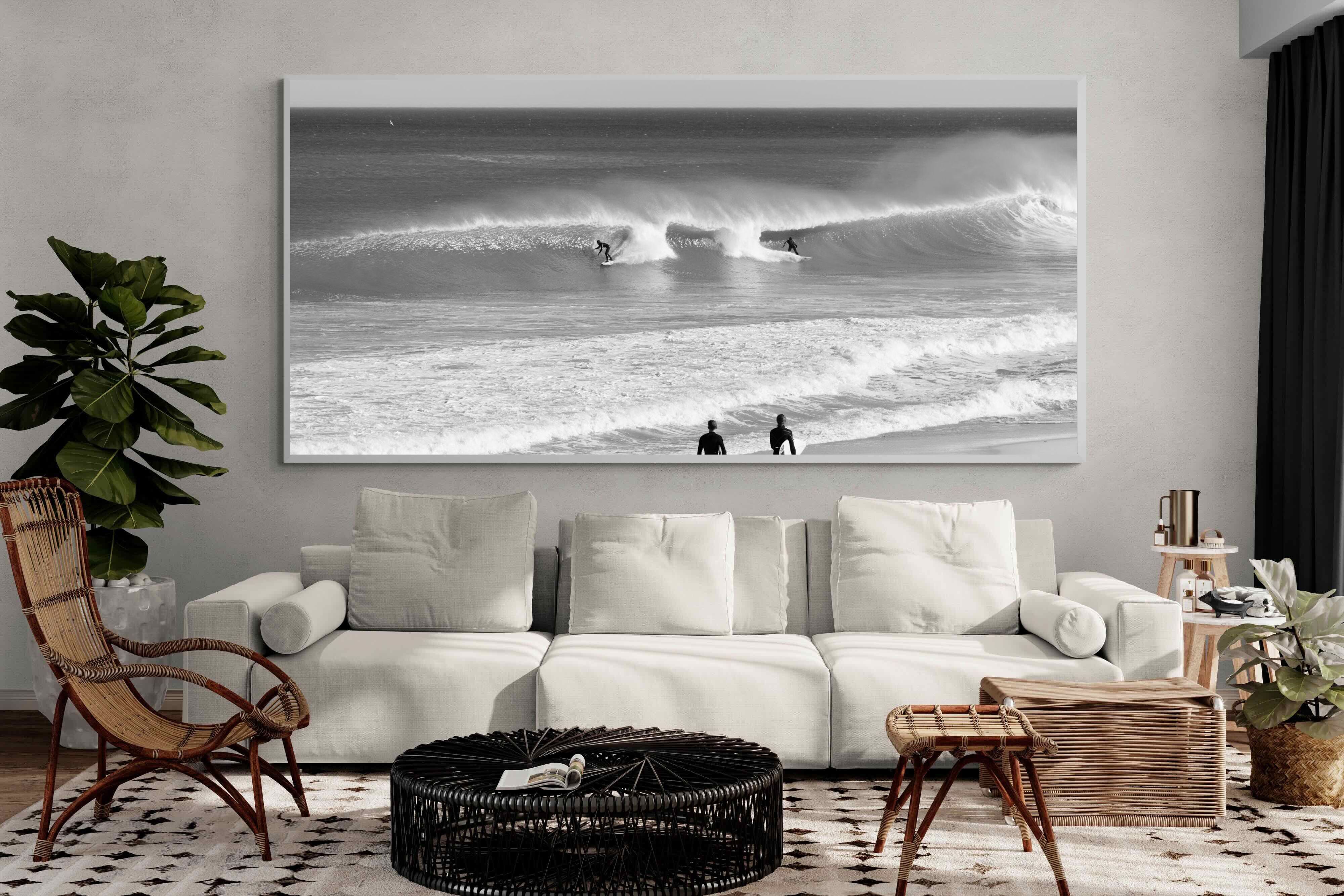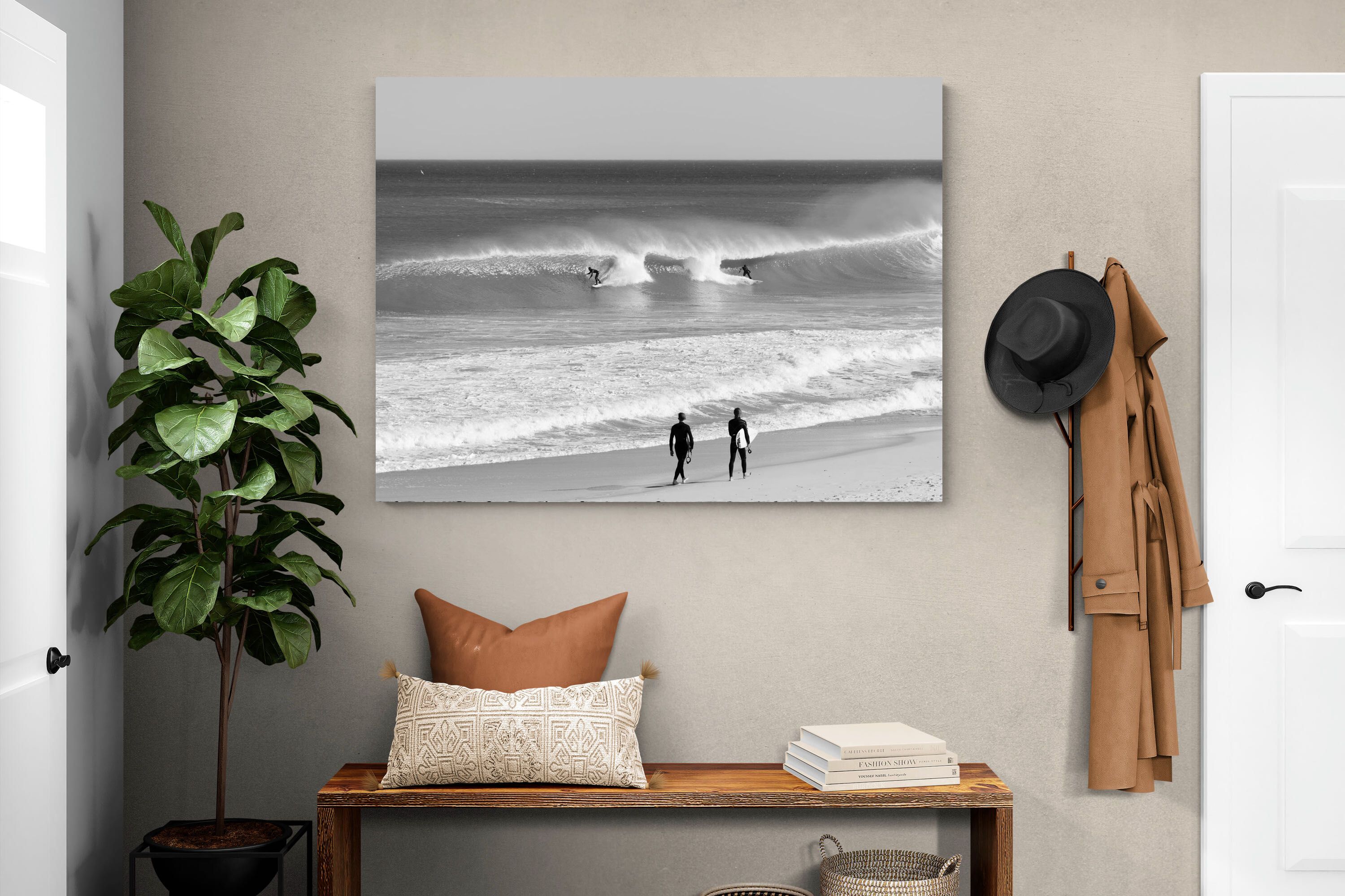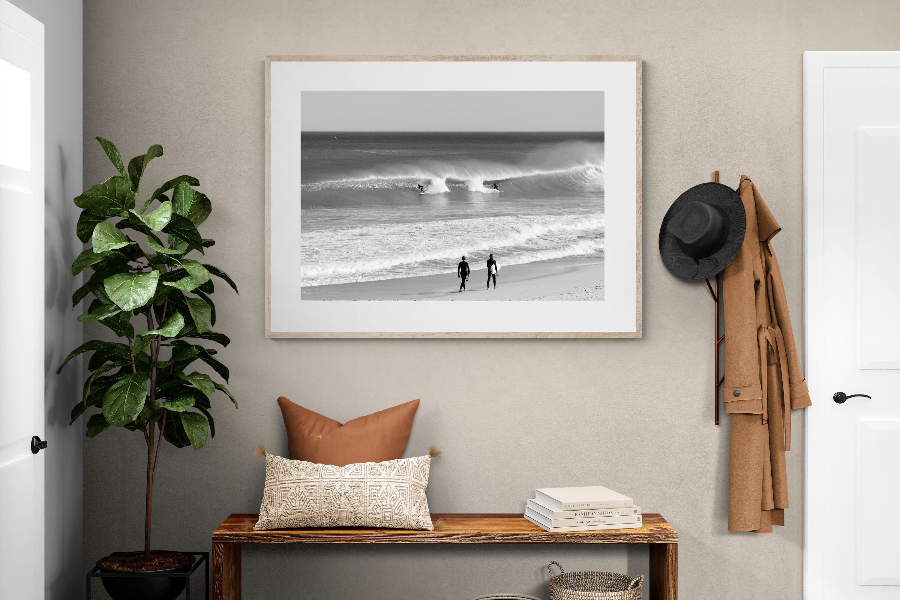 Photographed on the West Coast of Cape Town, this black and white surf scene captures powerful, clean lines as riders carve through rolling Atlantic waves. The contrast between spray, shadow and open horizon creates a bold, graphic composition. Figures on the shoreline add scale and atmosphere, grounding the moment in authentic coastal culture. A dramatic piece suited to modern interiors, surf-inspired spaces and anyone drawn to the rhythm of the ocean.