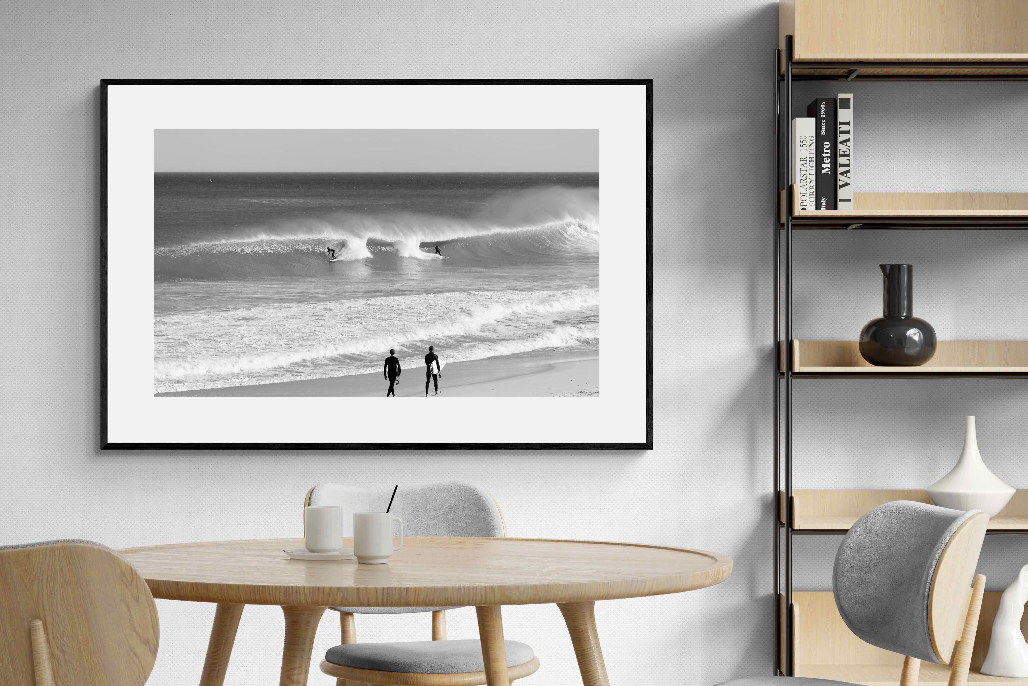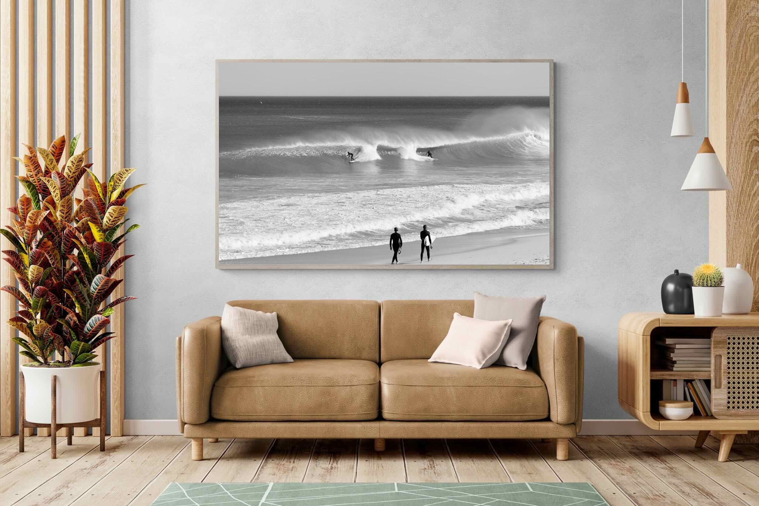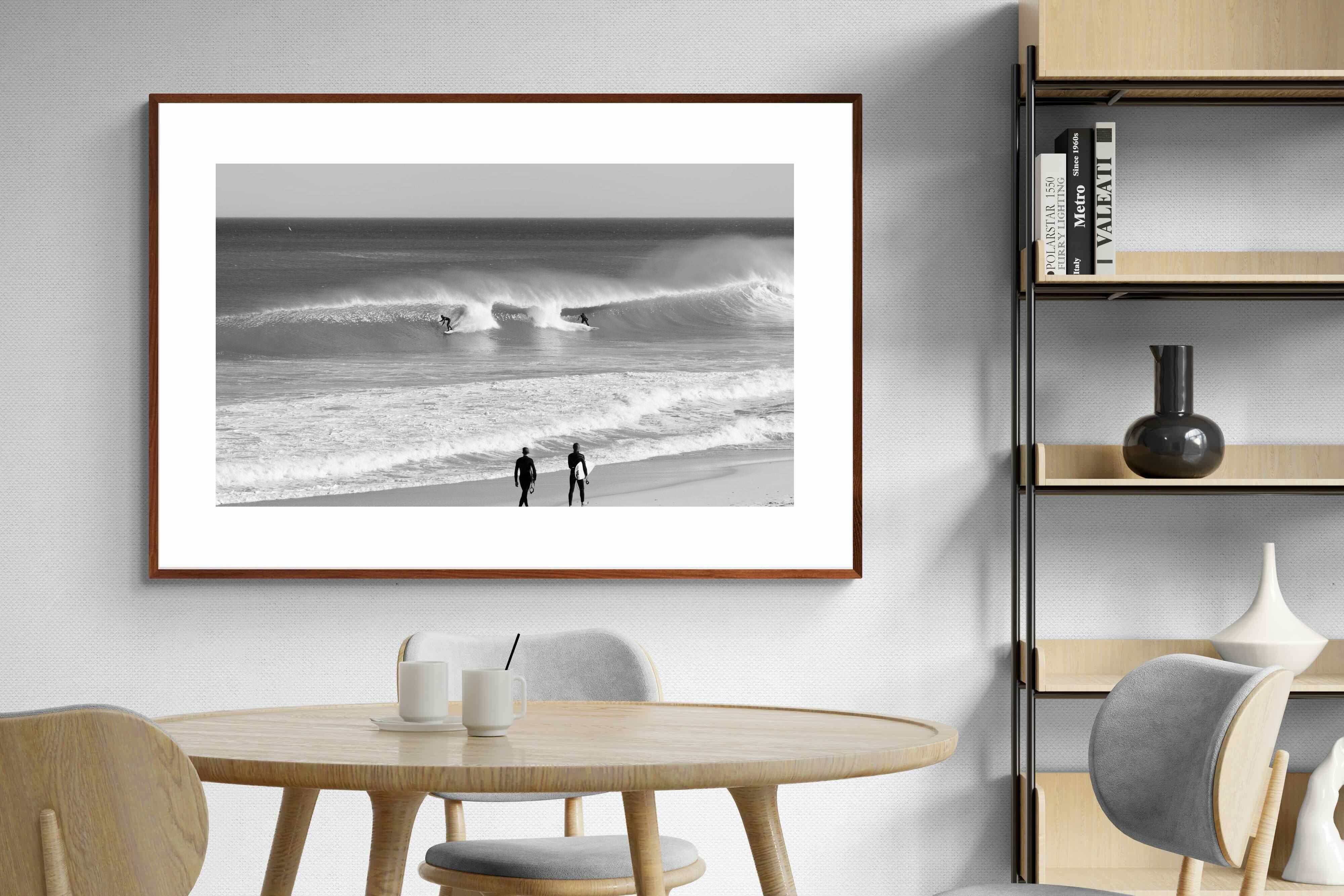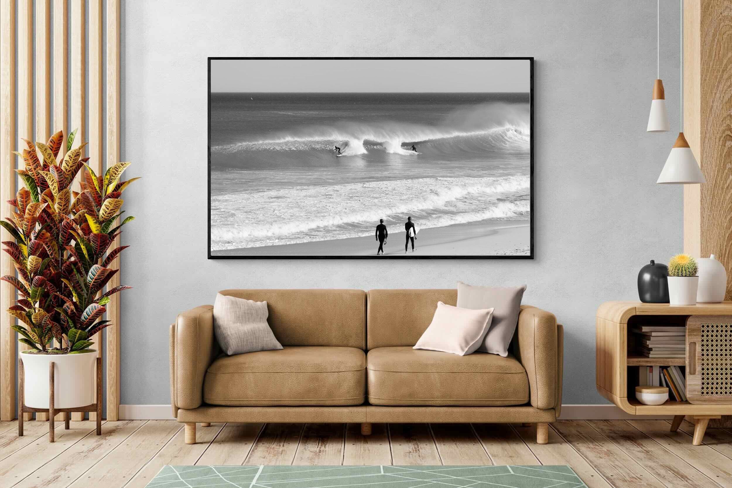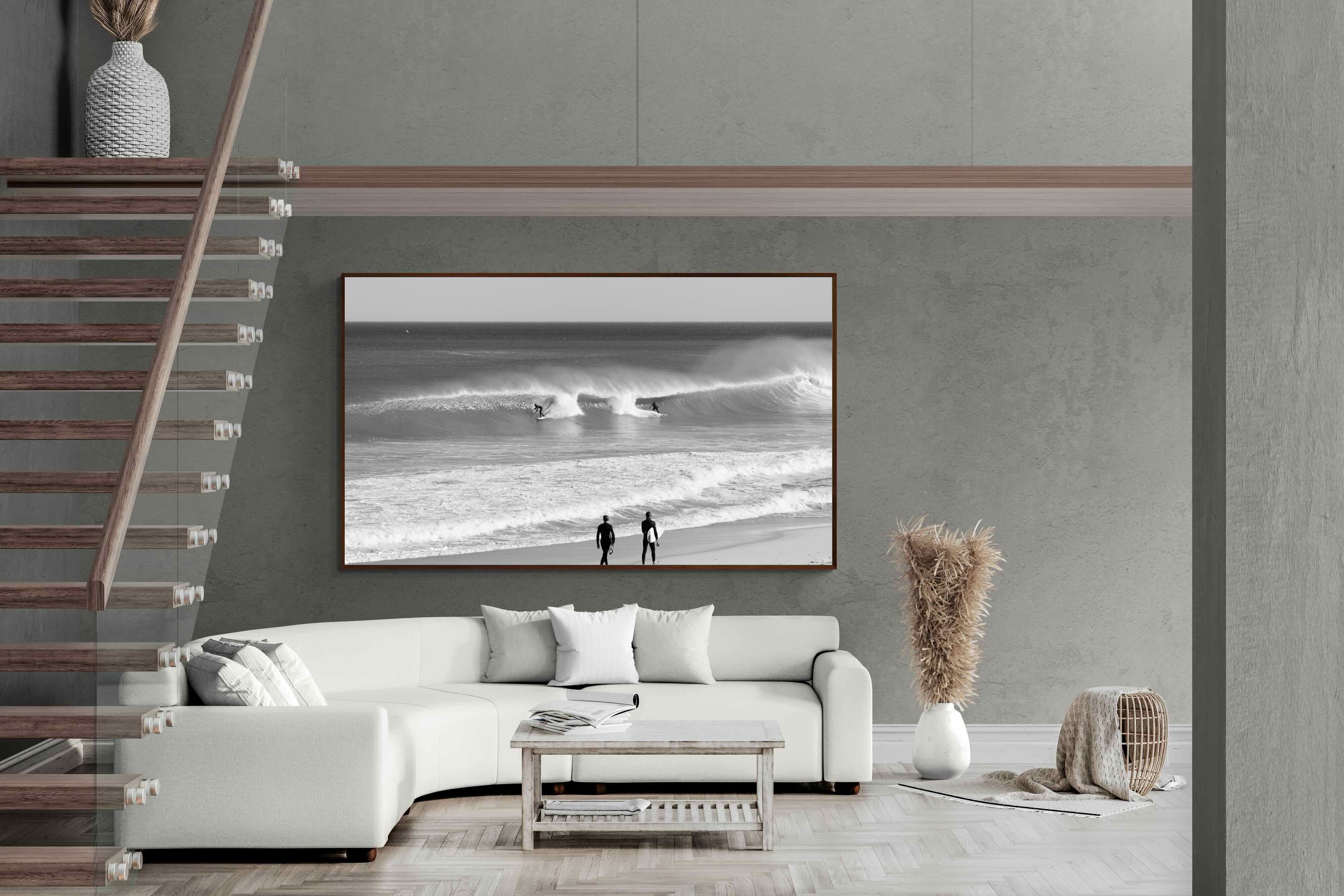 Photographed on the West Coast of Cape Town, this black and white surf scene captures powerful, clean lines as riders carve through rolling Atlantic waves. The contrast between spray, shadow and open horizon creates a bold, graphic composition. Figures on the shoreline add scale and atmosphere, grounding the moment in authentic coastal culture. A dramatic piece suited to modern interiors, surf-inspired spaces and anyone drawn to the rhythm of the ocean.