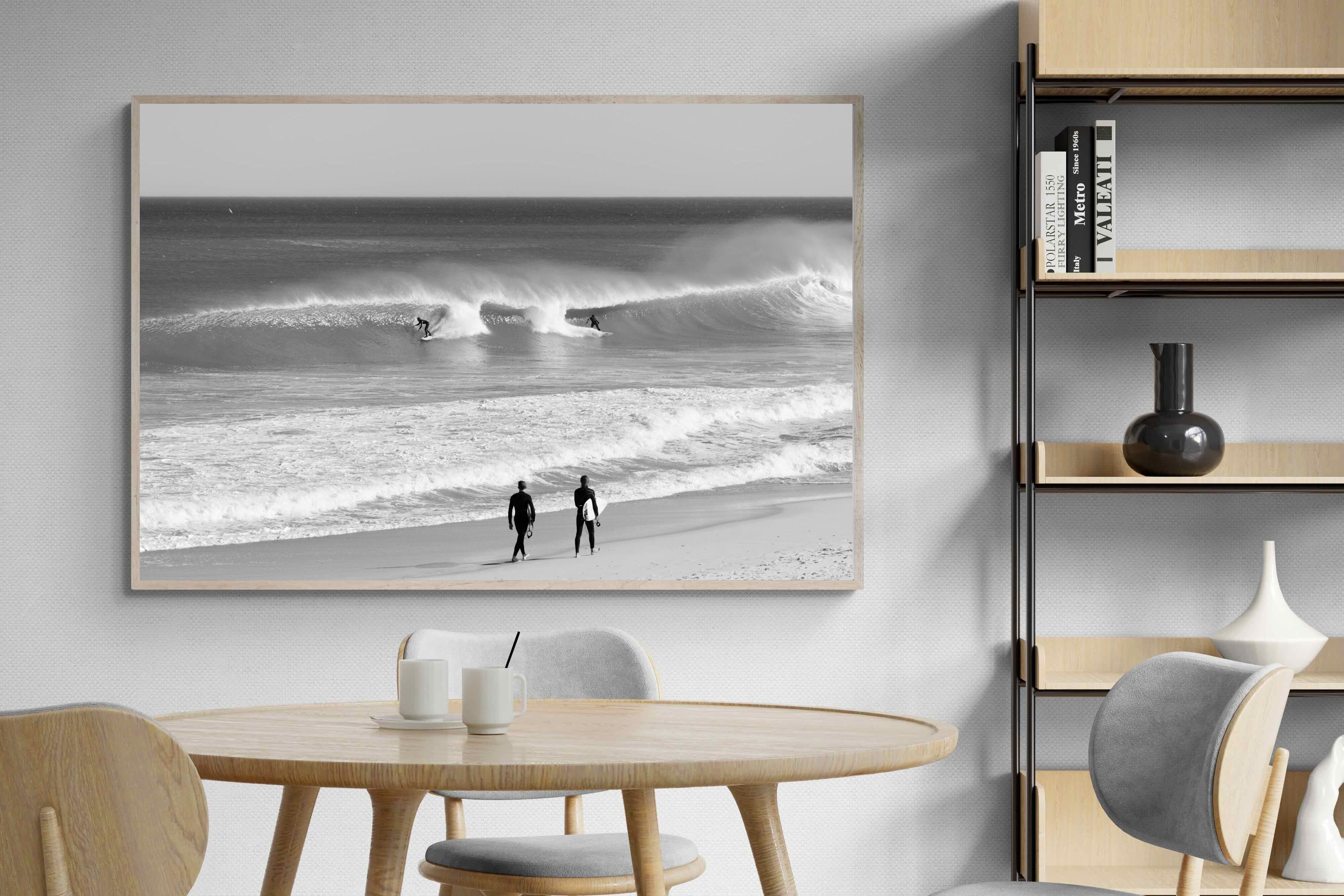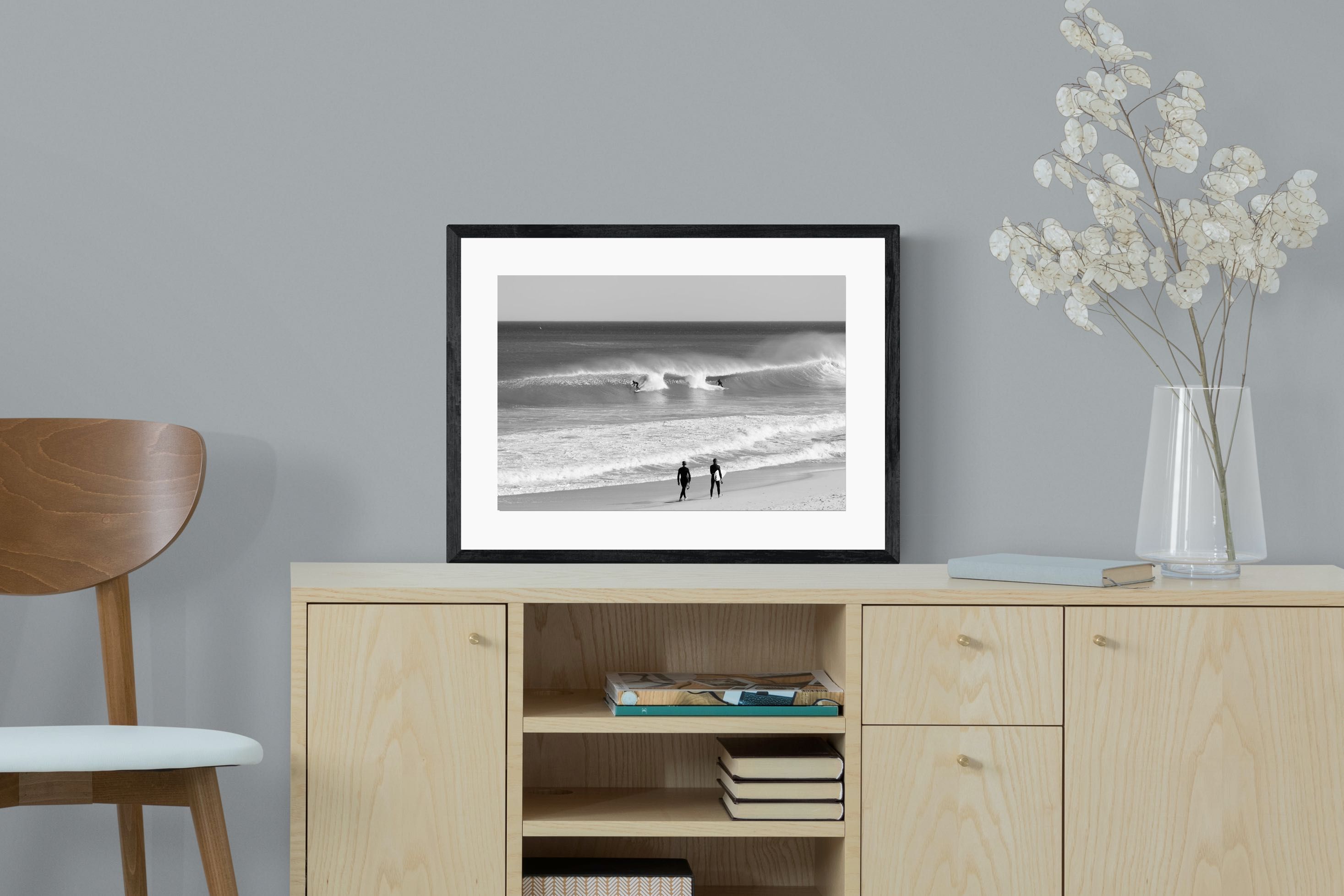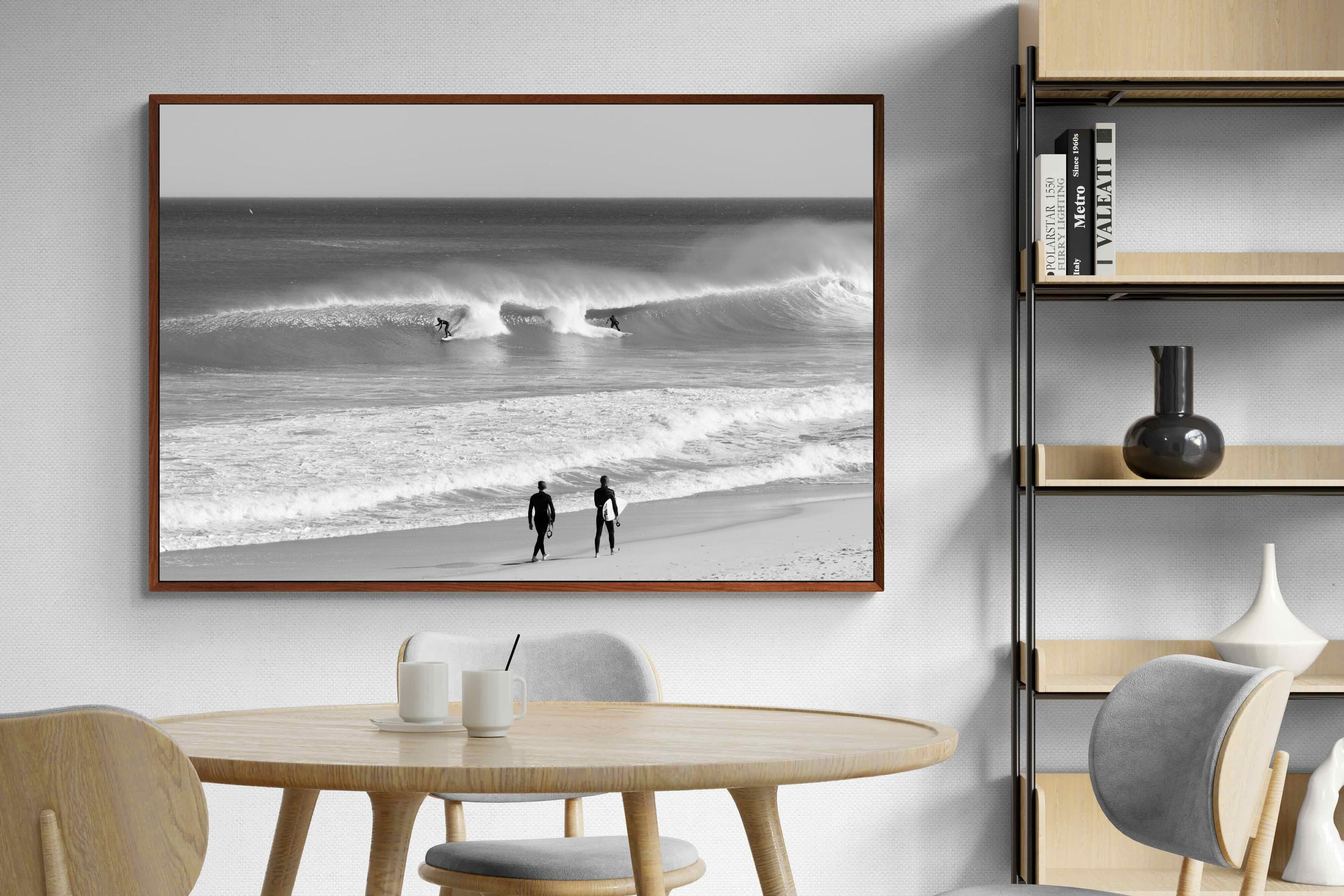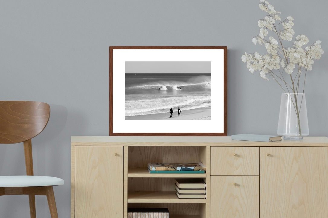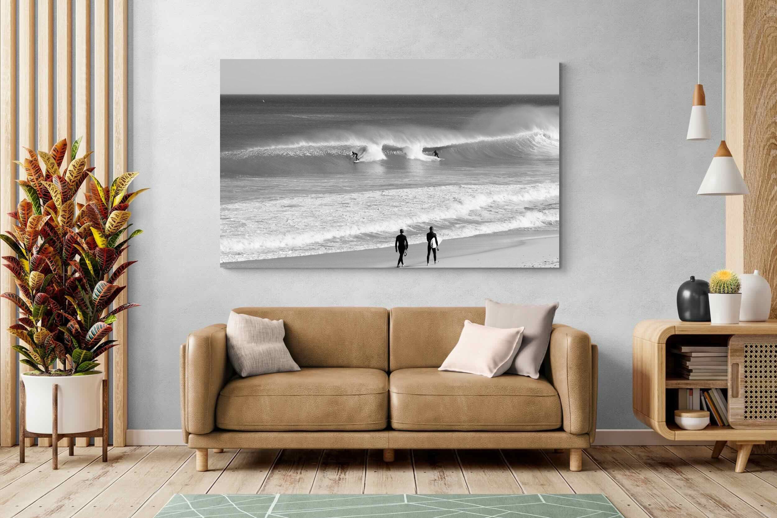 Photographed on the West Coast of Cape Town, this black and white surf scene captures powerful, clean lines as riders carve through rolling Atlantic waves. The contrast between spray, shadow and open horizon creates a bold, graphic composition. Figures on the shoreline add scale and atmosphere, grounding the moment in authentic coastal culture. A dramatic piece suited to modern interiors, surf-inspired spaces and anyone drawn to the rhythm of the ocean.