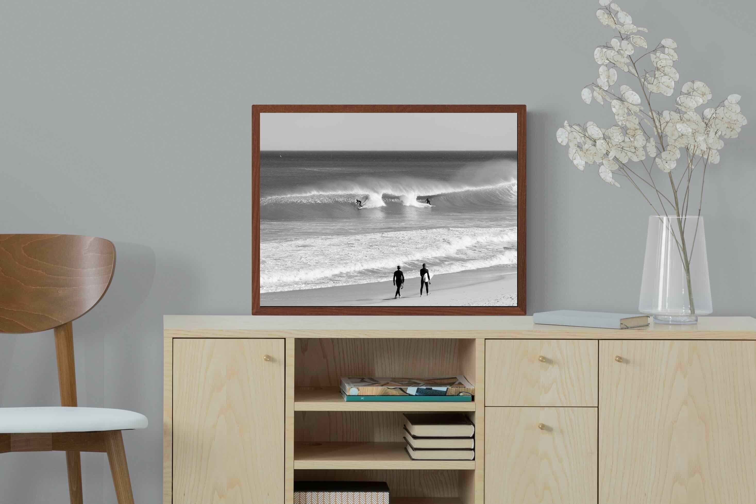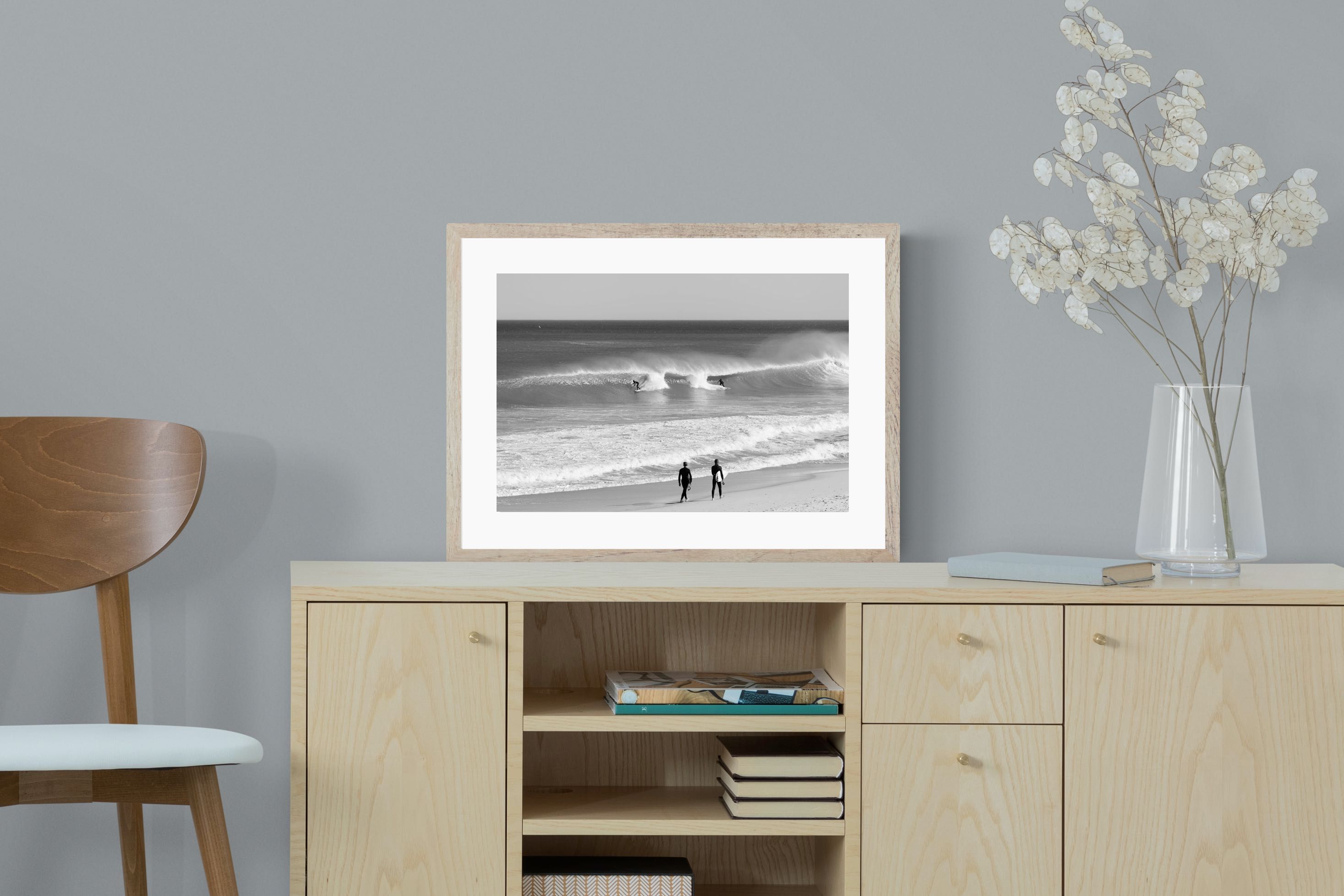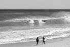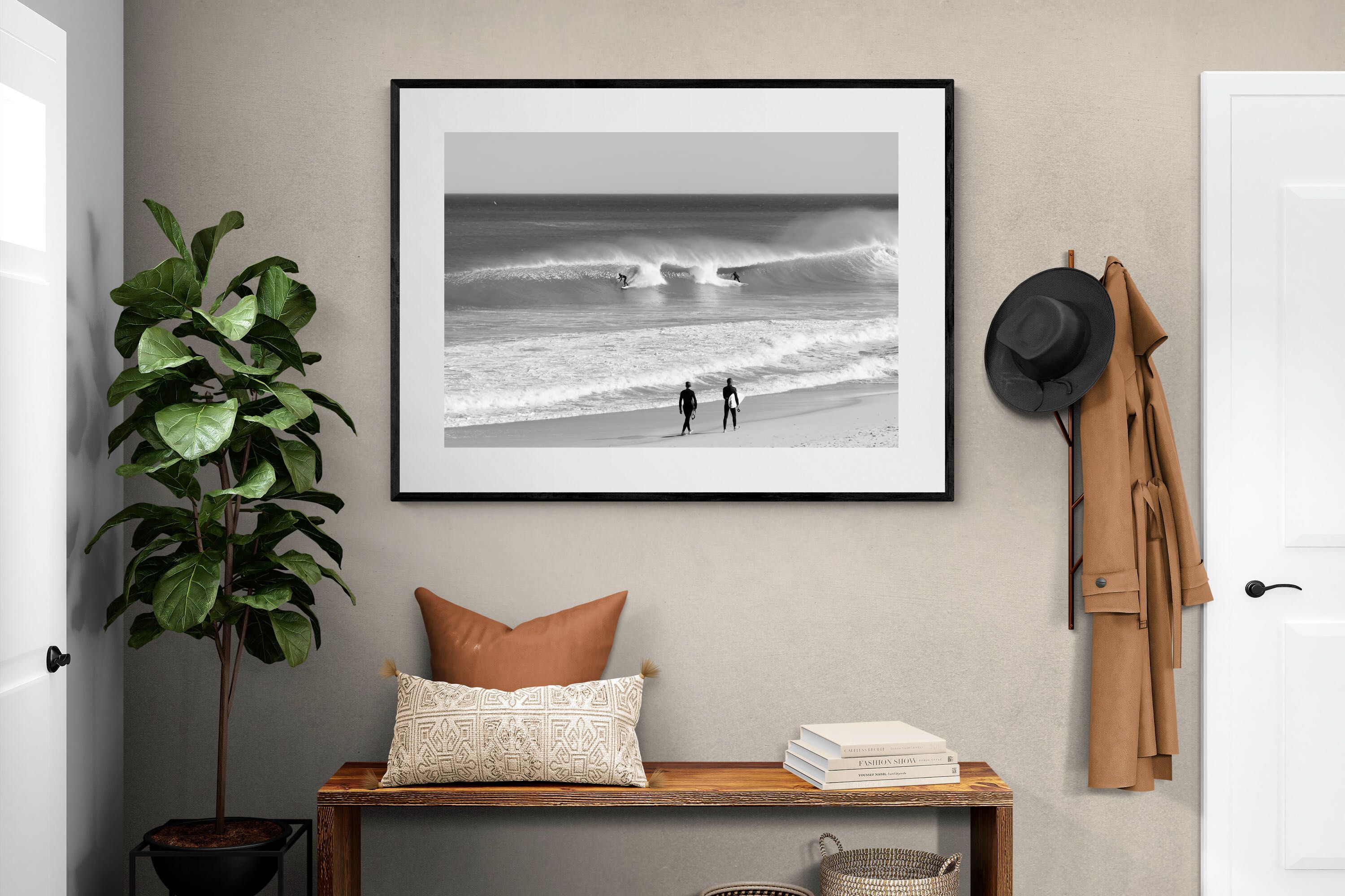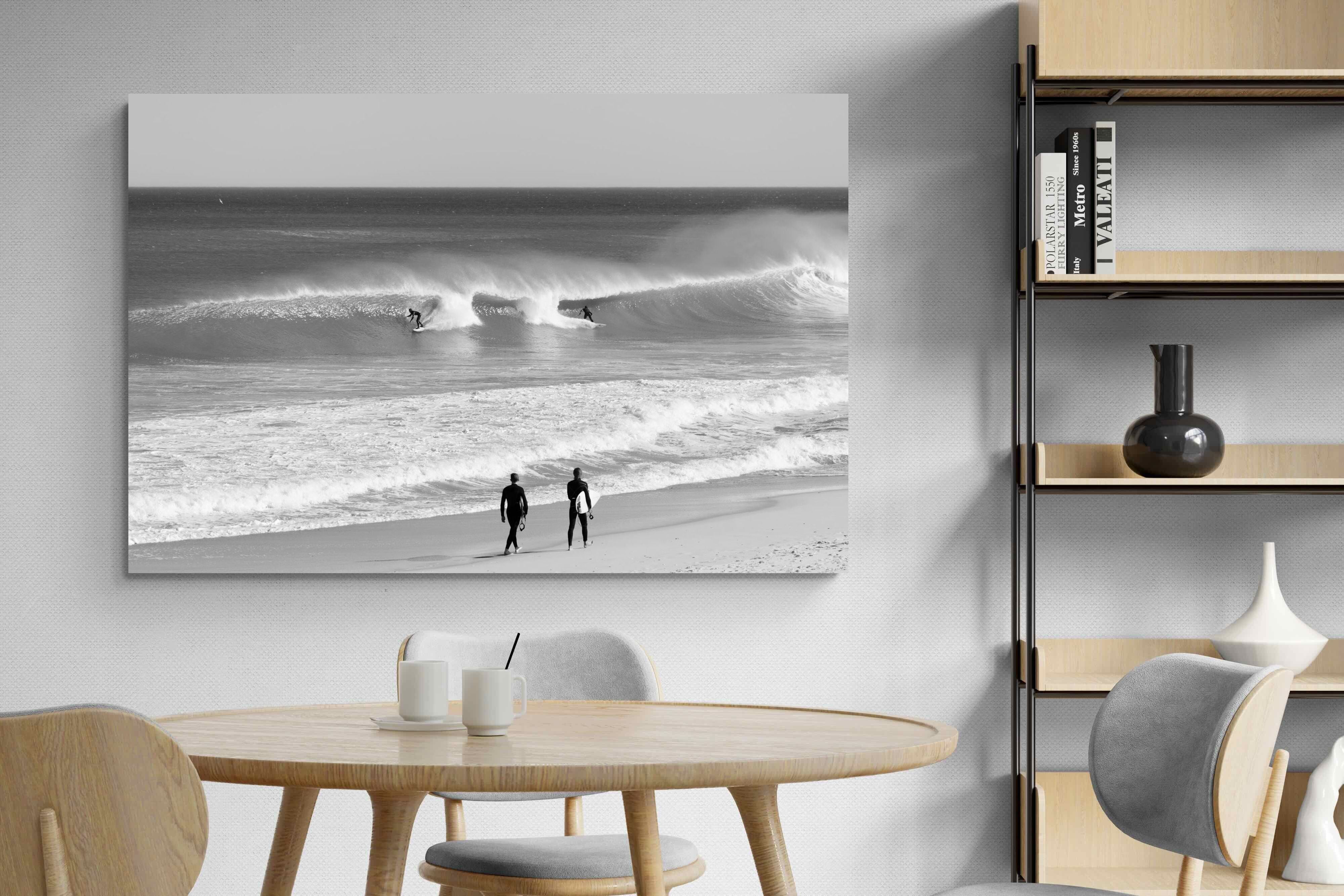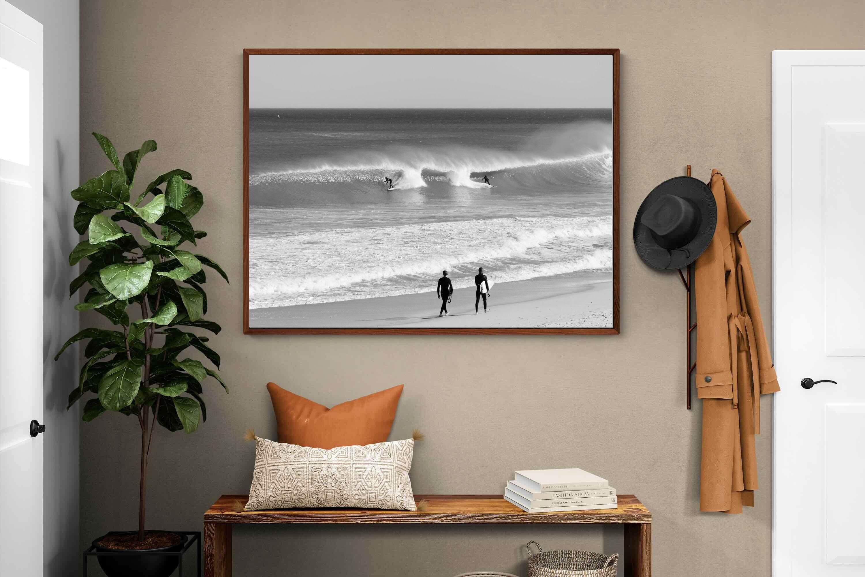 Photographed on the West Coast of Cape Town, this black and white surf scene captures powerful, clean lines as riders carve through rolling Atlantic waves. The contrast between spray, shadow and open horizon creates a bold, graphic composition. Figures on the shoreline add scale and atmosphere, grounding the moment in authentic coastal culture. A dramatic piece suited to modern interiors, surf-inspired spaces and anyone drawn to the rhythm of the ocean.