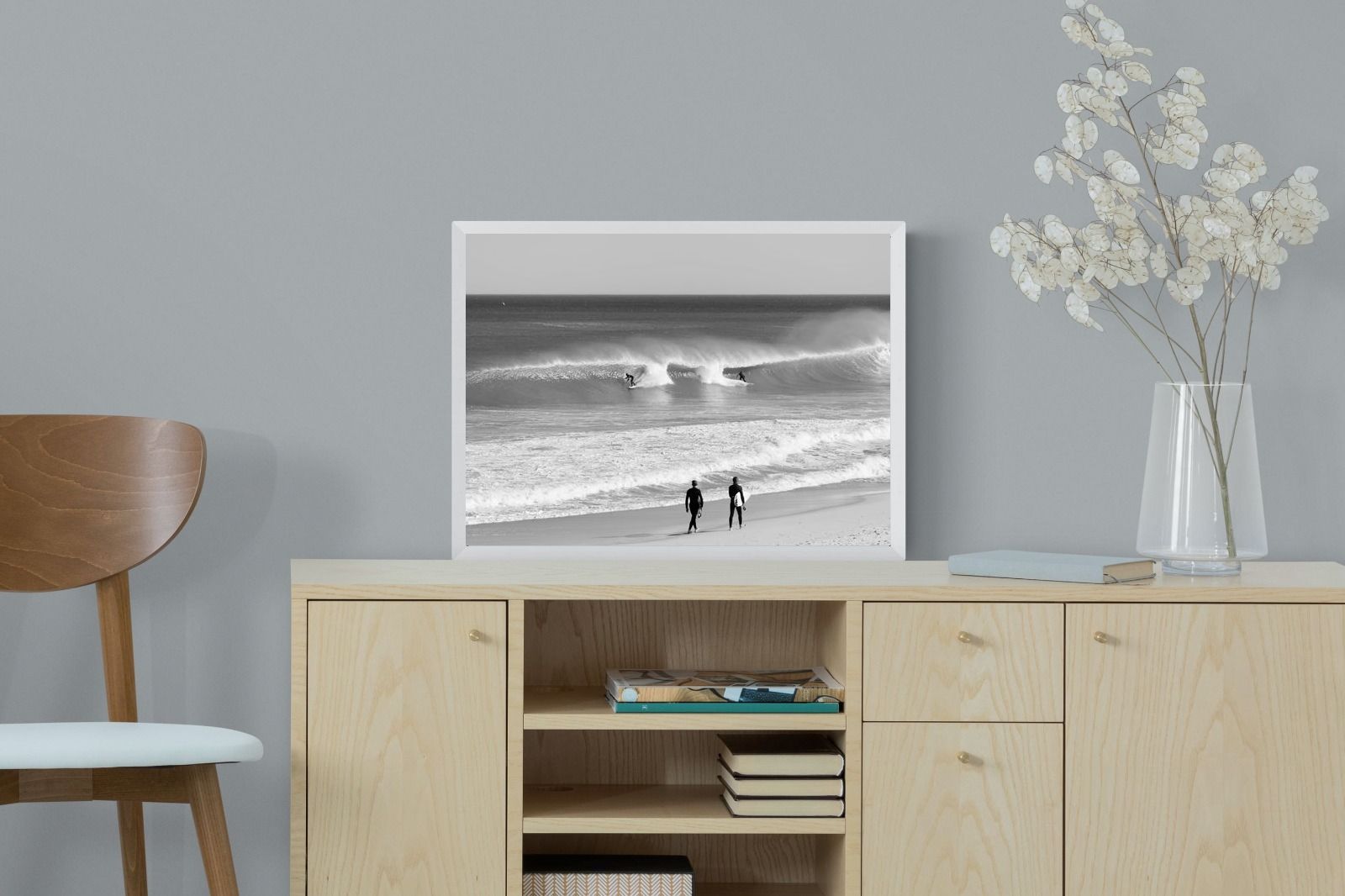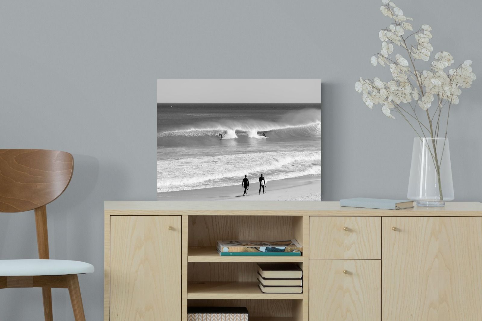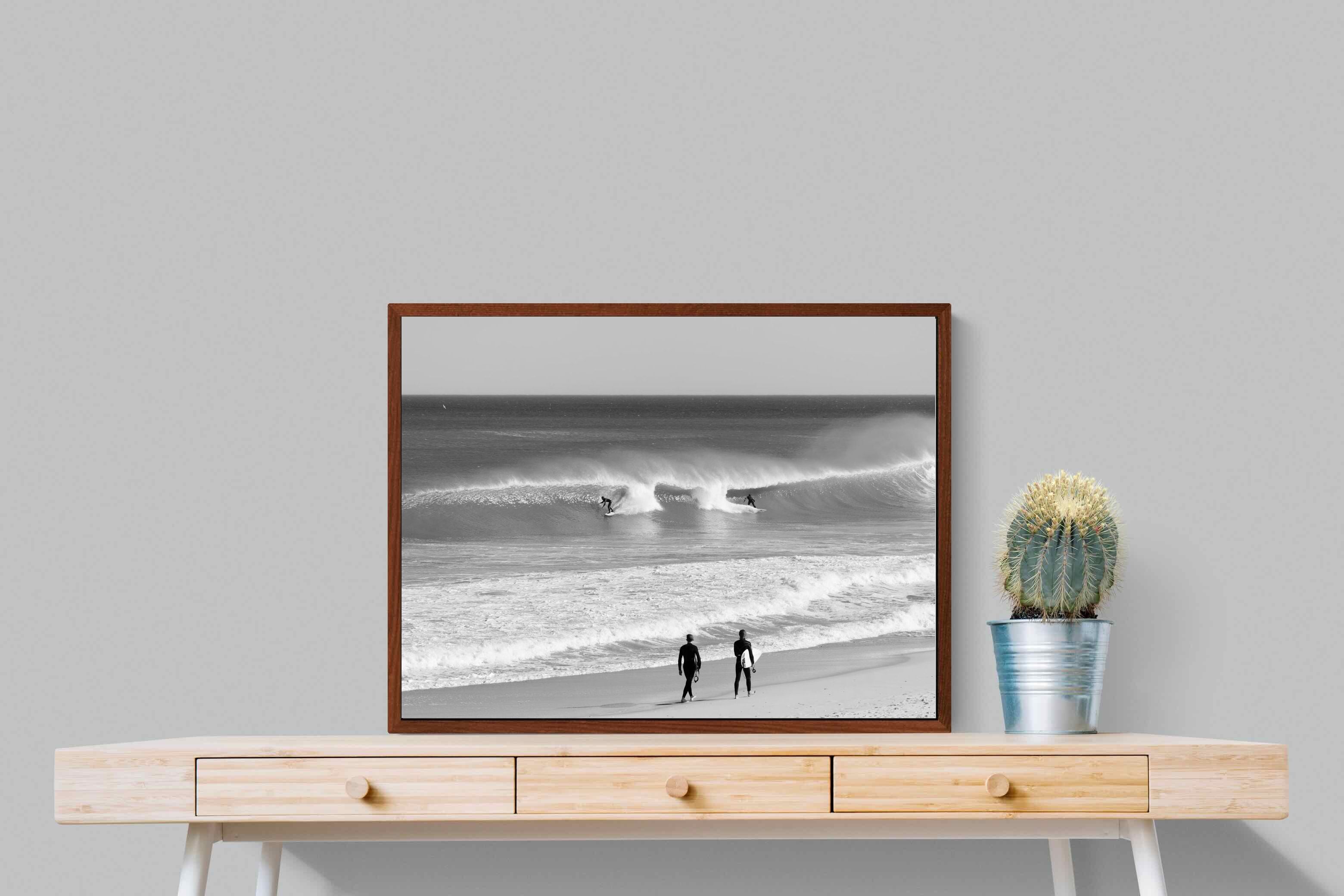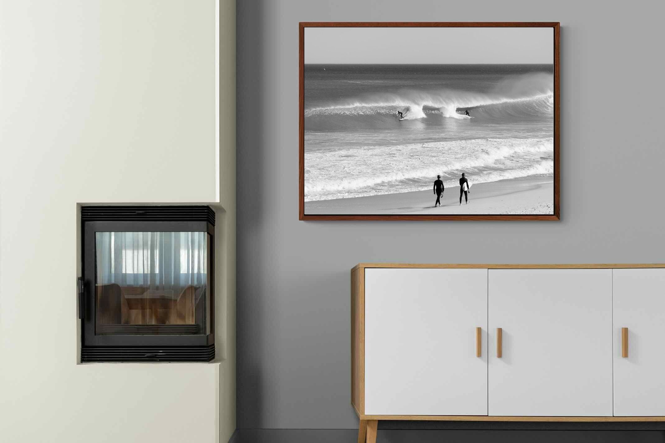 Photographed on the West Coast of Cape Town, this black and white surf scene captures powerful, clean lines as riders carve through rolling Atlantic waves. The contrast between spray, shadow and open horizon creates a bold, graphic composition. Figures on the shoreline add scale and atmosphere, grounding the moment in authentic coastal culture. A dramatic piece suited to modern interiors, surf-inspired spaces and anyone drawn to the rhythm of the ocean.