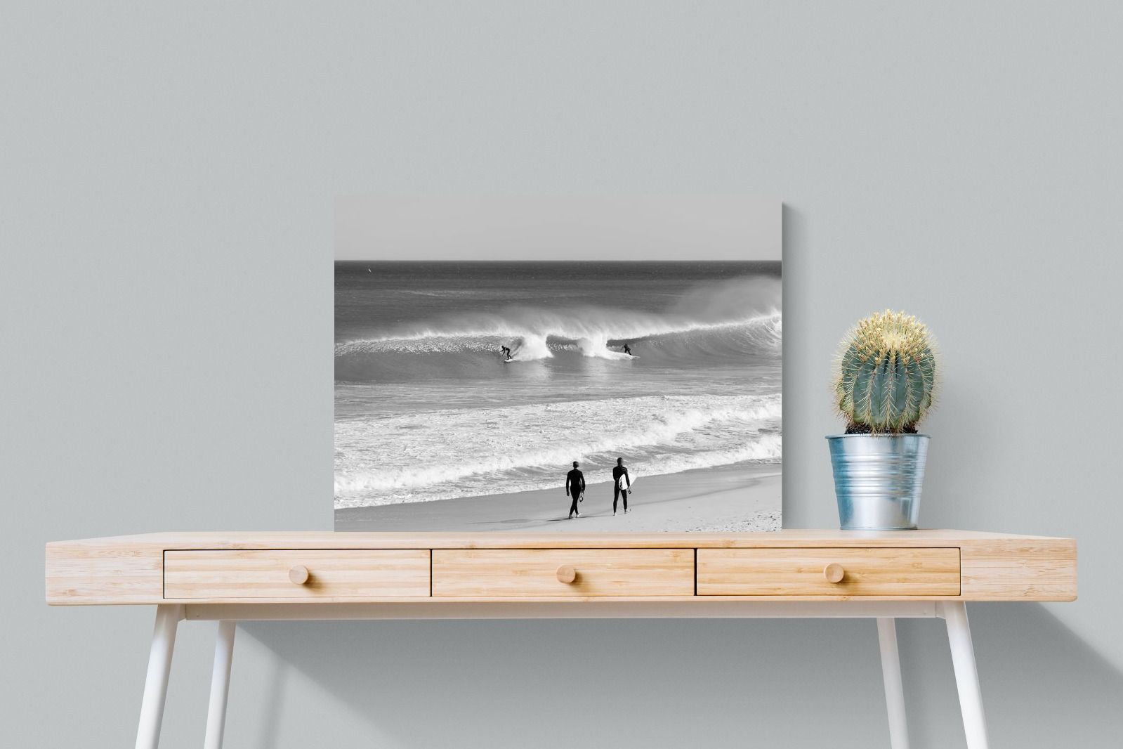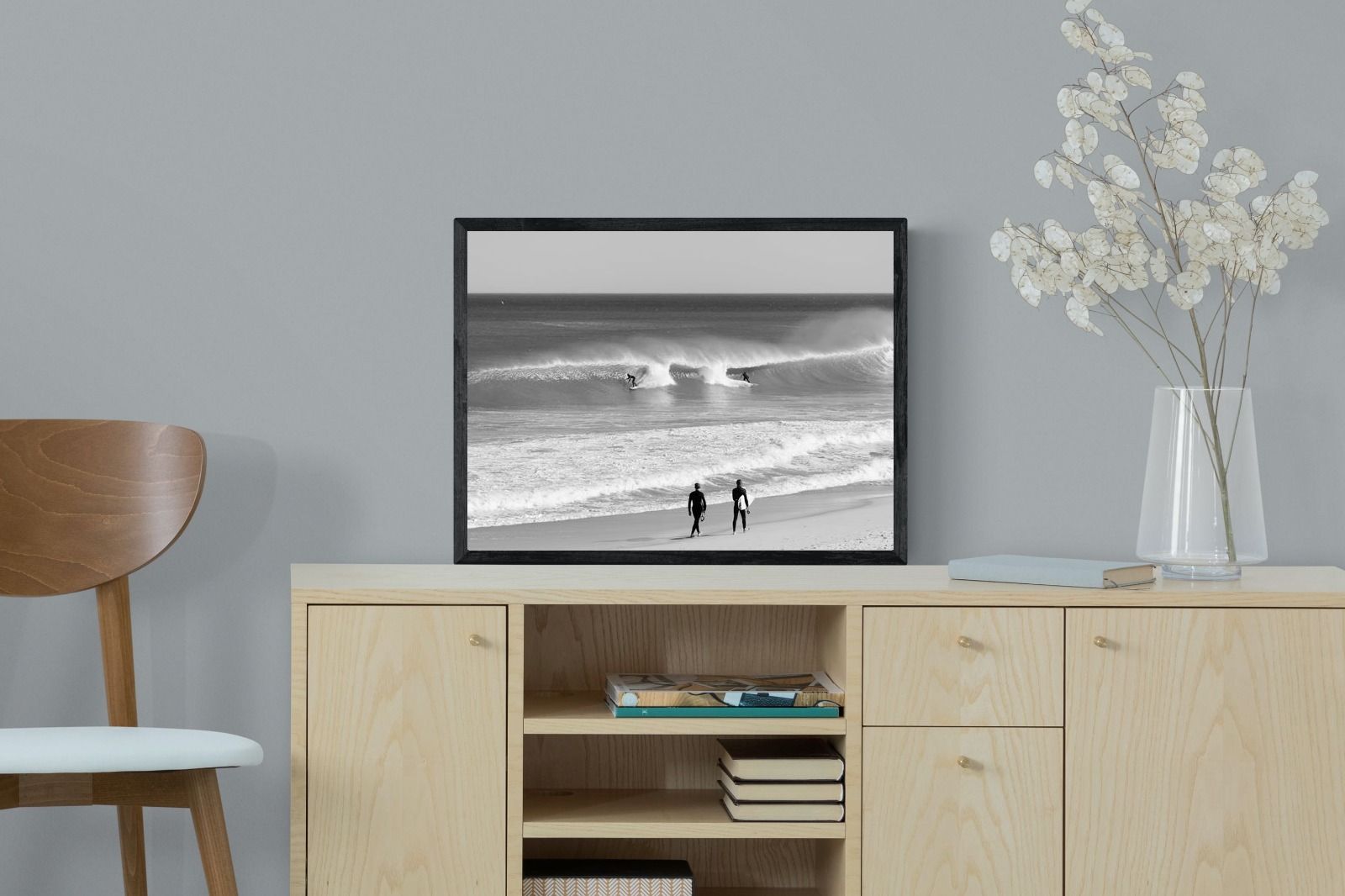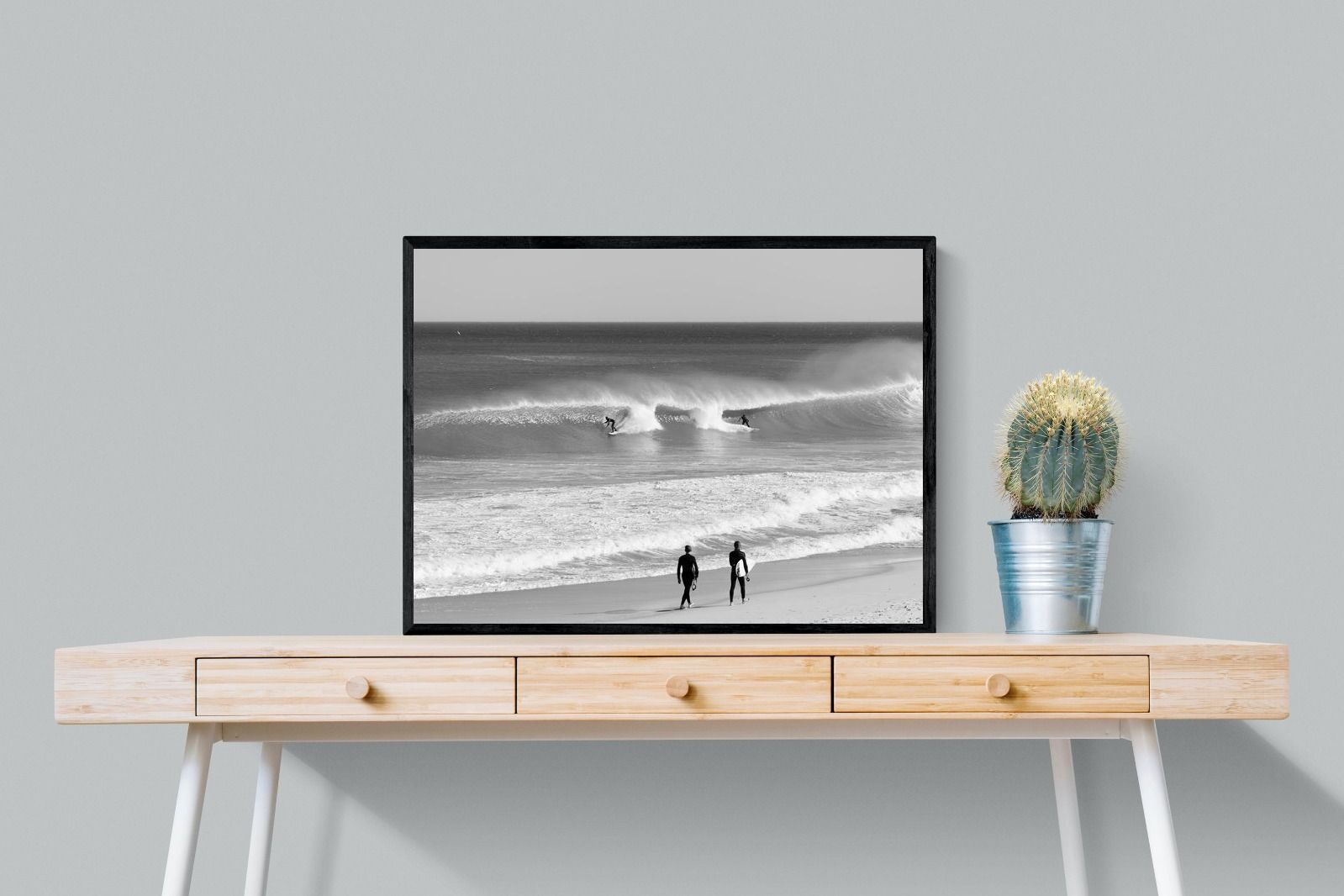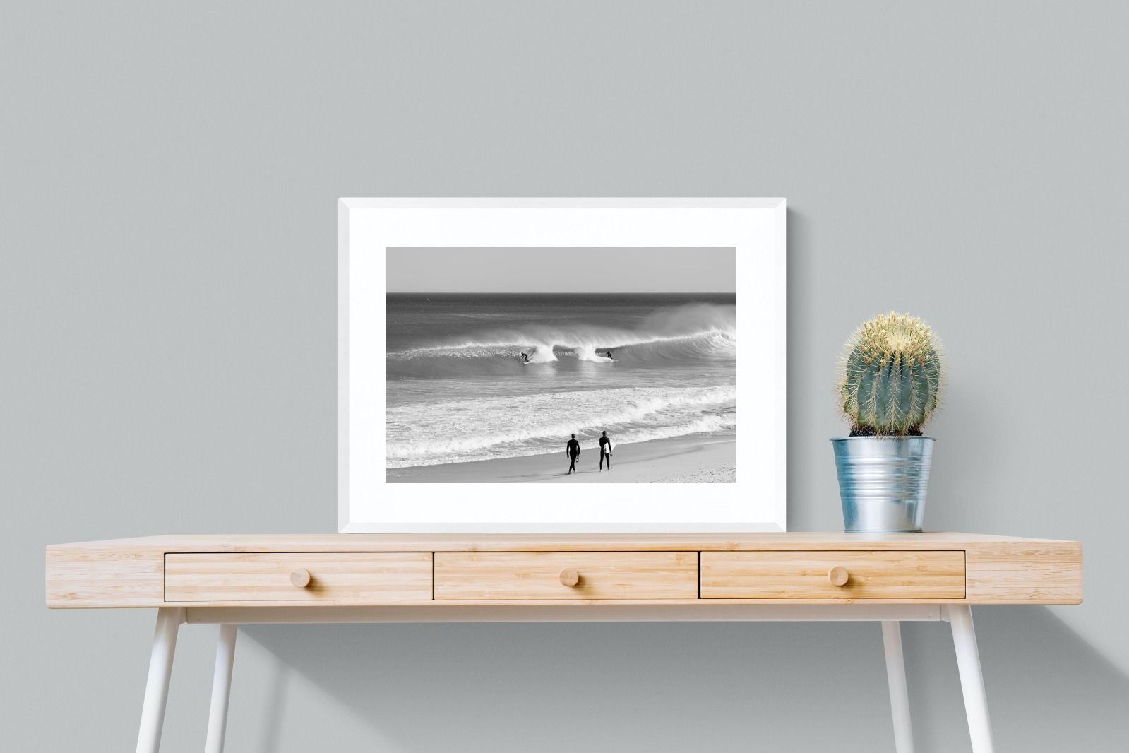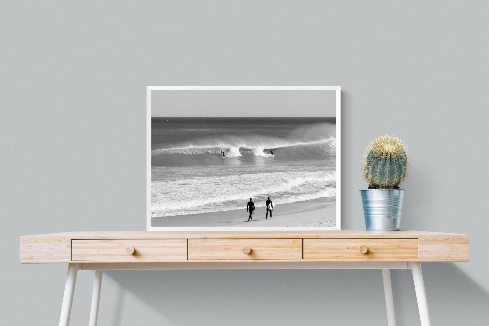 Photographed on the West Coast of Cape Town, this black and white surf scene captures powerful, clean lines as riders carve through rolling Atlantic waves. The contrast between spray, shadow and open horizon creates a bold, graphic composition. Figures on the shoreline add scale and atmosphere, grounding the moment in authentic coastal culture. A dramatic piece suited to modern interiors, surf-inspired spaces and anyone drawn to the rhythm of the ocean.