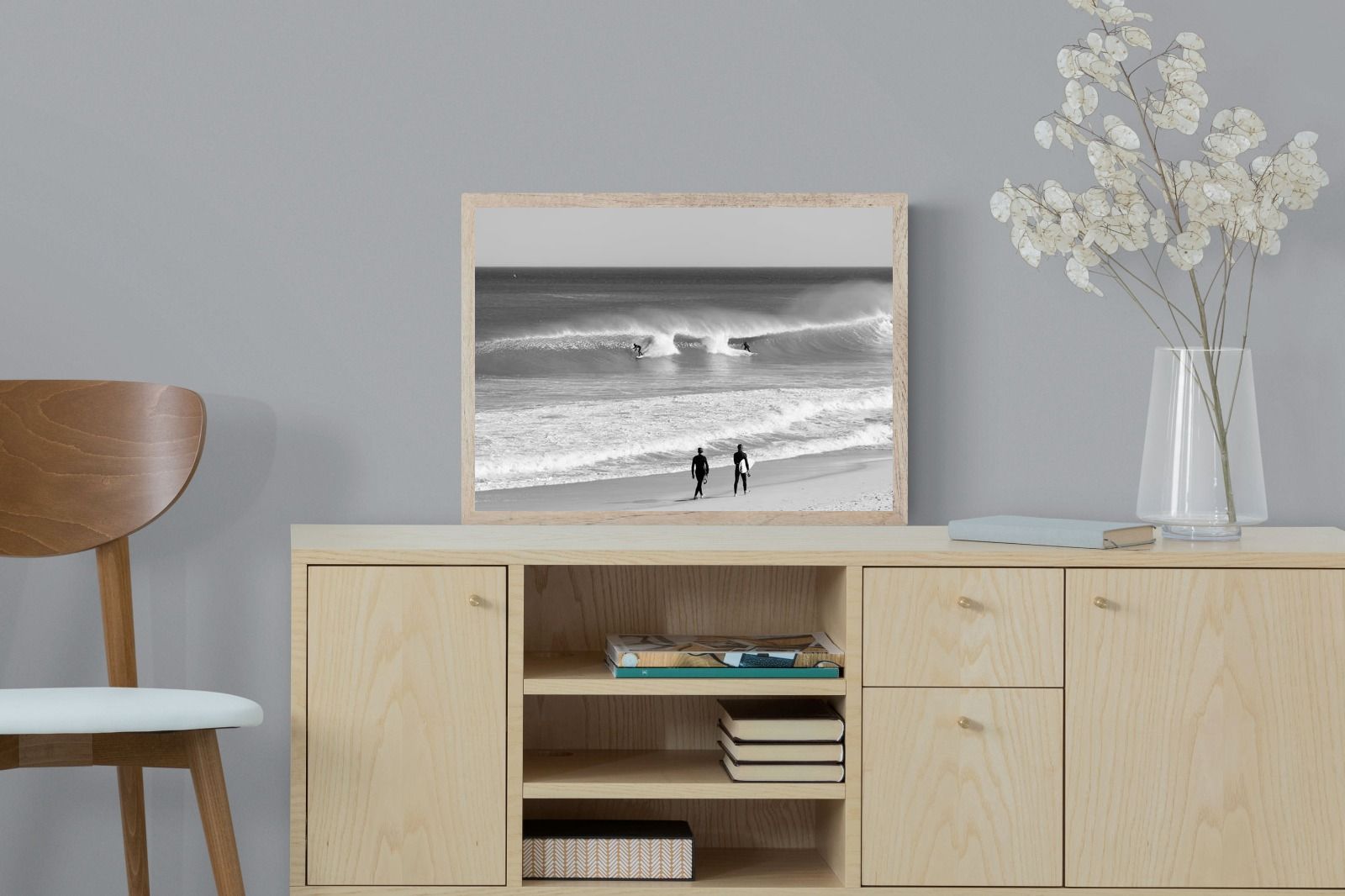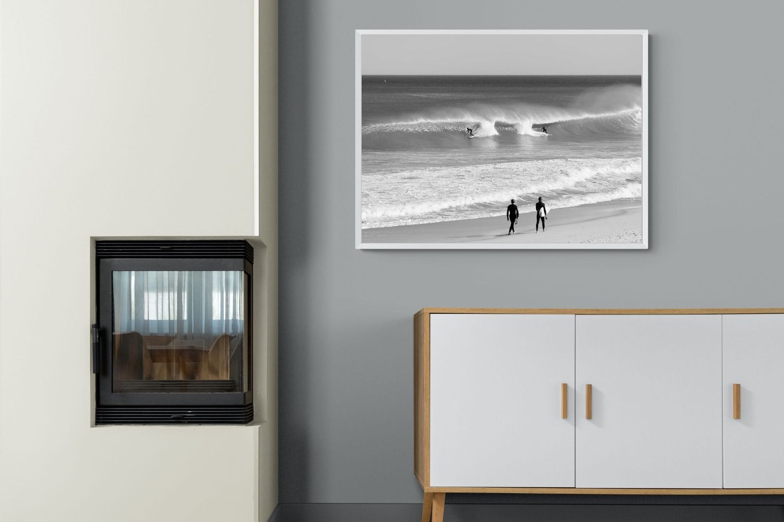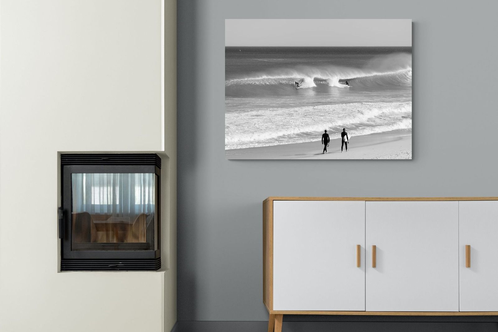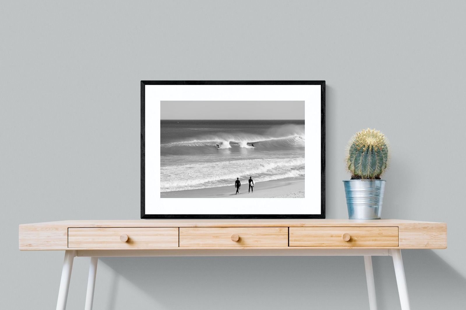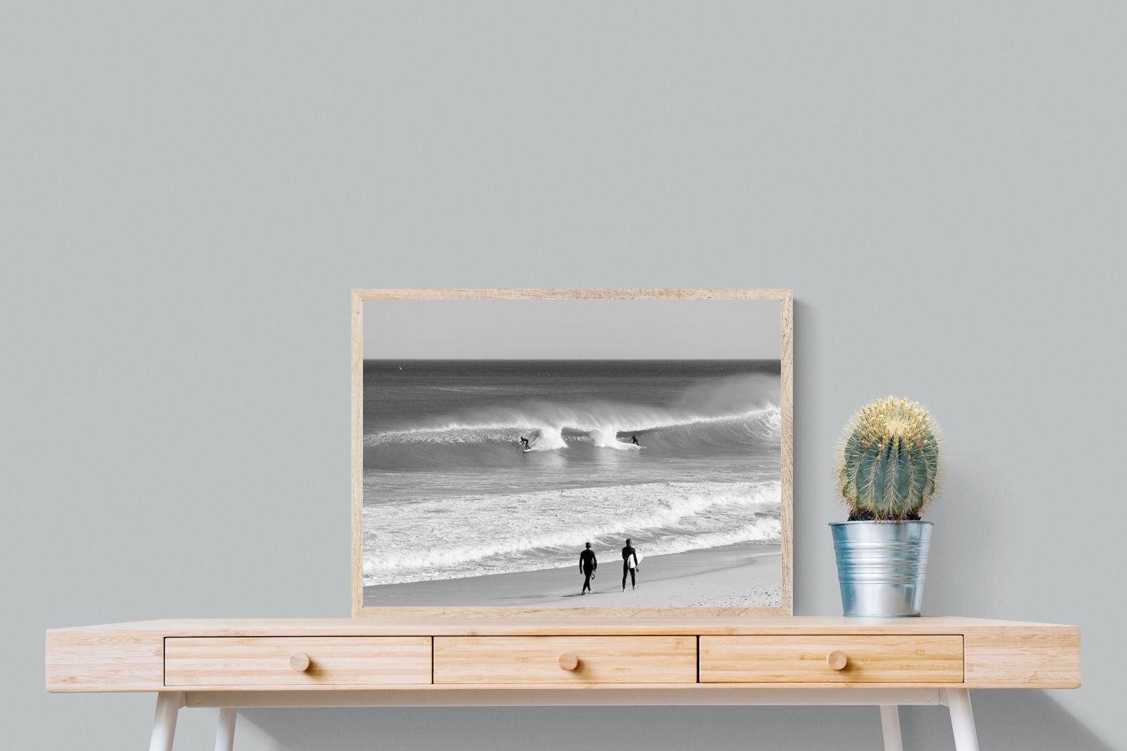 Photographed on the West Coast of Cape Town, this black and white surf scene captures powerful, clean lines as riders carve through rolling Atlantic waves. The contrast between spray, shadow and open horizon creates a bold, graphic composition. Figures on the shoreline add scale and atmosphere, grounding the moment in authentic coastal culture. A dramatic piece suited to modern interiors, surf-inspired spaces and anyone drawn to the rhythm of the ocean.