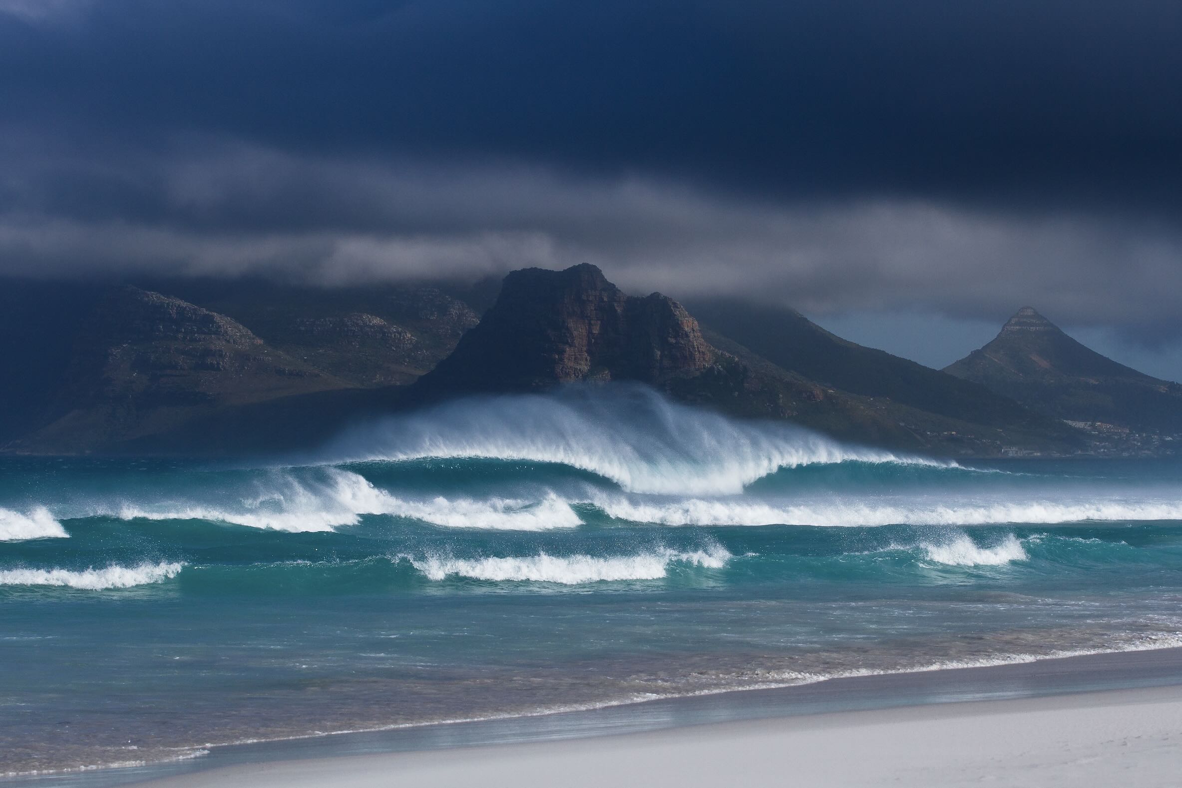 Hout Bay presents a moody Atlantic swell rolling in beneath brooding Cape Town skies. Shot along the city’s coastline, layered waves crash toward a windswept shoreline while low cloud clings to the mountain peaks beyond. The deep teal water contrasts with darkened skies, creating dramatic tension and atmosphere. Perfect for sophisticated interiors, modern coastal homes or statement spaces wanting powerful South African ocean imagery.