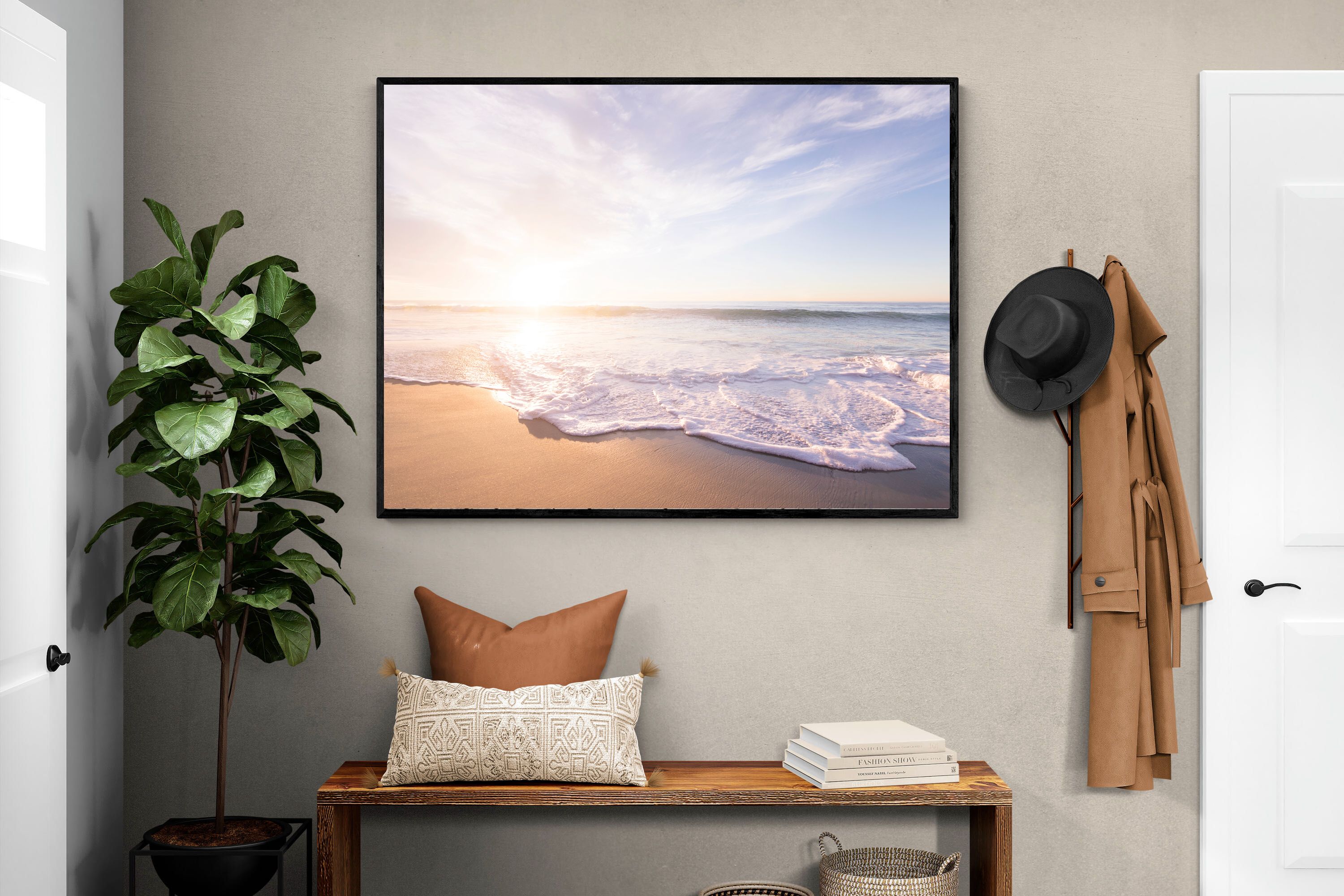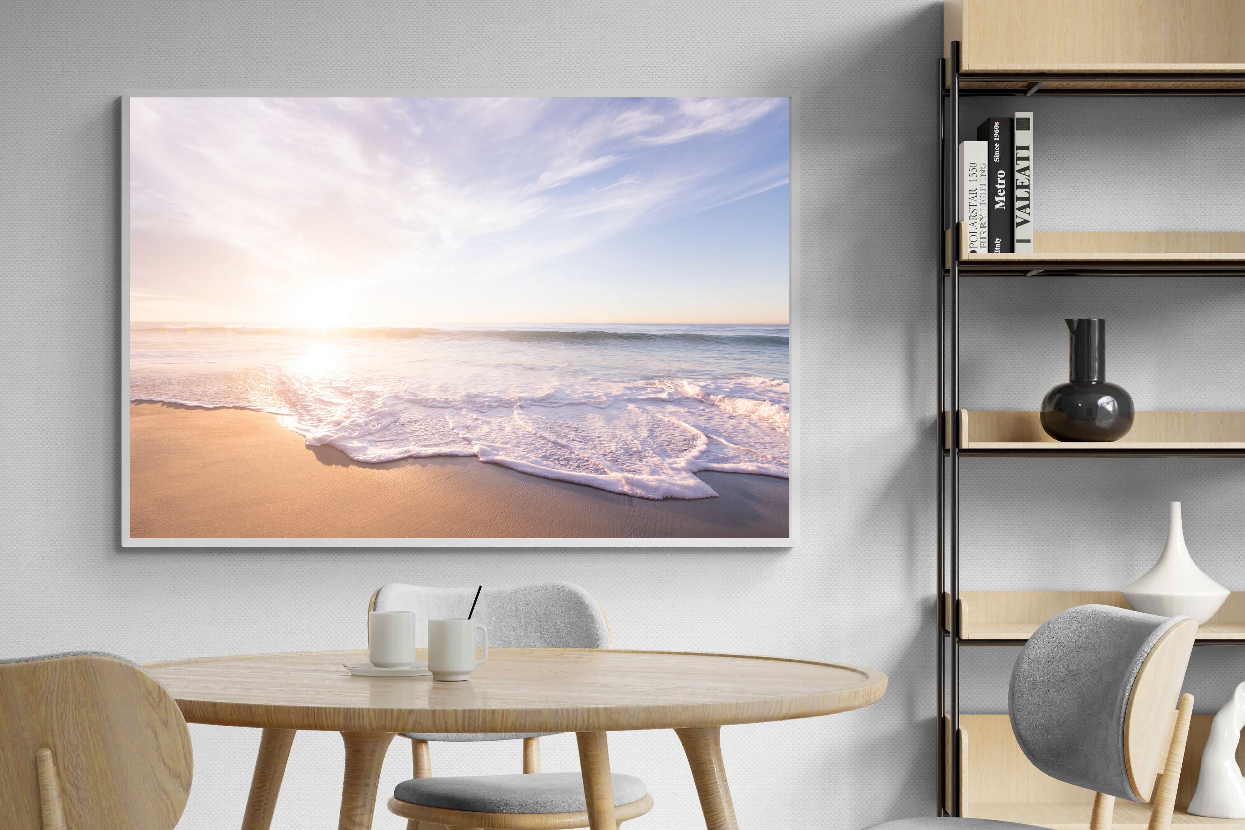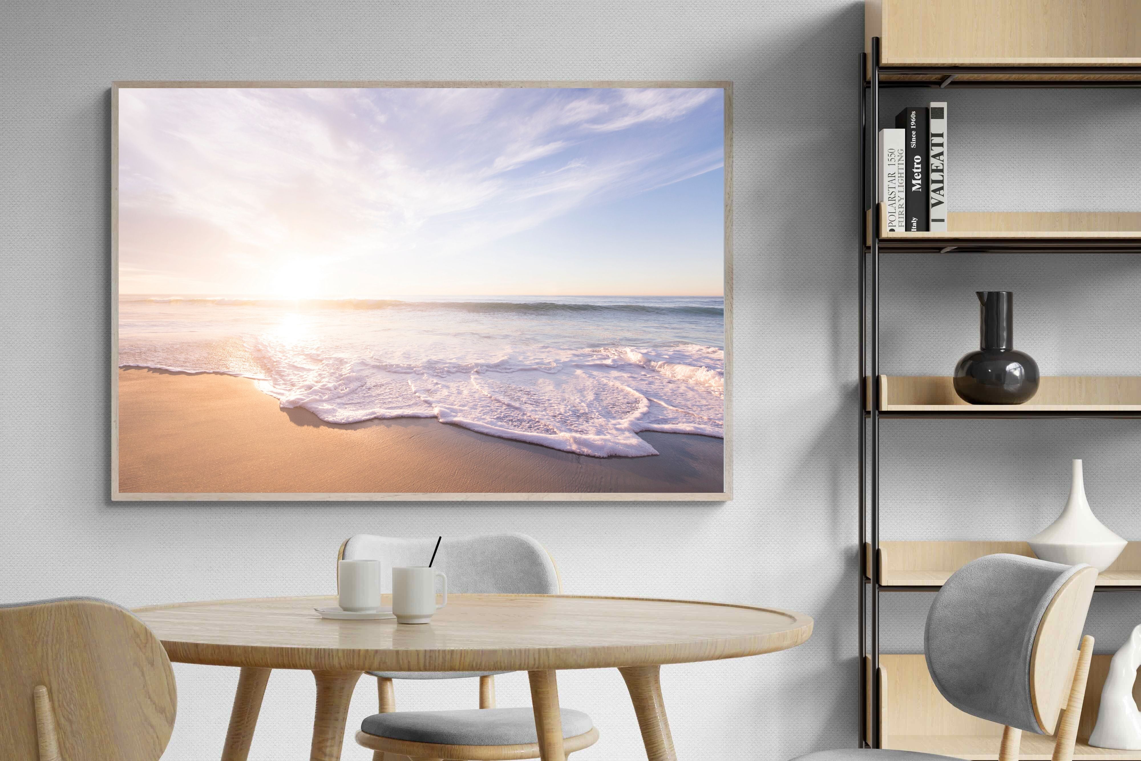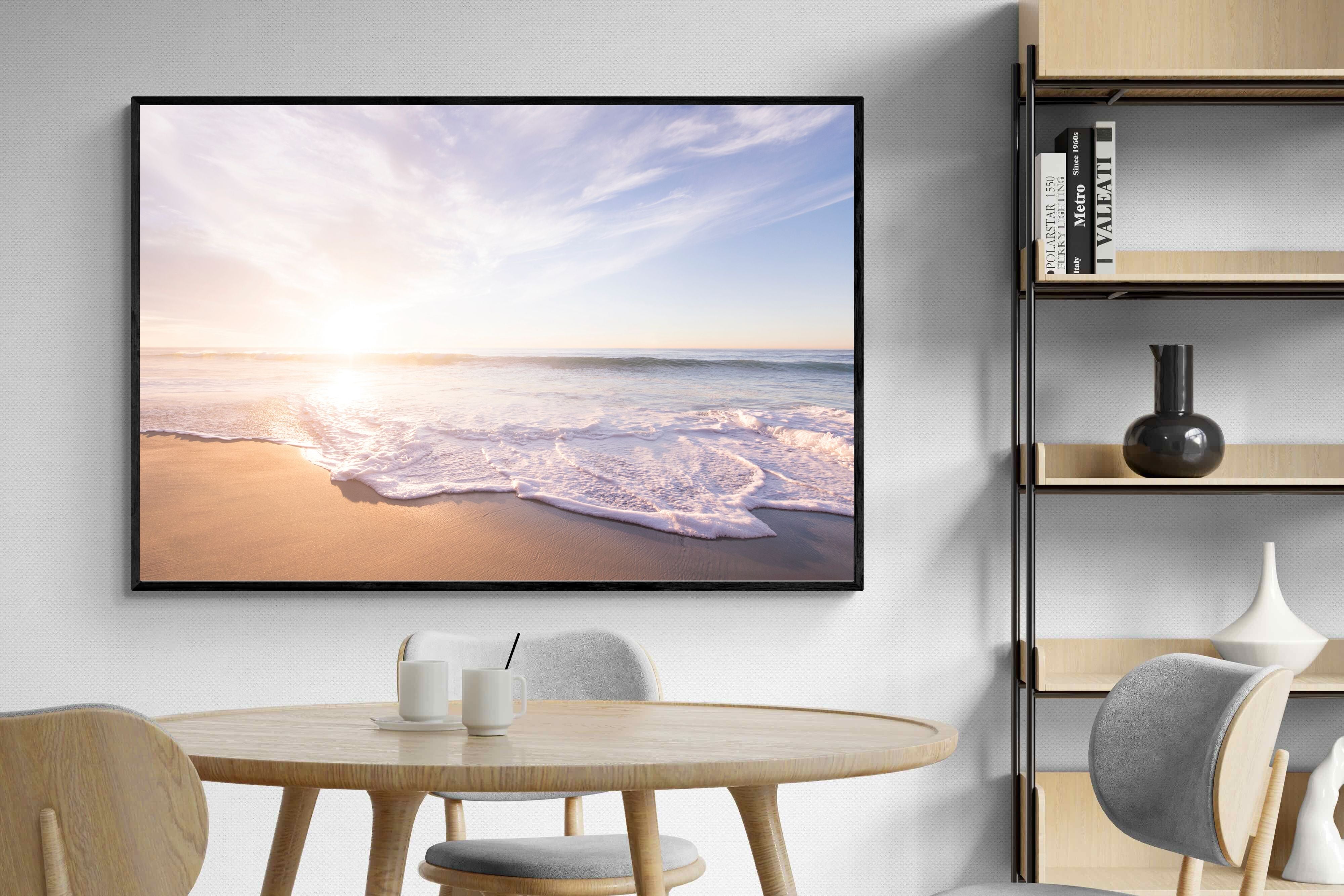 This serene image of a beach at sunset captures the calming beauty of the ocean. The soft waves gently lap against the sand, bathed in the golden glow of the early morning light. Ideal for contemporary spaces, this wall art brings a peaceful, natural vibe, evoking feelings of relaxation and tranquility. Its soft pastel hues and gentle movement make it a perfect addition to any modern home decor.