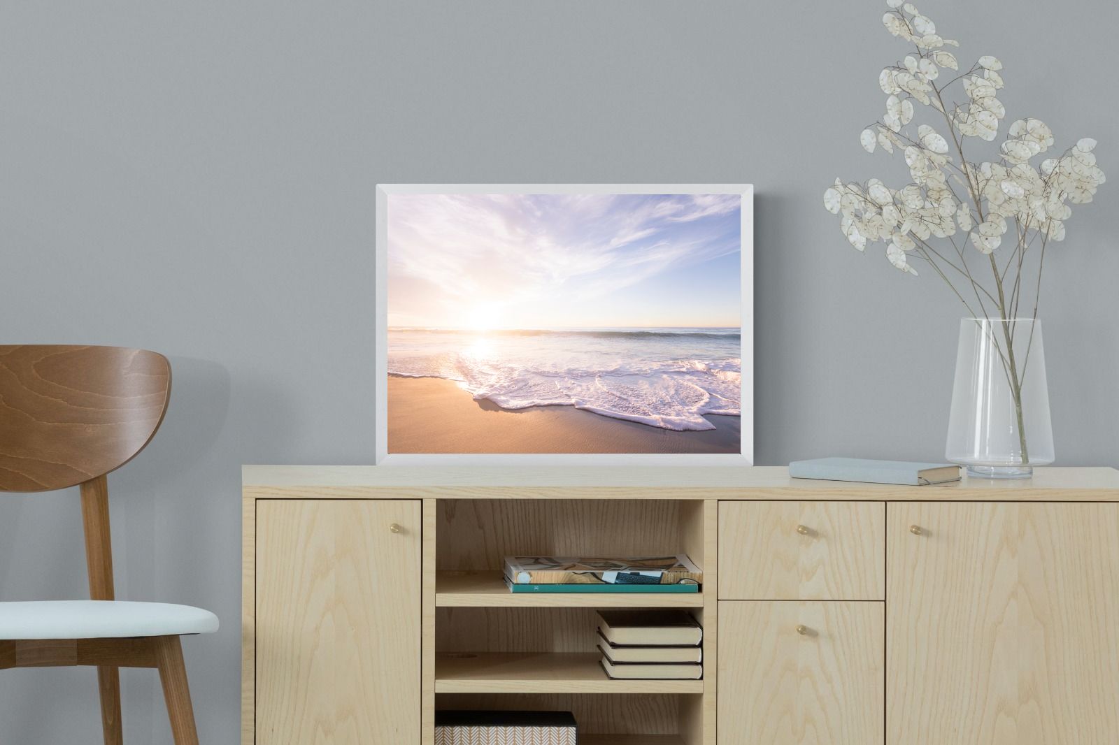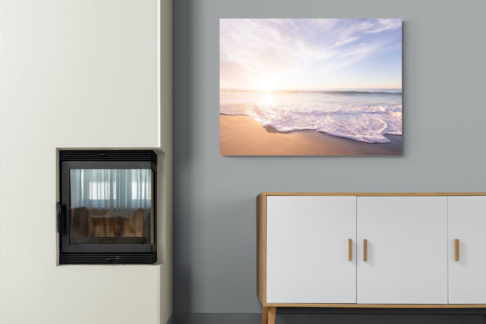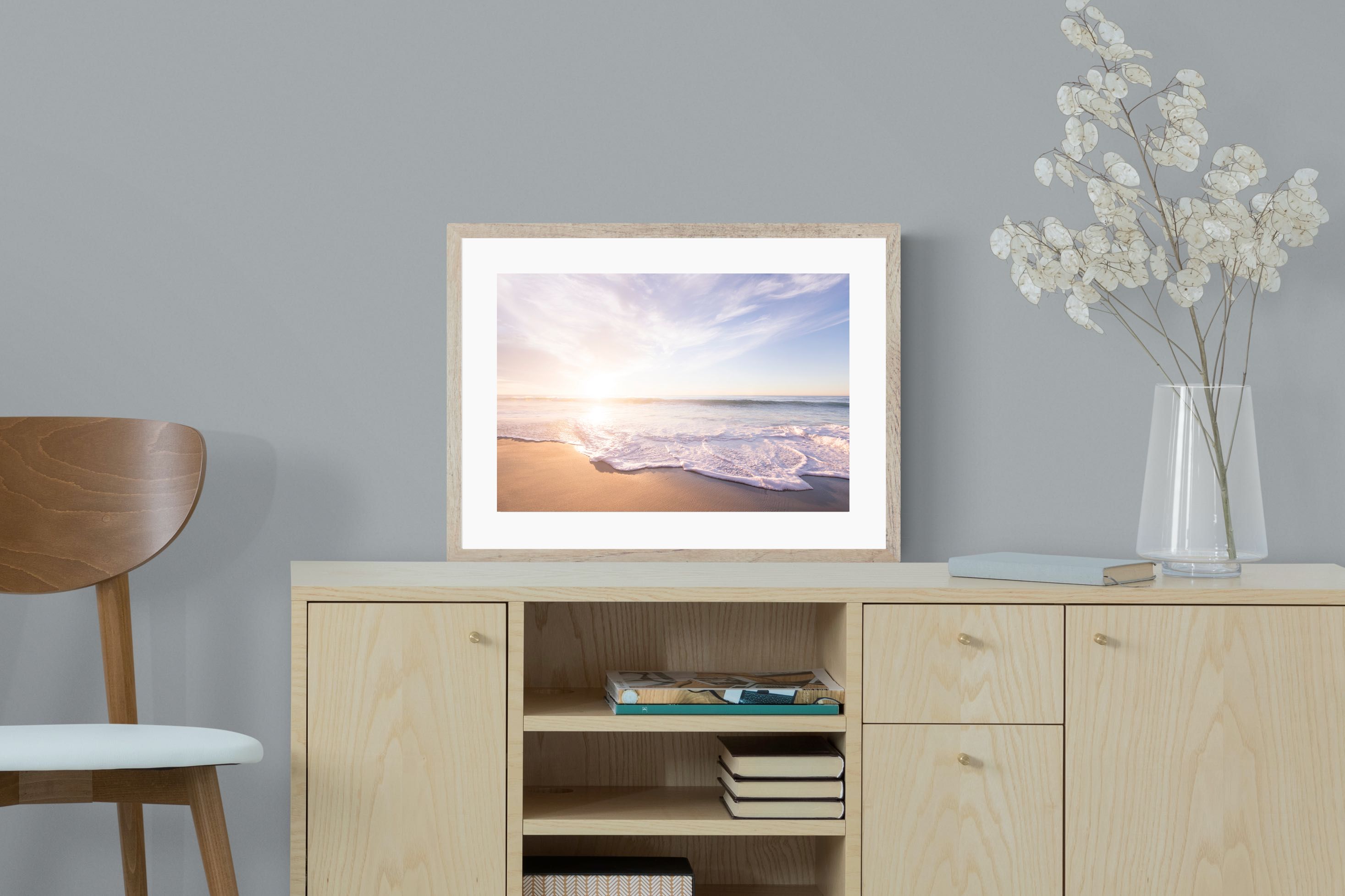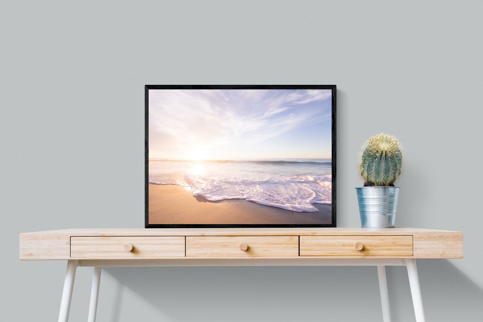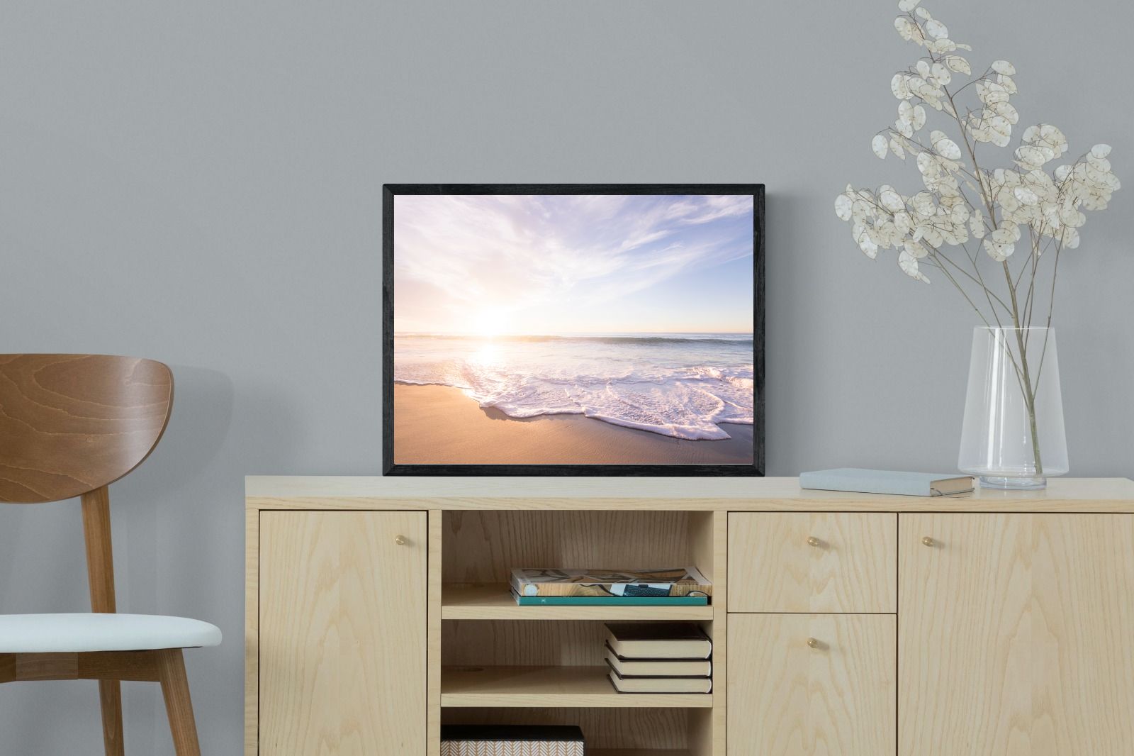 This serene image of a beach at sunset captures the calming beauty of the ocean. The soft waves gently lap against the sand, bathed in the golden glow of the early morning light. Ideal for contemporary spaces, this wall art brings a peaceful, natural vibe, evoking feelings of relaxation and tranquility. Its soft pastel hues and gentle movement make it a perfect addition to any modern home decor.