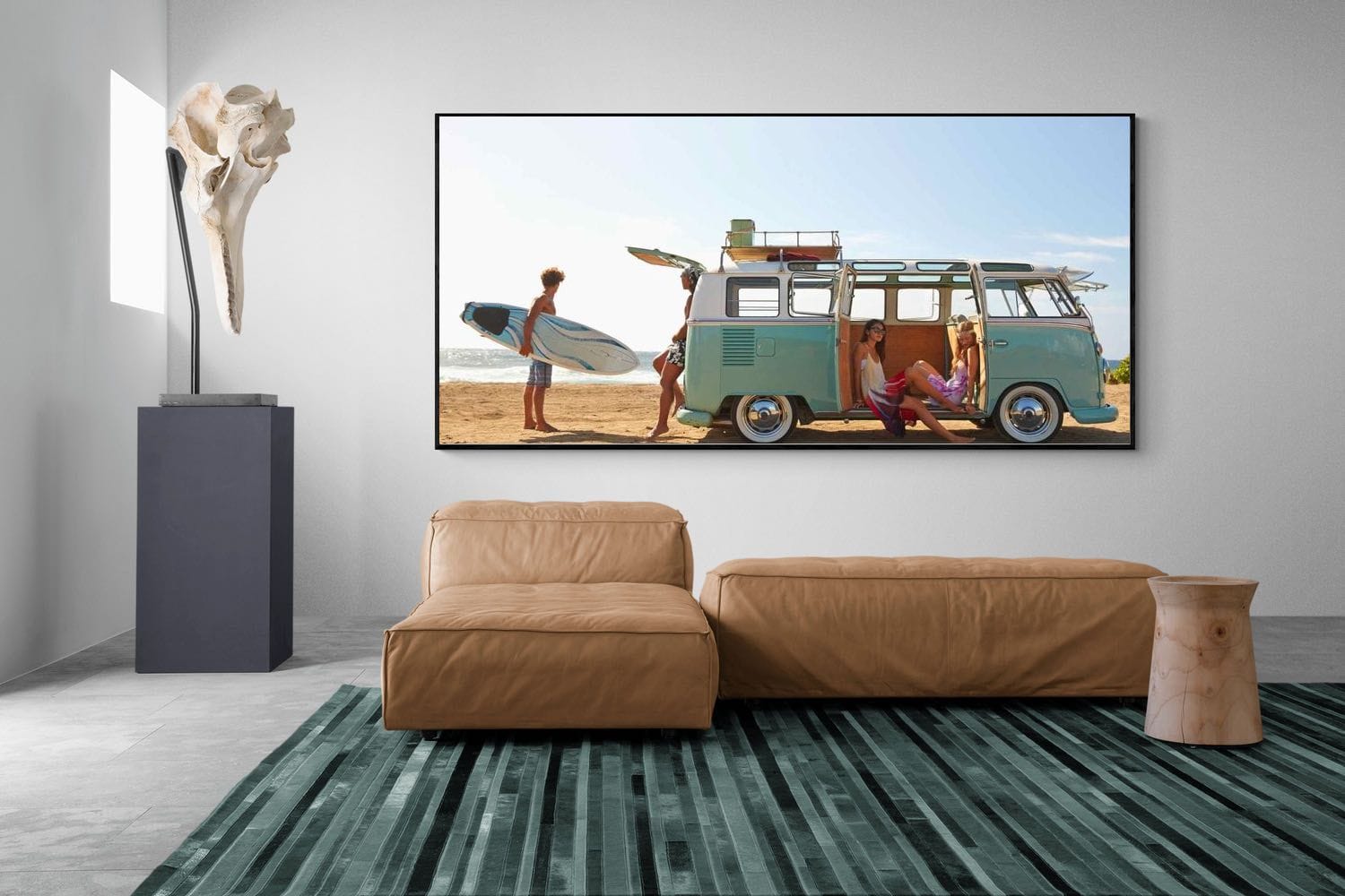 A classic vintage surf van rests on a sunlit beach while surfers prepare for a day on the waves. Surfboards, warm light and relaxed coastal energy capture the spirit of road trips and endless summer adventures. The retro vehicle and laid-back atmosphere create a nostalgic seaside mood that feels carefree and stylish. Ideal for beach houses, modern living spaces or surf-inspired interiors seeking a relaxed coastal aesthetic.