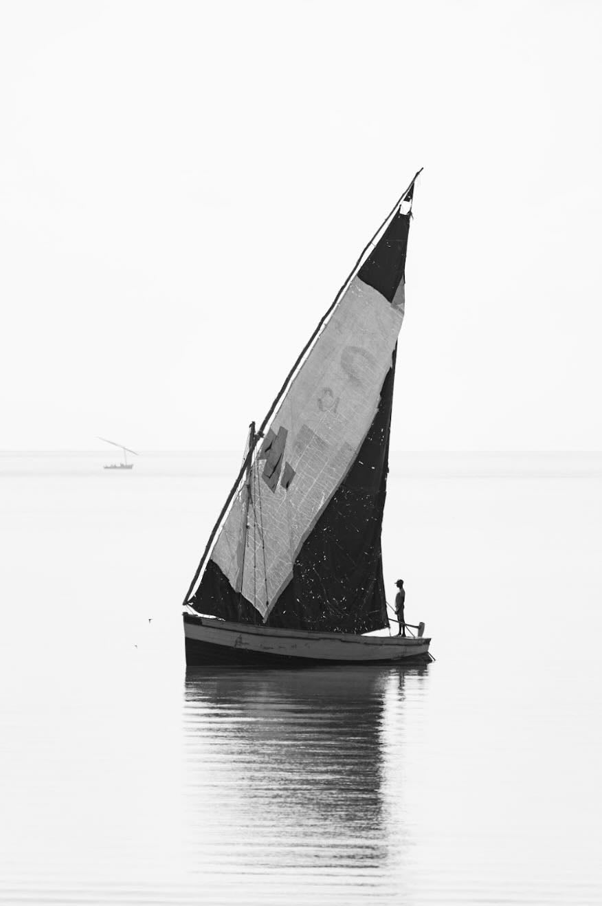 A solitary dhow drifts across still water off Vilankulos, rendered in striking black and white. The minimalist composition emphasises reflection, form and quiet isolation, creating a refined coastal artwork with a contemplative mood. The high contrast sail against the soft horizon gives this piece a sculptural quality, making it particularly suited to monochrome interiors, modern apartments or serene hospitality spaces. A sophisticated nautical photograph that brings East African atmosphere into a contemporary setting.