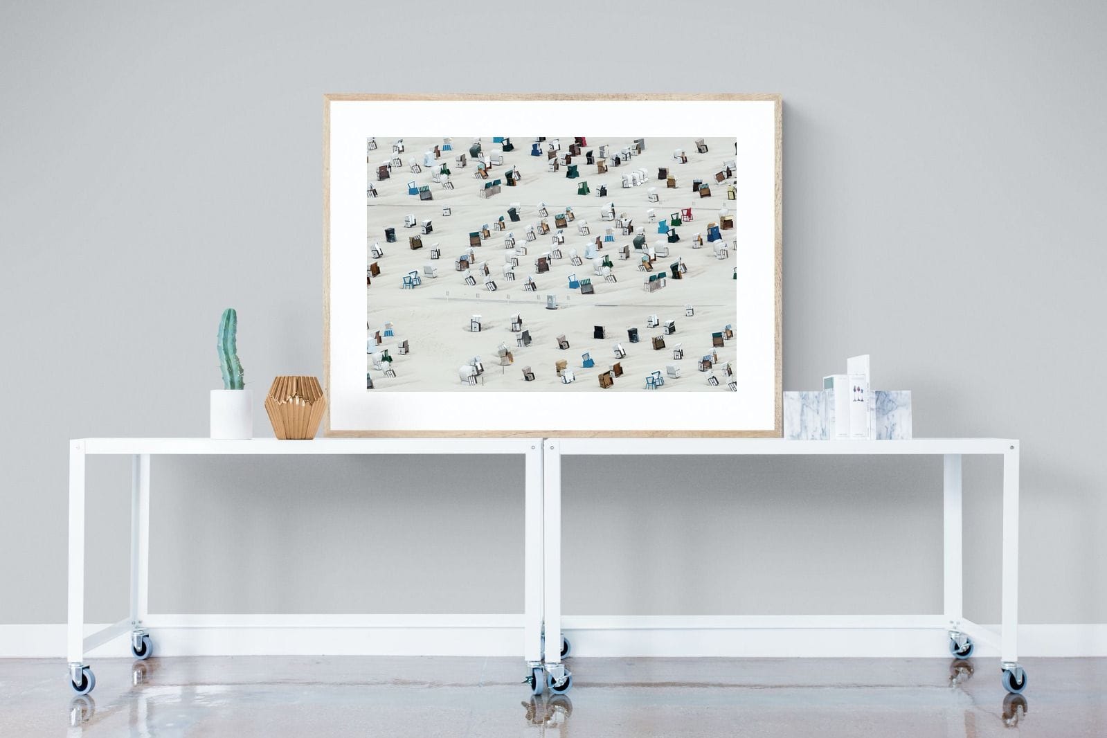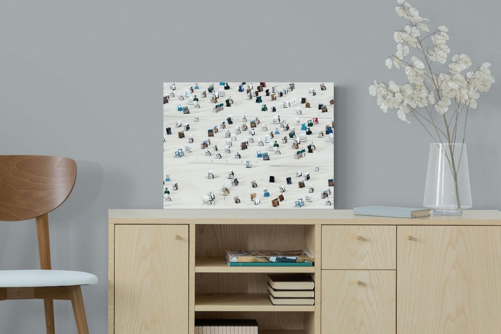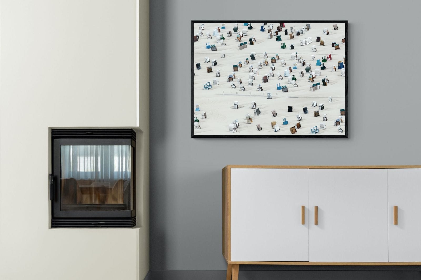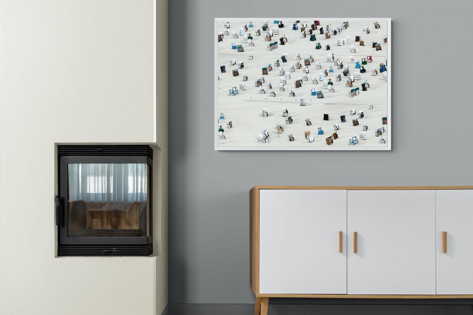 This unique aerial photograph captures rows of beach cabins scattered across soft sand, creating a rhythmic, almost abstract pattern. The varied colours and shapes add visual interest while maintaining a clean composition. Ideal for coastal or modern interiors, it brings lightness and structure. This piece works as a distinctive focal artwork, adding character, repetition and a relaxed seaside feel to the space.