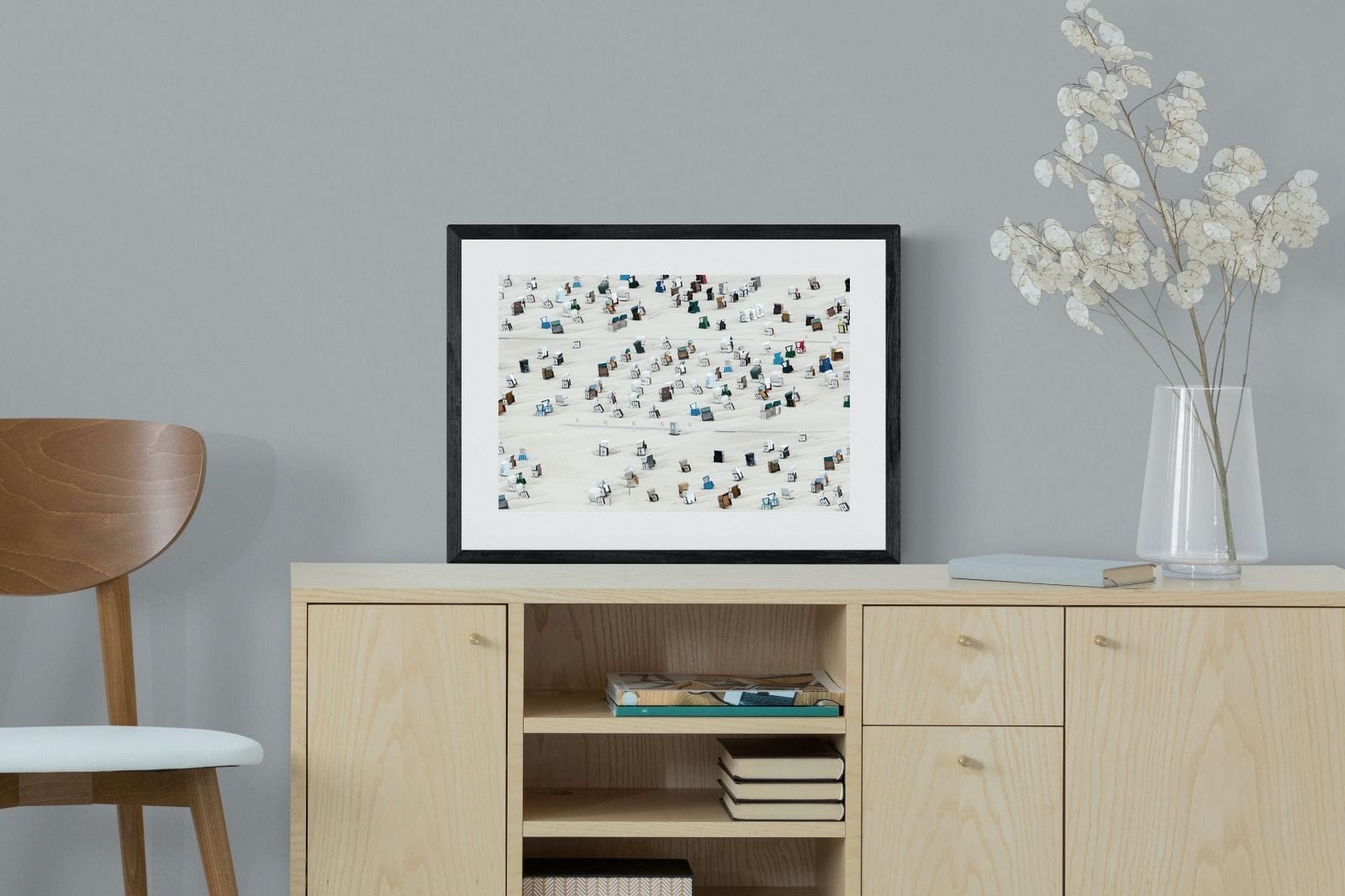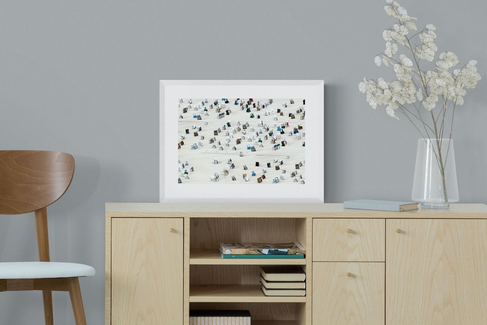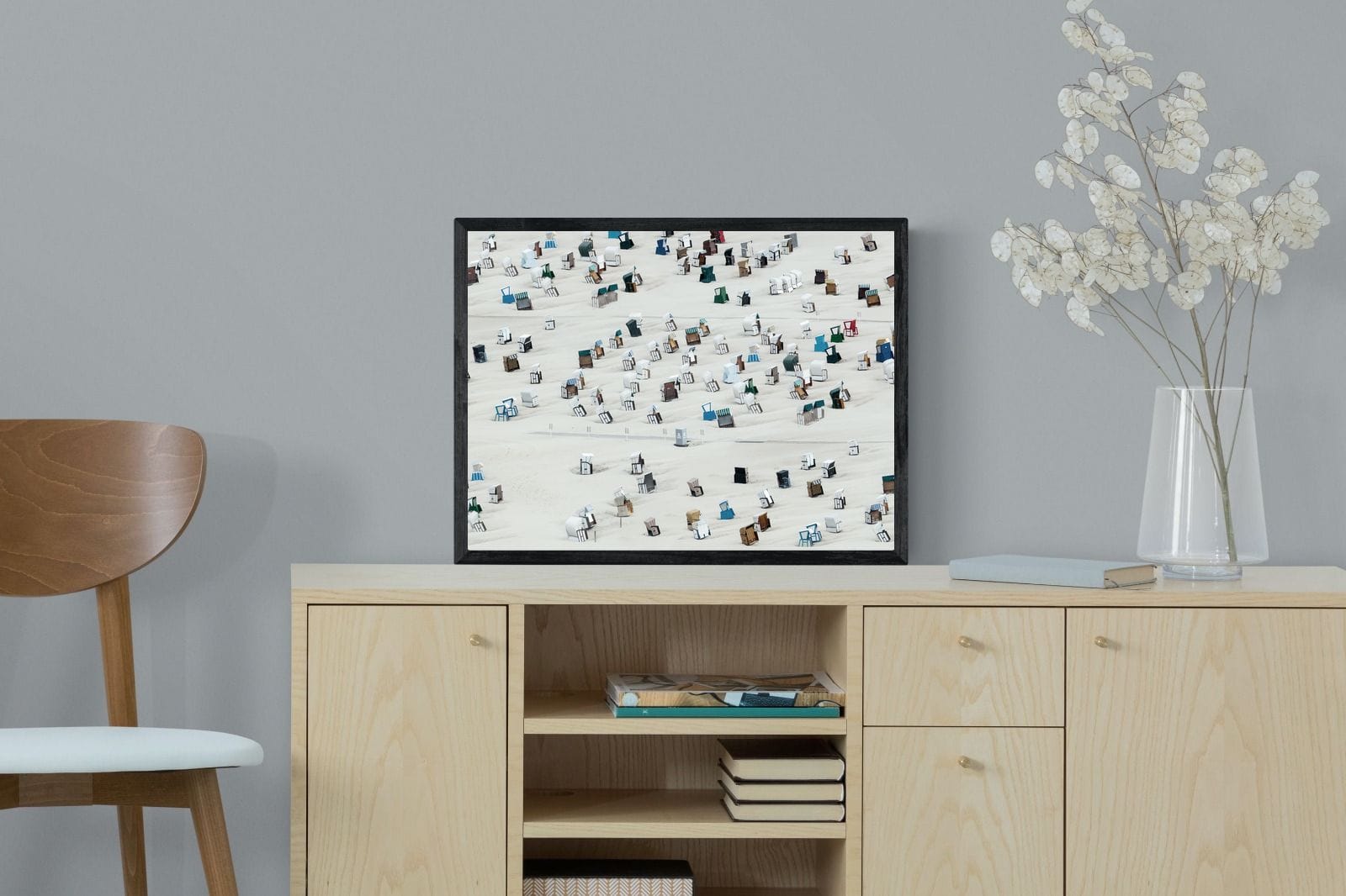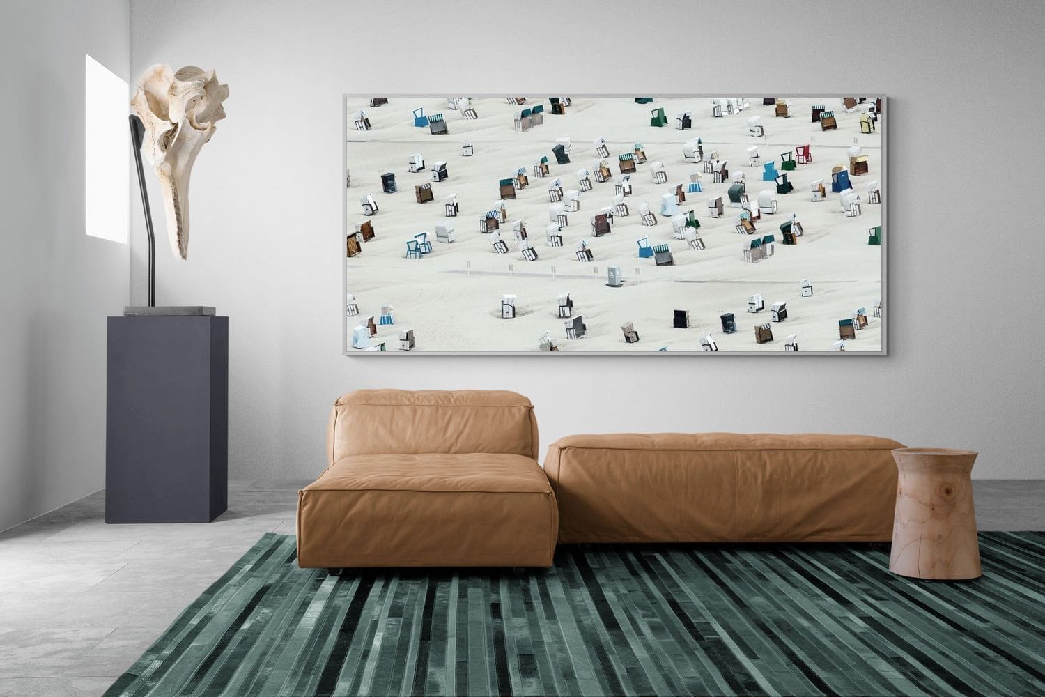 This unique aerial photograph captures rows of beach cabins scattered across soft sand, creating a rhythmic, almost abstract pattern. The varied colours and shapes add visual interest while maintaining a clean composition. Ideal for coastal or modern interiors, it brings lightness and structure. This piece works as a distinctive focal artwork, adding character, repetition and a relaxed seaside feel to the space.