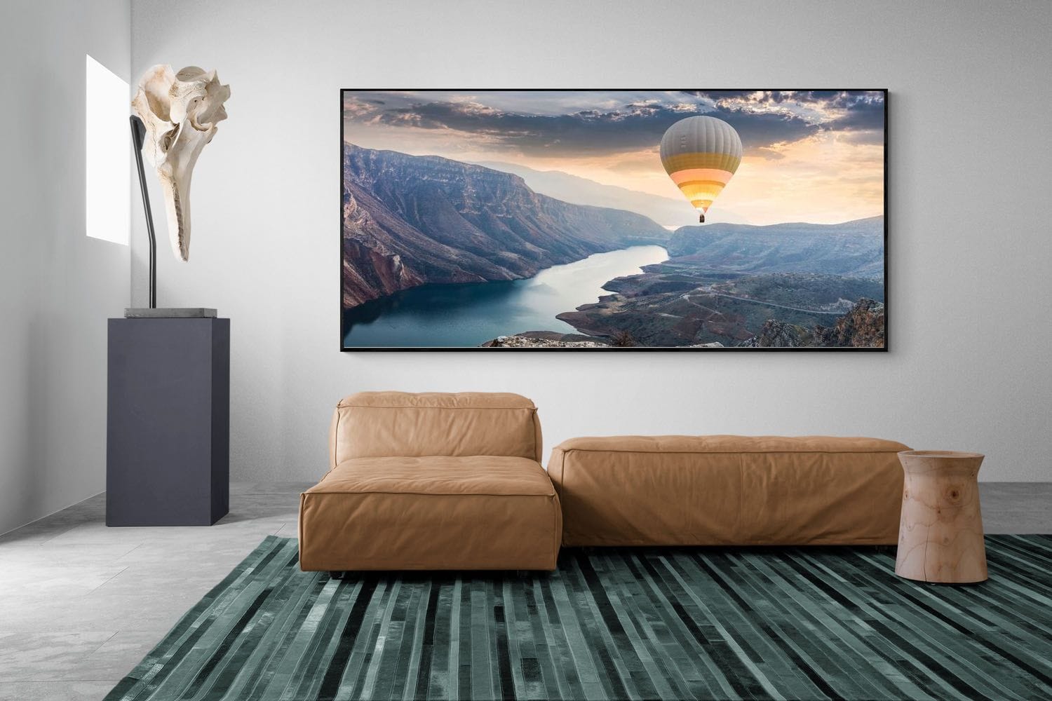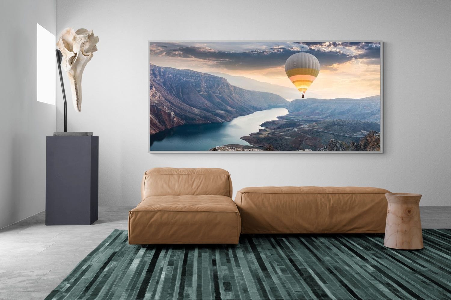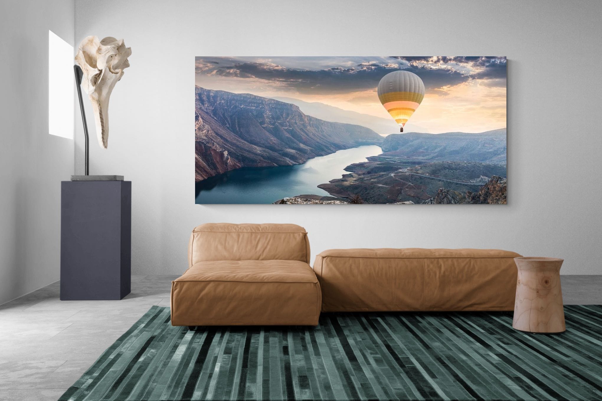 A hot air balloon drifts above a vast canyon landscape, with layered mountains and a winding river below. The soft light and expansive view create depth and a sense of quiet adventure. Ideal for contemporary interiors, this piece adds openness and perspective to a space. Perfect for living rooms, offices or bedrooms, it offers a scenic escape that balances natural beauty with a refined, uplifting composition.