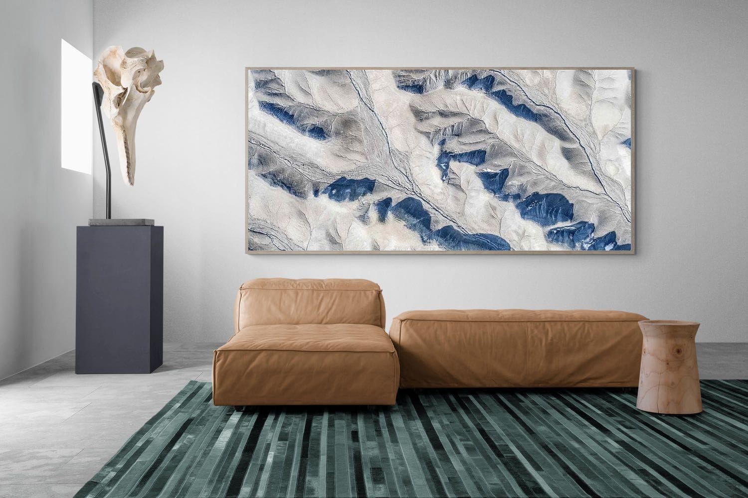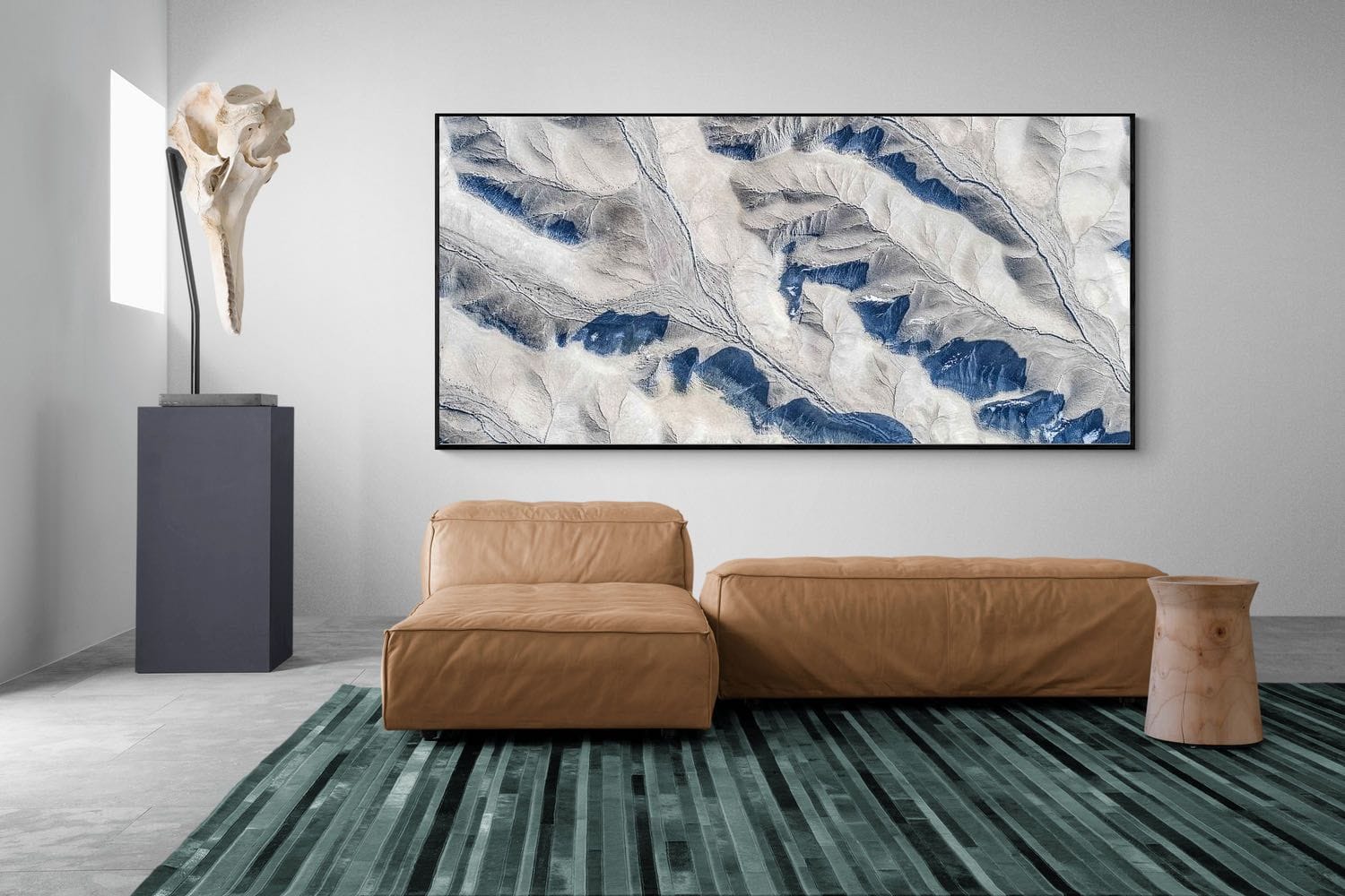 An aerial perspective reveals the sculpted ridges and valleys of Utah’s desert terrain, where pale earth contrasts with deep blue shadows across the mountains. The repeating contours create a striking natural pattern that feels almost graphic in its simplicity. This landscape photograph blends minimalism with dramatic texture, making it an elegant statement piece that suits contemporary interiors, offices and modern architectural spaces.