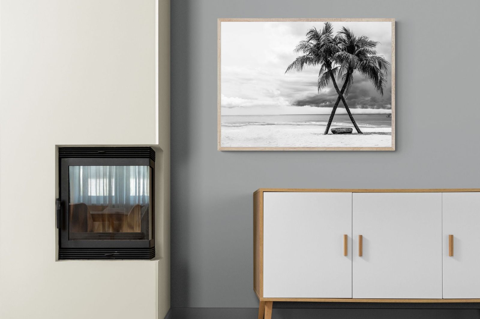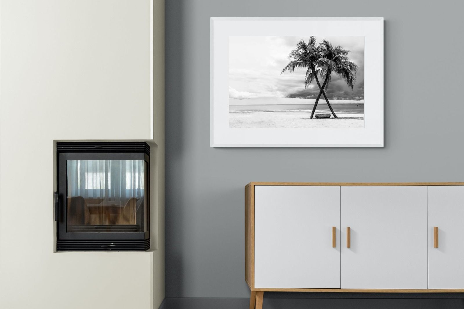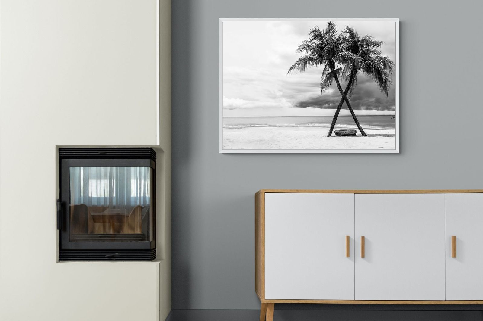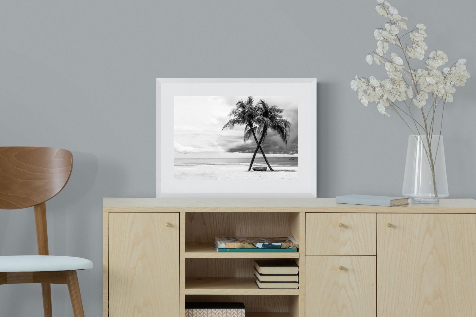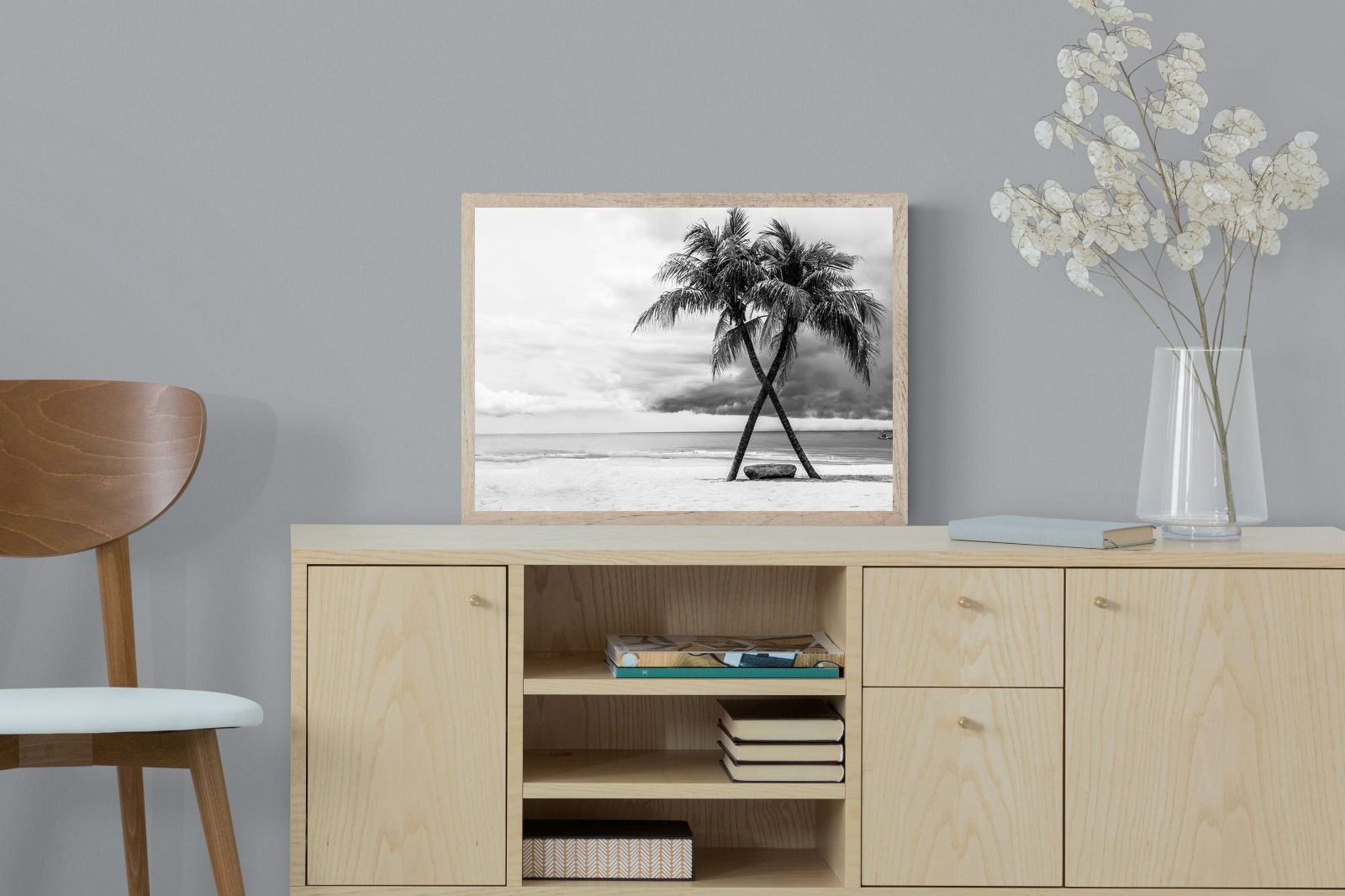 A striking black and white composition of two palm trees leaning into each other against a calm shoreline and dramatic sky. The contrast between soft sand, still water and textured clouds creates a timeless, atmospheric scene. Ideal for modern interiors, bedrooms or coastal homes, this piece adds depth, simplicity and a refined monochrome aesthetic.