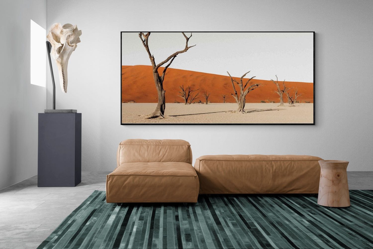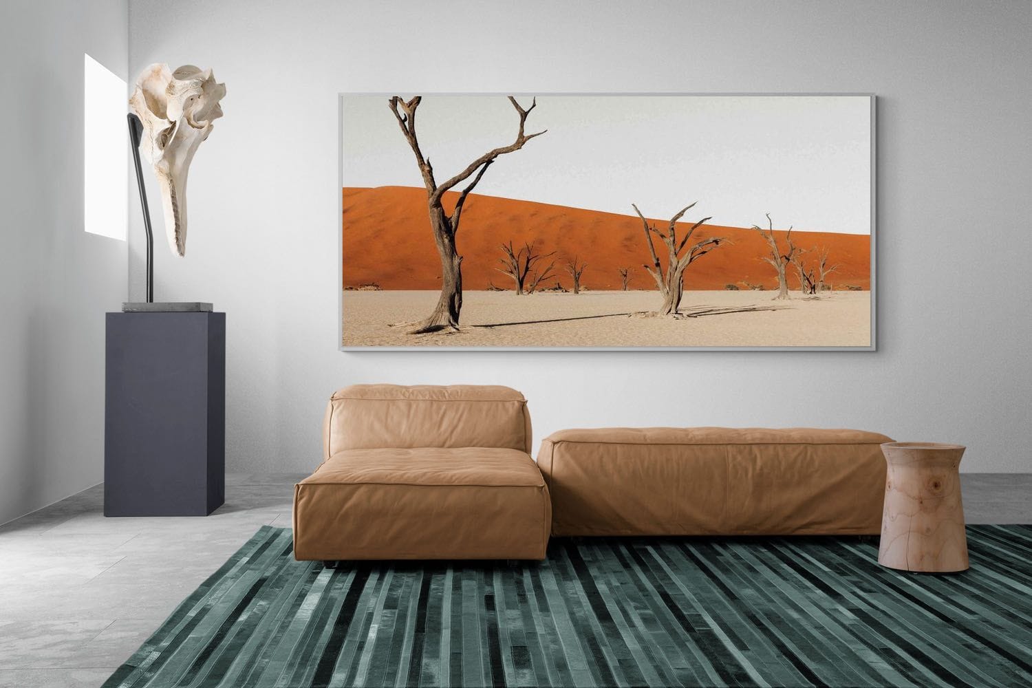 Bare trees stand scattered across pale desert ground against a striking red dune, creating a powerful minimalist composition. The contrast between warm sand and stark forms highlights texture, scale and isolation. Ideal for modern interiors, this piece adds a clean, architectural feel to living rooms, offices or hallways, offering a calm yet dramatic landscape with strong visual impact and balance.