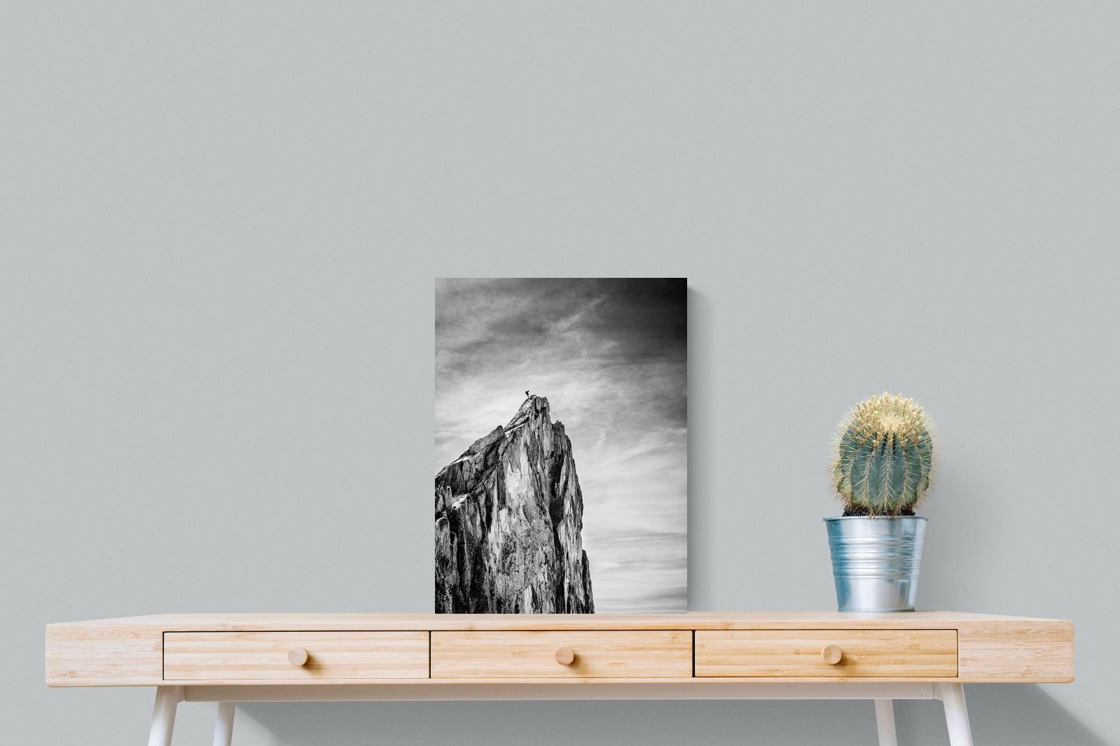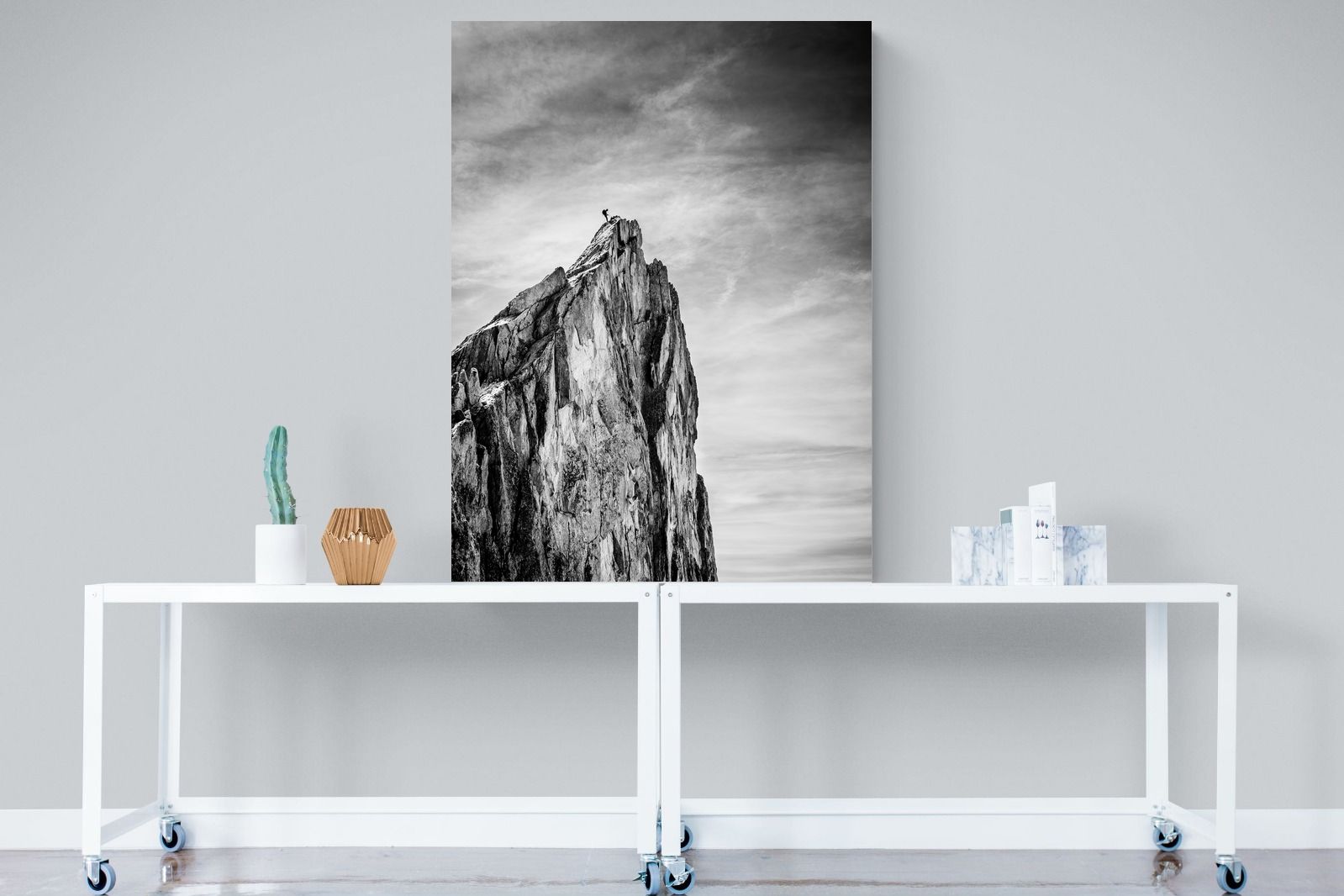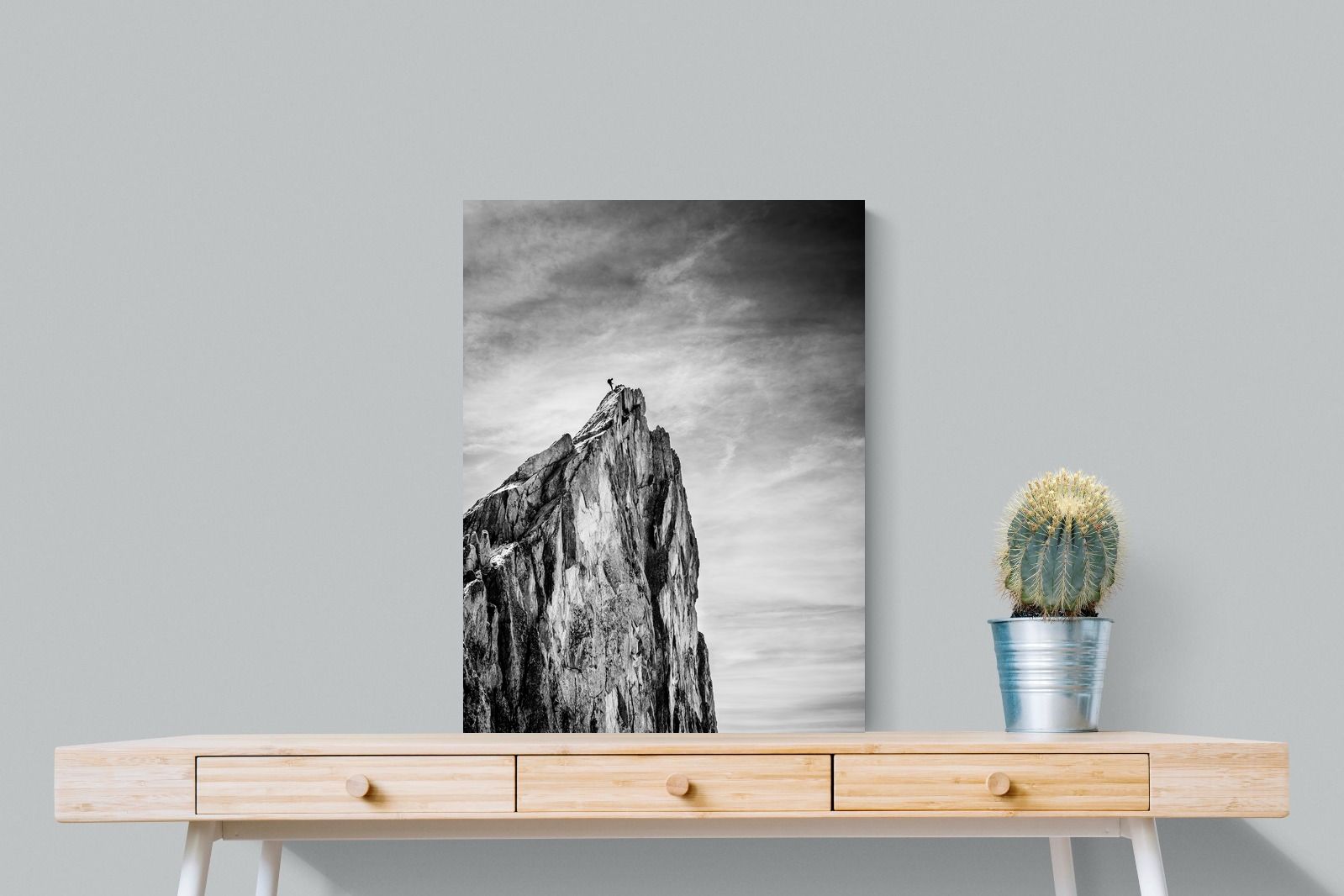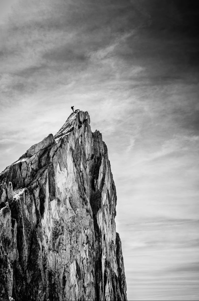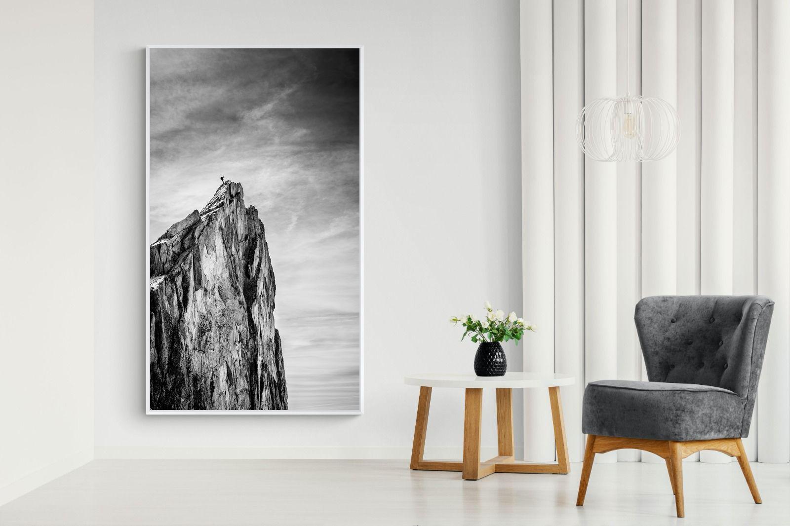 This dramatic black and white landscape captures a lone climber reaching the peak of a rugged mountain, emphasising scale, contrast, and achievement. The expansive sky and textured rock face create a powerful, minimalist composition. Ideal for contemporary interiors, offices, or statement walls, it brings a sense of ambition, adventure, and quiet strength to spaces that value bold, inspiring imagery.