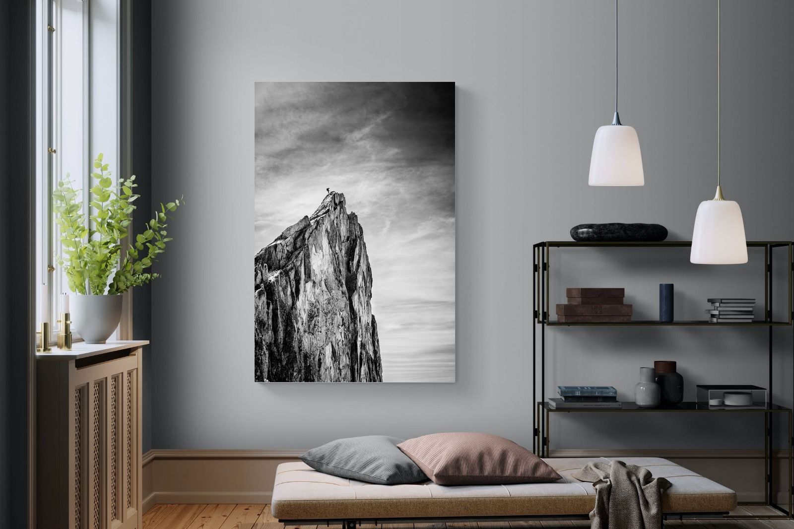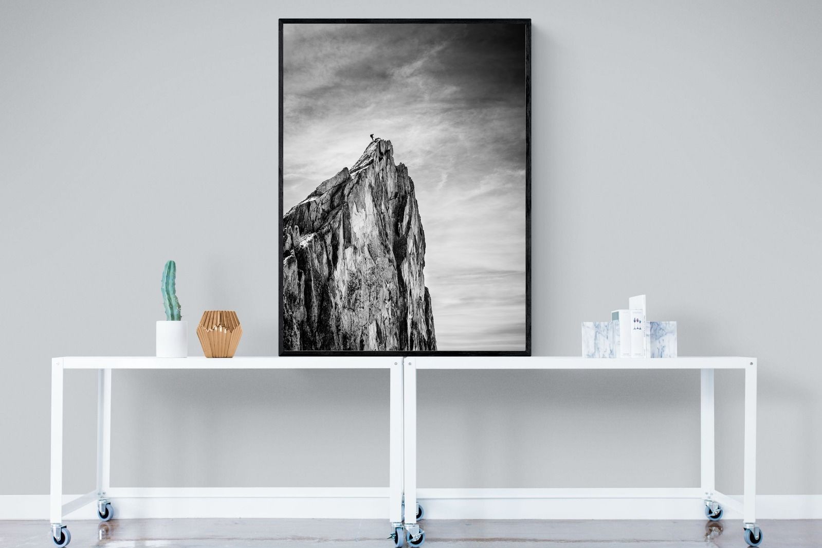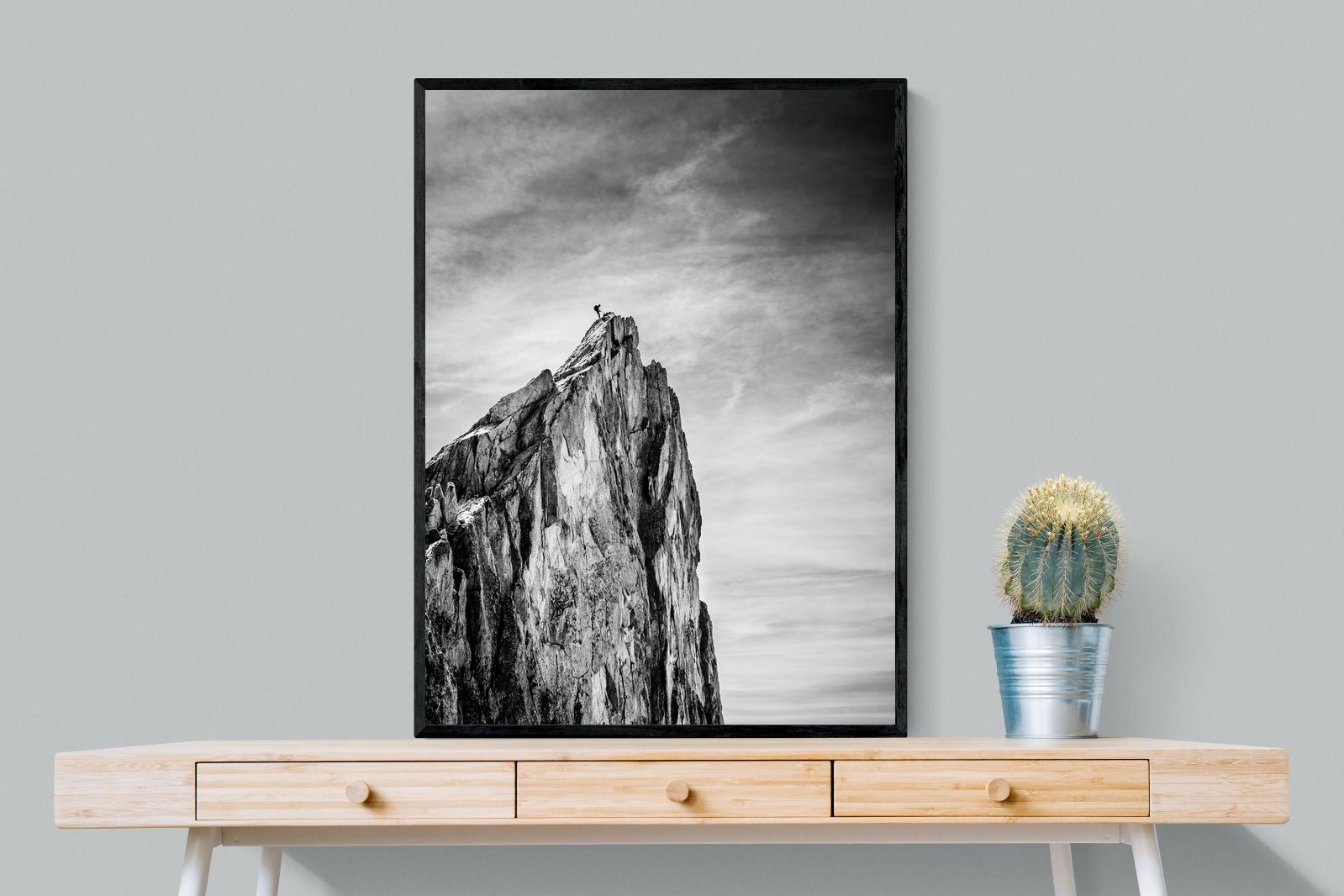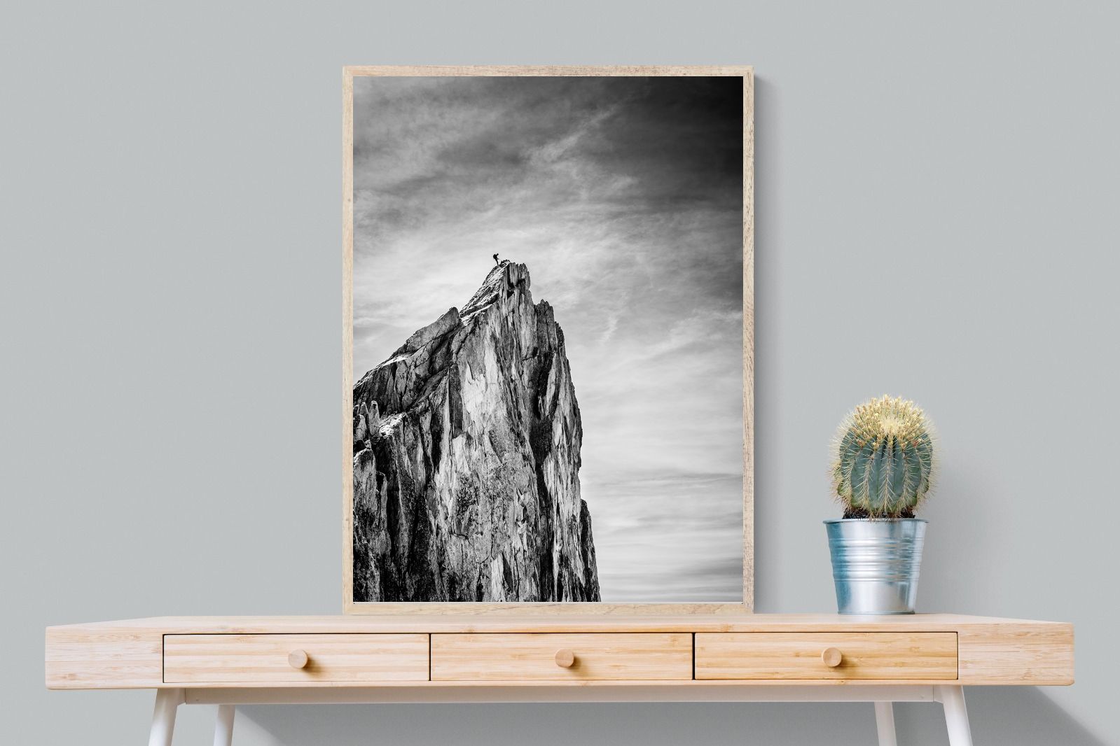 This dramatic black and white landscape captures a lone climber reaching the peak of a rugged mountain, emphasising scale, contrast, and achievement. The expansive sky and textured rock face create a powerful, minimalist composition. Ideal for contemporary interiors, offices, or statement walls, it brings a sense of ambition, adventure, and quiet strength to spaces that value bold, inspiring imagery.