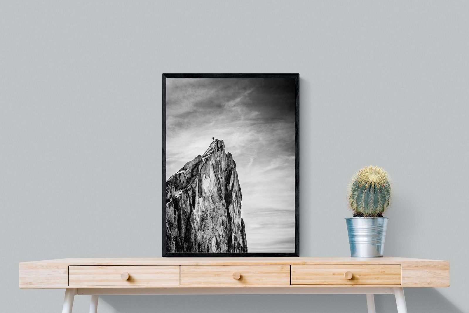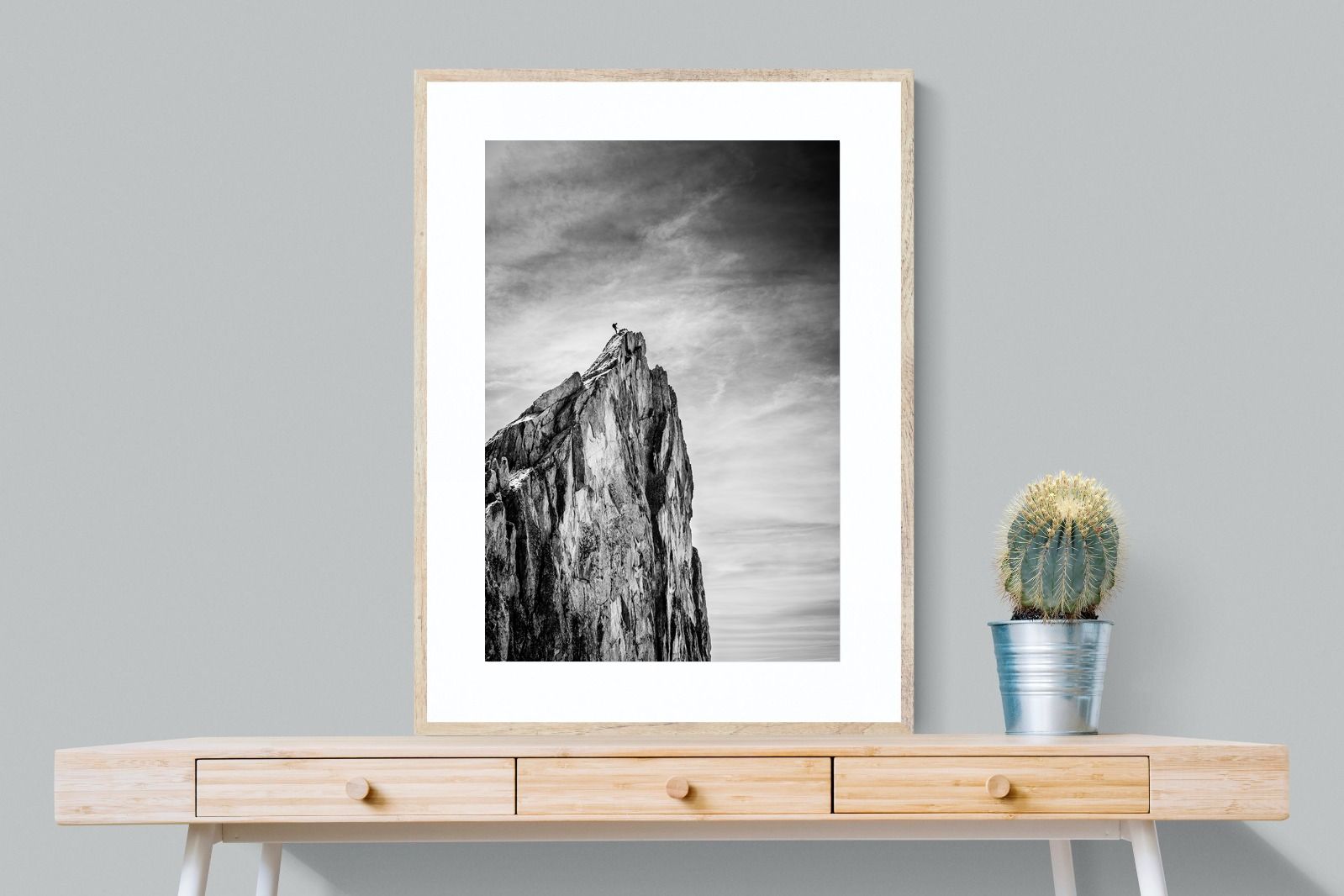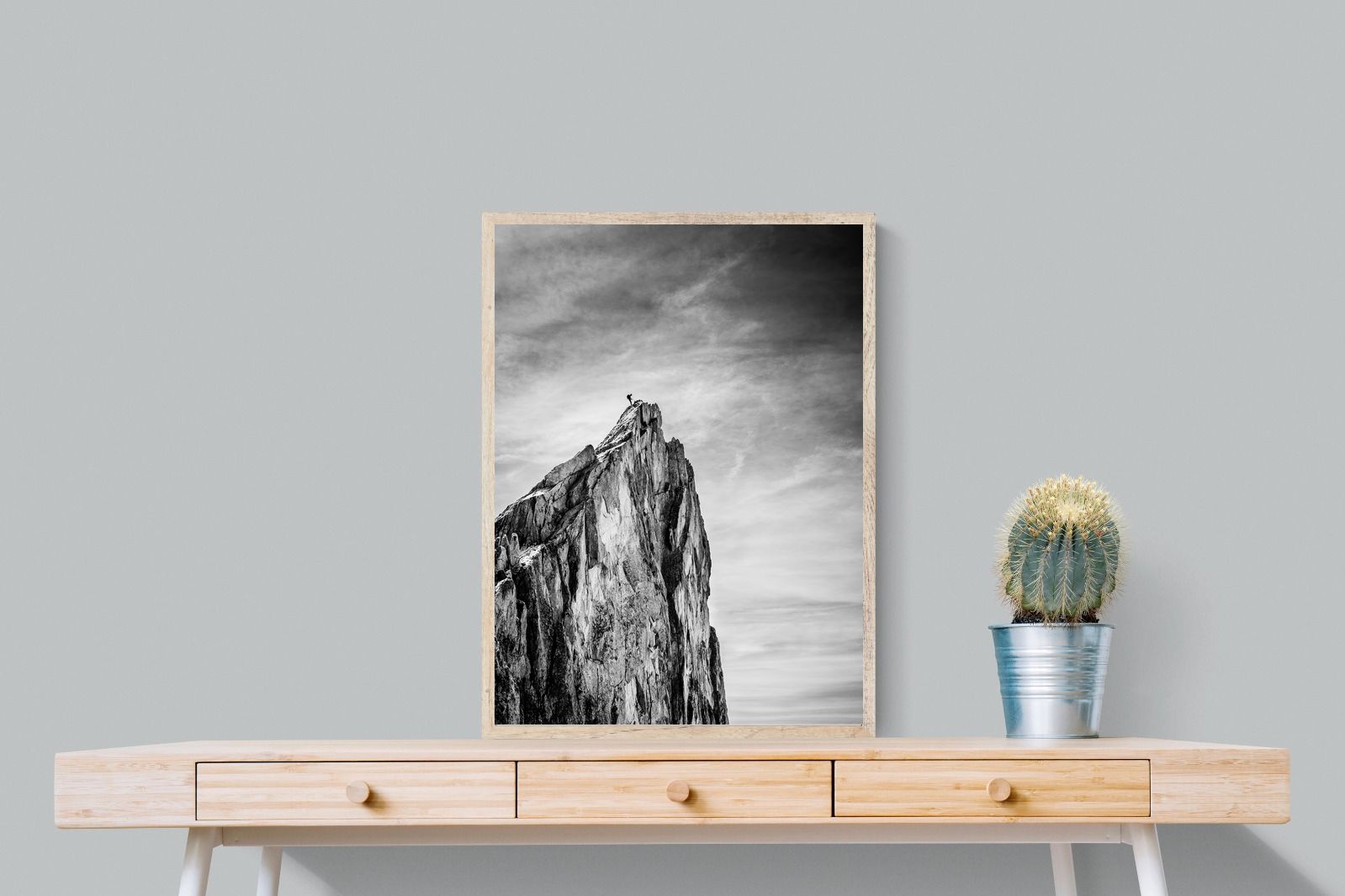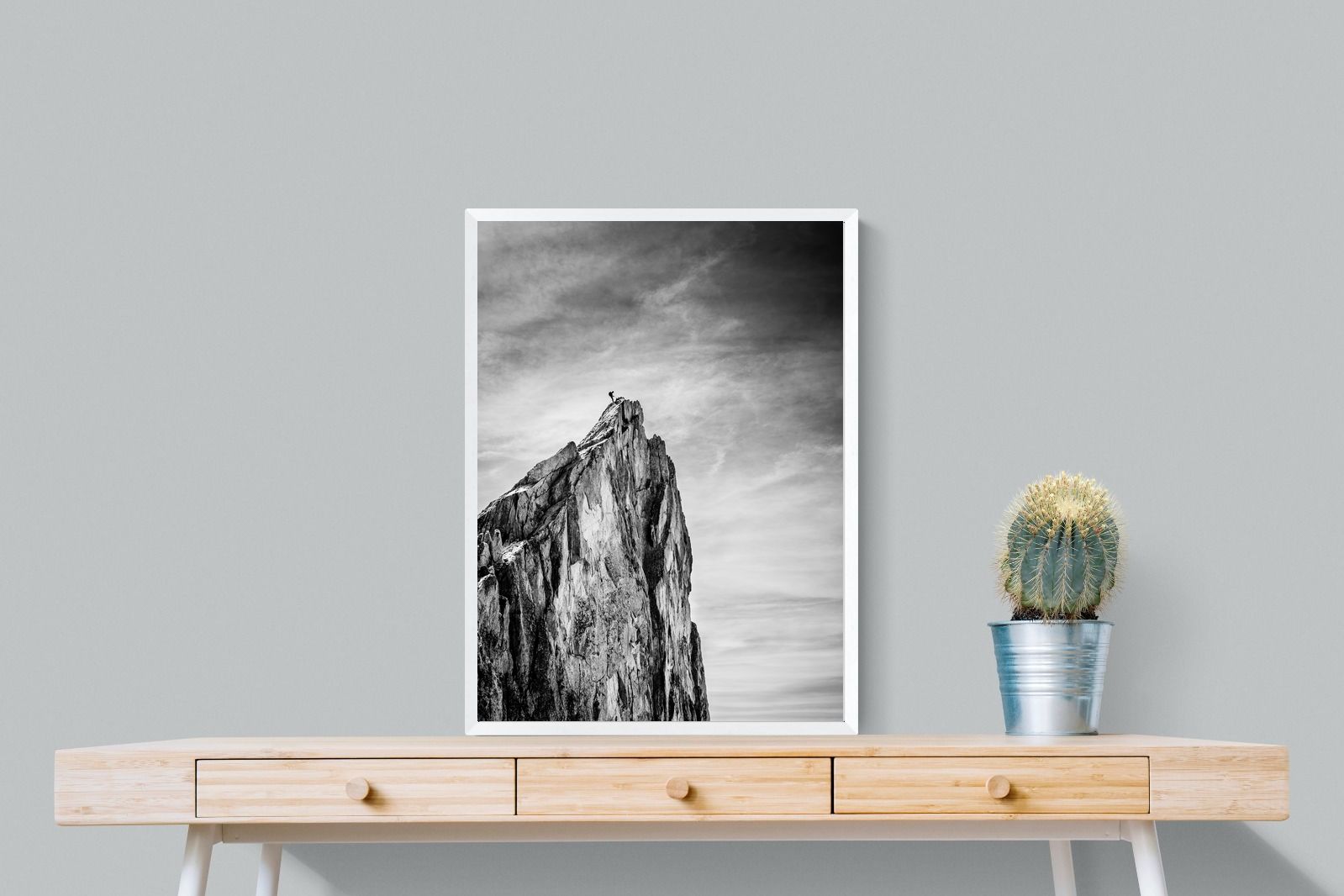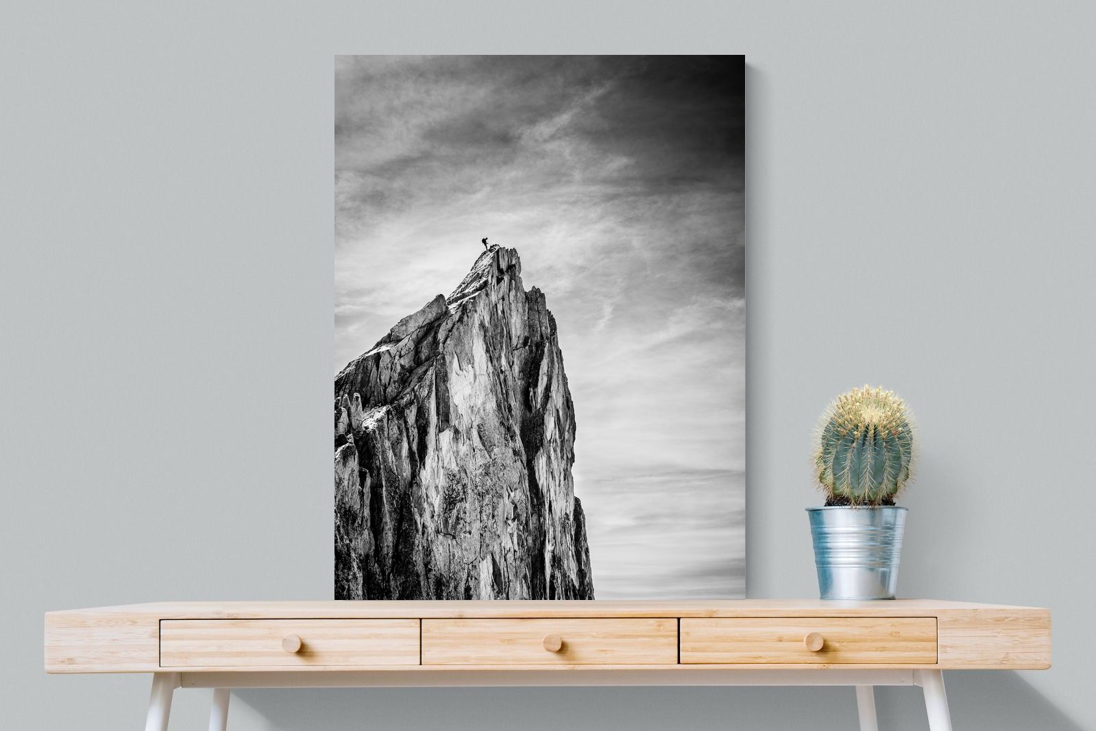 This dramatic black and white landscape captures a lone climber reaching the peak of a rugged mountain, emphasising scale, contrast, and achievement. The expansive sky and textured rock face create a powerful, minimalist composition. Ideal for contemporary interiors, offices, or statement walls, it brings a sense of ambition, adventure, and quiet strength to spaces that value bold, inspiring imagery.