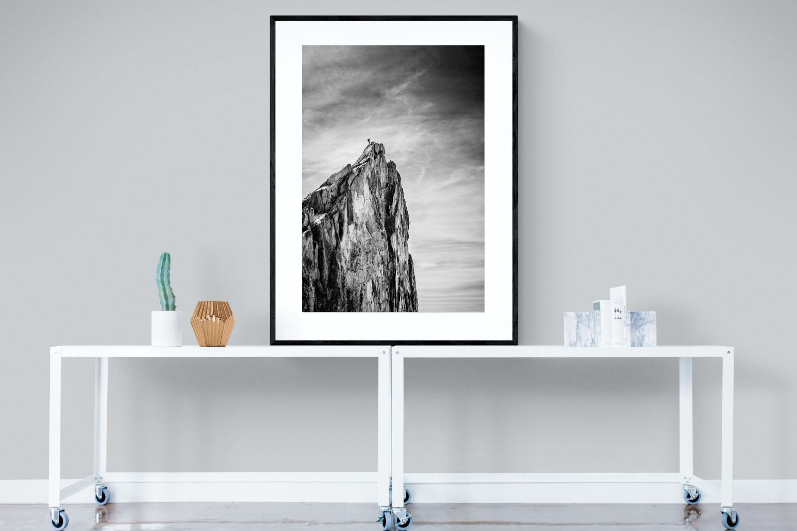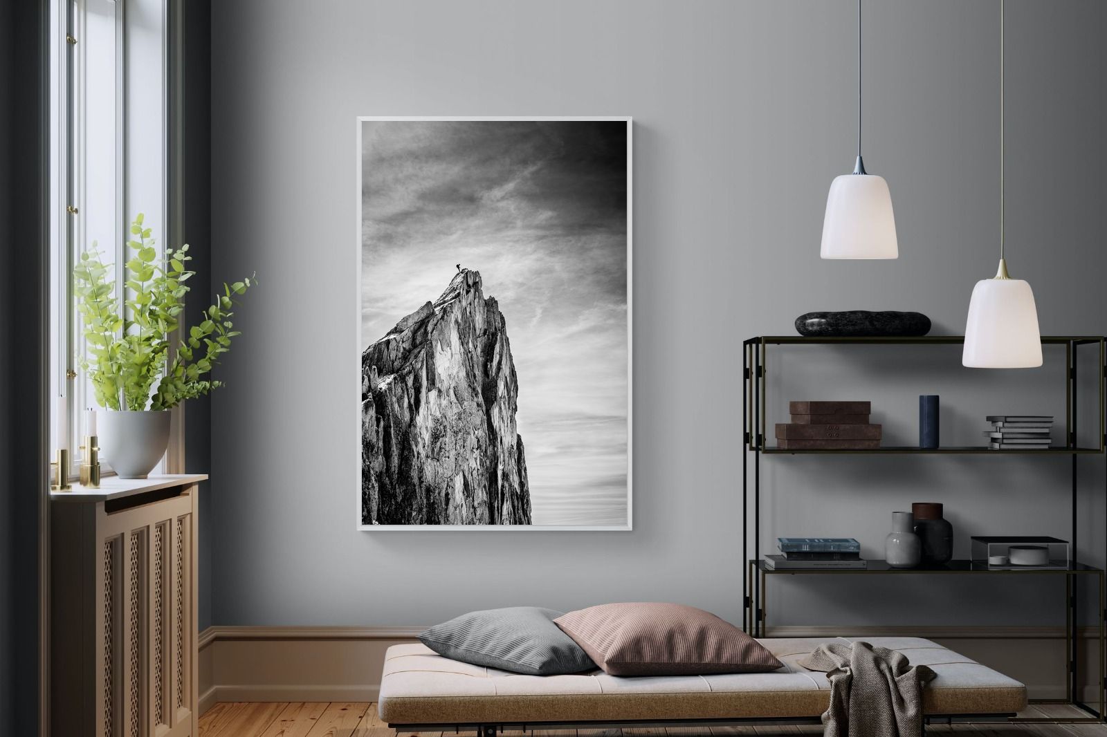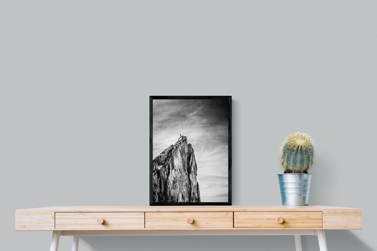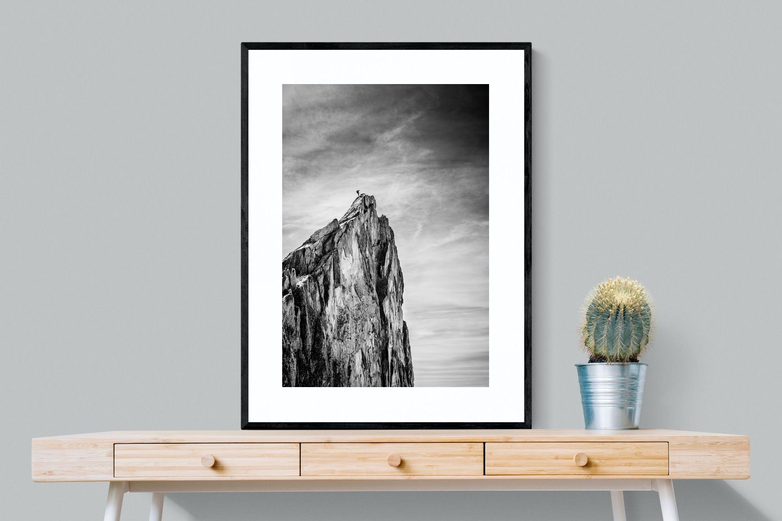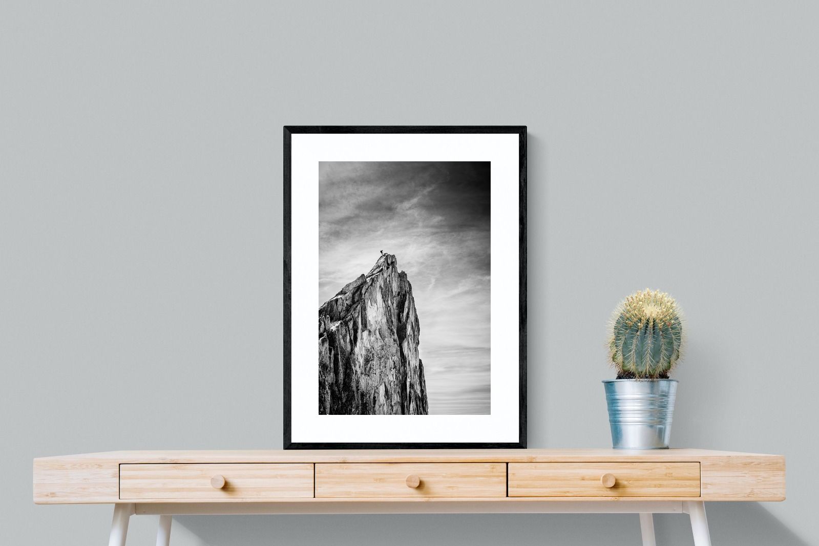 This dramatic black and white landscape captures a lone climber reaching the peak of a rugged mountain, emphasising scale, contrast, and achievement. The expansive sky and textured rock face create a powerful, minimalist composition. Ideal for contemporary interiors, offices, or statement walls, it brings a sense of ambition, adventure, and quiet strength to spaces that value bold, inspiring imagery.