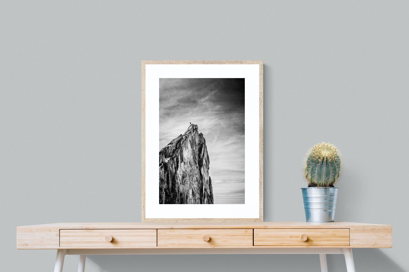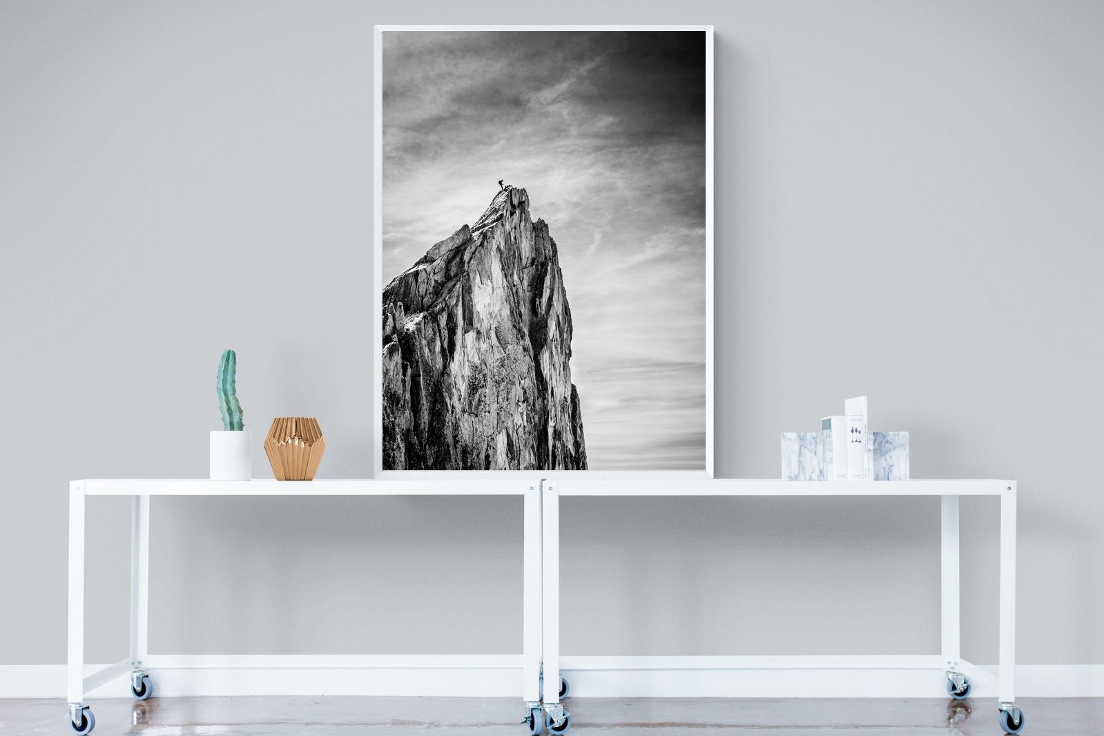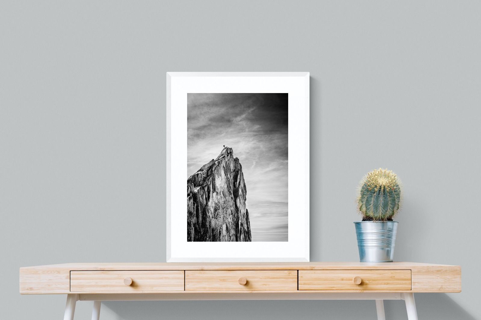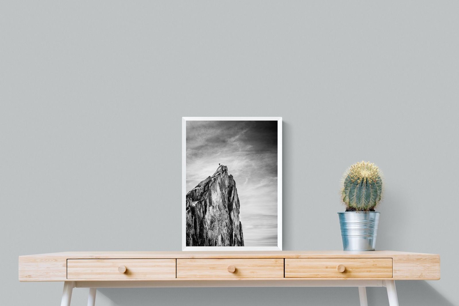 This dramatic black and white landscape captures a lone climber reaching the peak of a rugged mountain, emphasising scale, contrast, and achievement. The expansive sky and textured rock face create a powerful, minimalist composition. Ideal for contemporary interiors, offices, or statement walls, it brings a sense of ambition, adventure, and quiet strength to spaces that value bold, inspiring imagery.