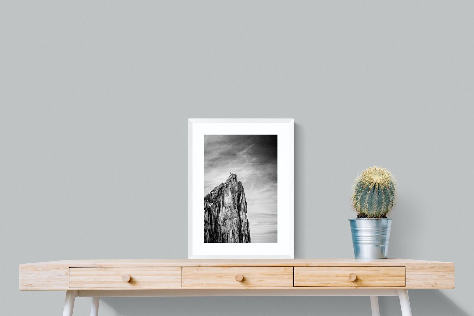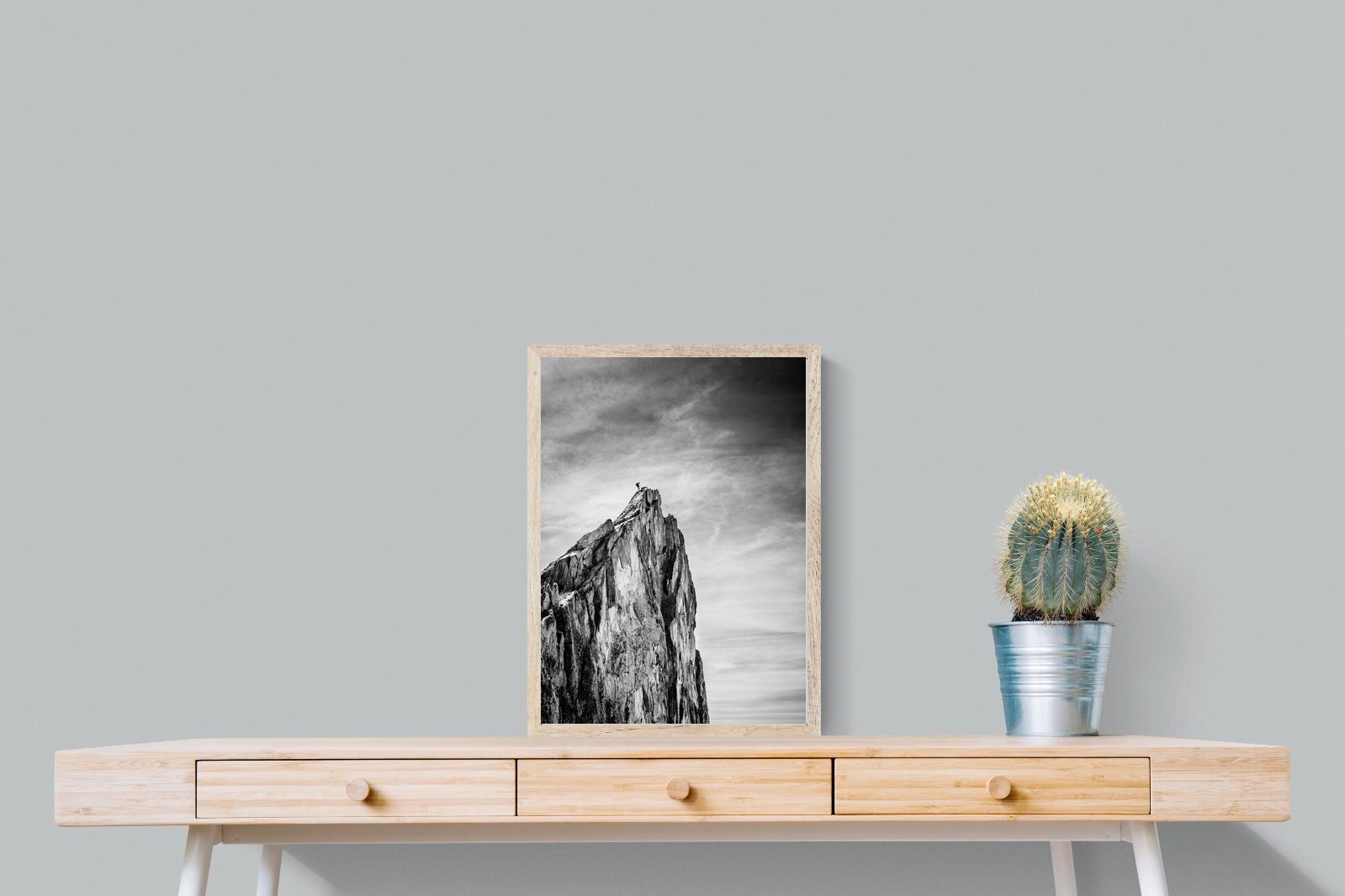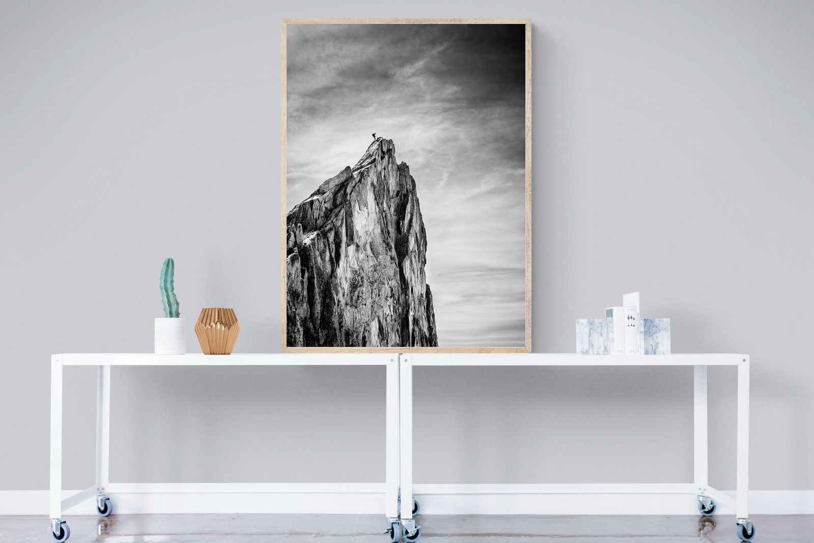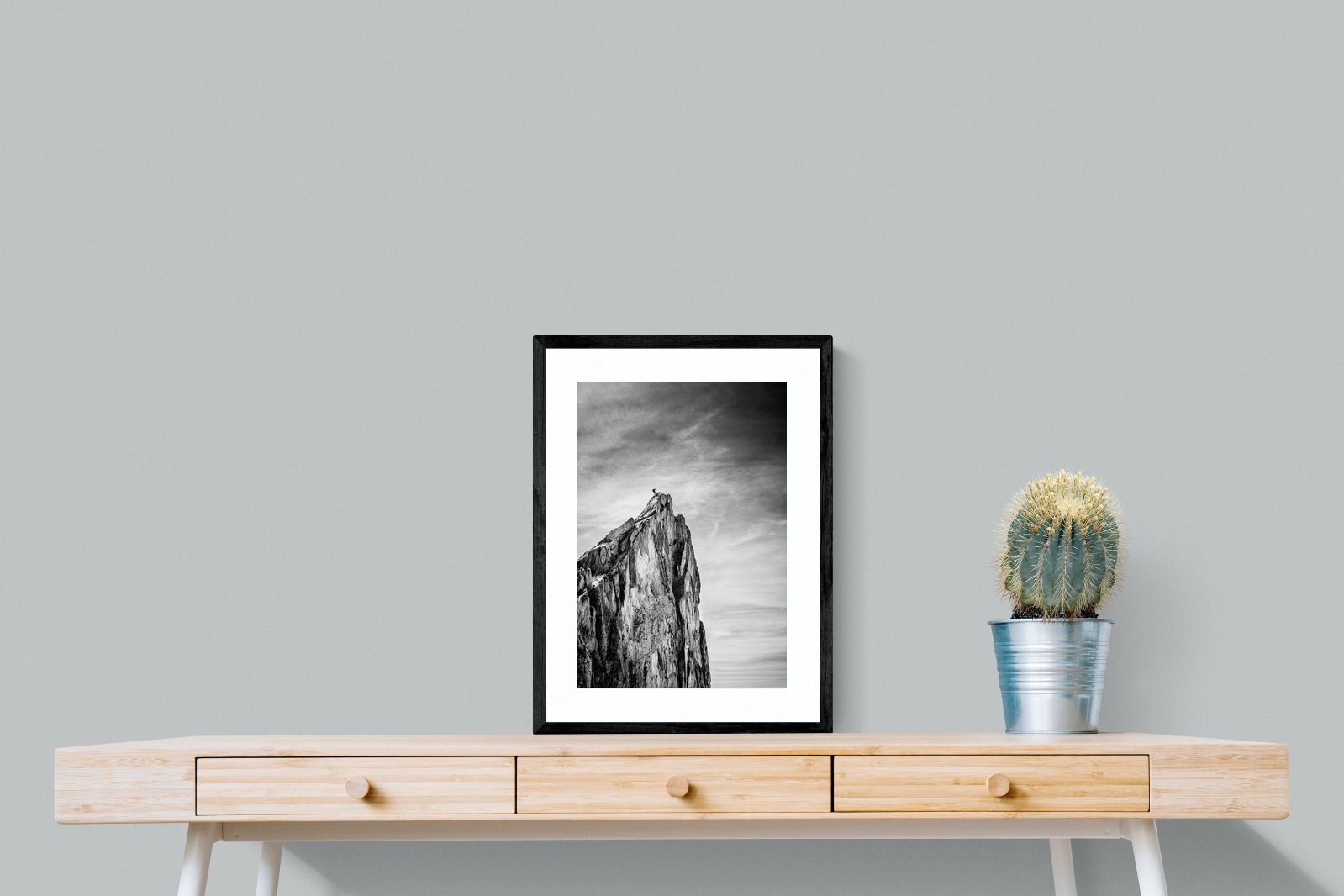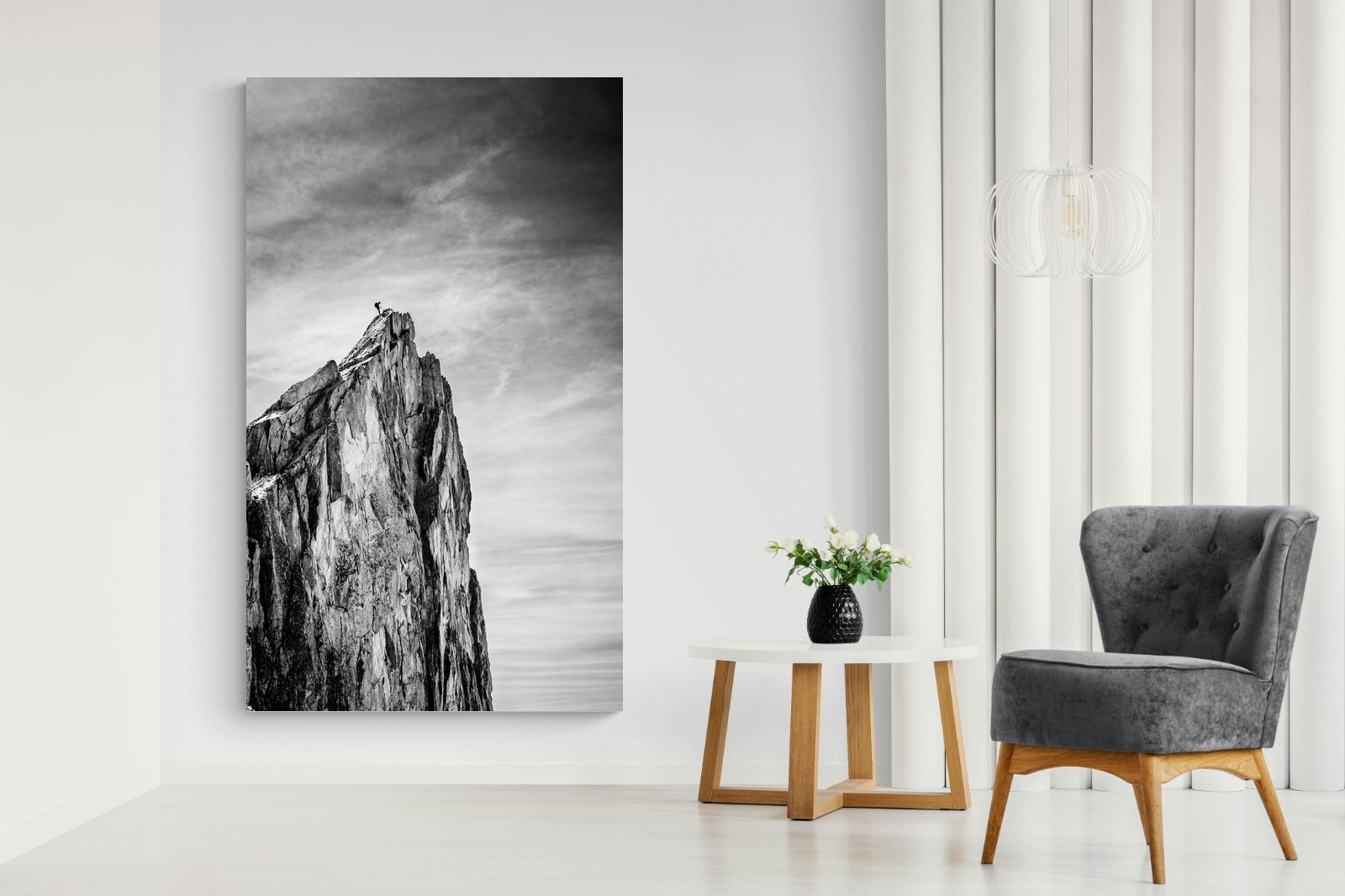 This dramatic black and white landscape captures a lone climber reaching the peak of a rugged mountain, emphasising scale, contrast, and achievement. The expansive sky and textured rock face create a powerful, minimalist composition. Ideal for contemporary interiors, offices, or statement walls, it brings a sense of ambition, adventure, and quiet strength to spaces that value bold, inspiring imagery.