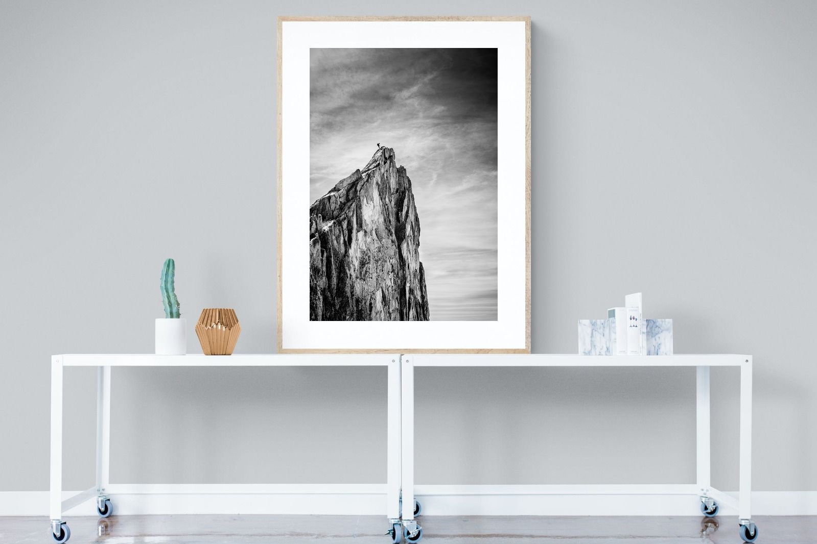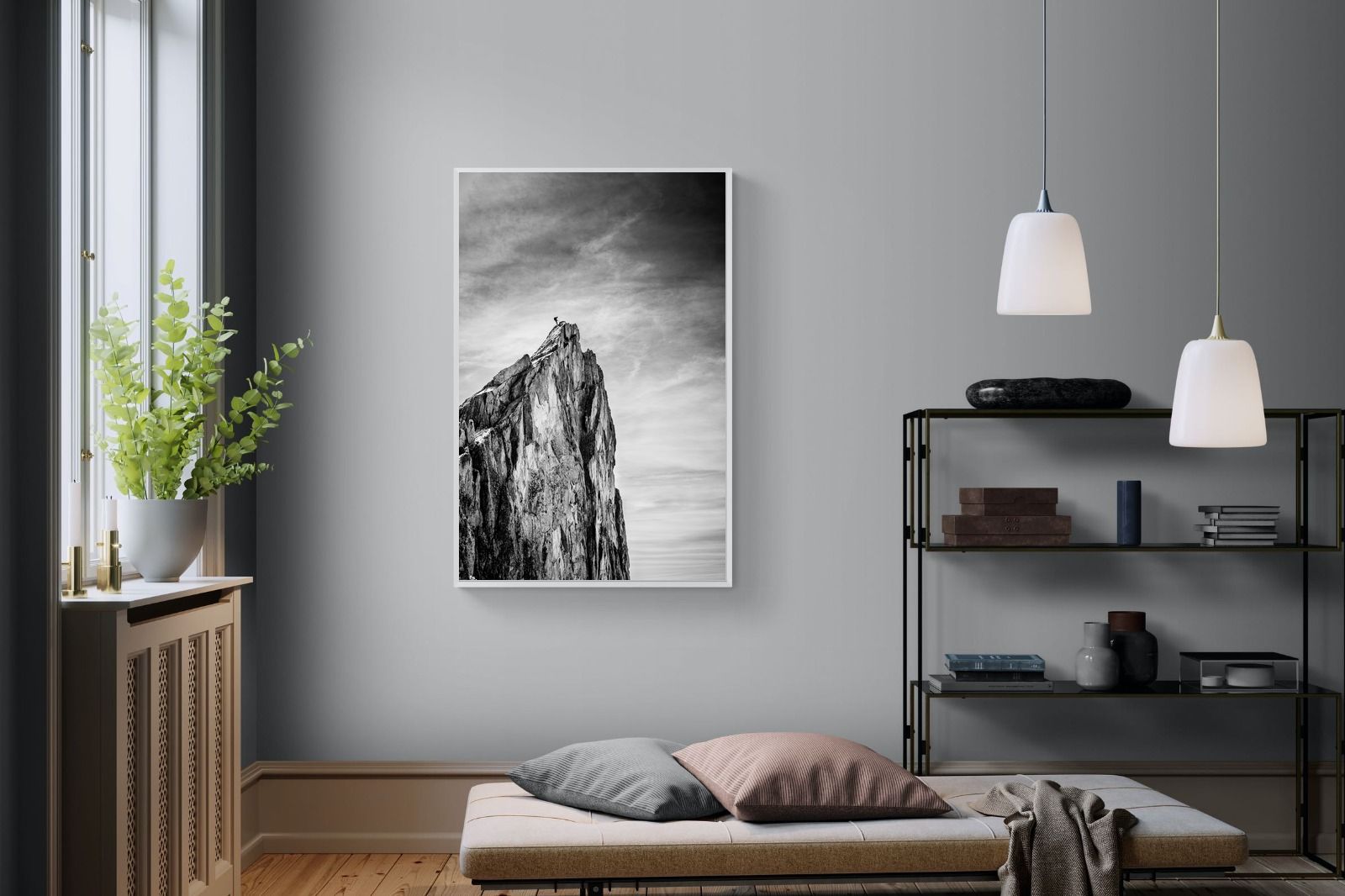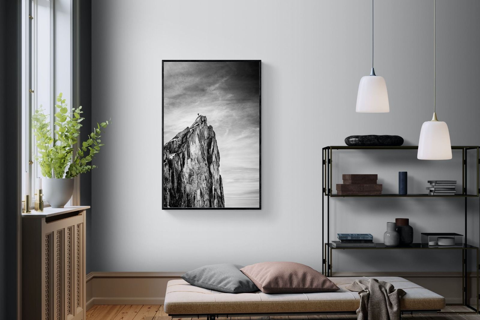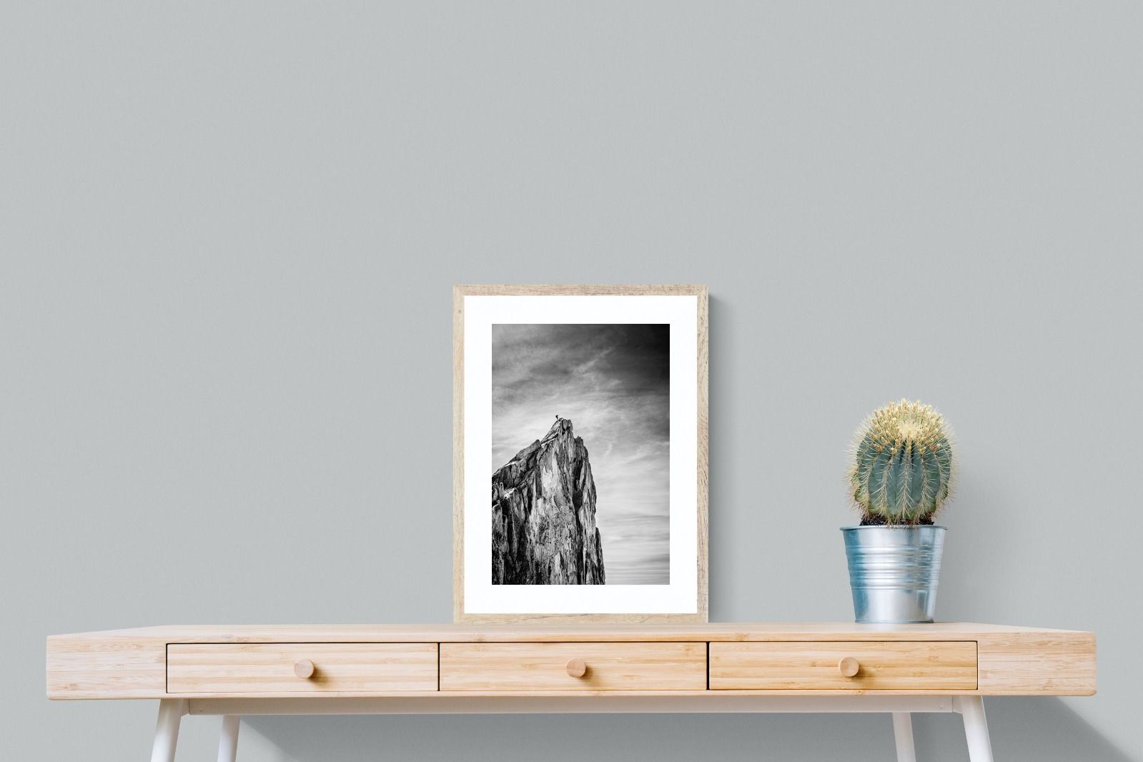 This dramatic black and white landscape captures a lone climber reaching the peak of a rugged mountain, emphasising scale, contrast, and achievement. The expansive sky and textured rock face create a powerful, minimalist composition. Ideal for contemporary interiors, offices, or statement walls, it brings a sense of ambition, adventure, and quiet strength to spaces that value bold, inspiring imagery.